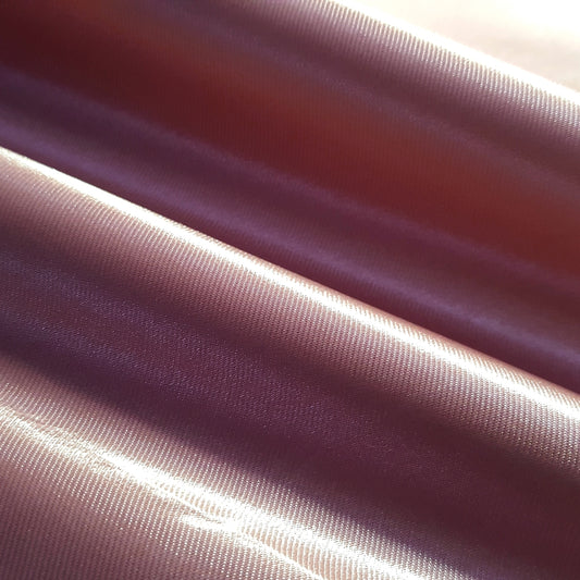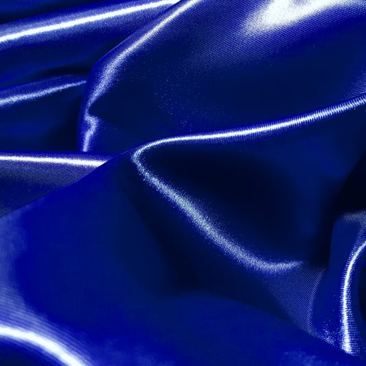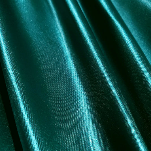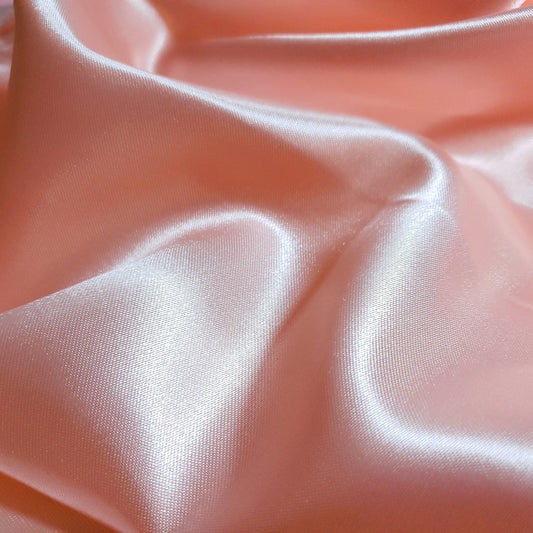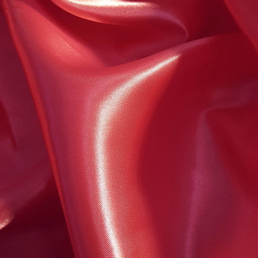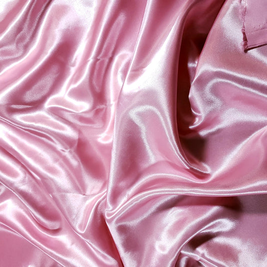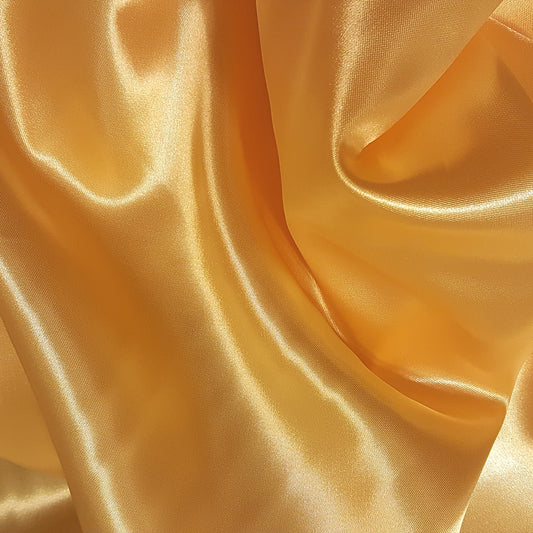 This medium-weight satin is crafted from 100% polyester and measures 58 inches in width. The fabric features a high-gloss, lustrous front face with a contrasting matte finish on the back. It is a stable, non-stretch material, making it easy to handle for various sewing projects.