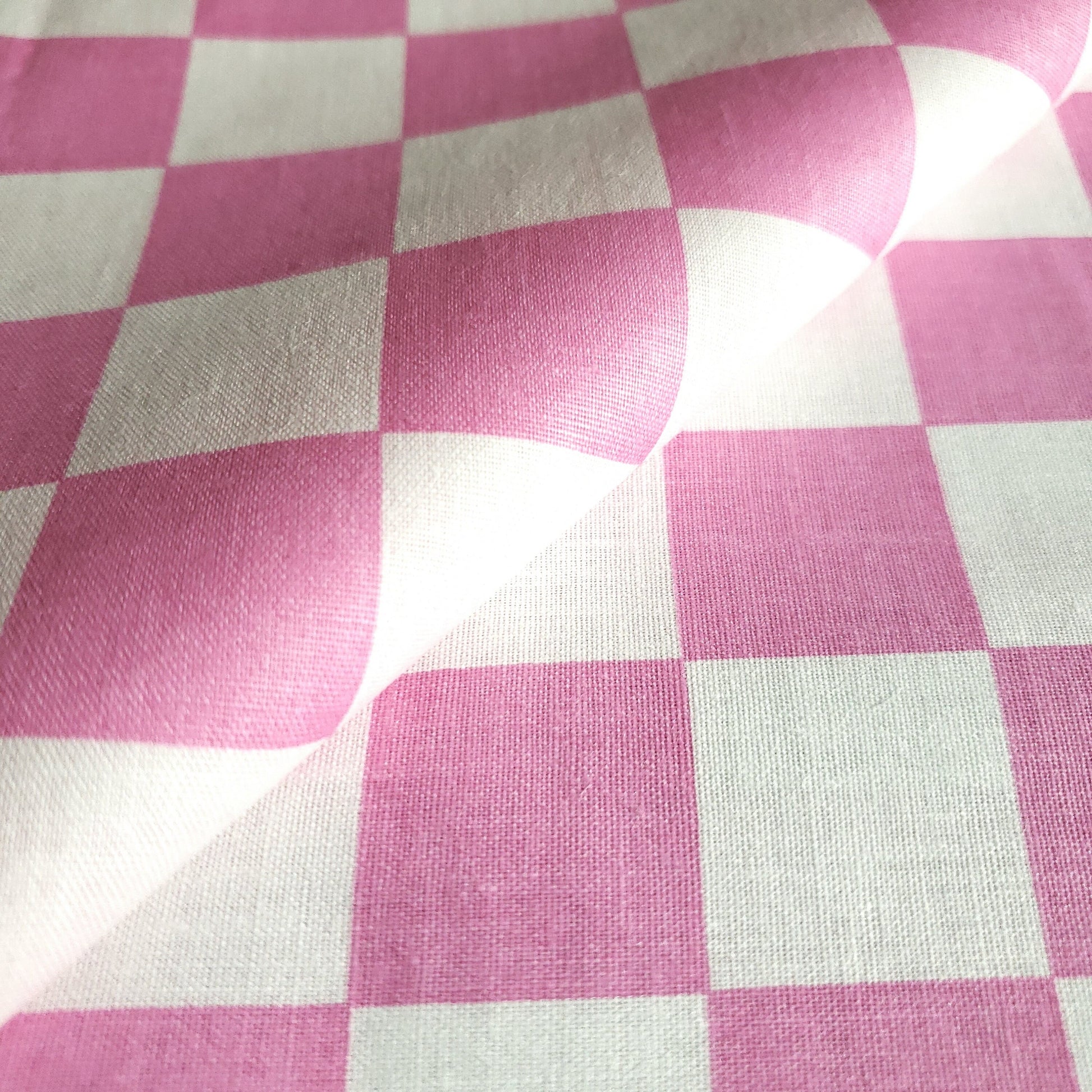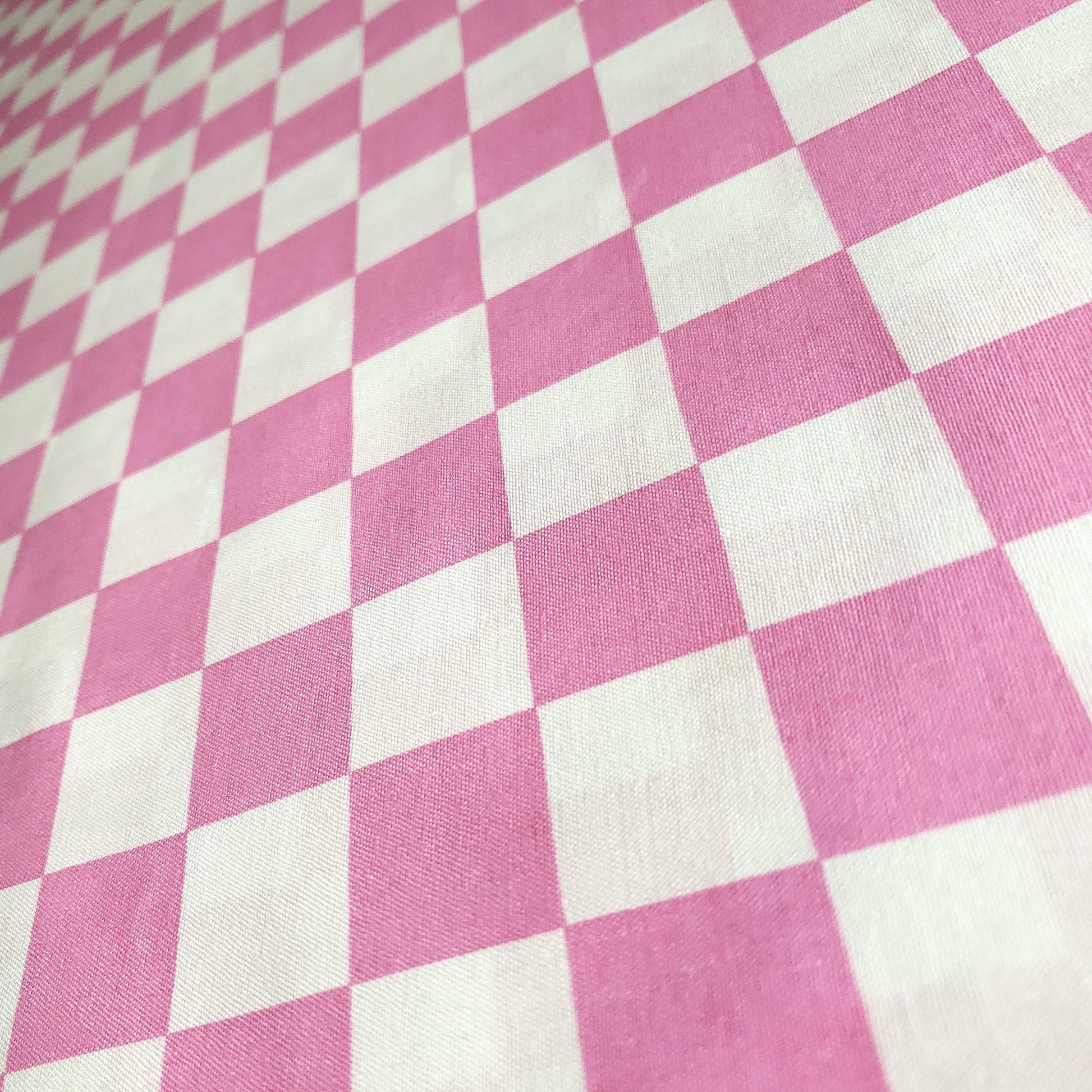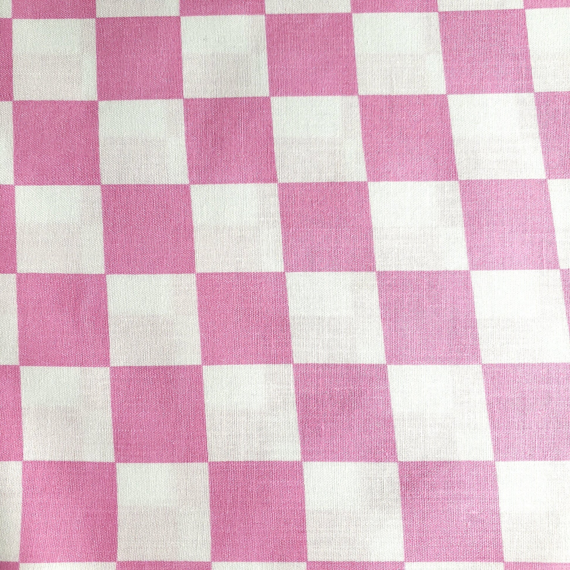 This poly-cotton fabric showcases a pink and white checkered pattern with each square measuring one inch. It offers a lightweight yet starched cotton texture that softens after the initial wash or with use. Designed to simplify pattern cutting and sewing, this 58" wide fabric features a single-sided print with no stretch and is sold new off the roll.