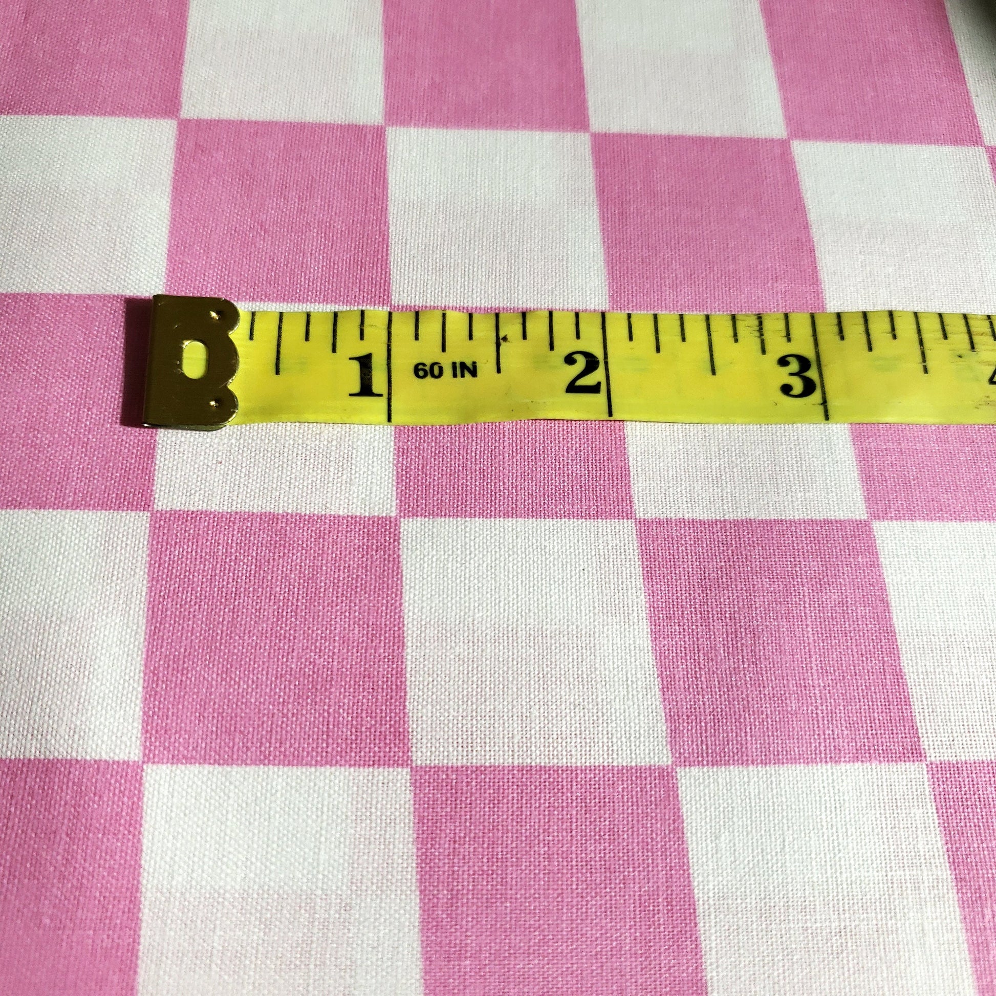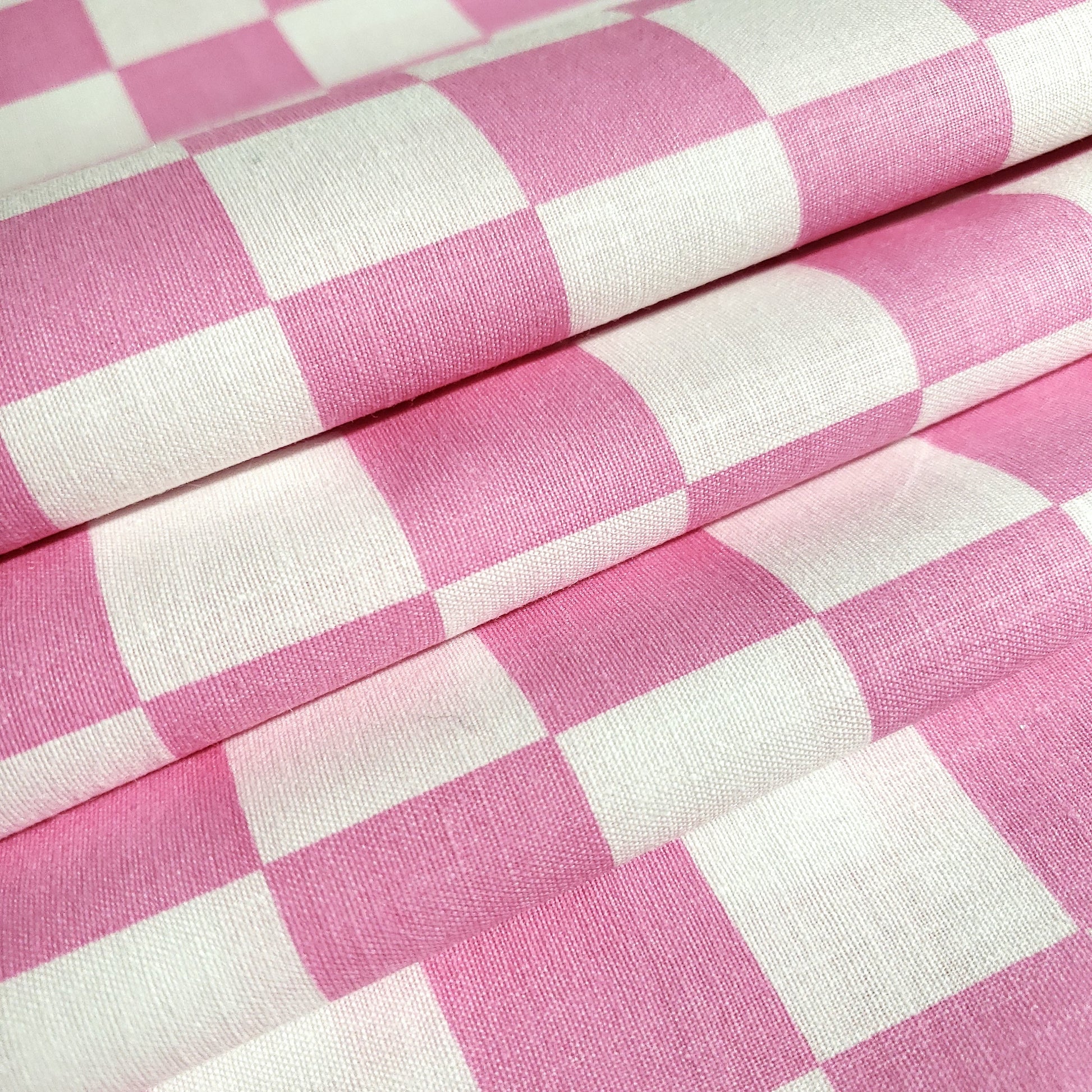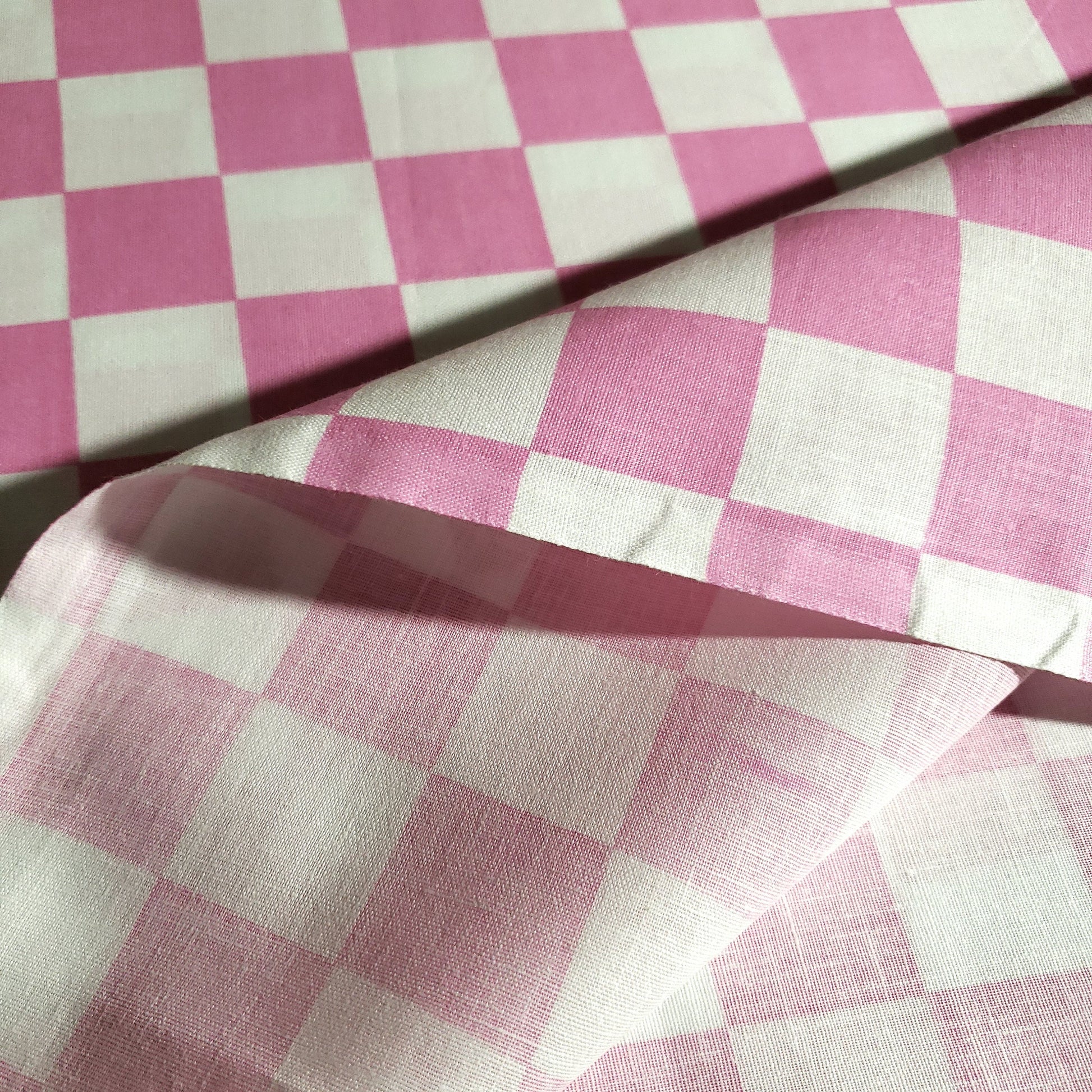 This poly-cotton fabric showcases a pink and white checkered pattern with each square measuring one inch. It offers a lightweight yet starched cotton texture that softens after the initial wash or with use. Designed to simplify pattern cutting and sewing, this 58" wide fabric features a single-sided print with no stretch and is sold new off the roll.