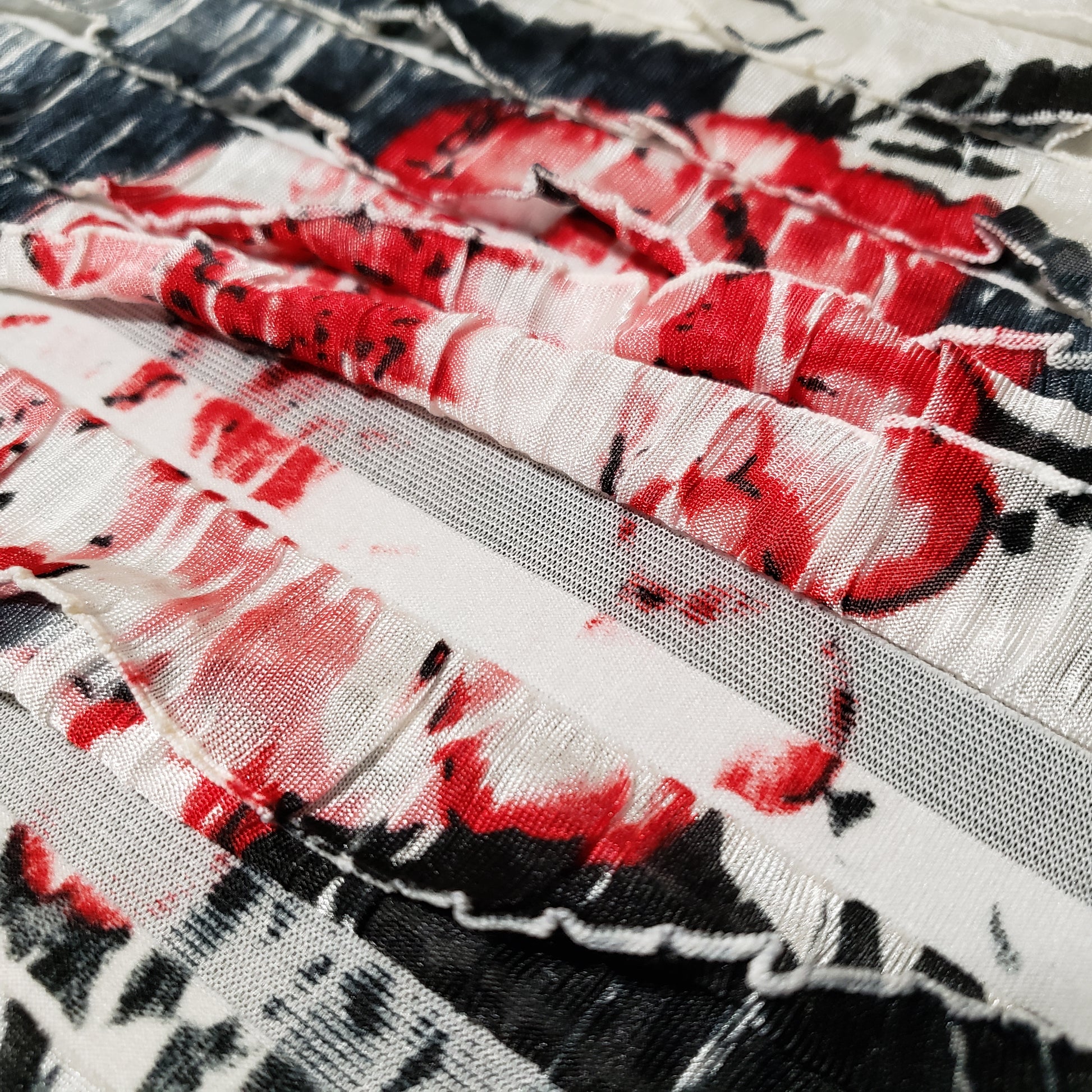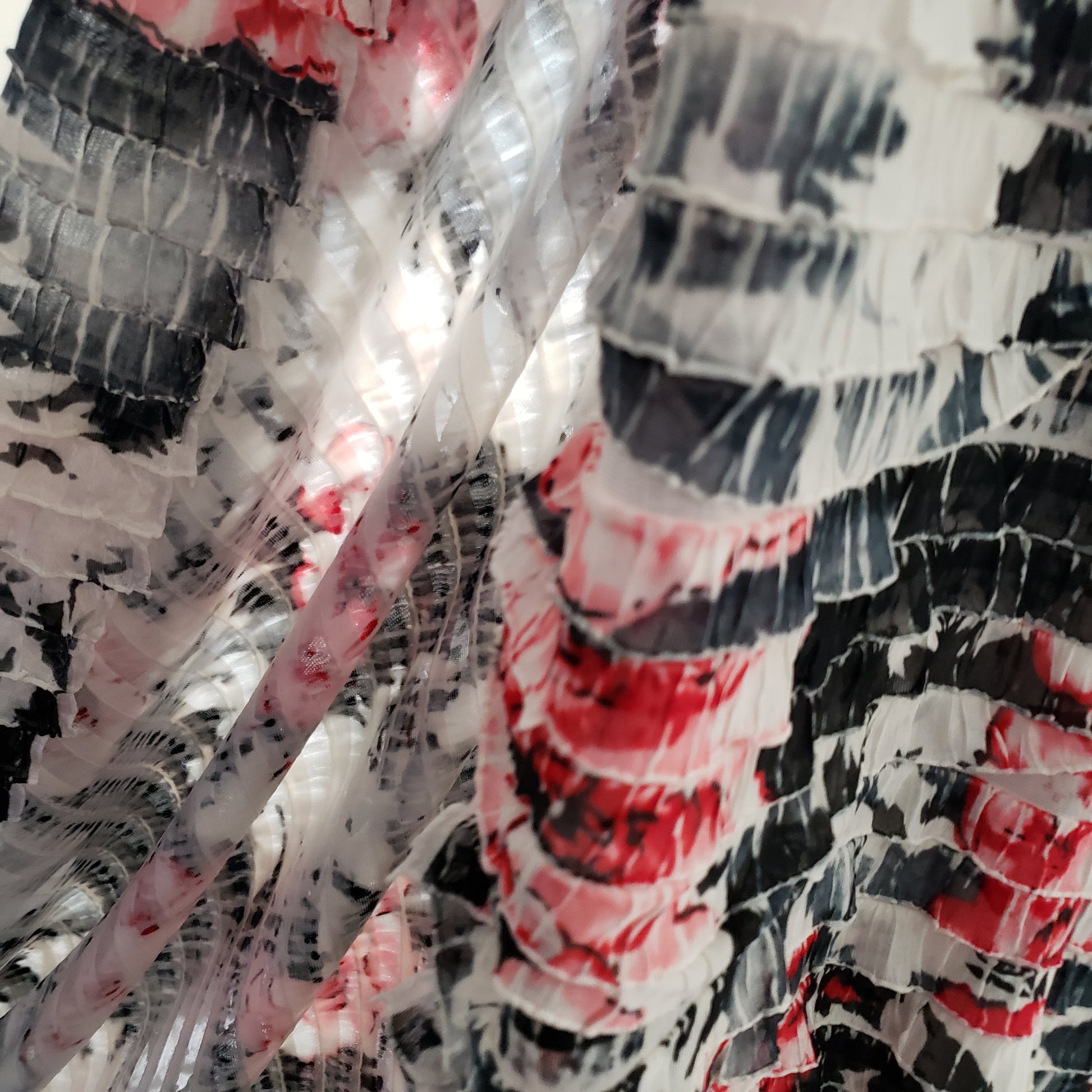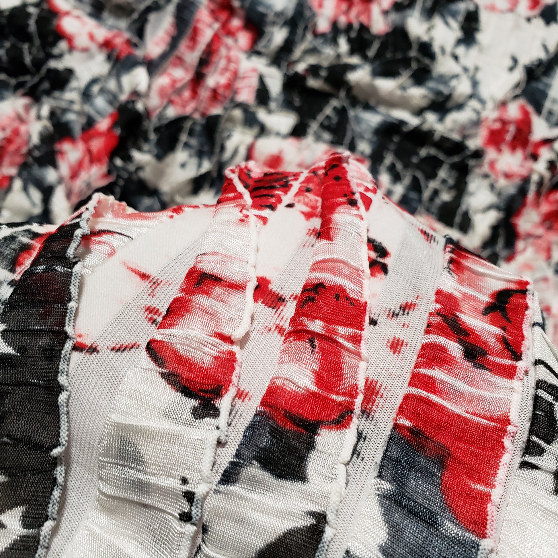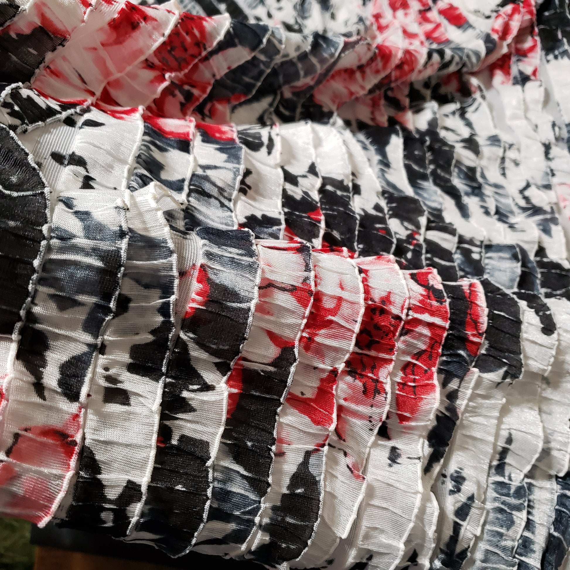 This polyester jersey fabric is constructed with printed, ruffled panels sewn horizontally onto a lightweight jersey backing. The design creates a dimensional, textured surface and features an abstract floral pattern in red, black, and white. The fabric has a soft hand and inherent stretch, making it suitable for apparel such as tops, dresses, and skirts.