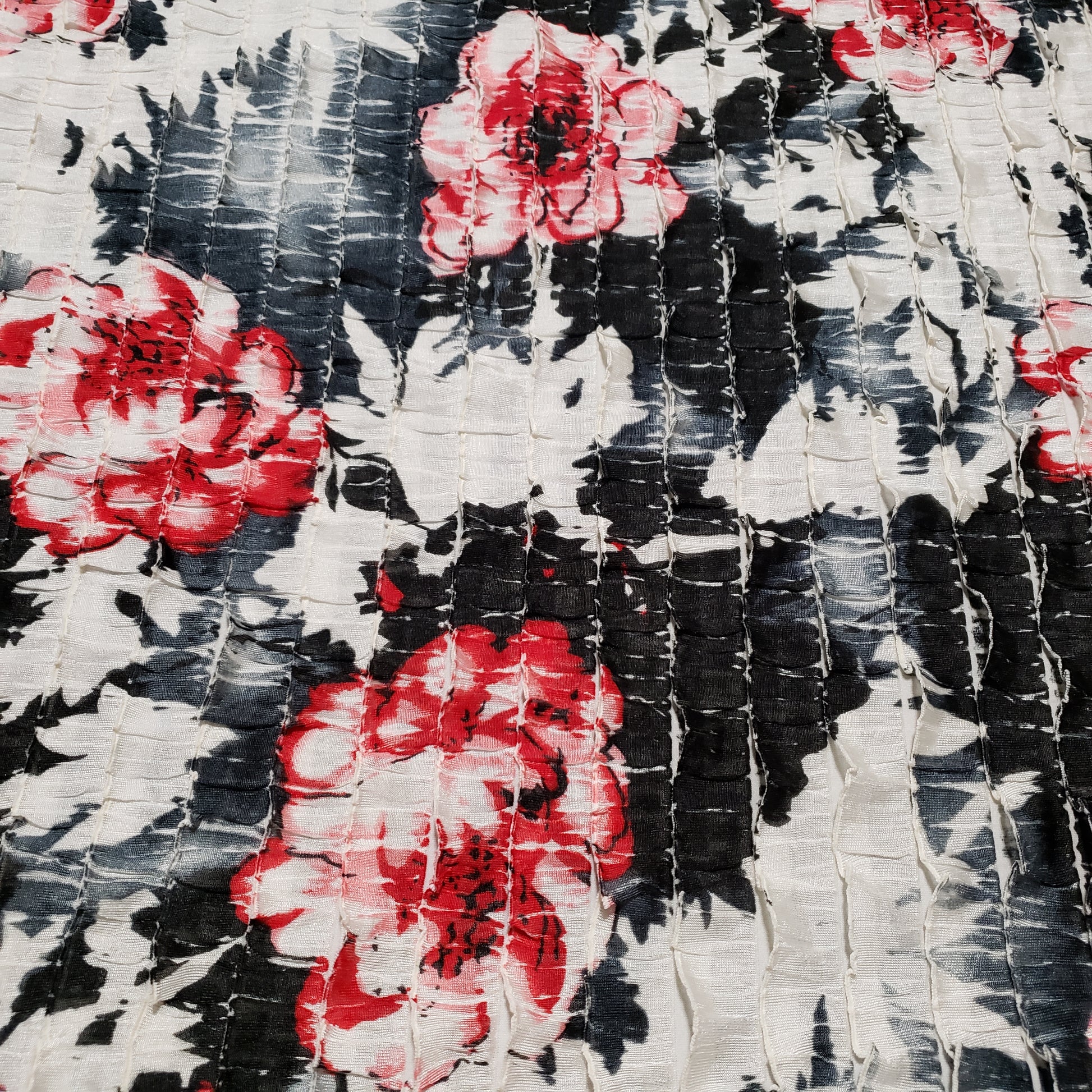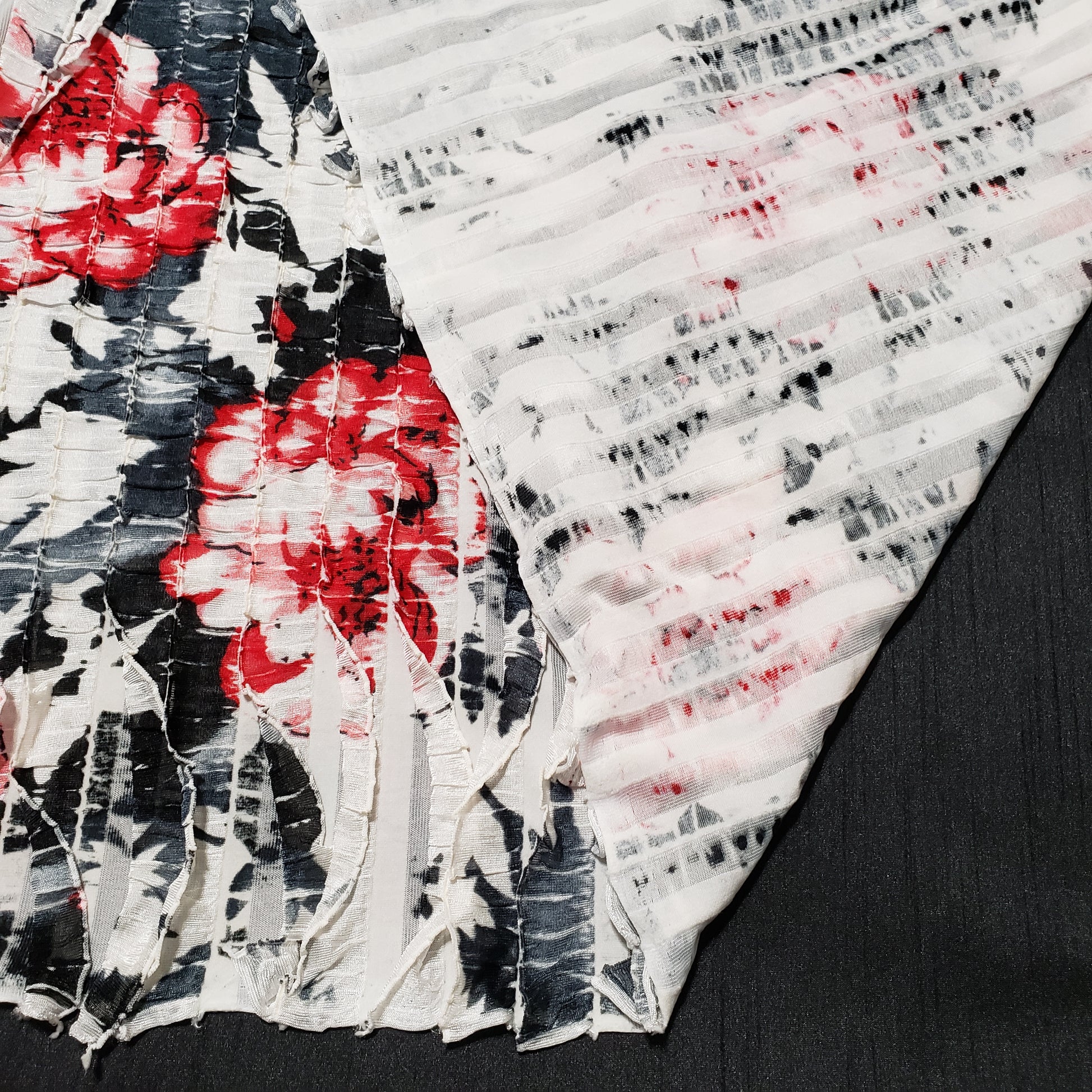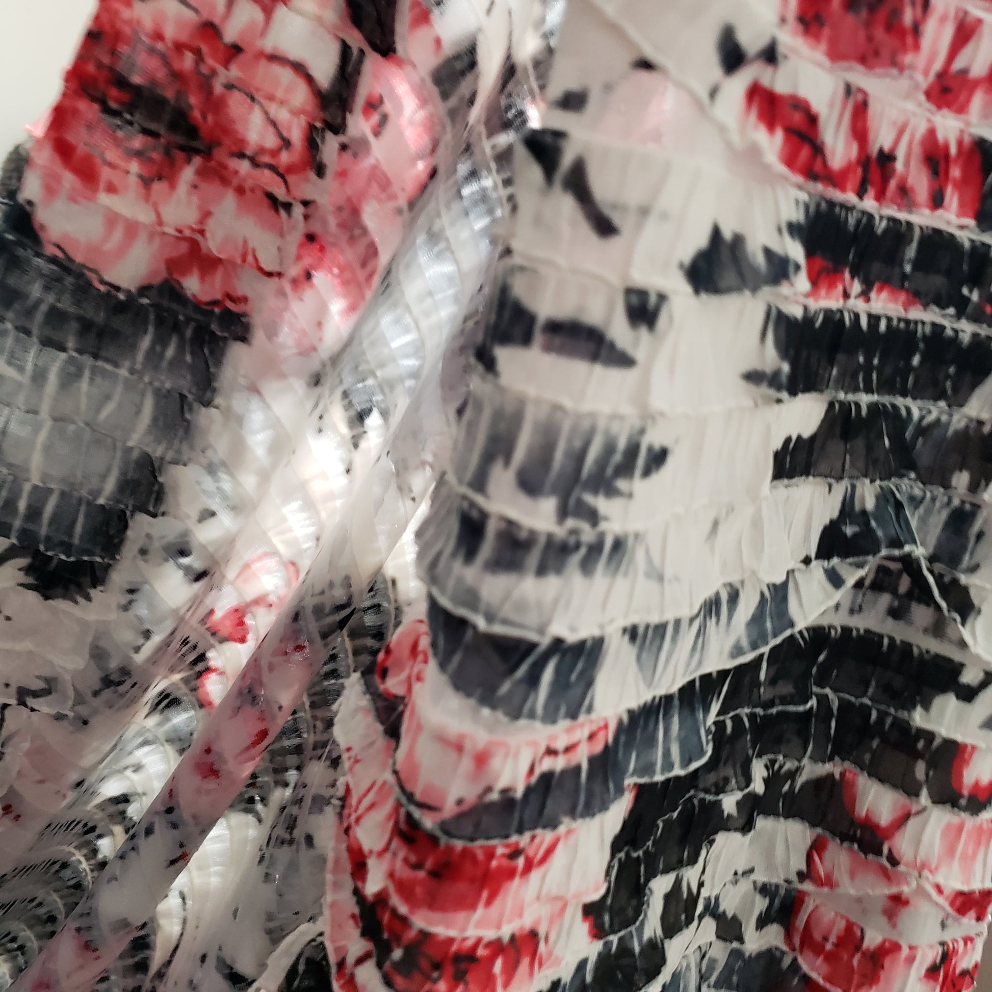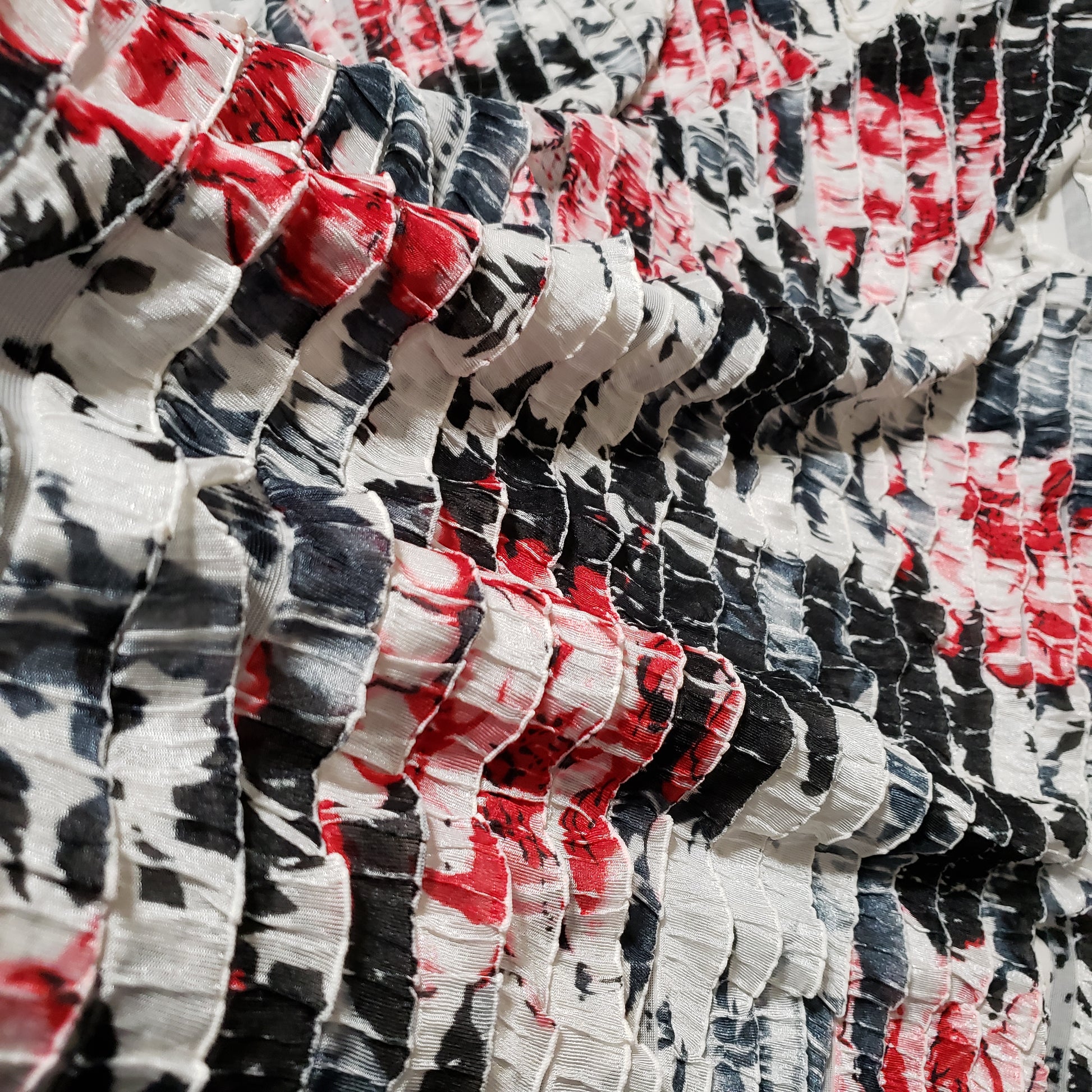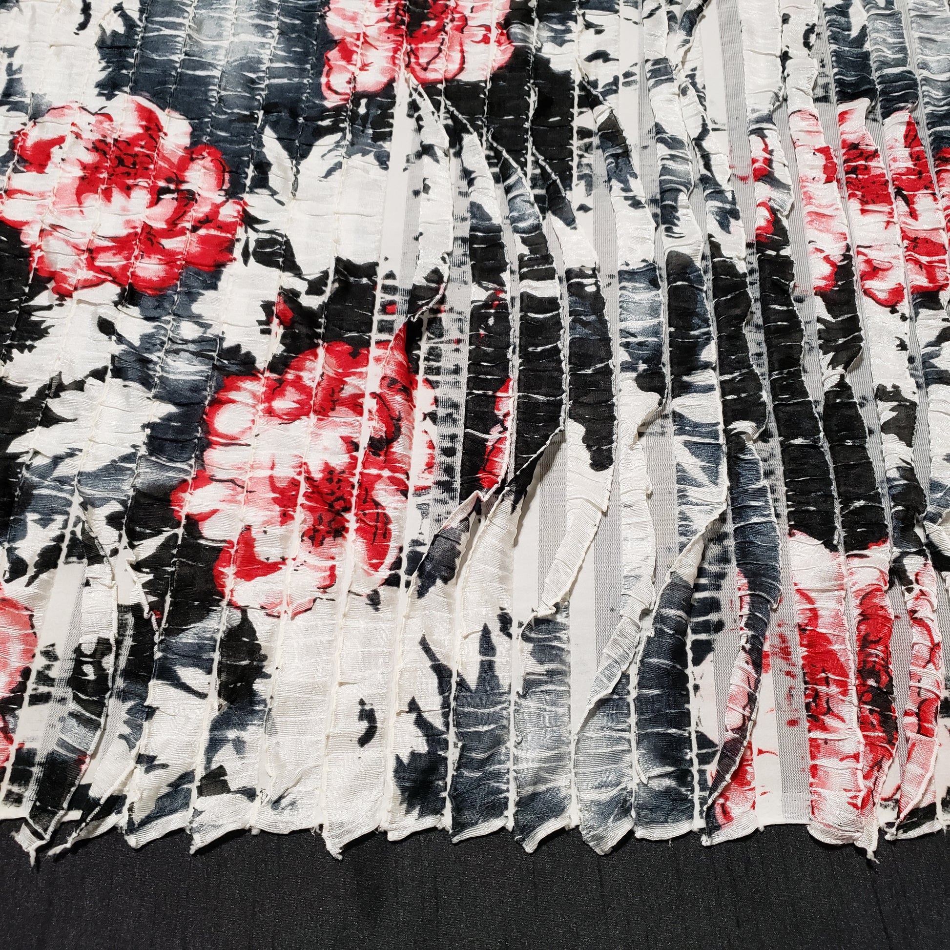 This polyester jersey fabric is constructed with printed, ruffled panels sewn horizontally onto a lightweight jersey backing. The design creates a dimensional, textured surface and features an abstract floral pattern in red, black, and white. The fabric has a soft hand and inherent stretch, making it suitable for apparel such as tops, dresses, and skirts.