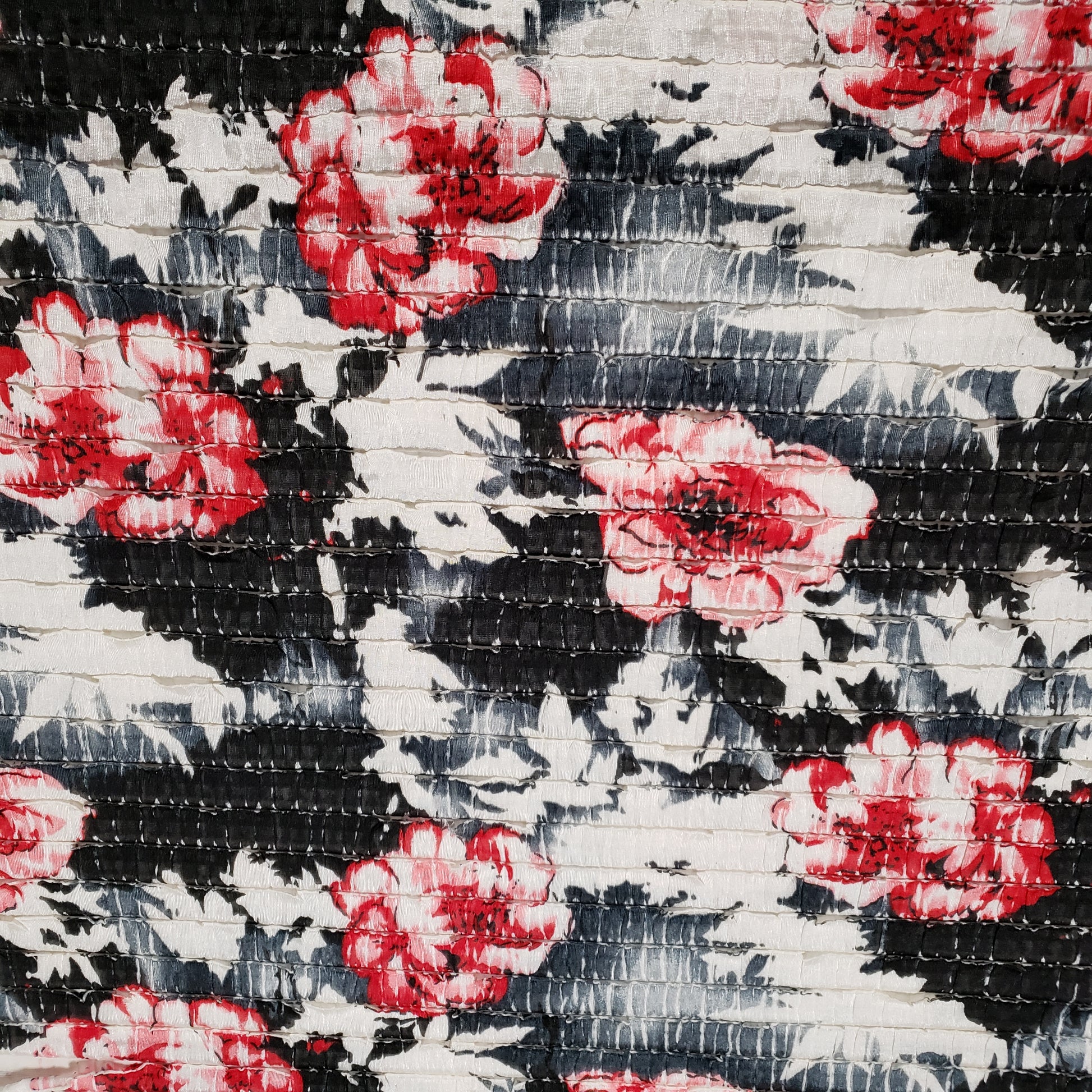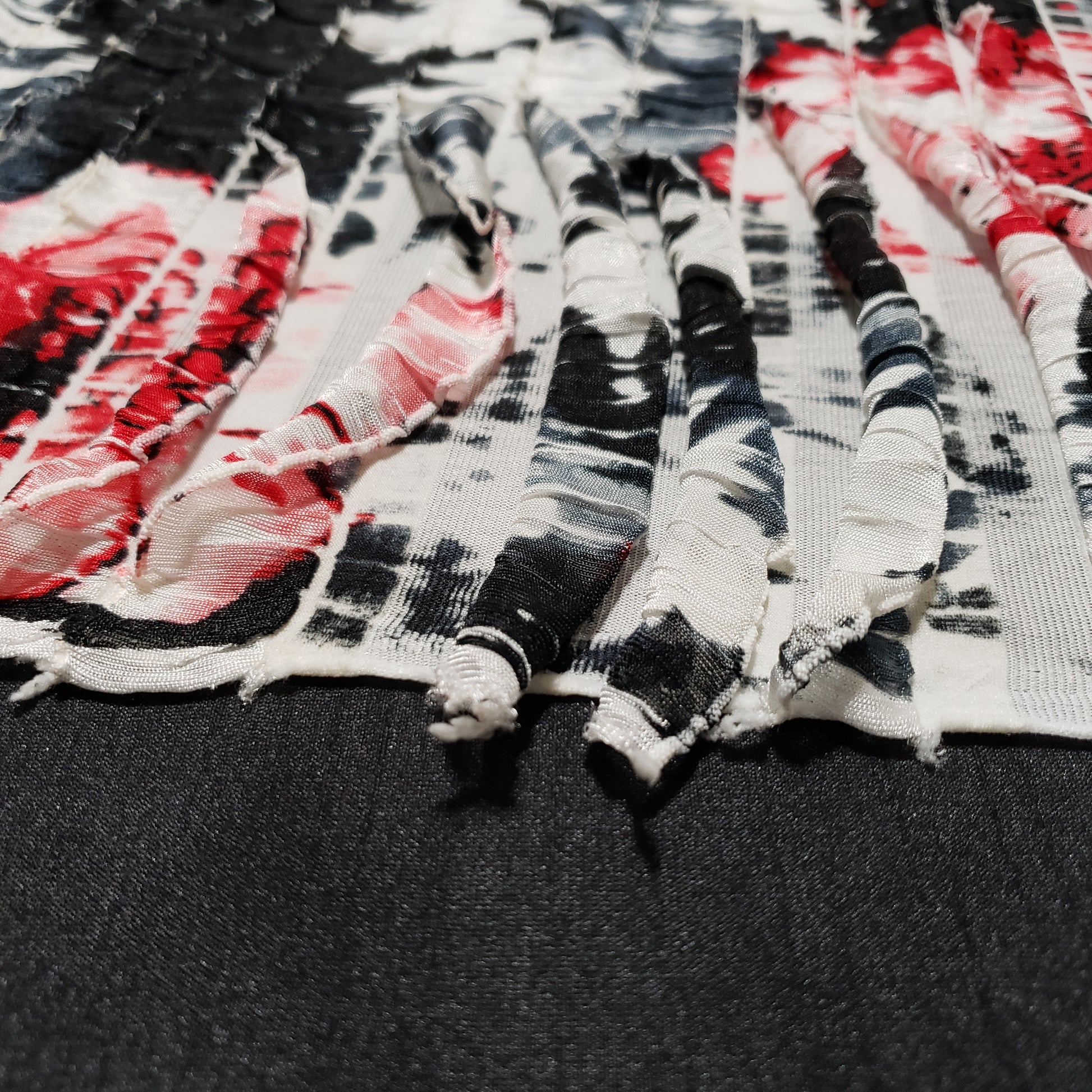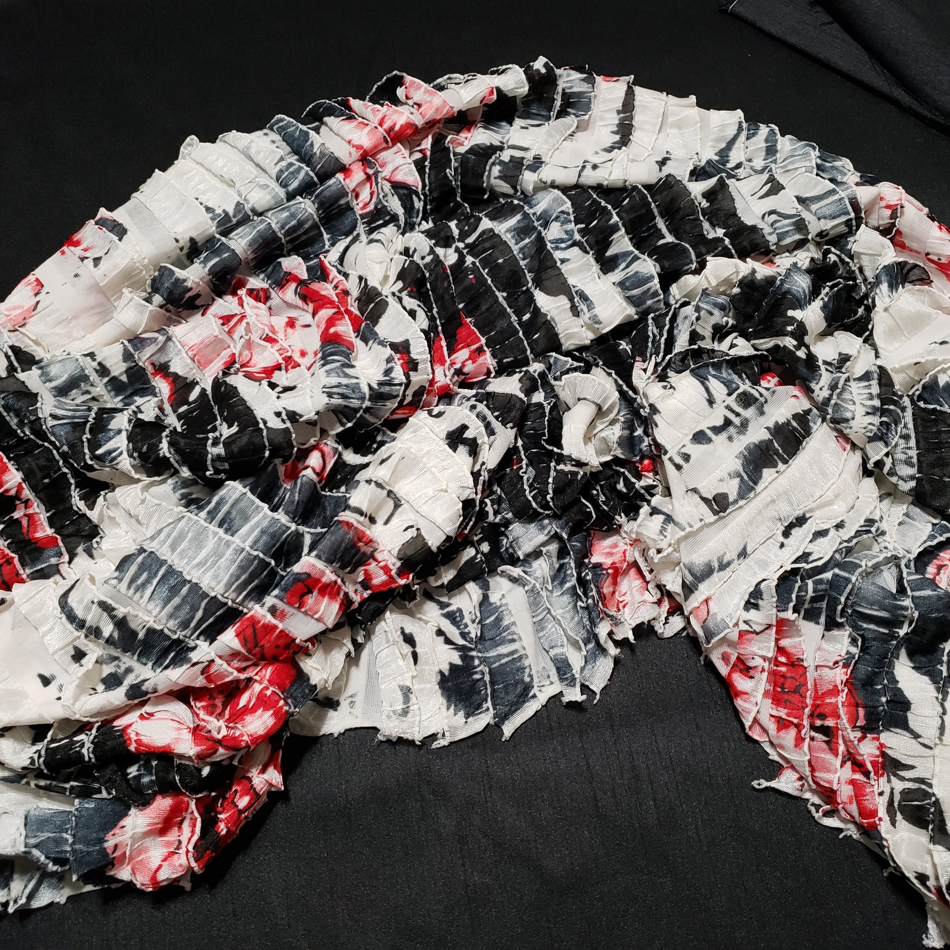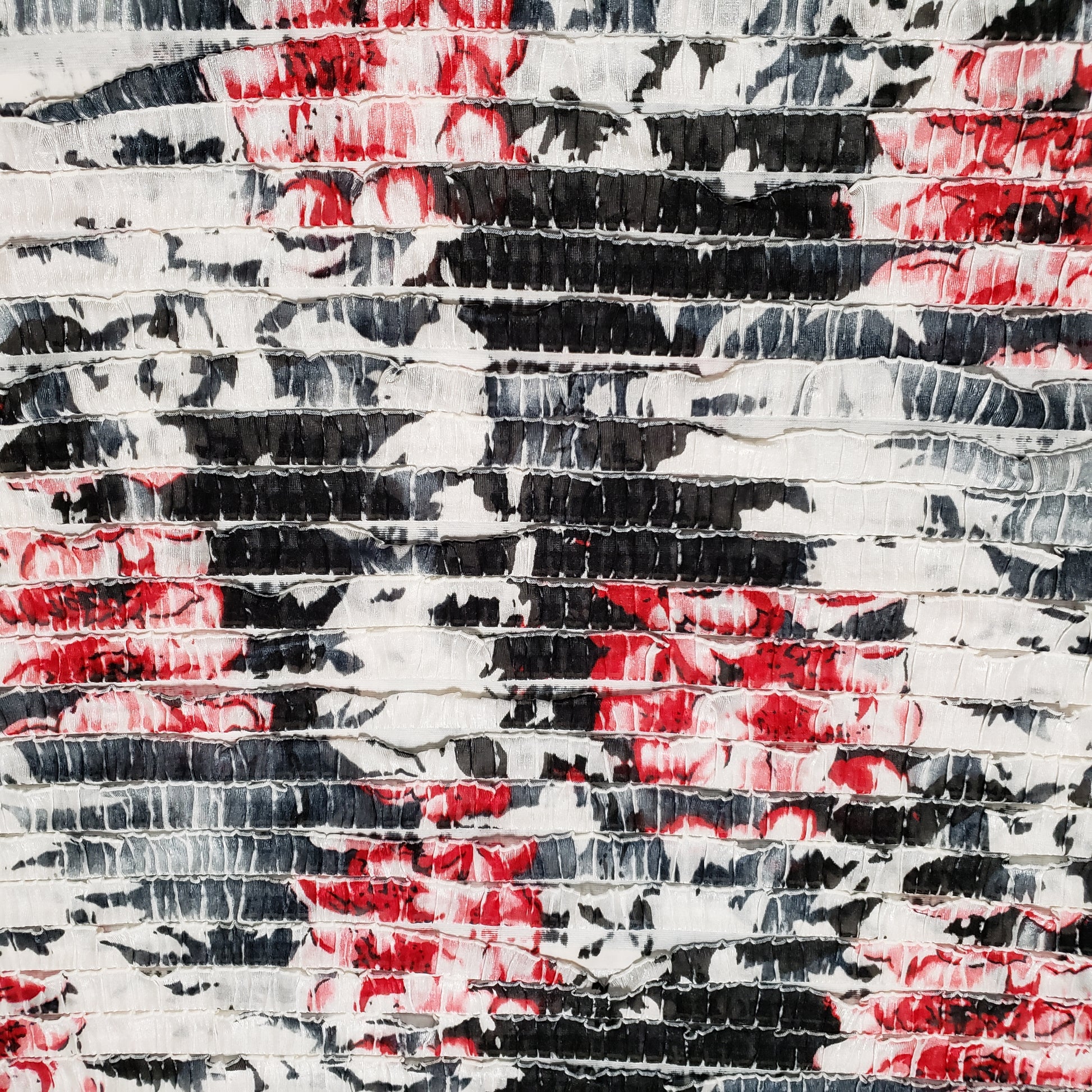 This polyester jersey fabric is constructed with printed, ruffled panels sewn horizontally onto a lightweight jersey backing. The design creates a dimensional, textured surface and features an abstract floral pattern in red, black, and white. The fabric has a soft hand and inherent stretch, making it suitable for apparel such as tops, dresses, and skirts.