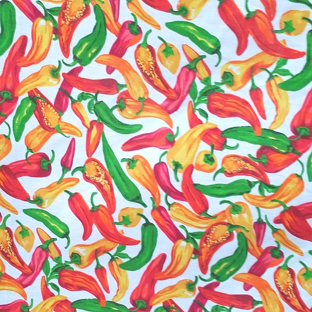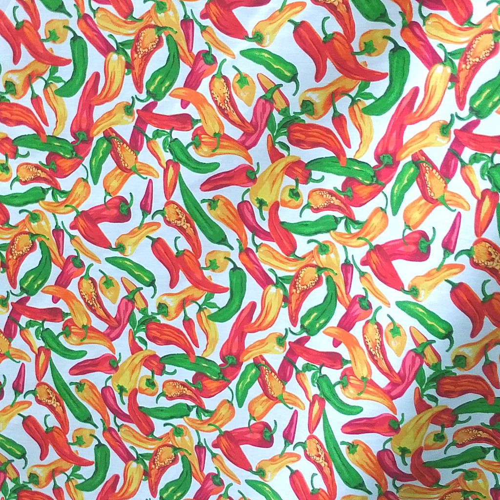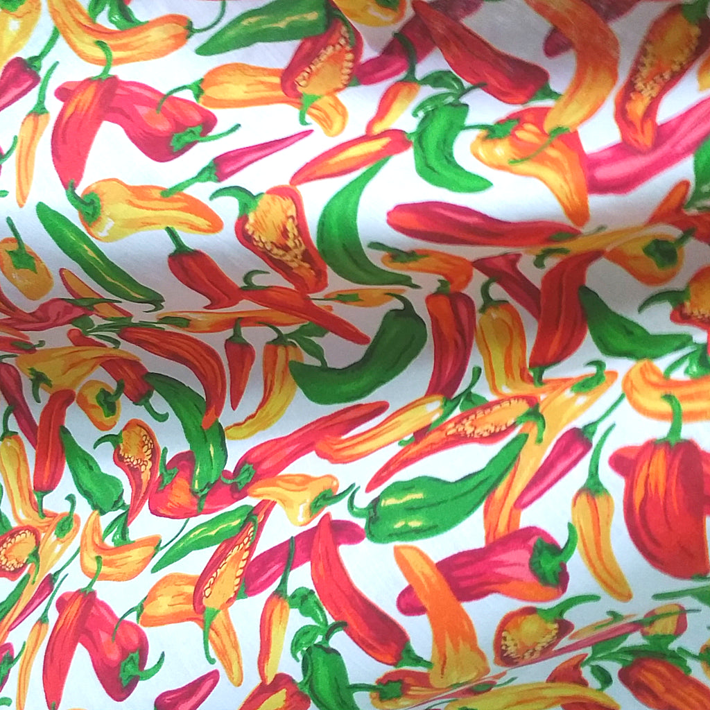 This fabric features a vibrant, all-over pattern of multi-colored chili peppers on a crisp white background. Made from a durable and breathable poly-cotton blend, this material is versatile and easy to care for, making it ideal for a wide range of apparel, quilting, and home décor projects.