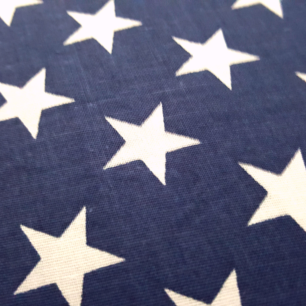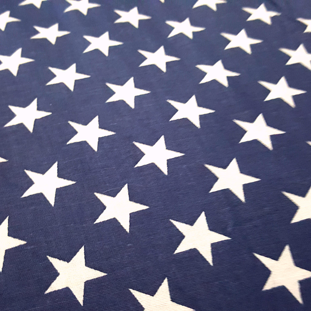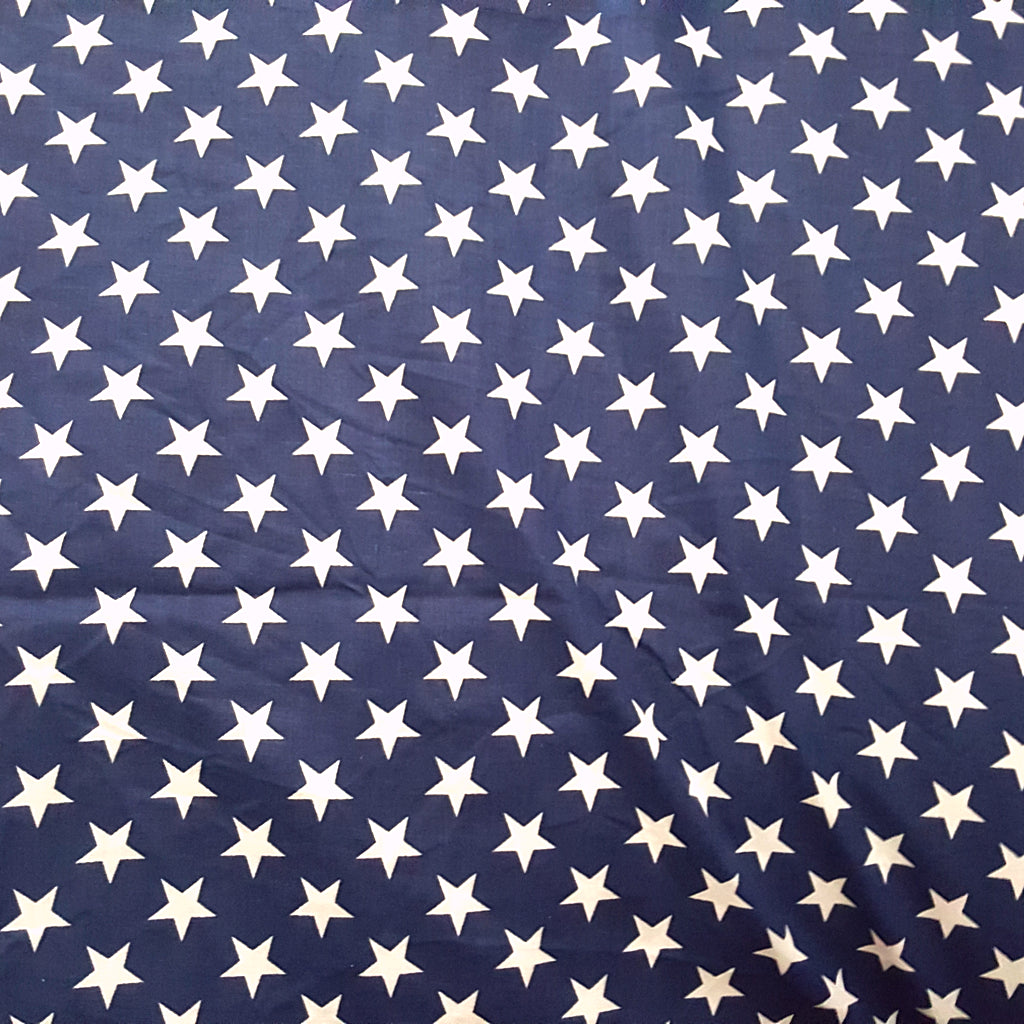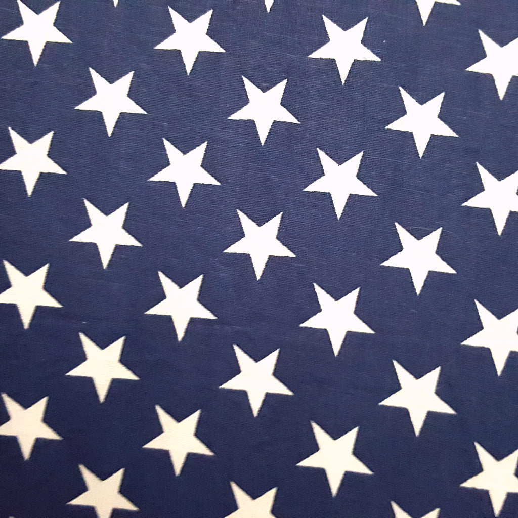 This fabric features a classic and timeless pattern of crisp white stars scattered across a deep navy-blue background. Crafted from a durable and versatile poly-cotton blend, this material is wrinkle-resistant and breathable, making it an excellent choice for patriotic-themed apparel, quilting, event decorations, and various craft projects.