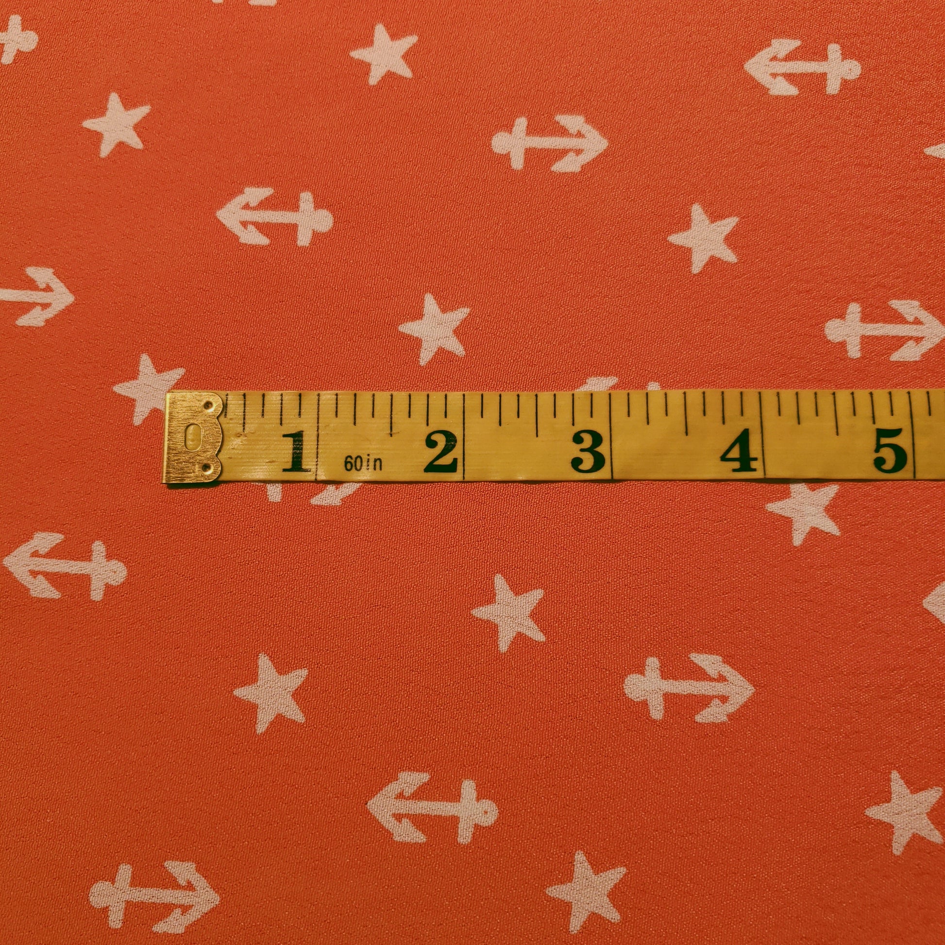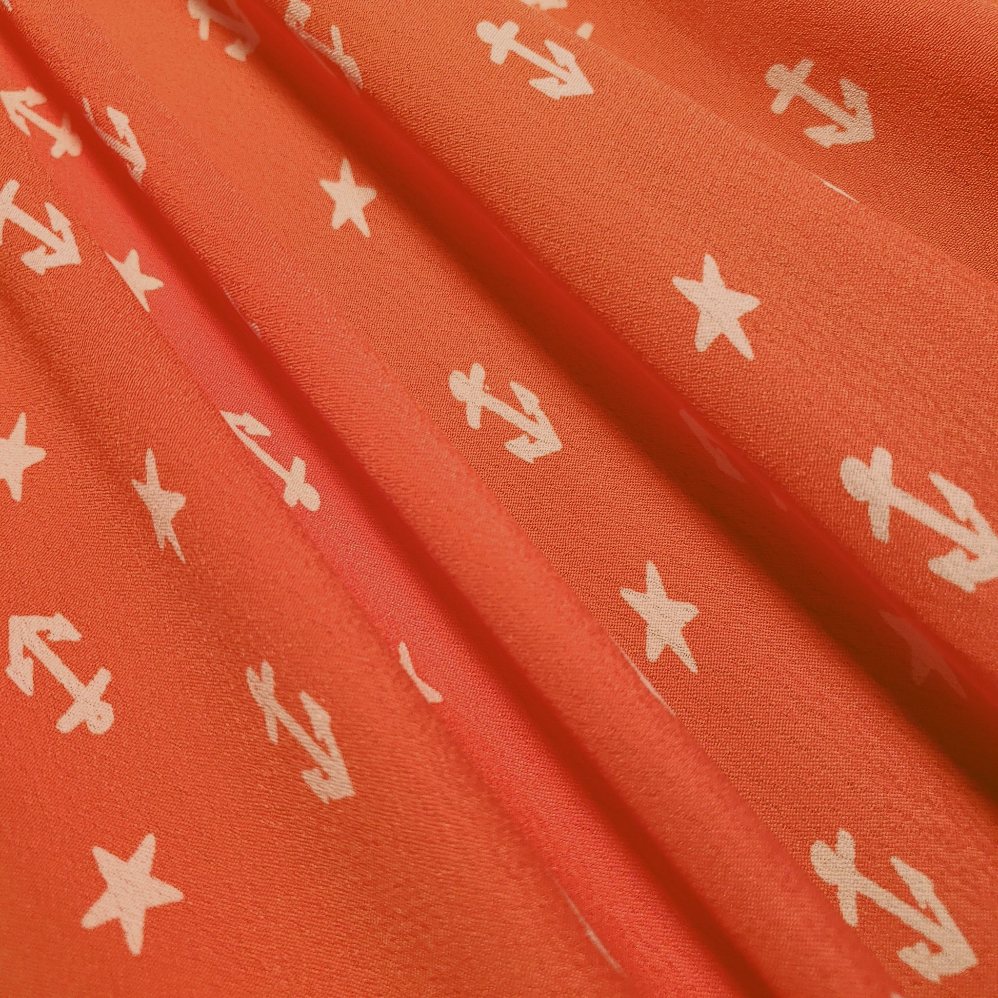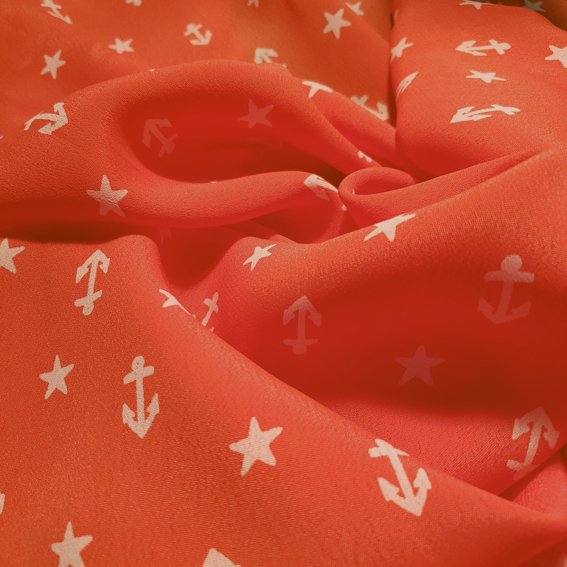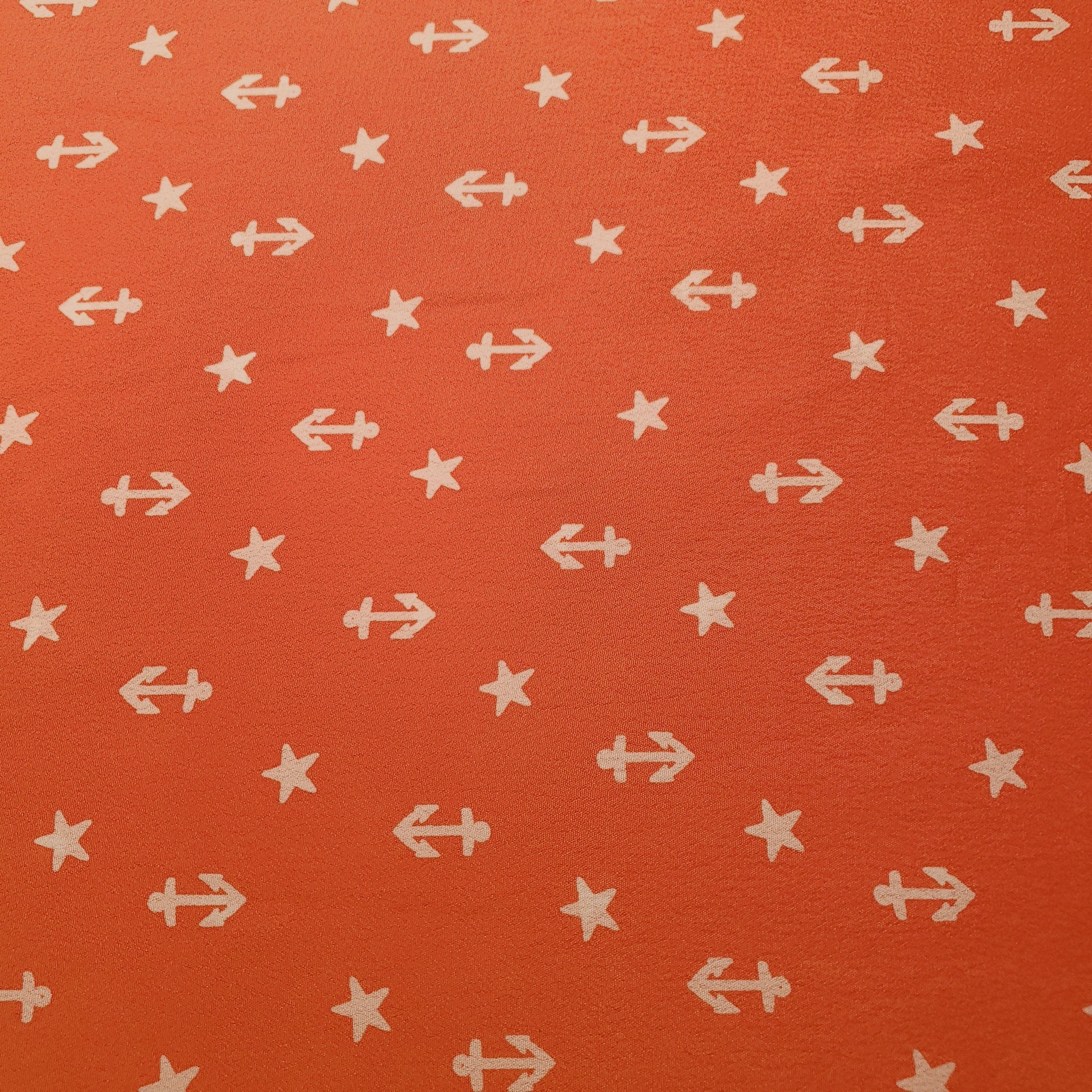 This fabric features a charming nautical pattern of small, off-white anchors and stars scattered across a warm, red-orange background. As a lightweight chiffon, this material offers a beautiful, fluid drape and a delicate sheer quality, making it an ideal choice for creating breezy apparel like blouses, scarves, and beach cover-ups, as well as for decorative projects.