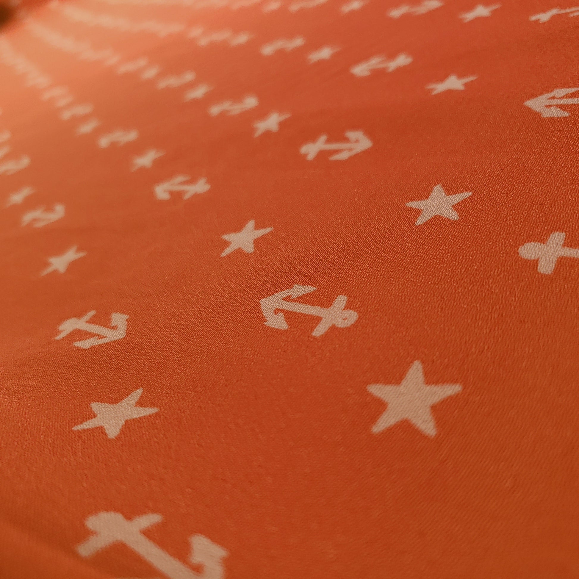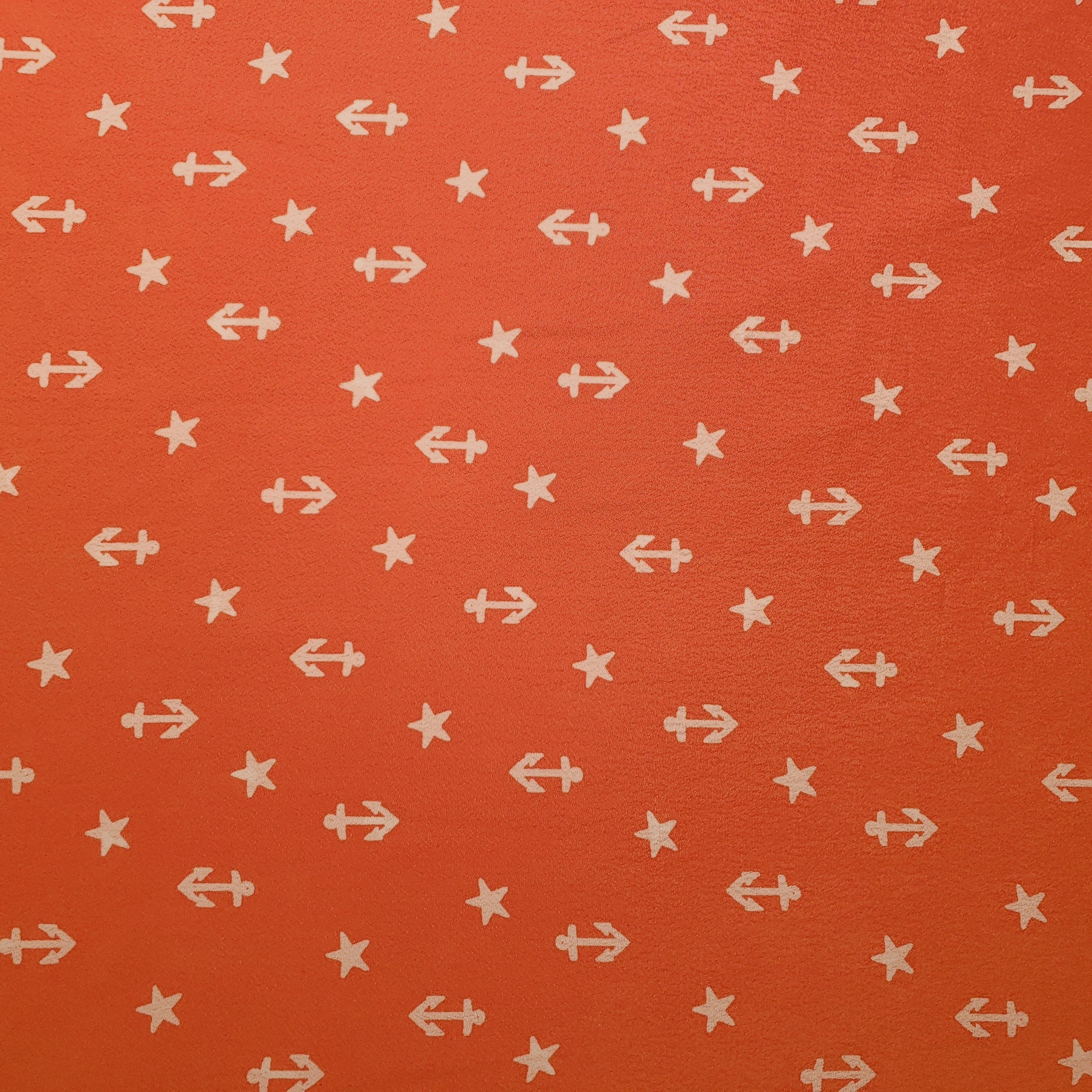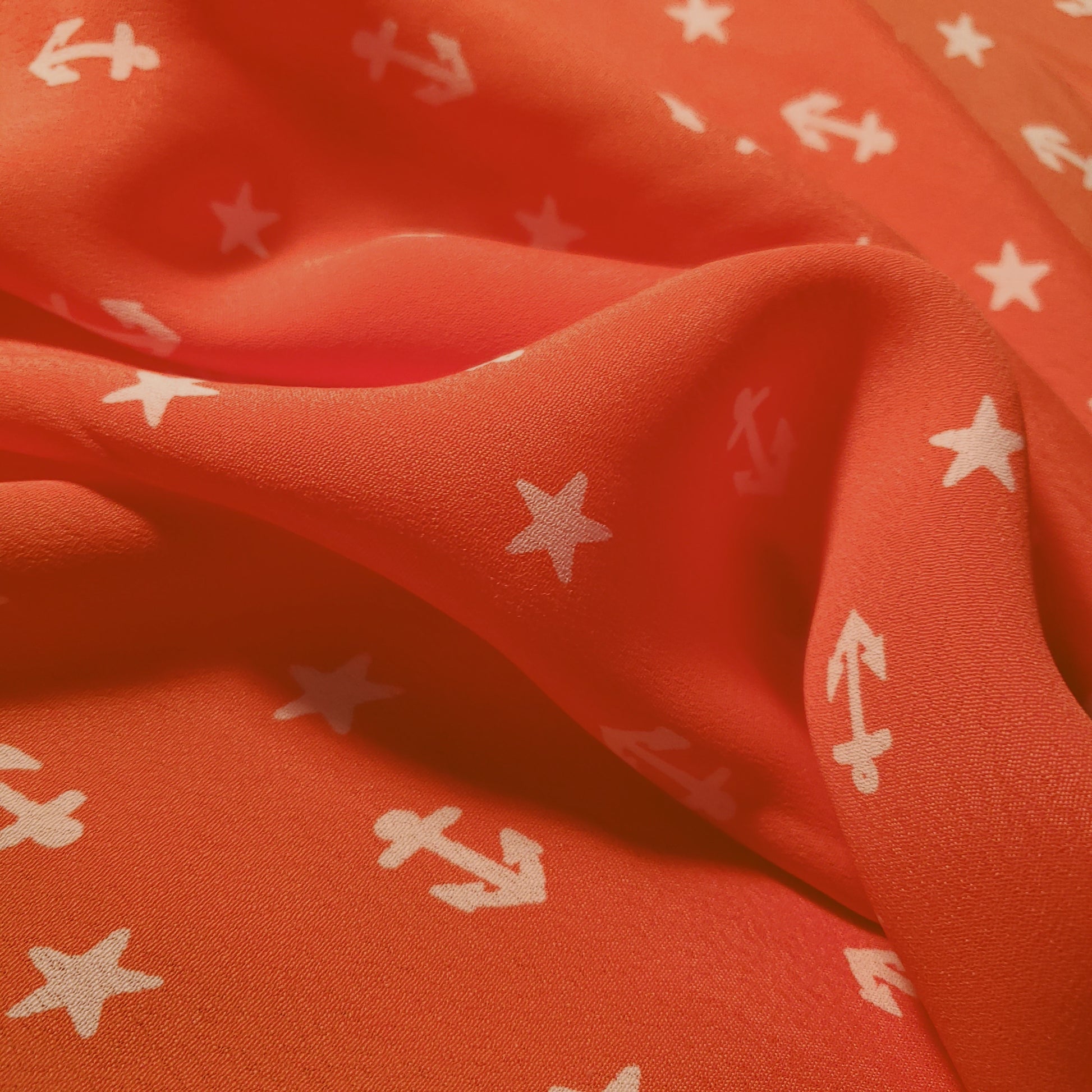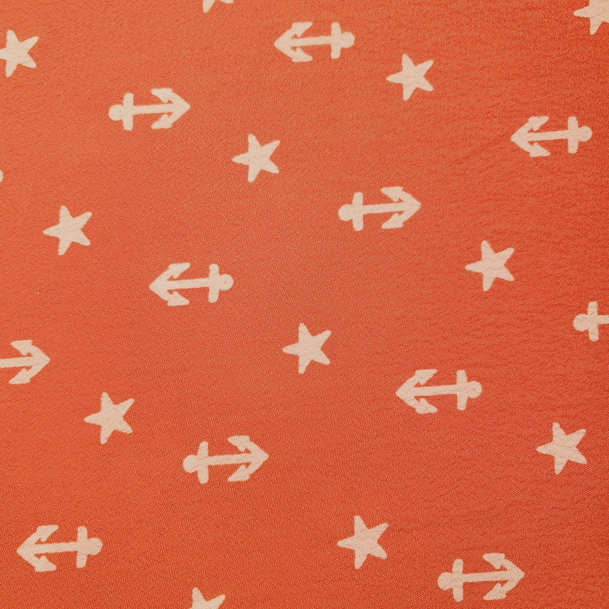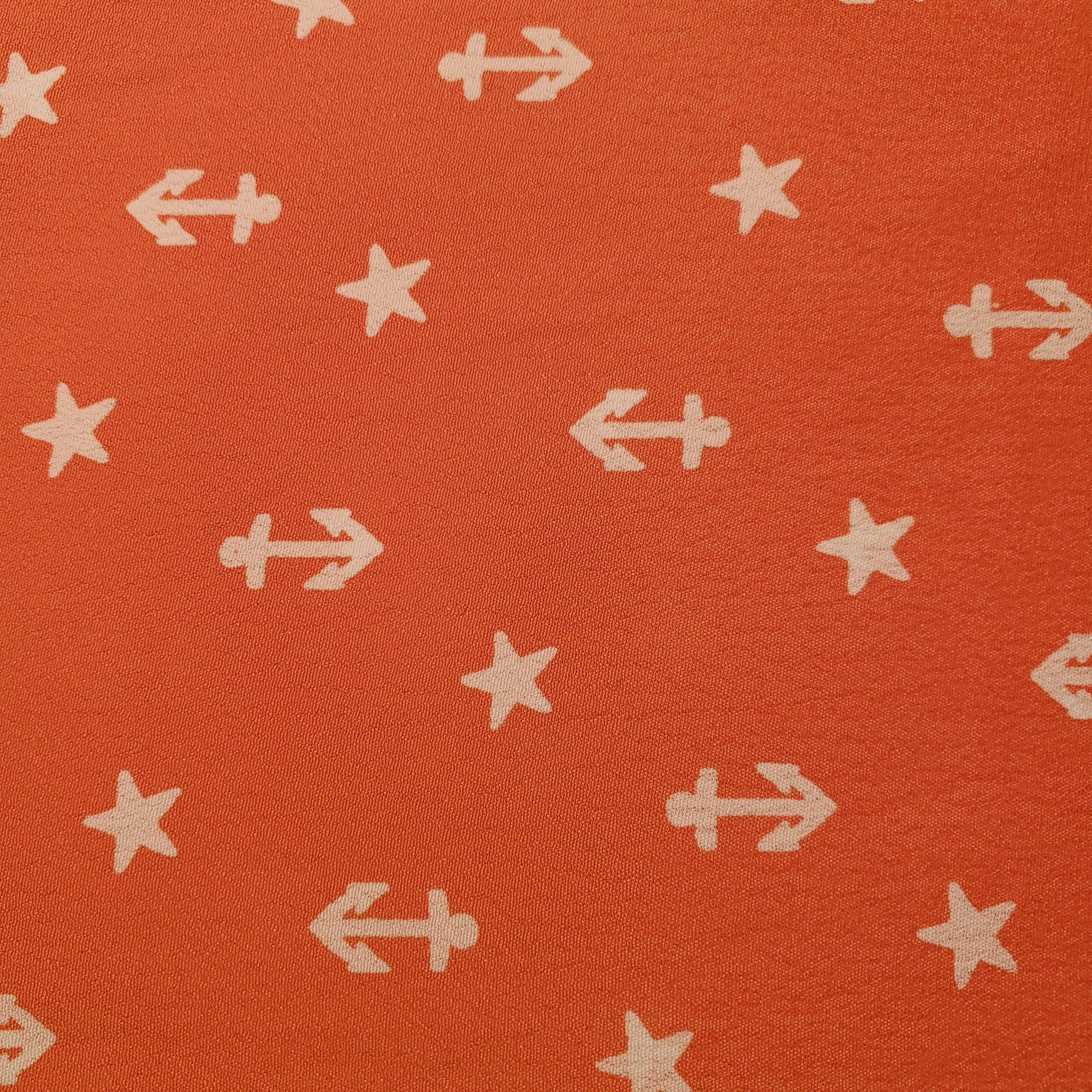 This fabric features a charming nautical pattern of small, off-white anchors and stars scattered across a warm, red-orange background. As a lightweight chiffon, this material offers a beautiful, fluid drape and a delicate sheer quality, making it an ideal choice for creating breezy apparel like blouses, scarves, and beach cover-ups, as well as for decorative projects.