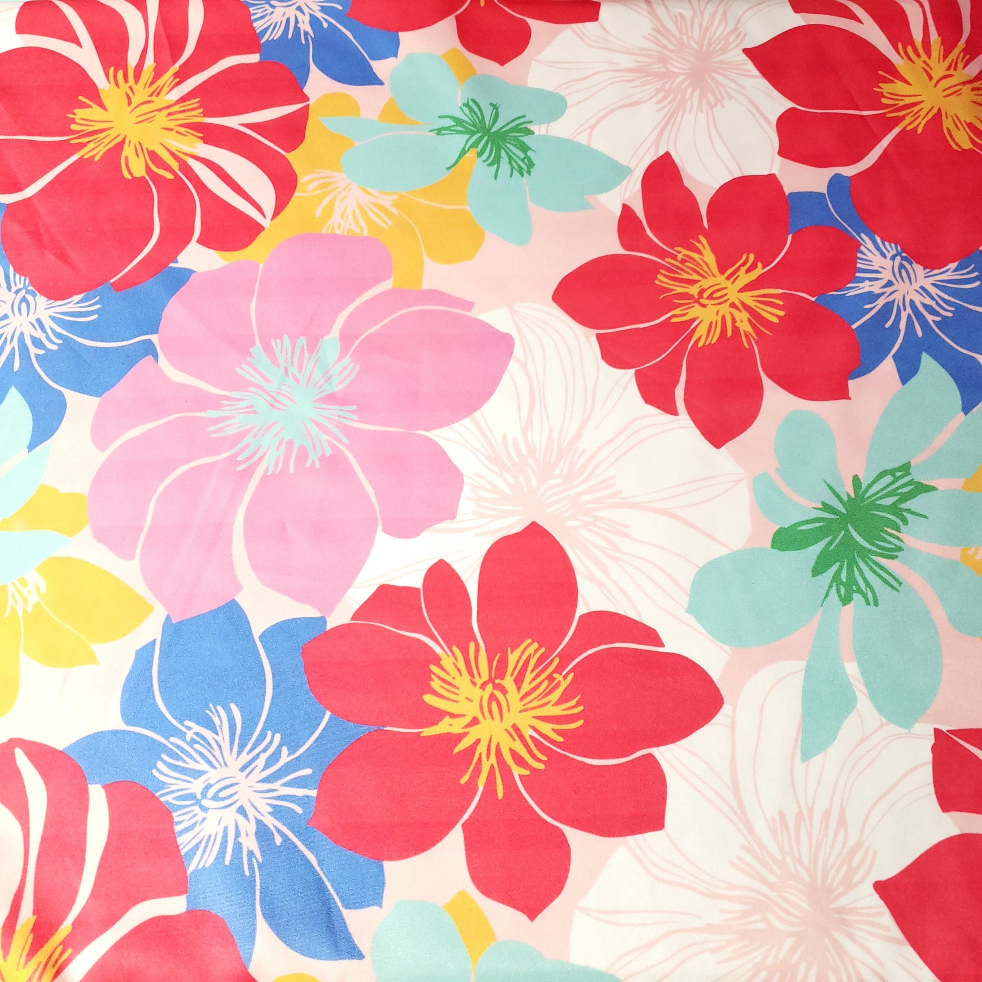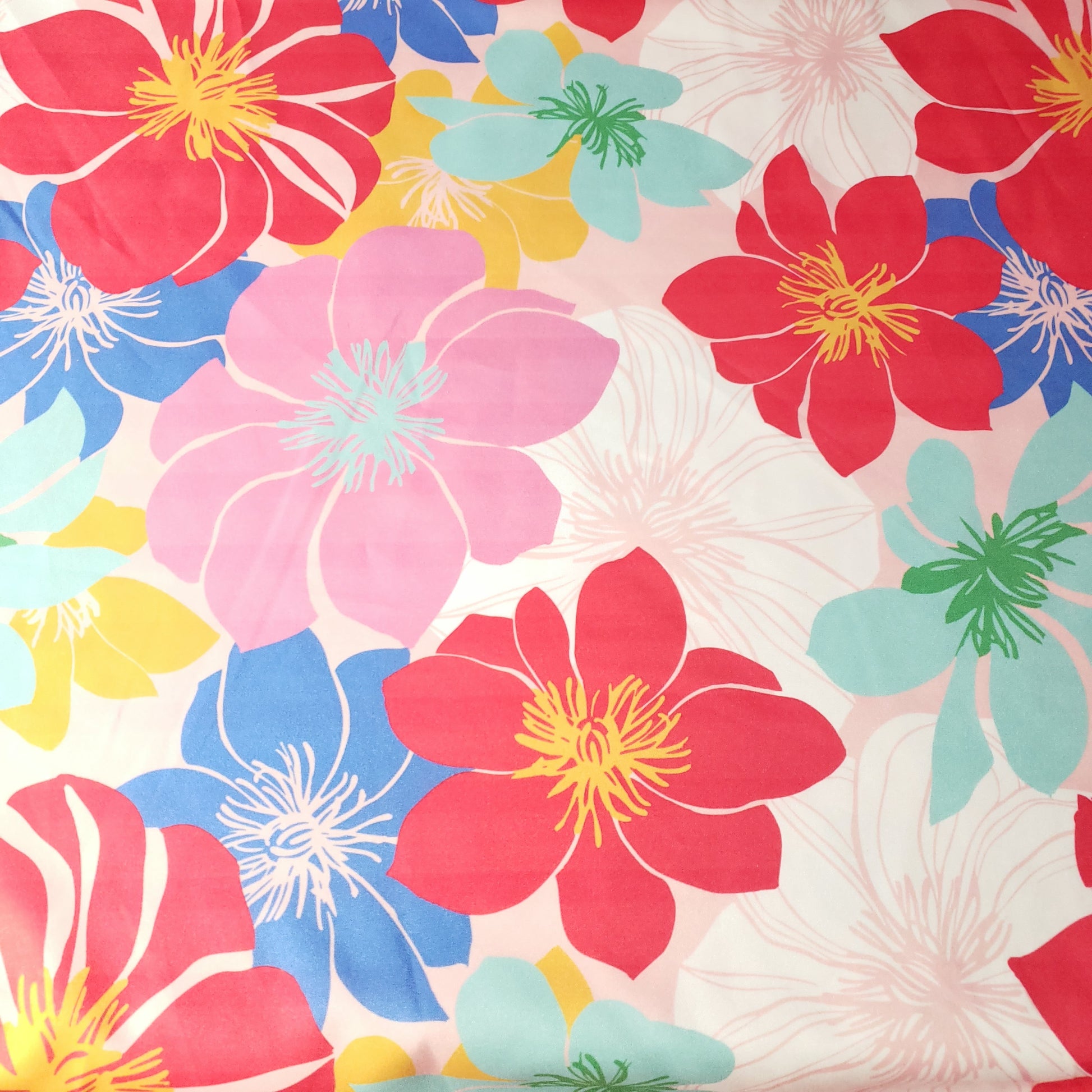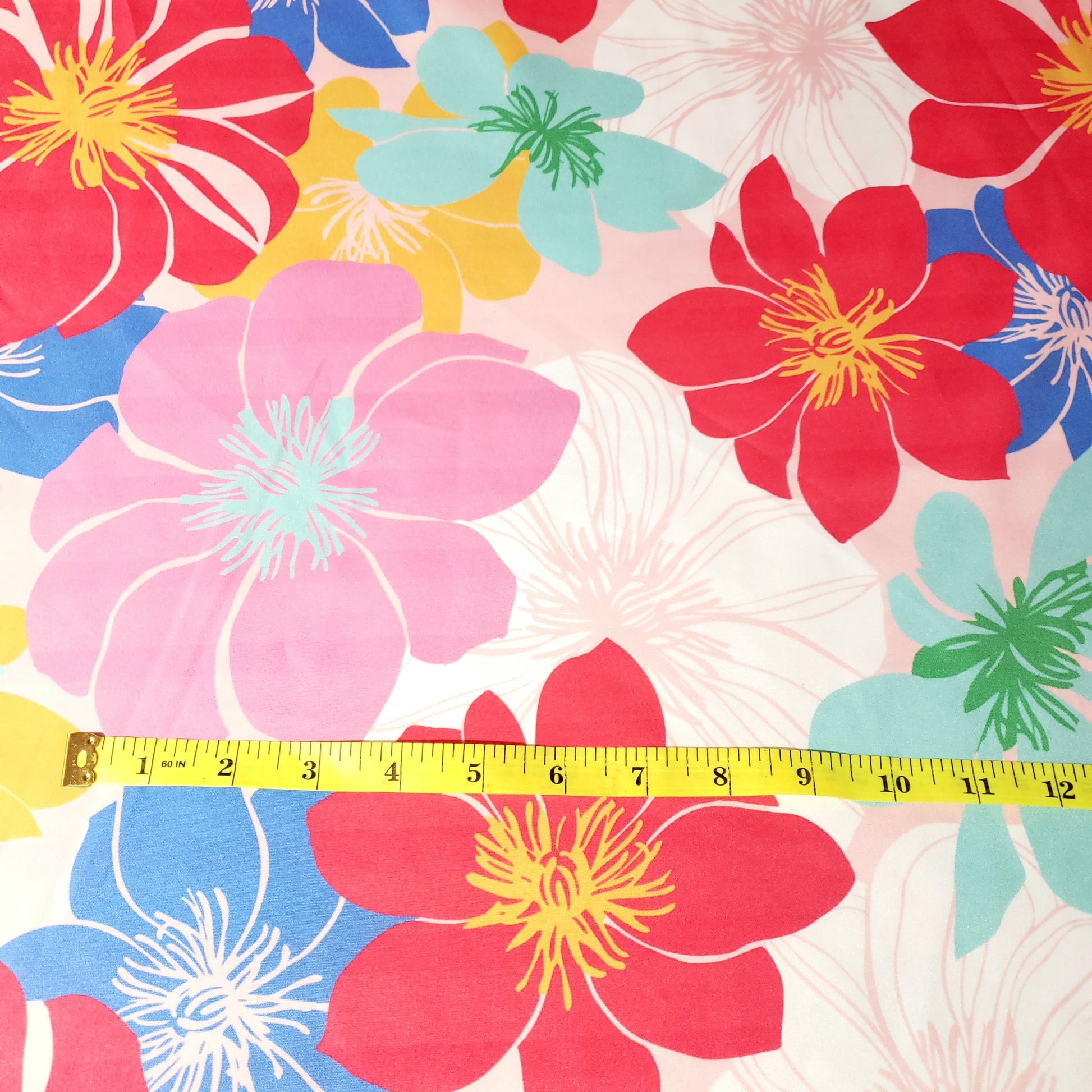 This fabric features a vibrant, large-scale floral print with bold flowers in shades of pink, red, blue, and yellow on a soft pink background. Made from durable polyester broadcloth, this material has a smooth finish and is wrinkle-resistant, making it a versatile choice for eye-catching apparel, home décor accents, tablecloths, and various craft projects.