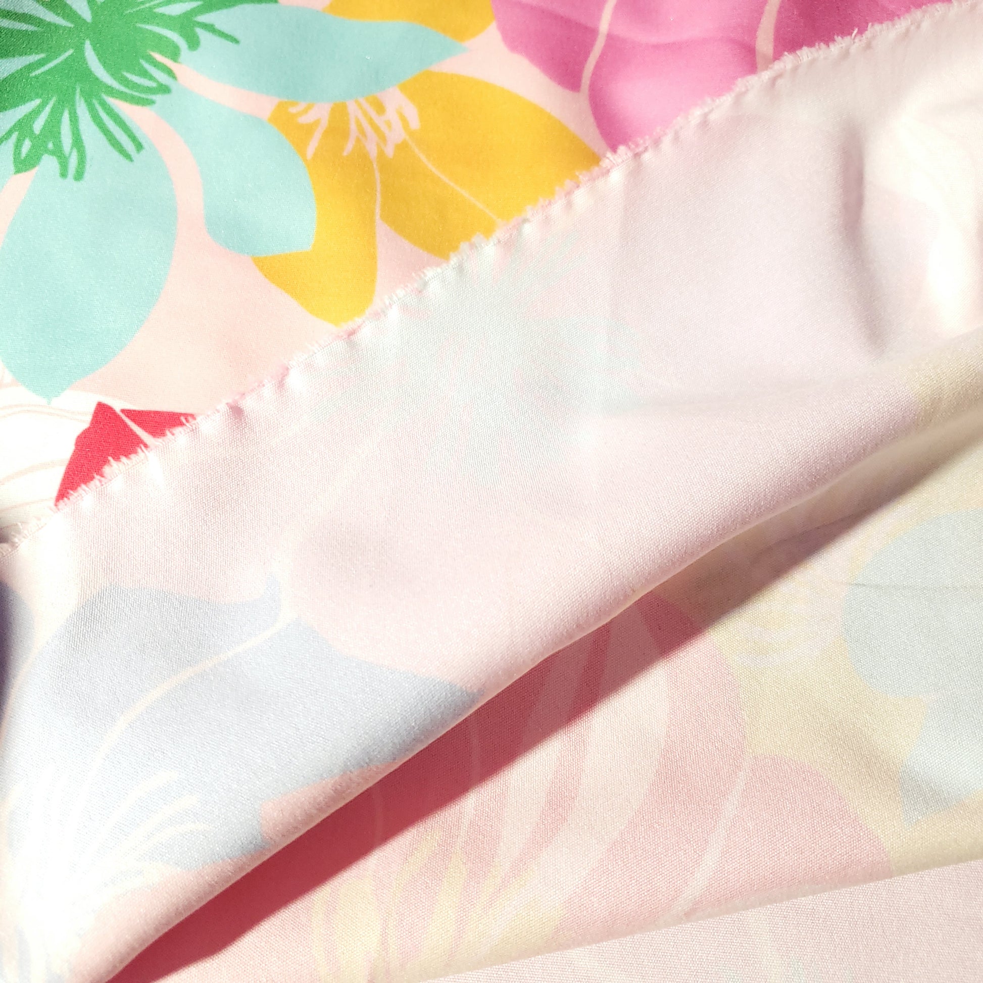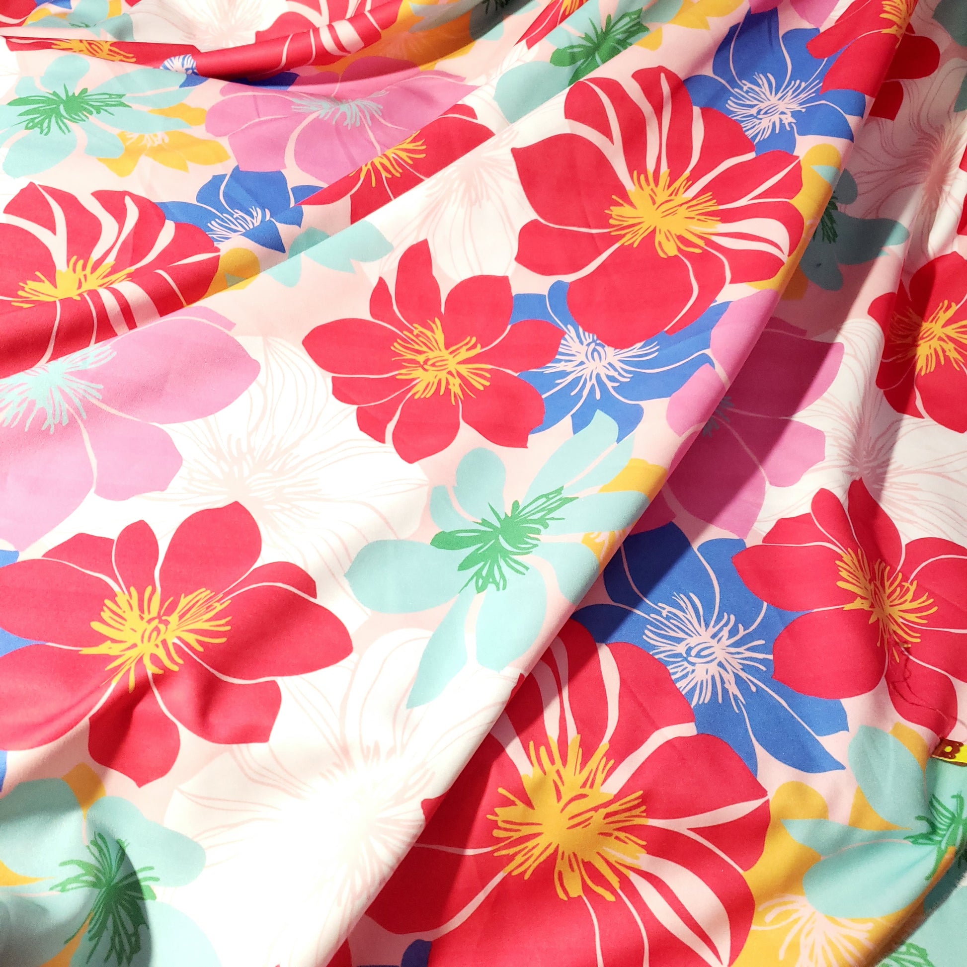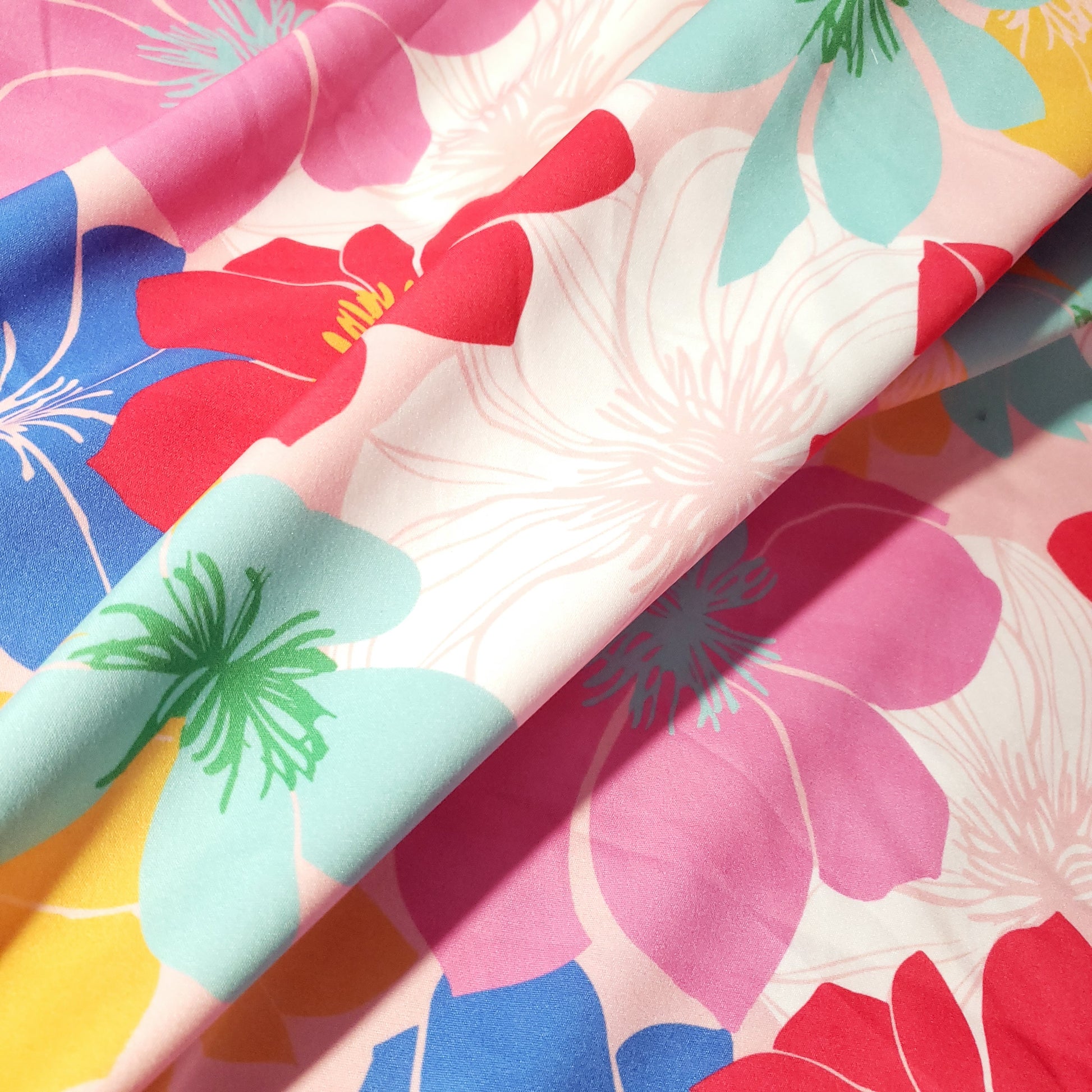 This fabric features a vibrant, large-scale floral print with bold flowers in shades of pink, red, blue, and yellow on a soft pink background. Made from durable polyester broadcloth, this material has a smooth finish and is wrinkle-resistant, making it a versatile choice for eye-catching apparel, home décor accents, tablecloths, and various craft projects.