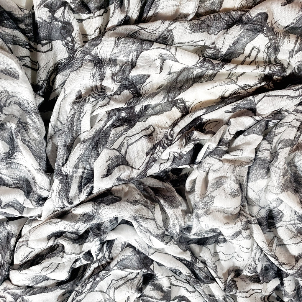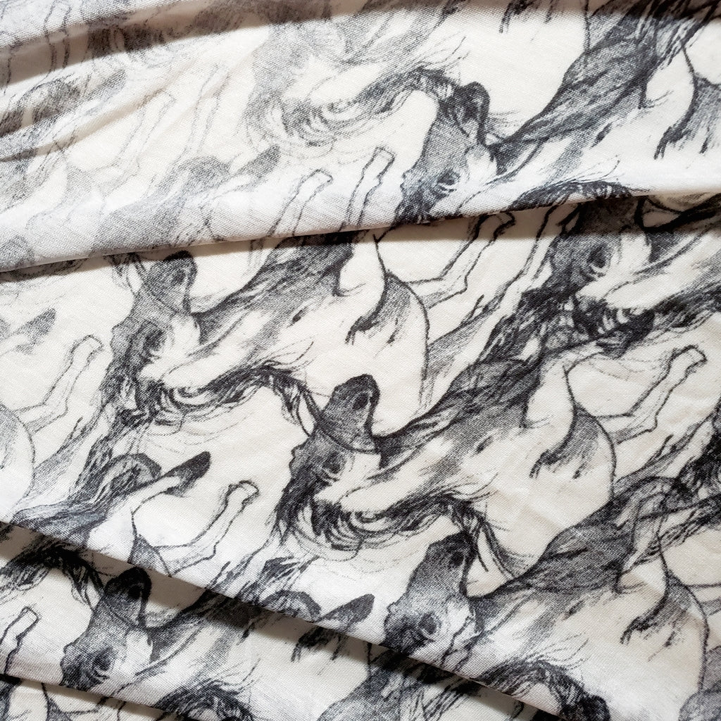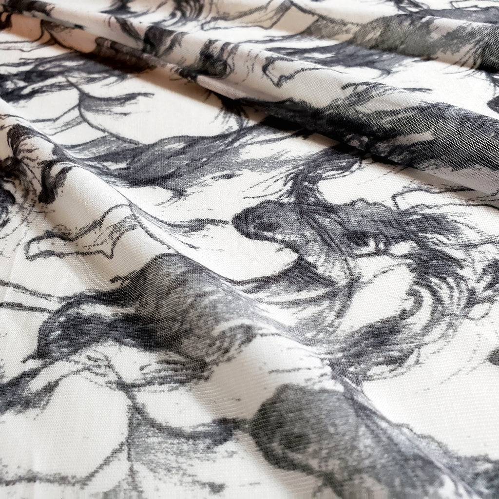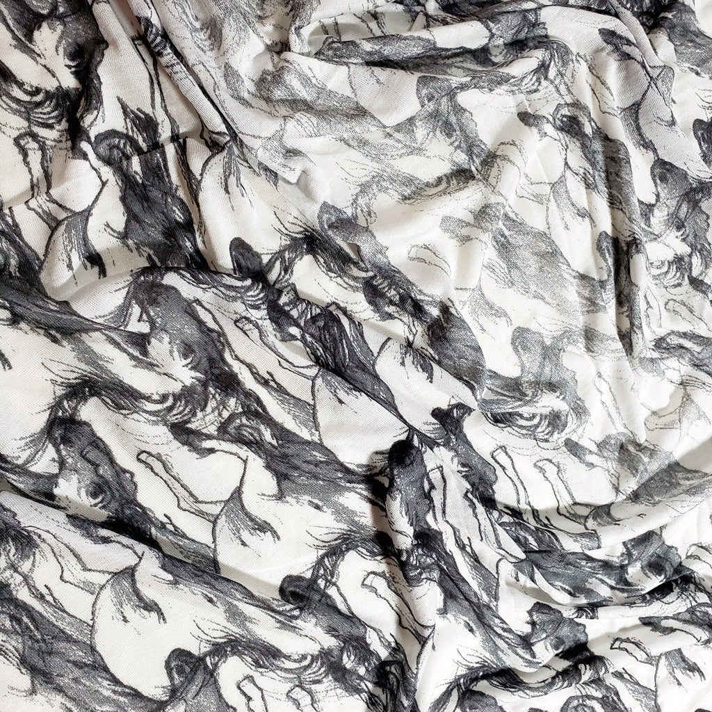 This fabric features a dynamic and artistic sketch print of running horses in black and grey on a white background. As a cotton stretch jersey, this lightweight knit is exceptionally soft, breathable, and flexible, offering a comfortable stretch with excellent recovery. Its smooth surface and fluid drape make it ideal for creating stylish apparel that requires ease of movement.