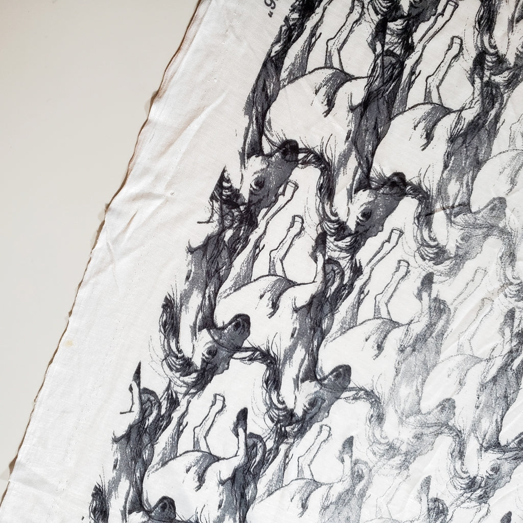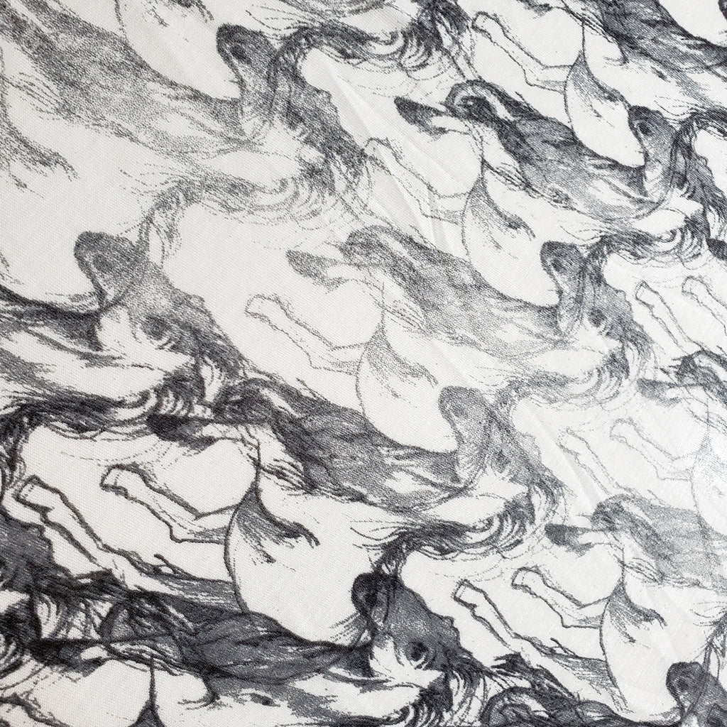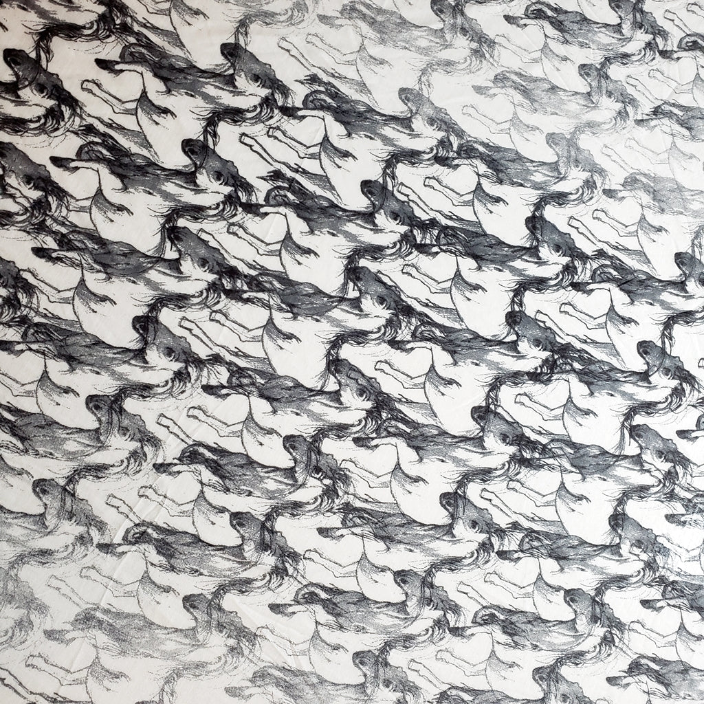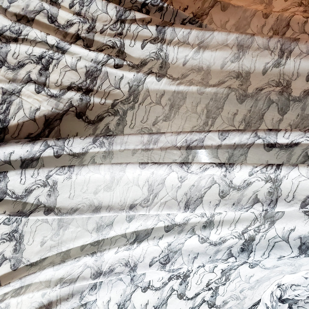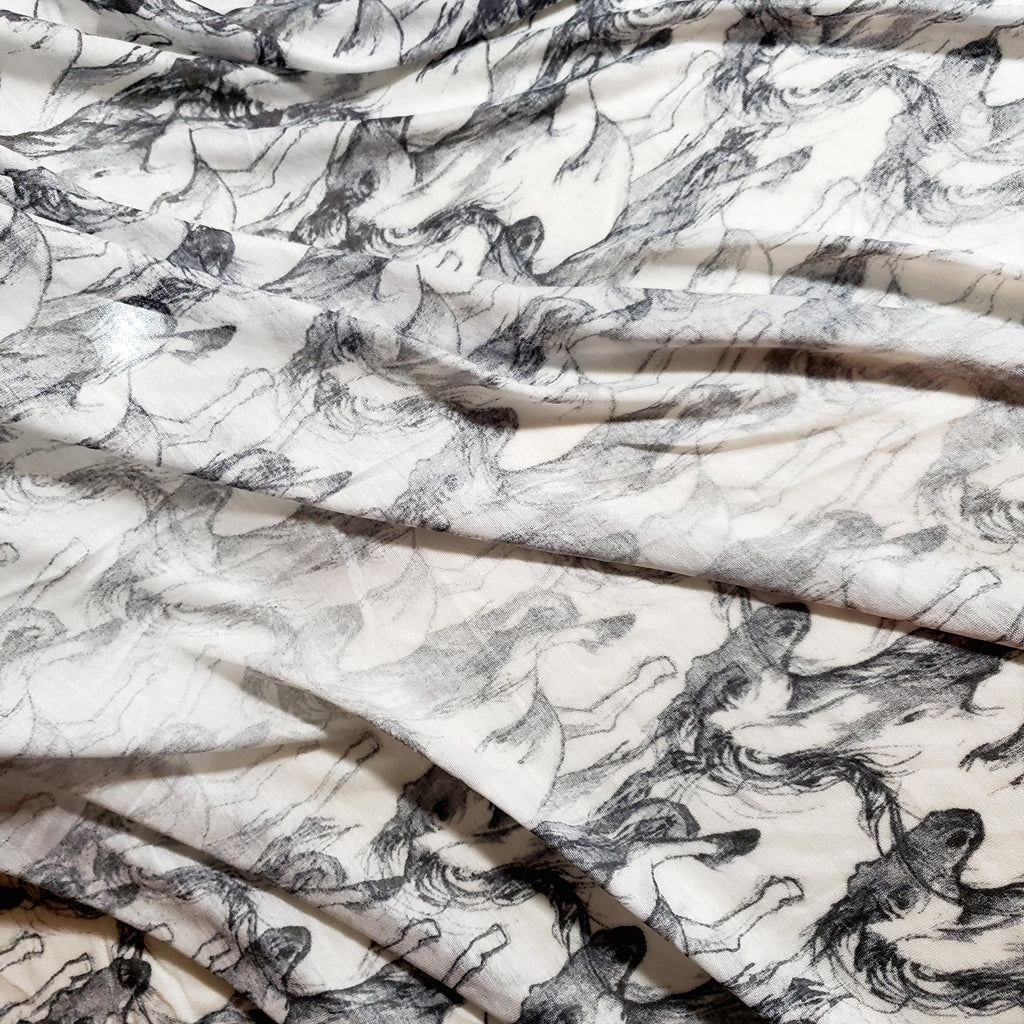This fabric features a dynamic and artistic sketch print of running horses in black and grey on a white background. As a cotton stretch jersey, this lightweight knit is exceptionally soft, breathable, and flexible, offering a comfortable stretch with excellent recovery. Its smooth surface and fluid drape make it ideal for creating stylish apparel that requires ease of movement.