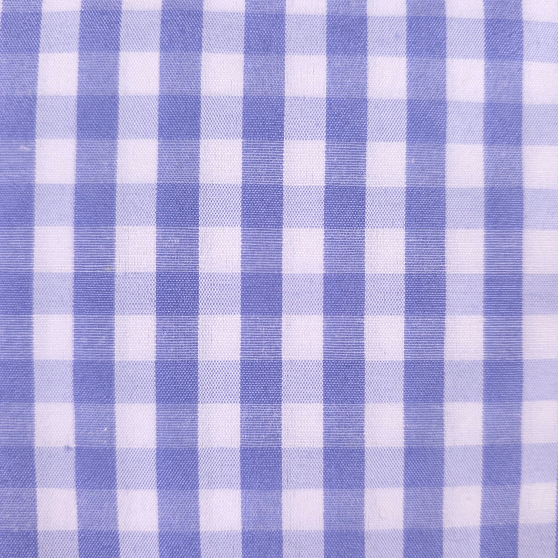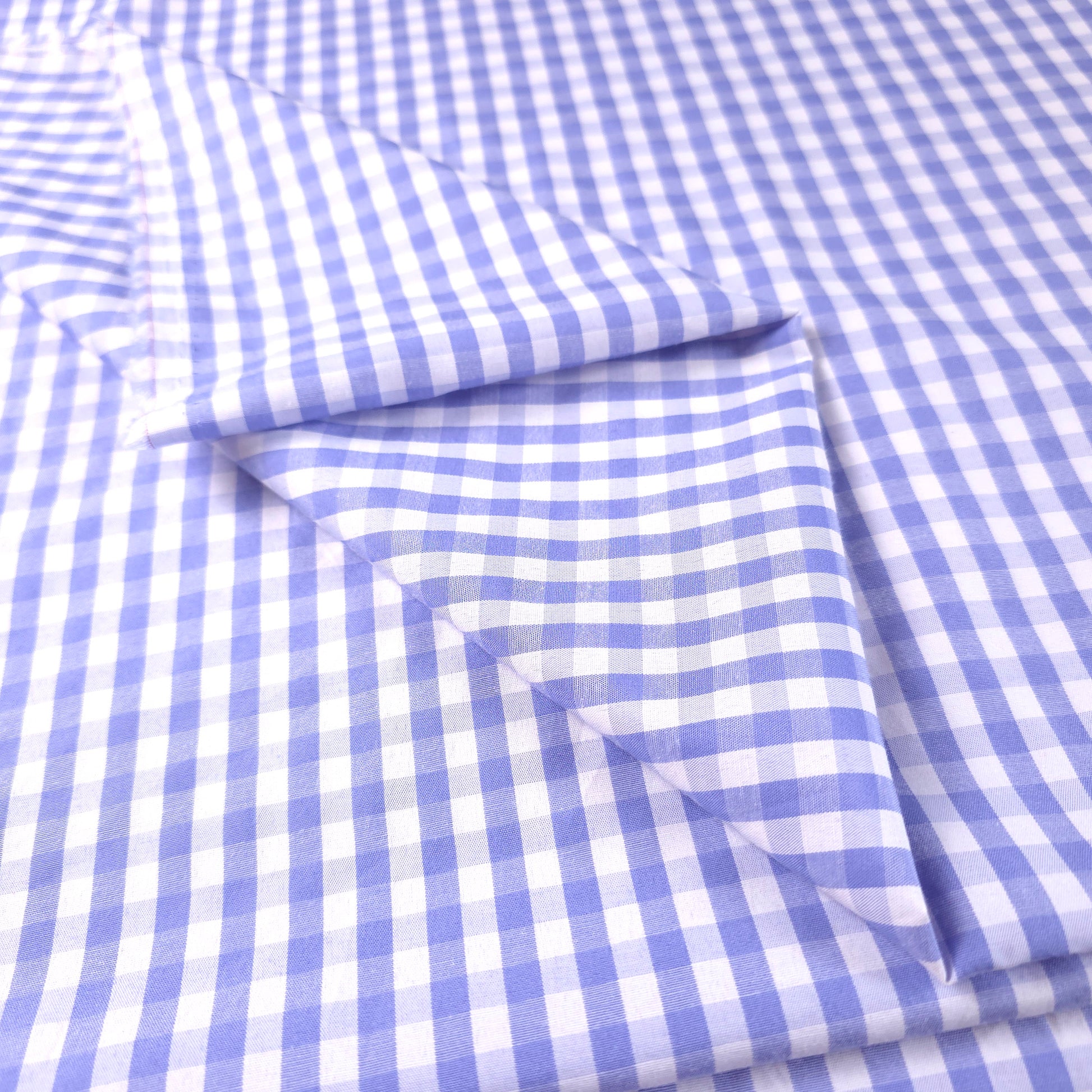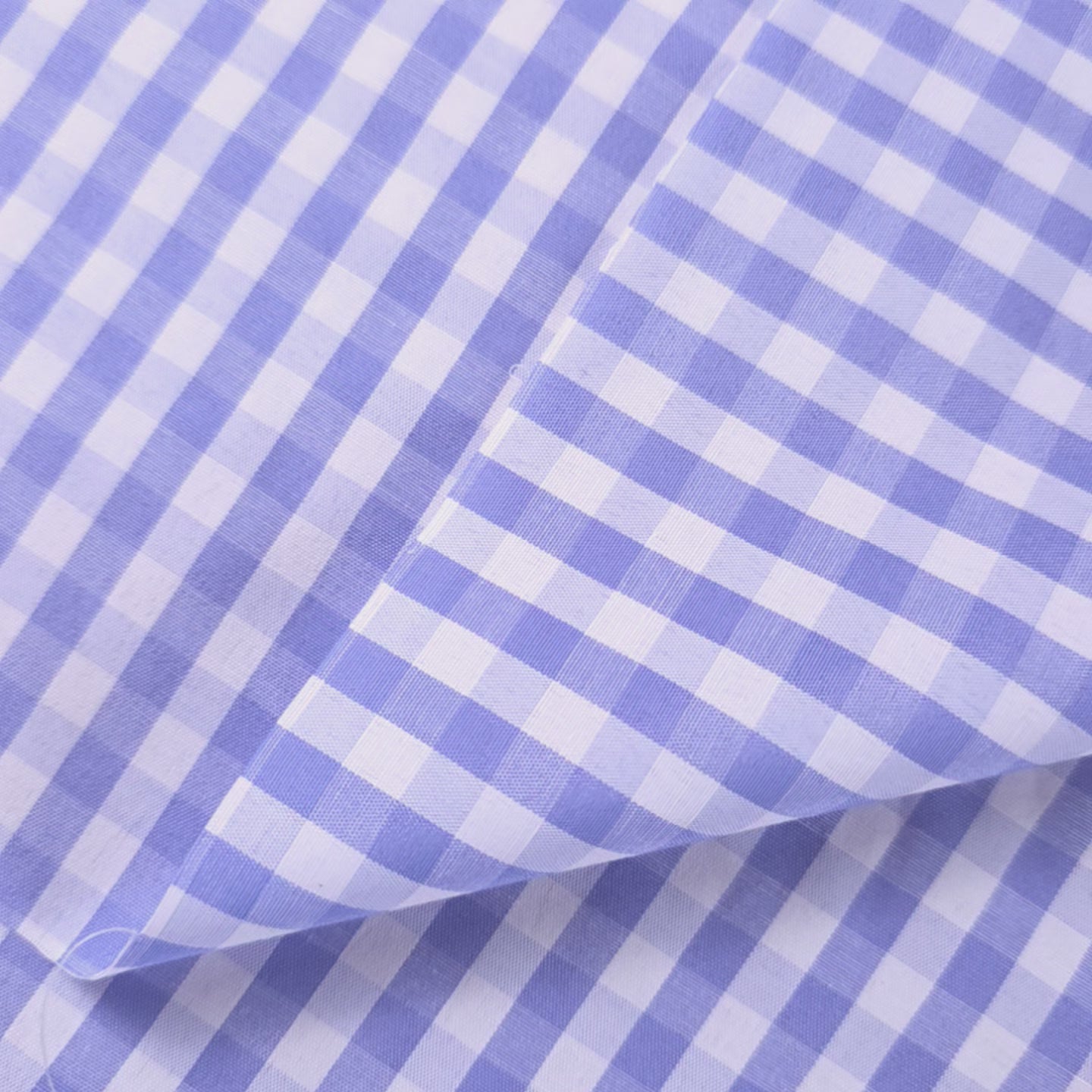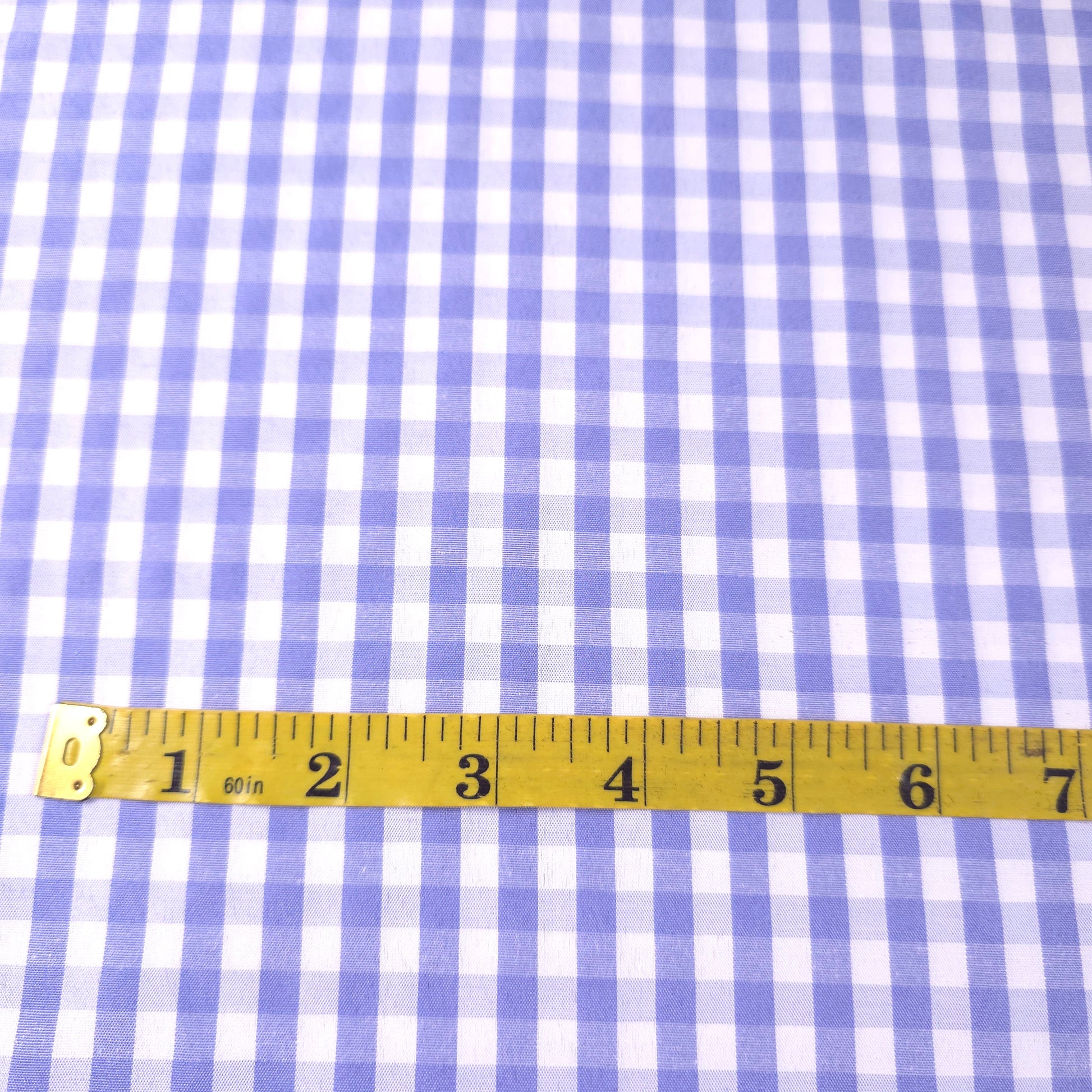 This is a light blue gingham poly cotton fabric. It features a classic 1/4 inch checkered pattern, made up of alternating squares of vibrant blue and crisp white. The poly cotton blend combines the softness and breathability of cotton with the durability and wrinkle-resistance of polyester. The colors are bright and consistent, offering a fresh and cheerful aesthetic.