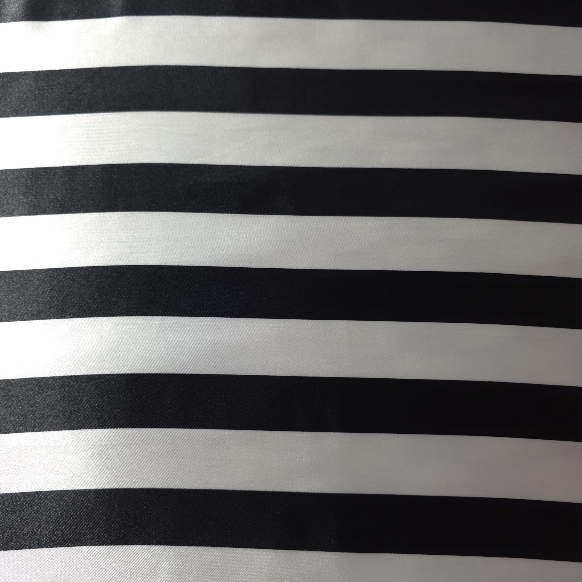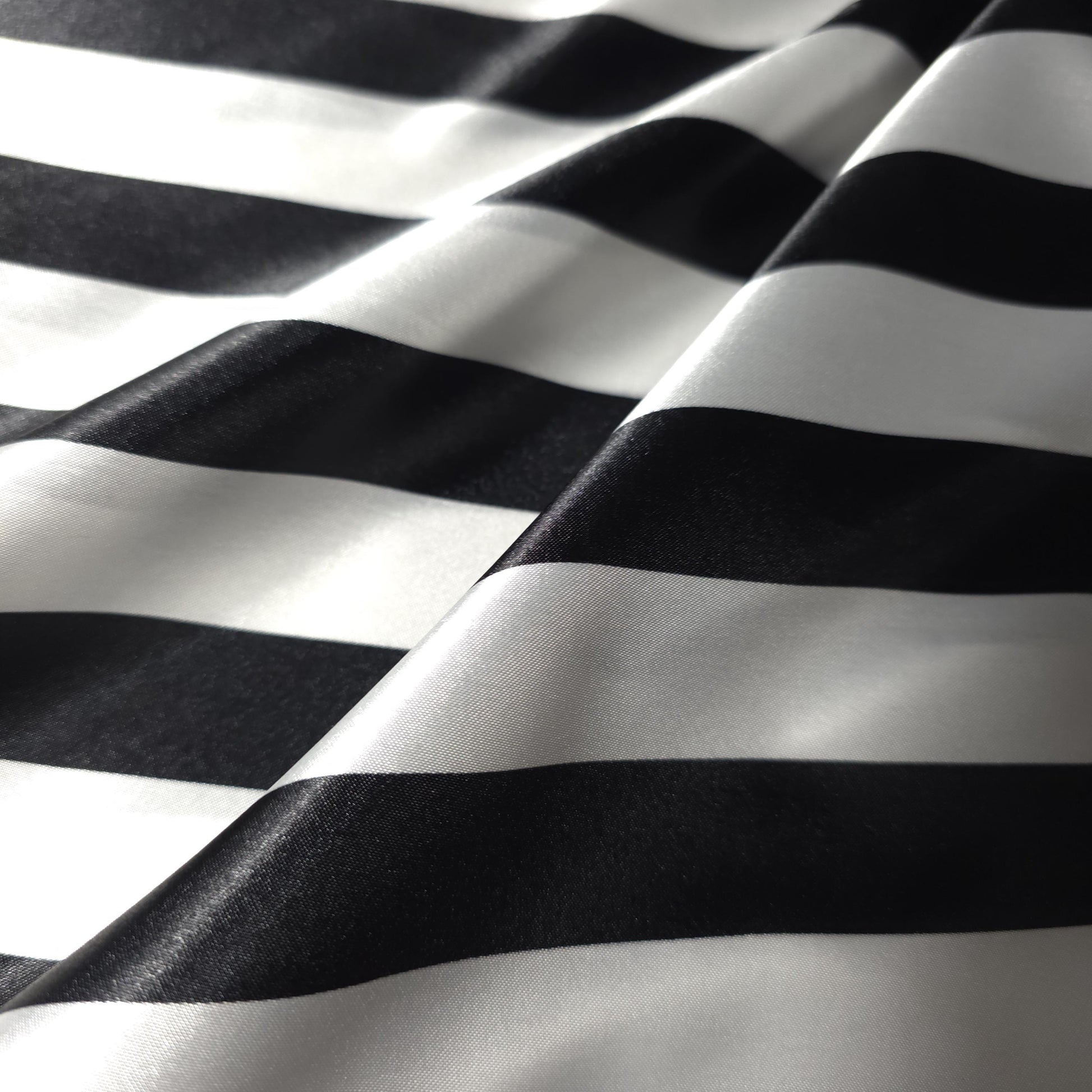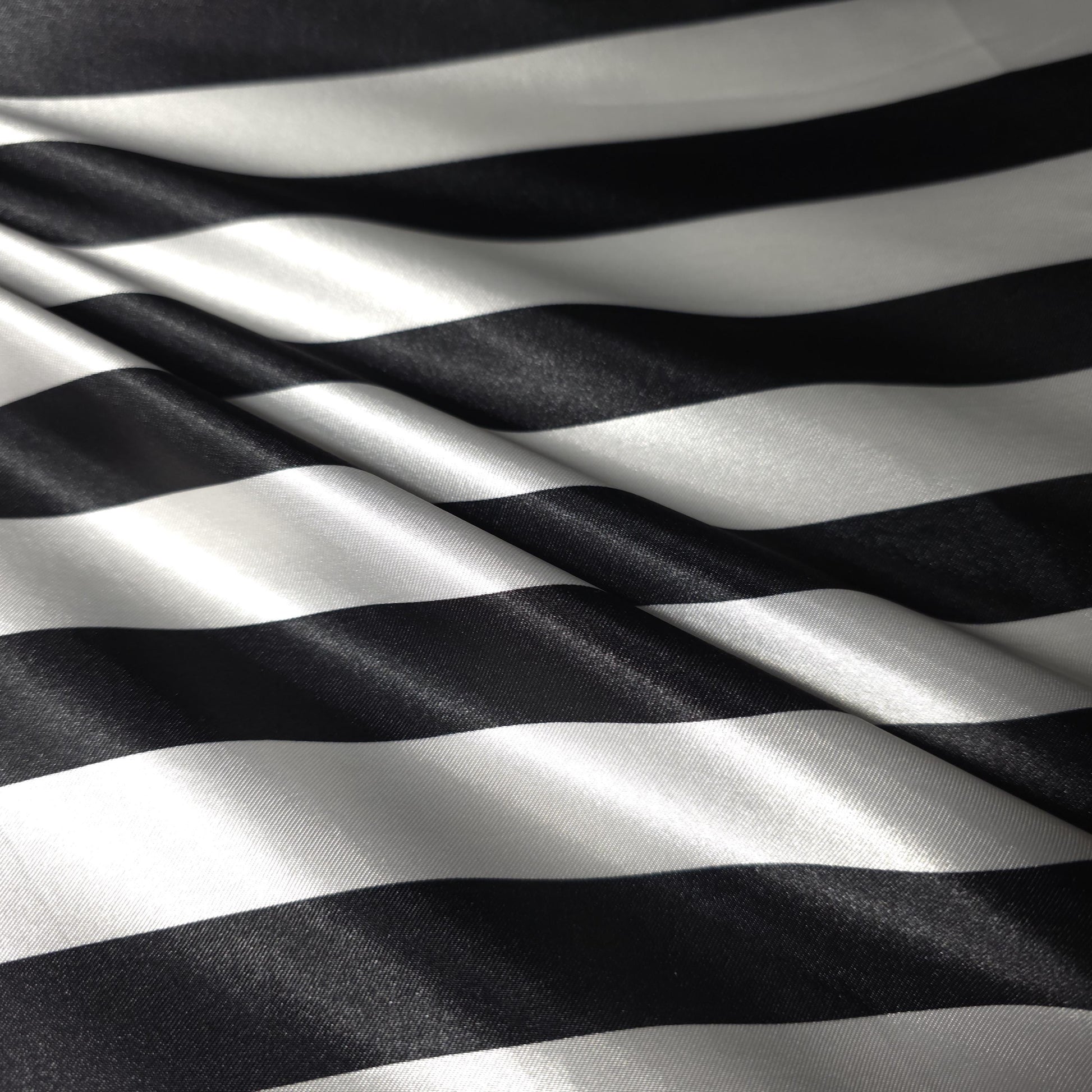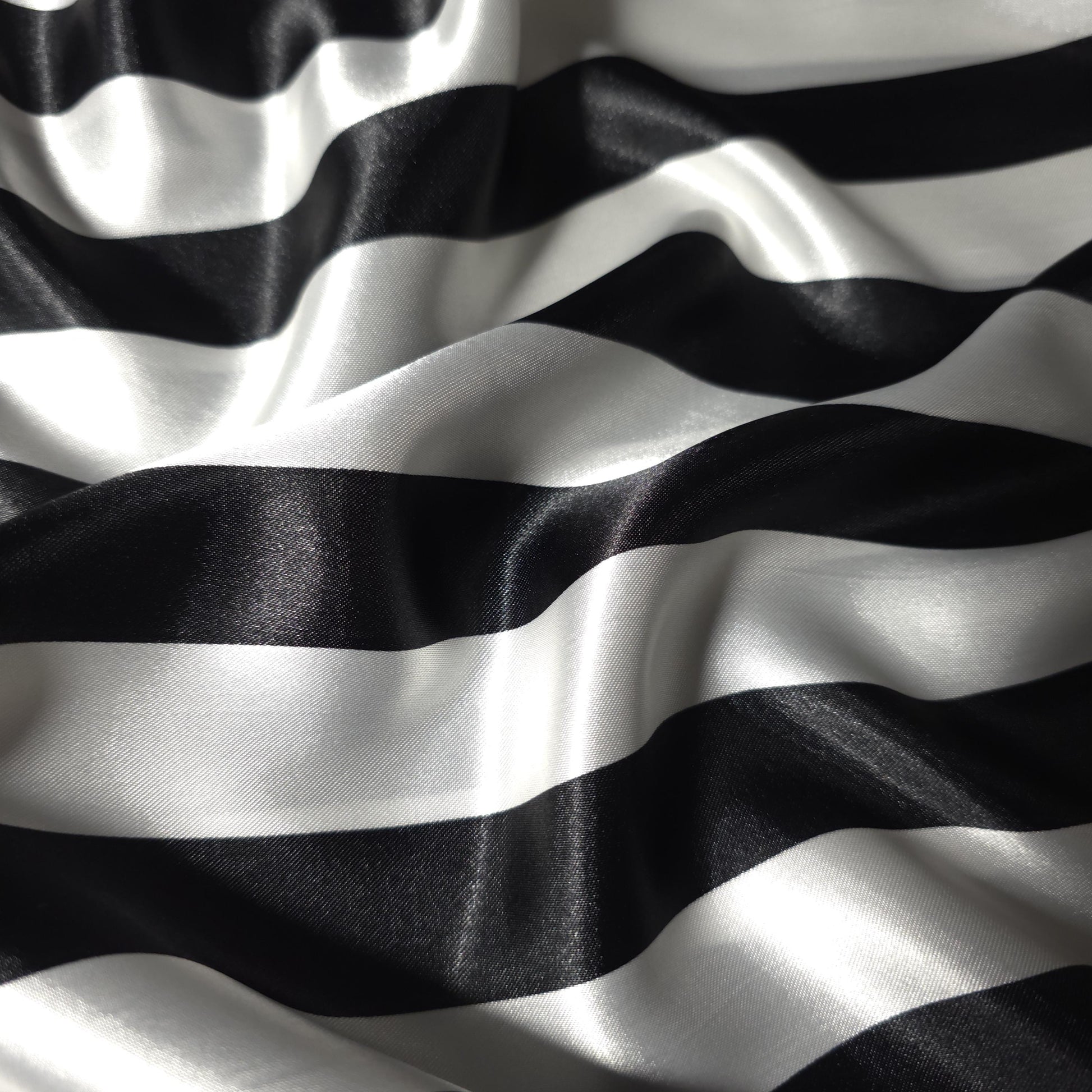 This lightweight satin fabric features a bold black and white one-inch striped pattern. One side is shiny, while the reverse side has a matte finish. It has a liquid drape, creating a smooth, flowing effect.