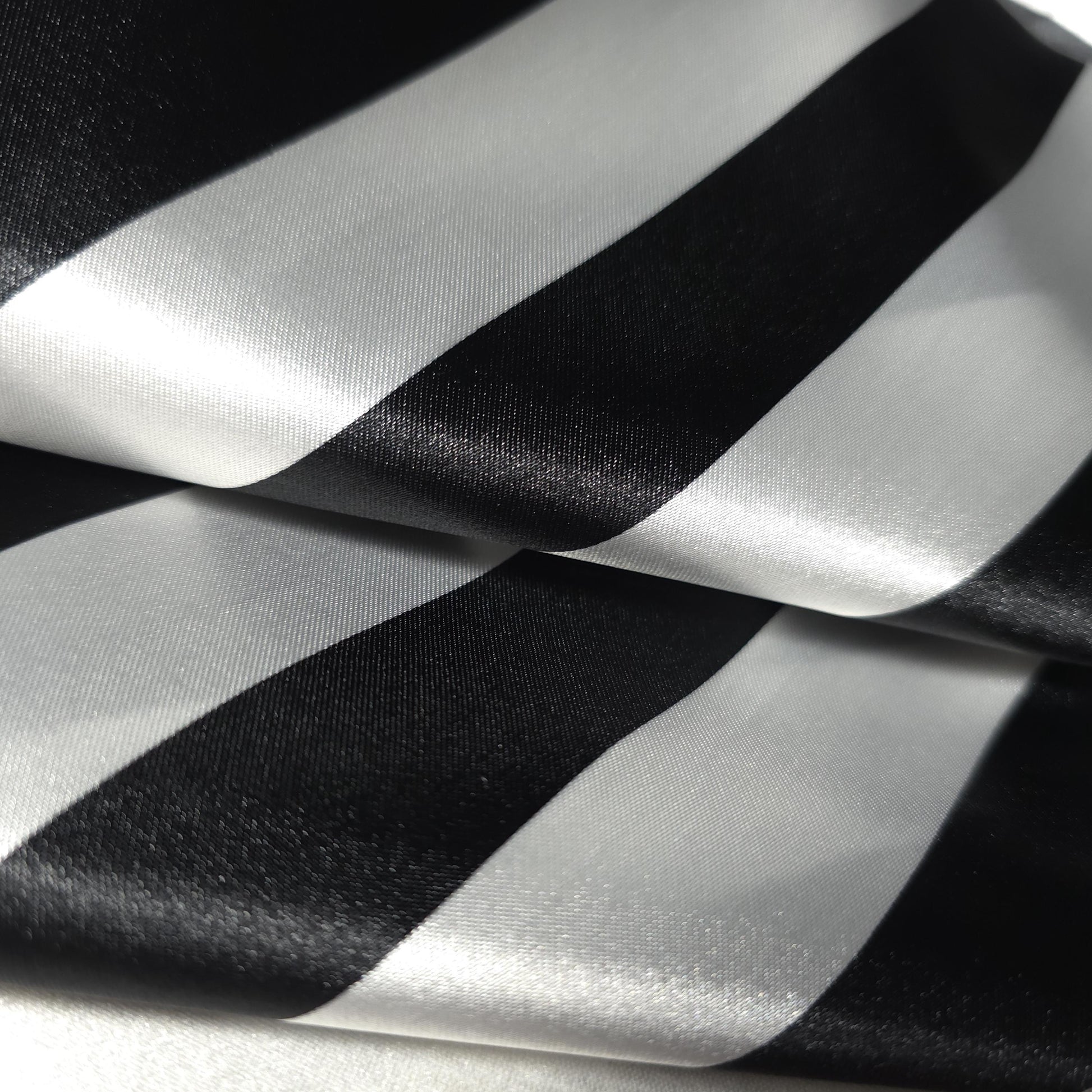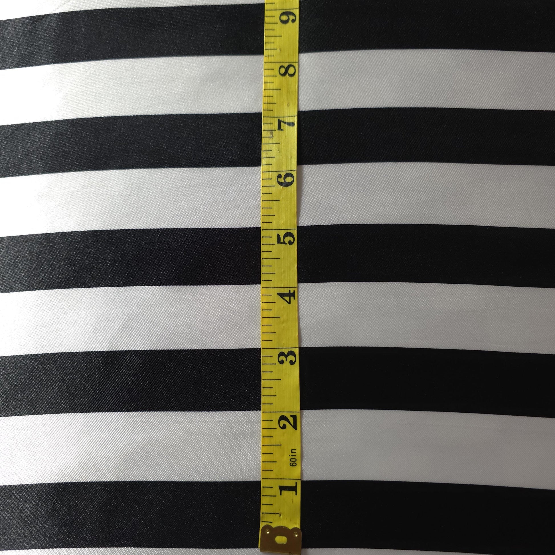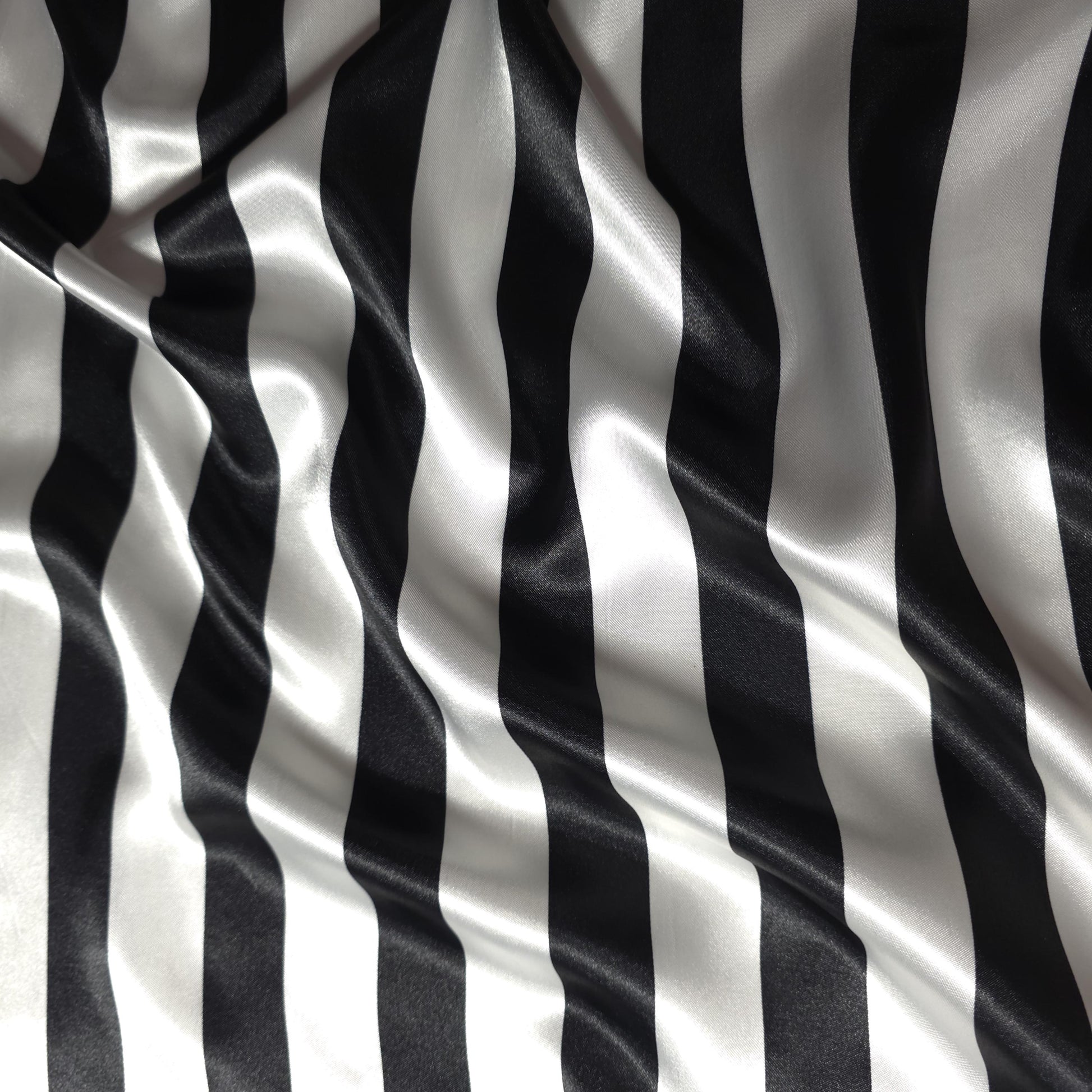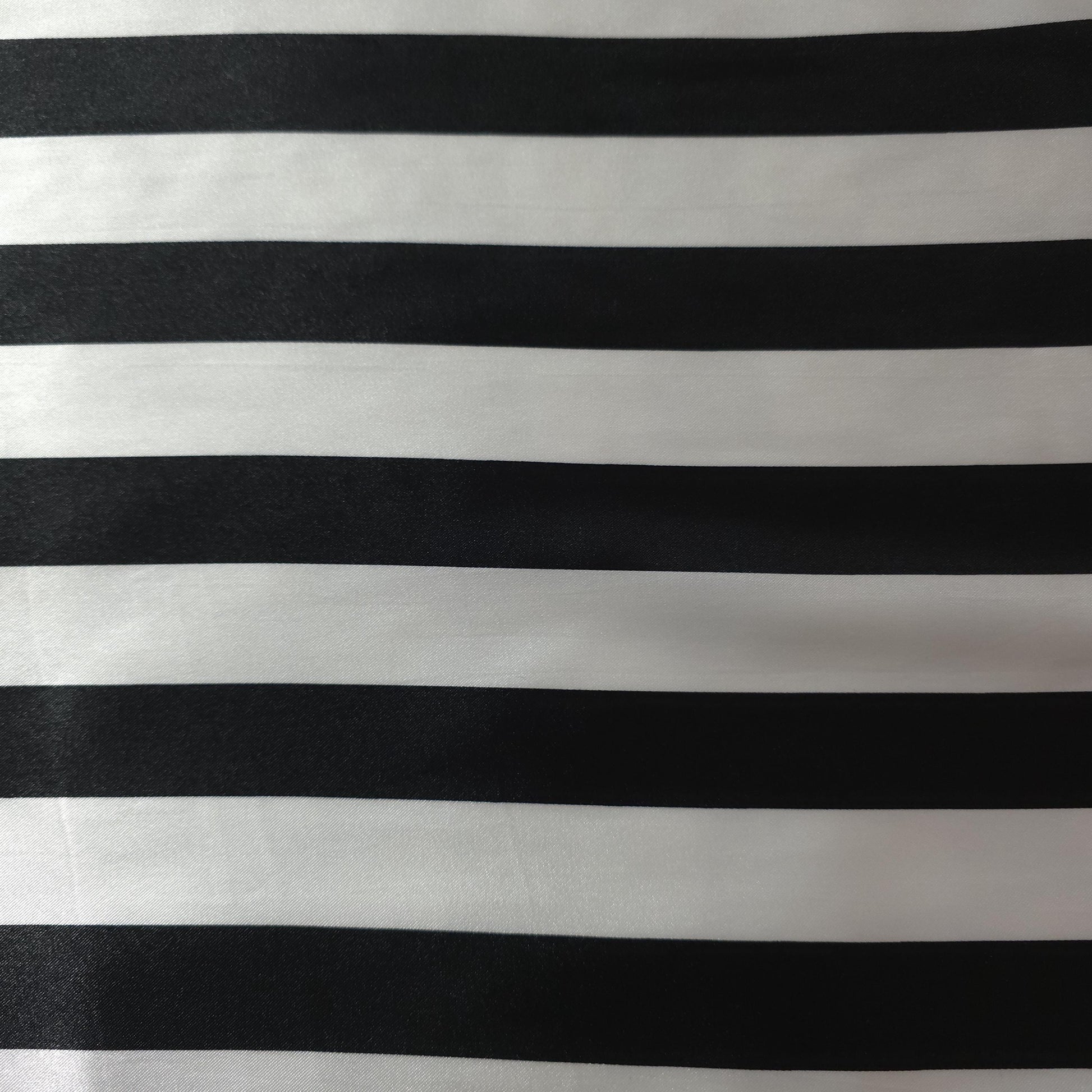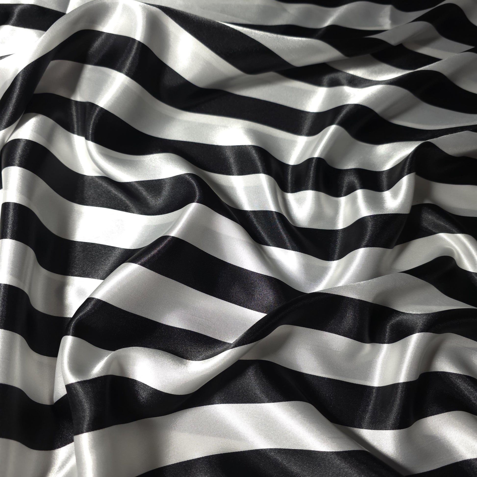 This lightweight satin fabric features a bold black and white one-inch striped pattern. One side is shiny, while the reverse side has a matte finish. It has a liquid drape, creating a smooth, flowing effect.