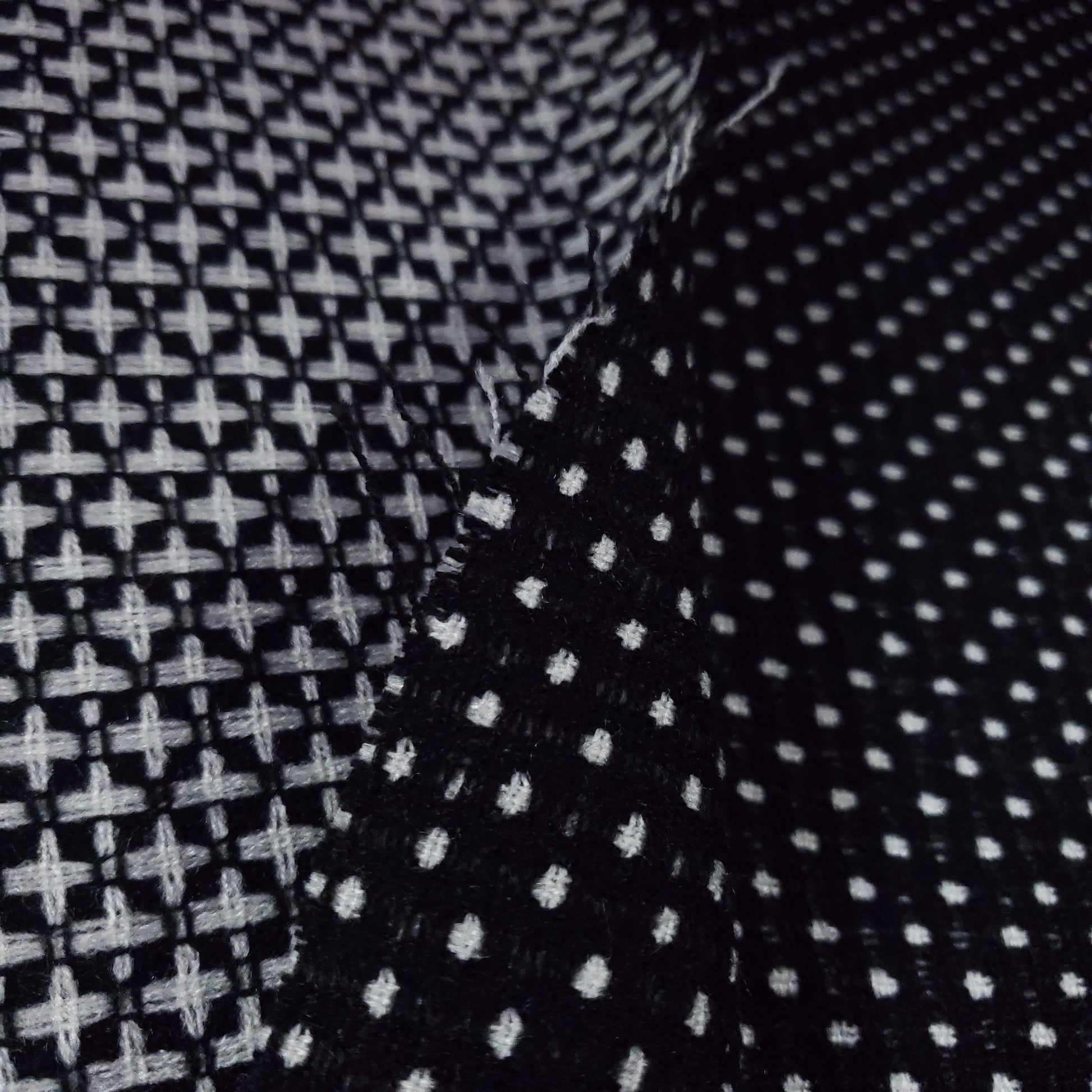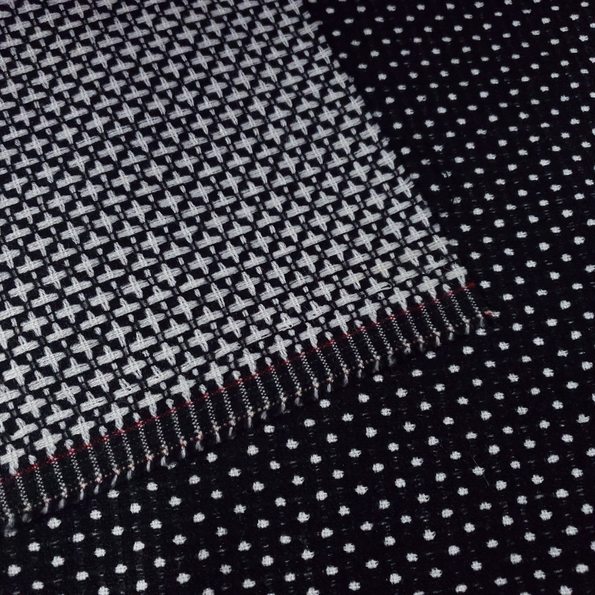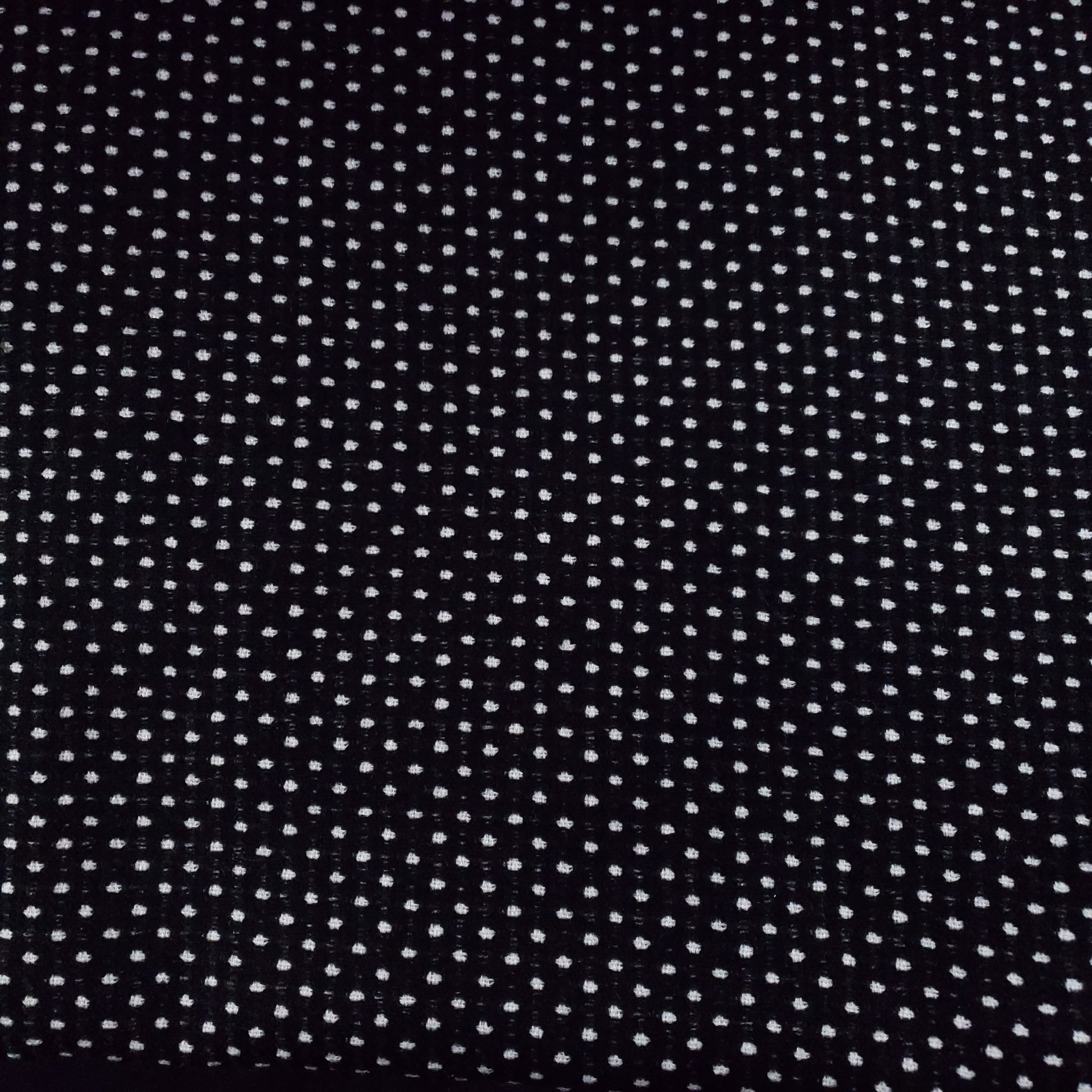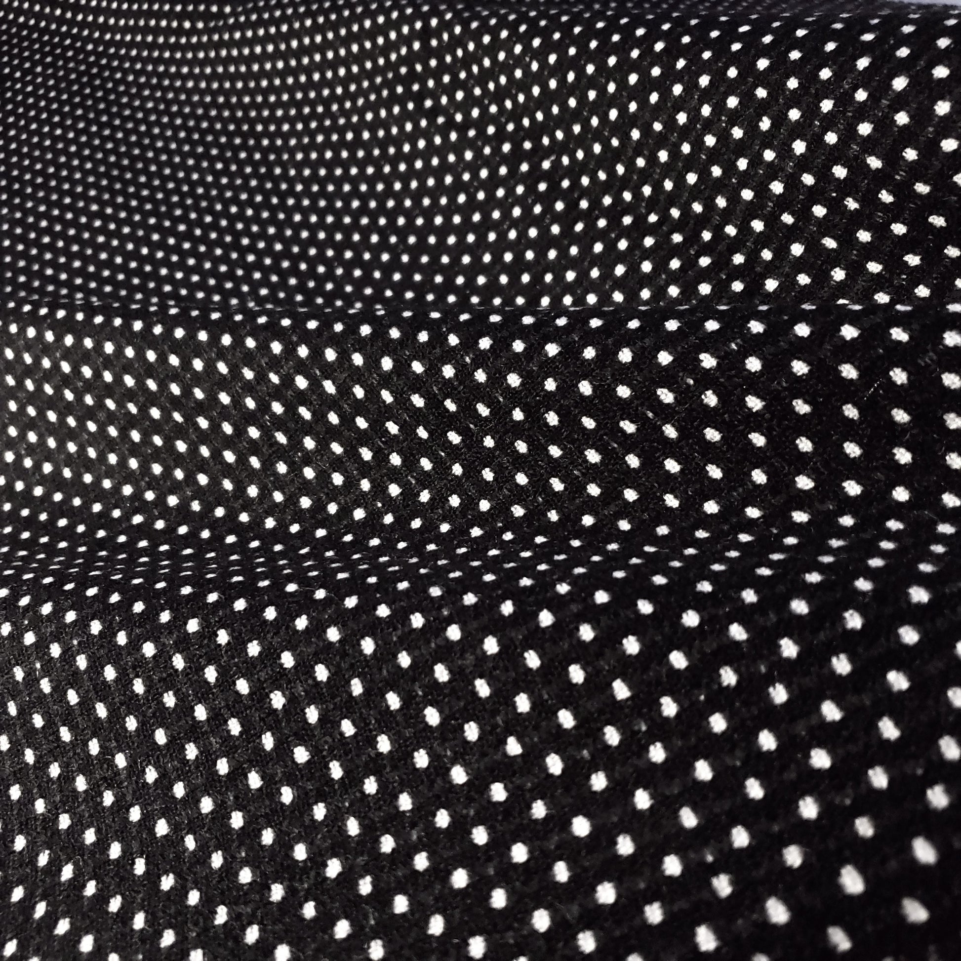 This heavyweight suiting fabric showcases a delicate pattern of small white dots set against a black backdrop. The design appears only on one side, while the reverse displays a prominent white cross-stitch pattern, as shown in image four. The fabric offers a soft, wool-like texture and contains no stretch.