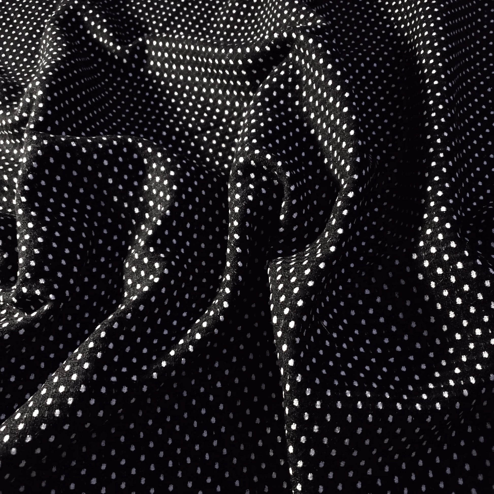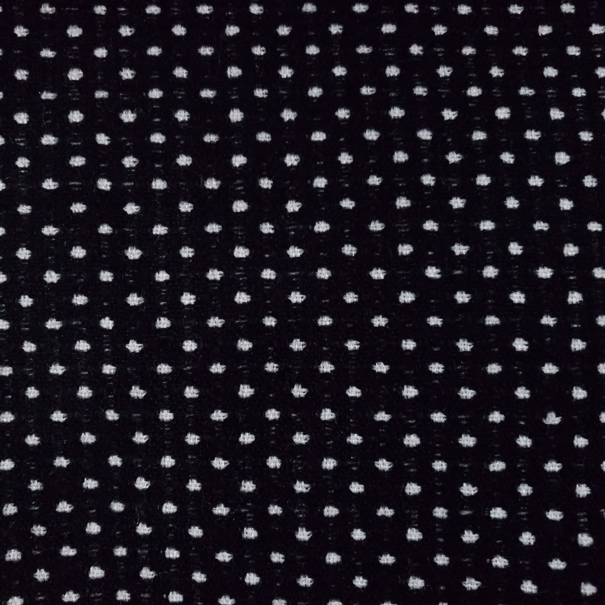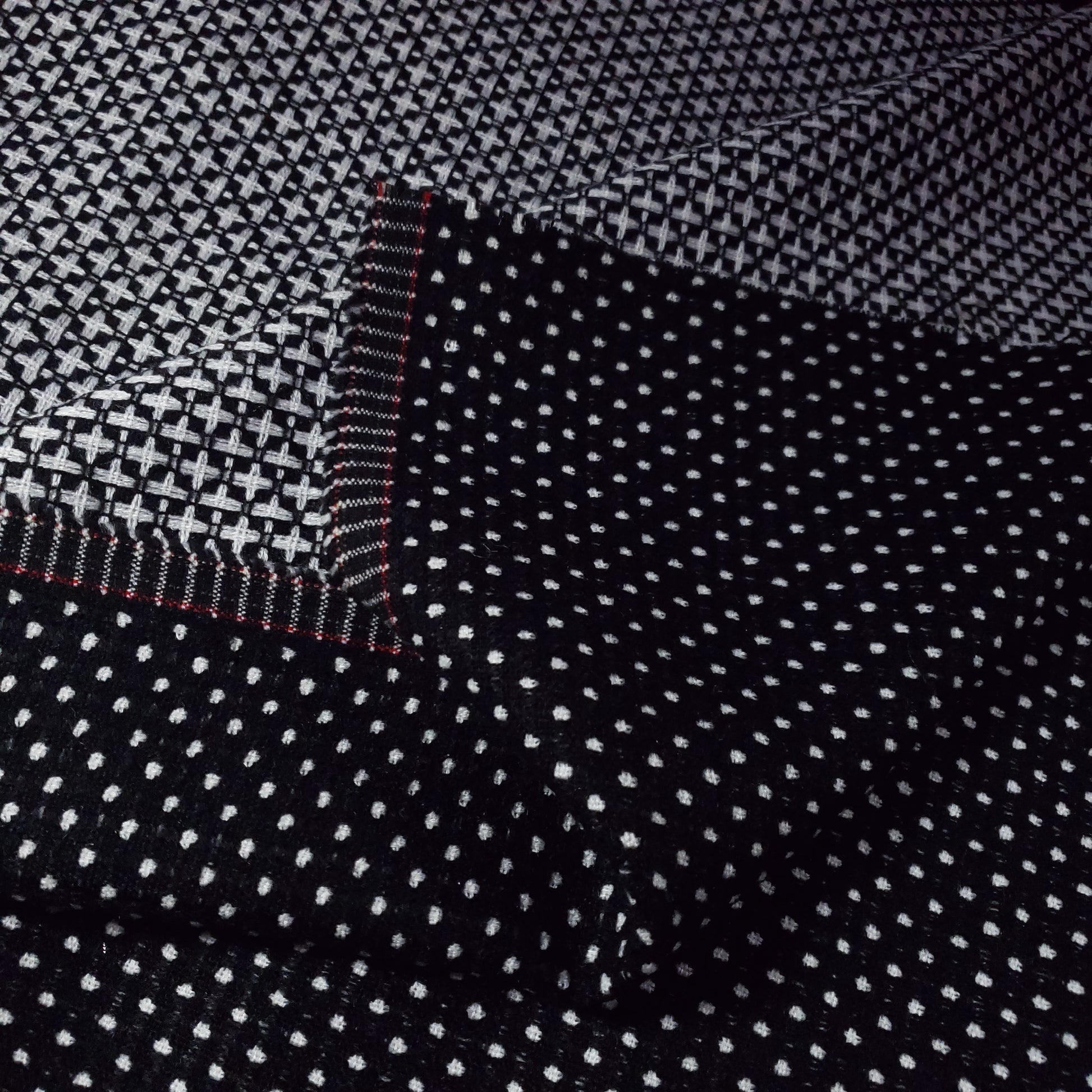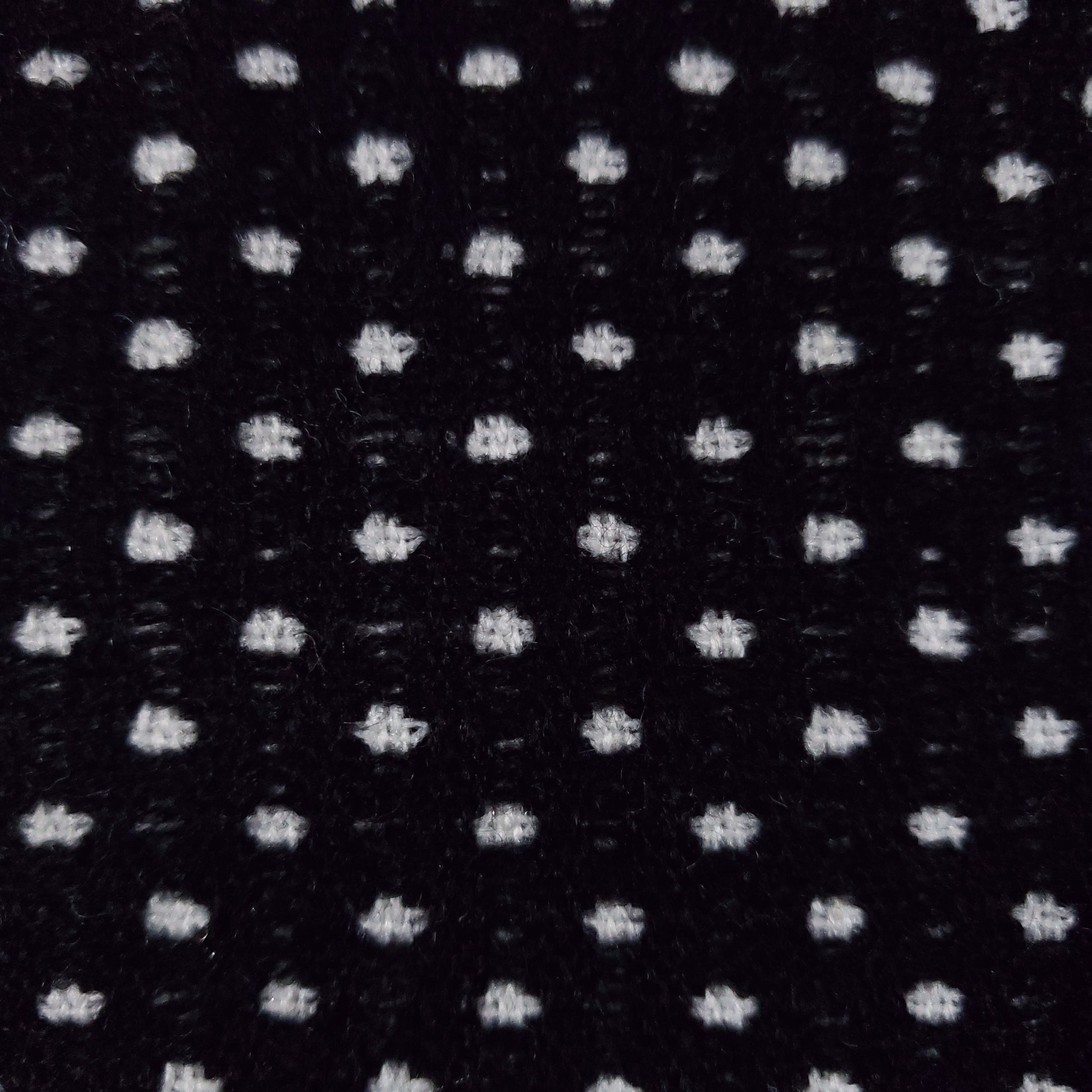 This heavyweight suiting fabric showcases a delicate pattern of small white dots set against a black backdrop. The design appears only on one side, while the reverse displays a prominent white cross-stitch pattern, as shown in image four. The fabric offers a soft, wool-like texture and contains no stretch.