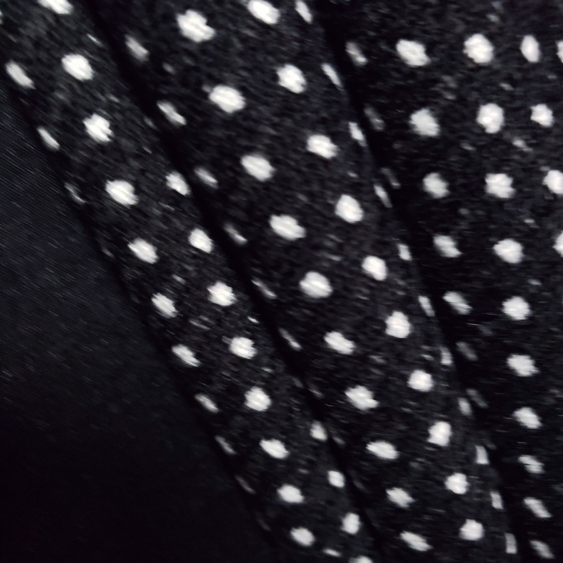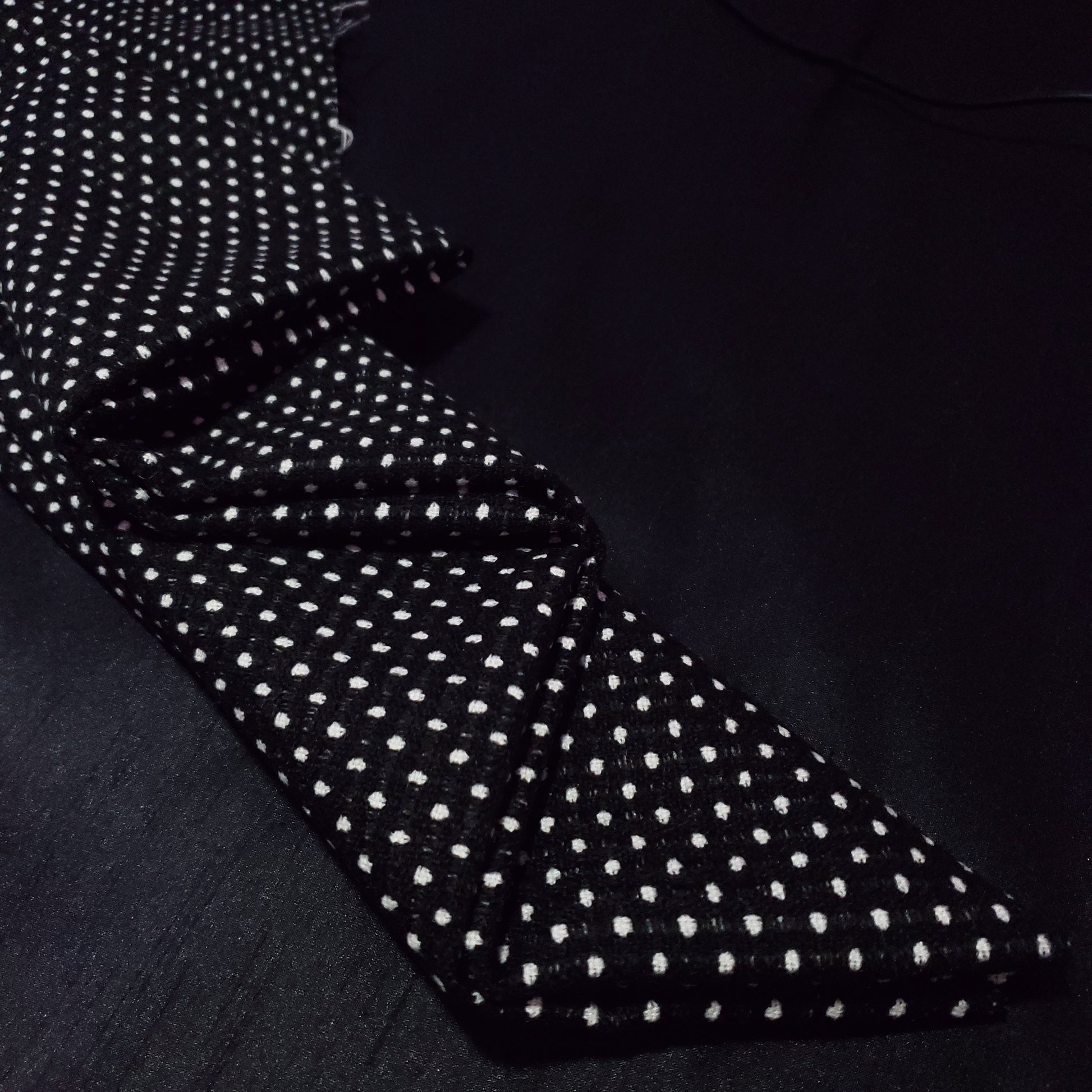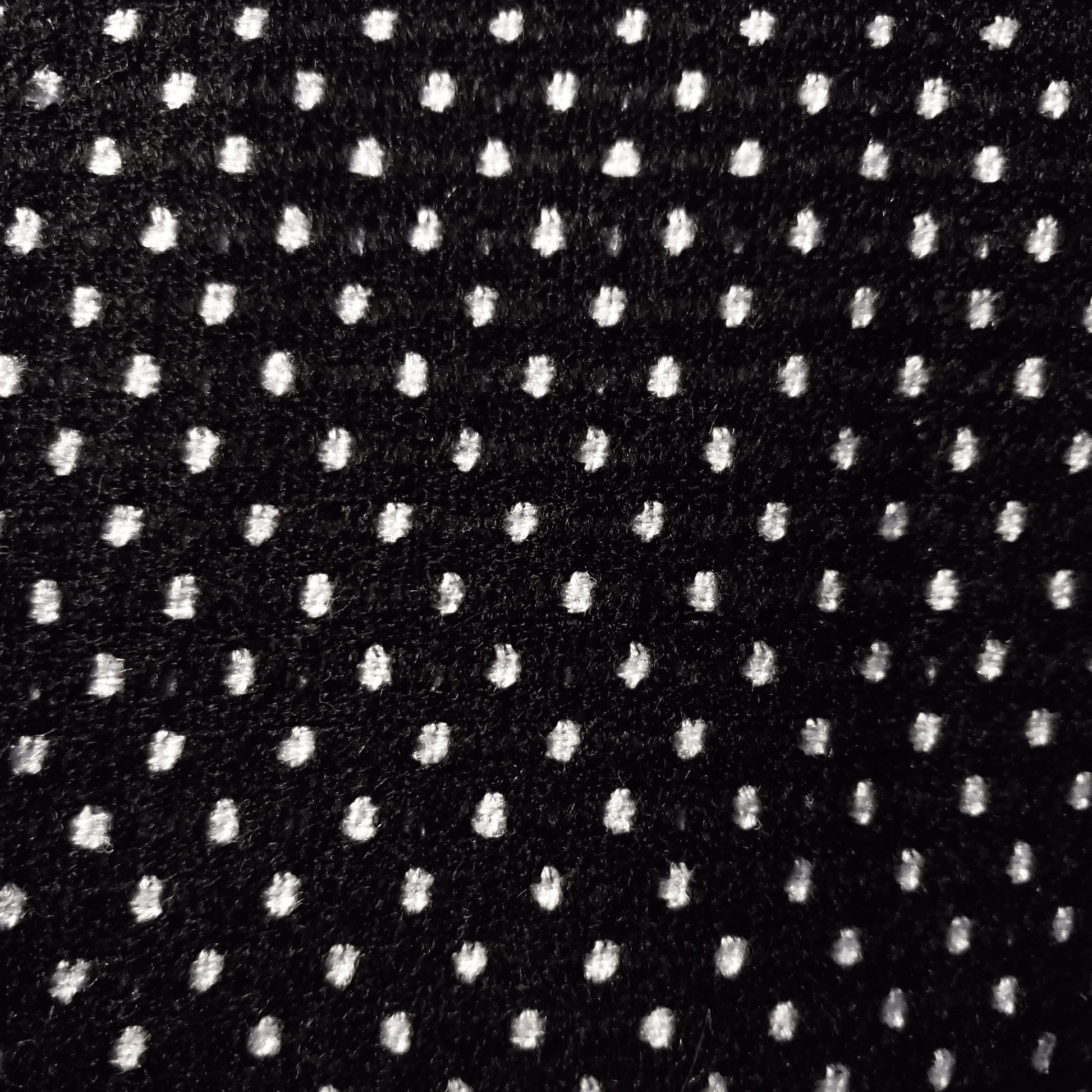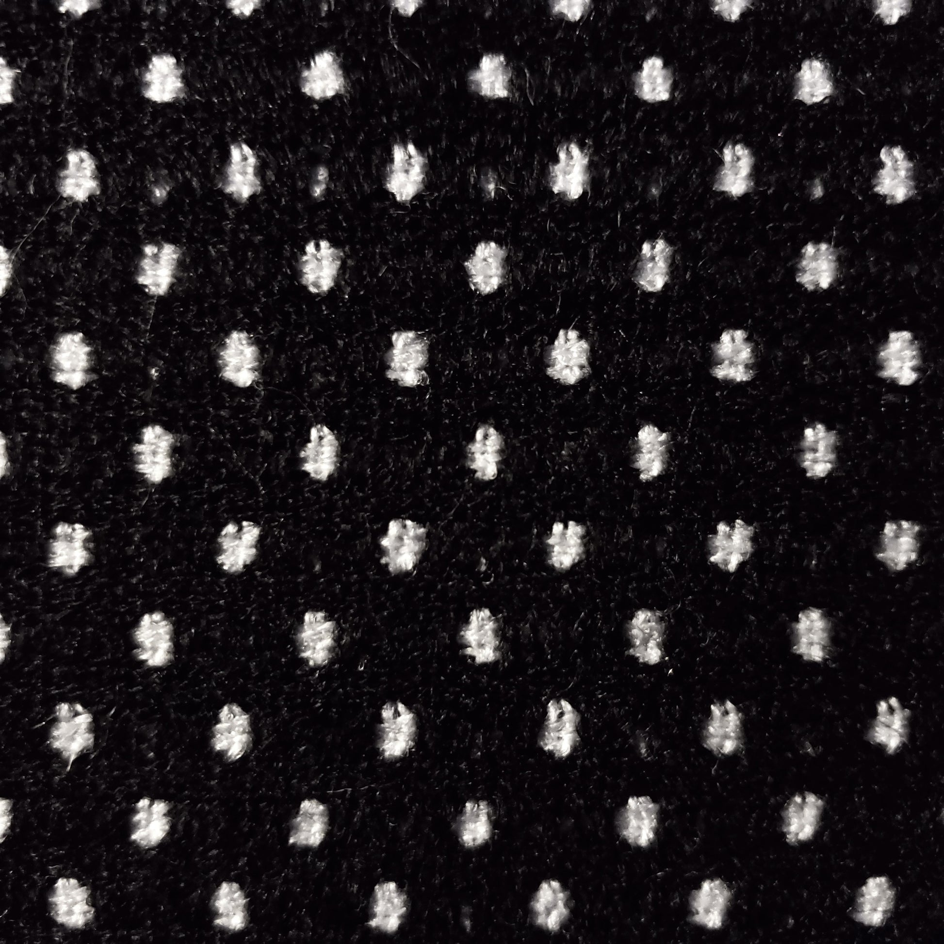 This heavyweight suiting fabric showcases a delicate pattern of small white dots set against a black backdrop. The design appears only on one side, while the reverse displays a prominent white cross-stitch pattern, as shown in image four. The fabric offers a soft, wool-like texture and contains no stretch.