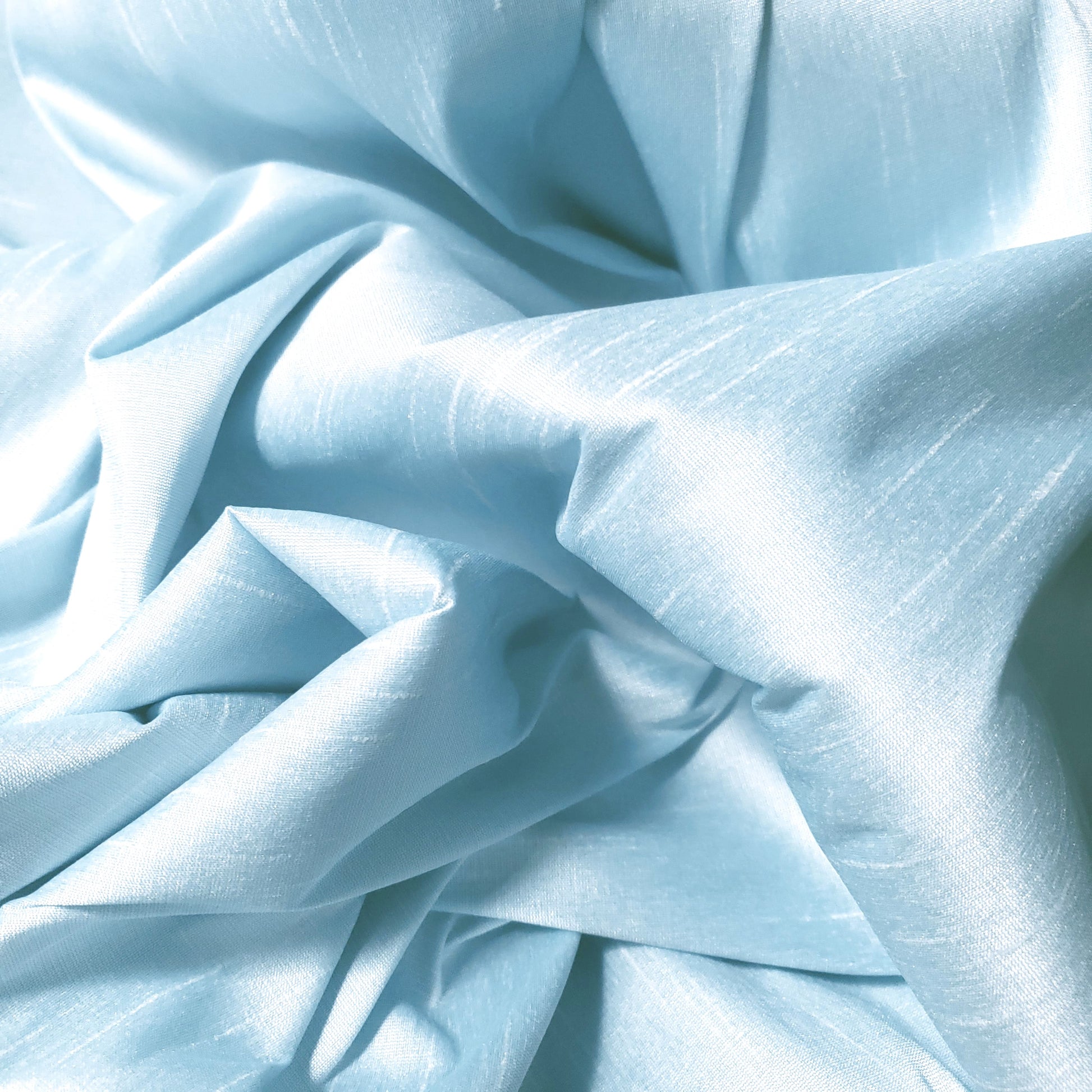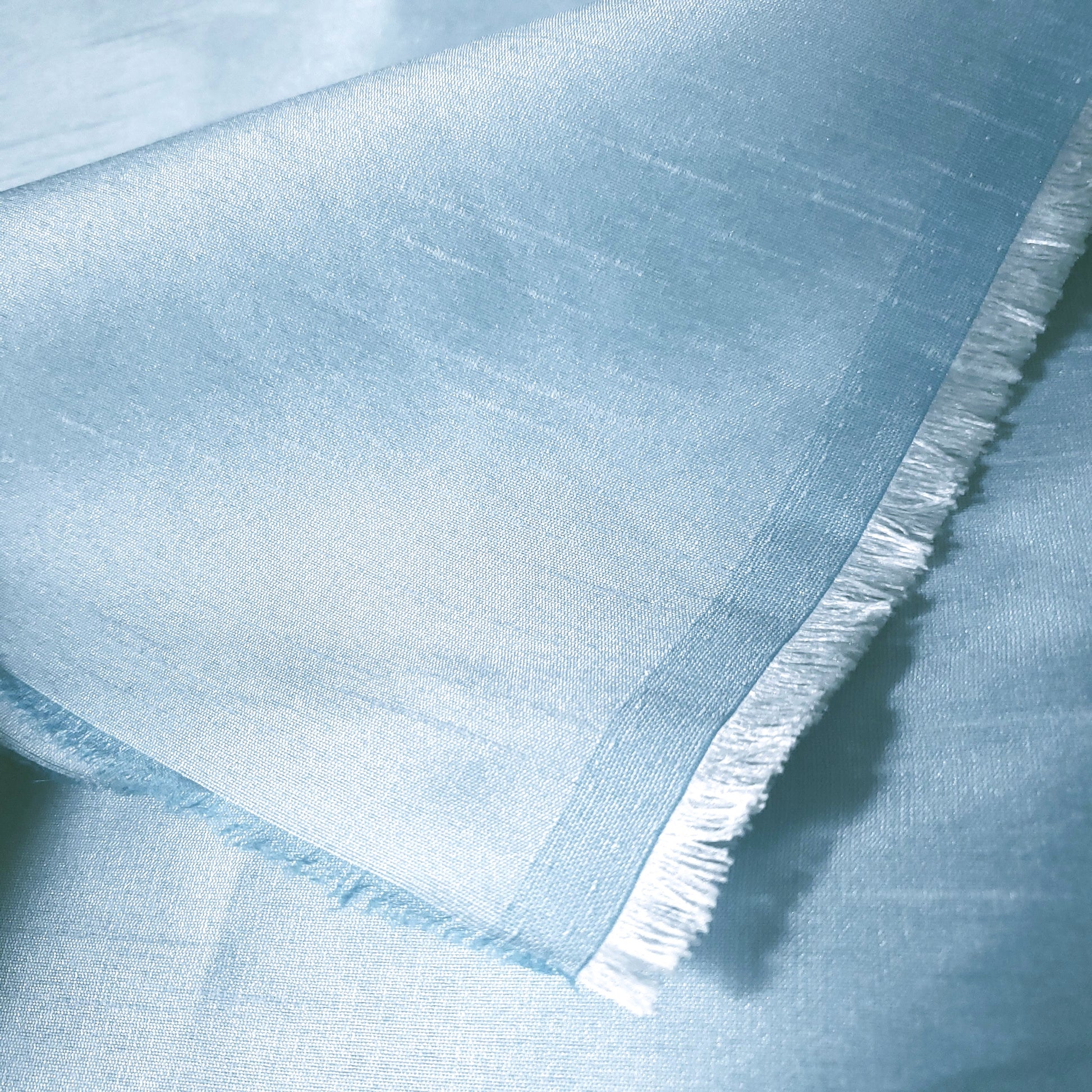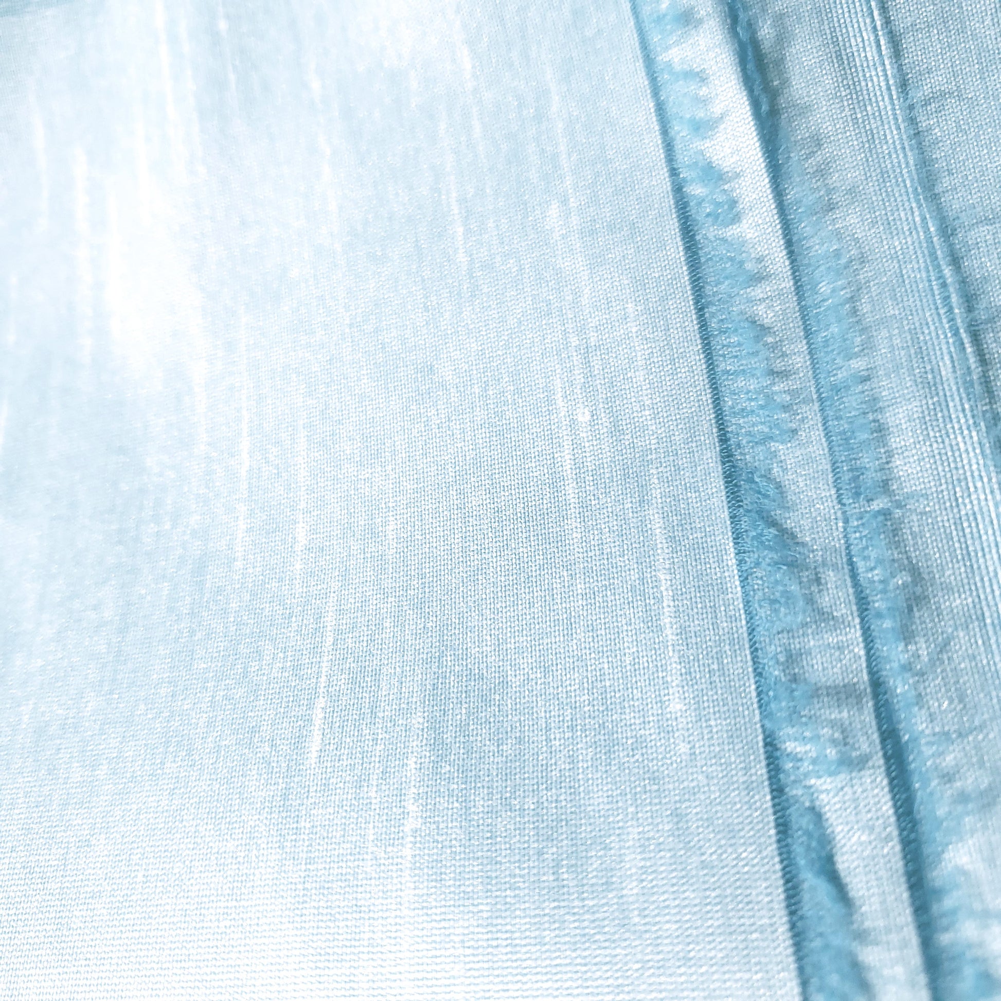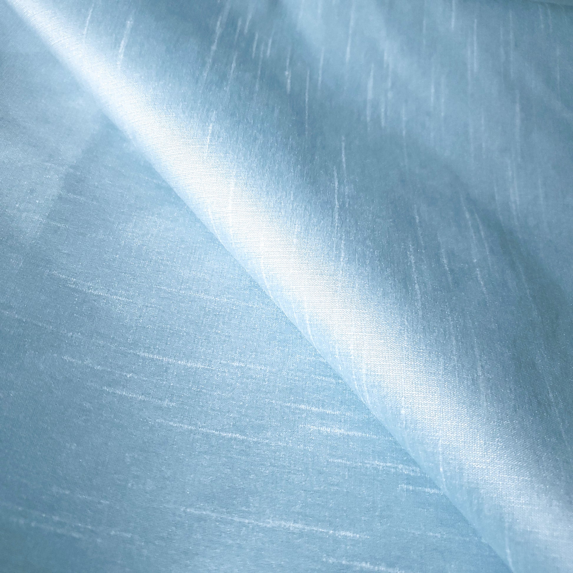 Dupioni fabric is a plain-woven fabric. Using a fine yard on the warp and an uneven yarn on the weft. This creates visual and textural raised thin stripes in the fabric. The thread used here has a subtle sheen to it. giving it a subtle color refracting iridescence.