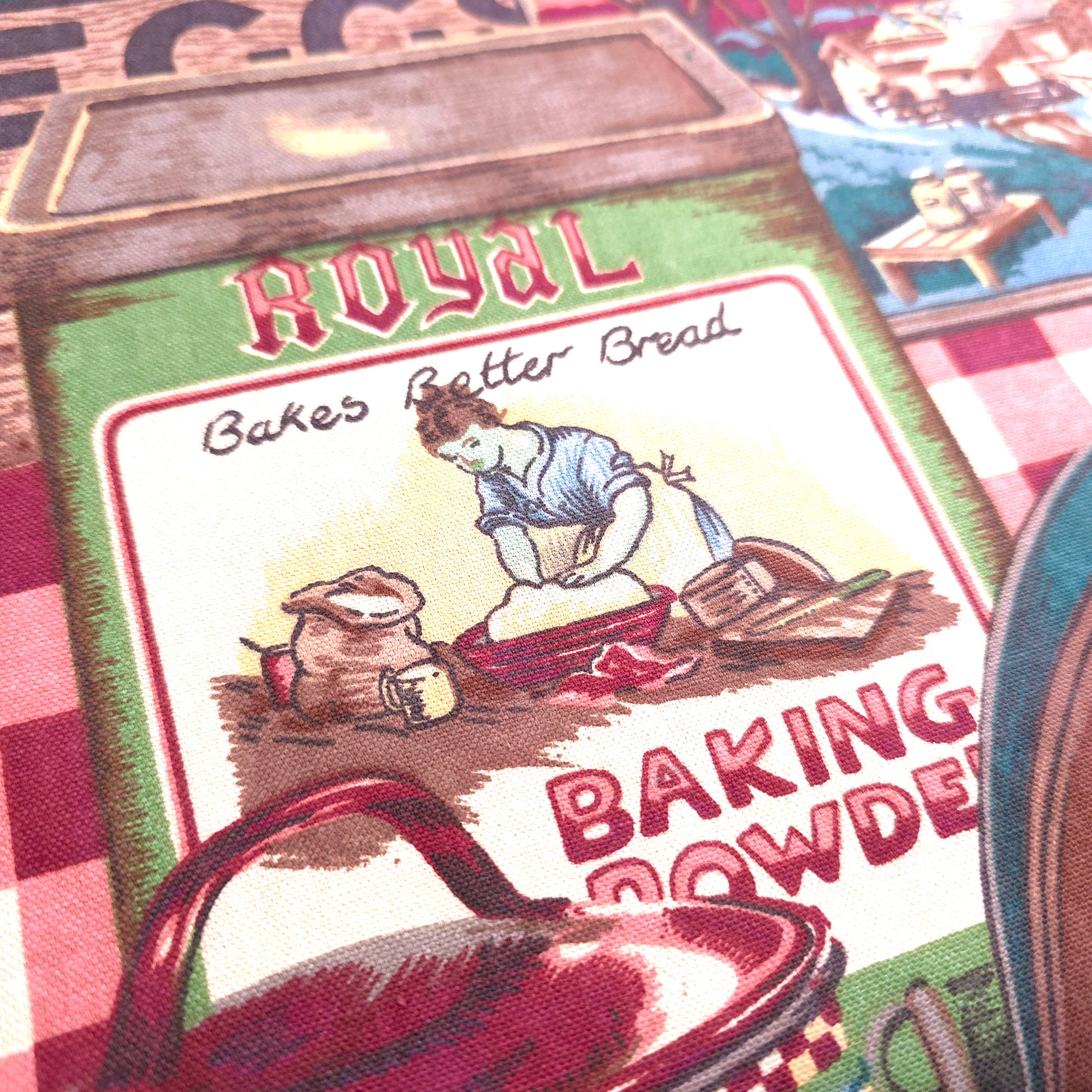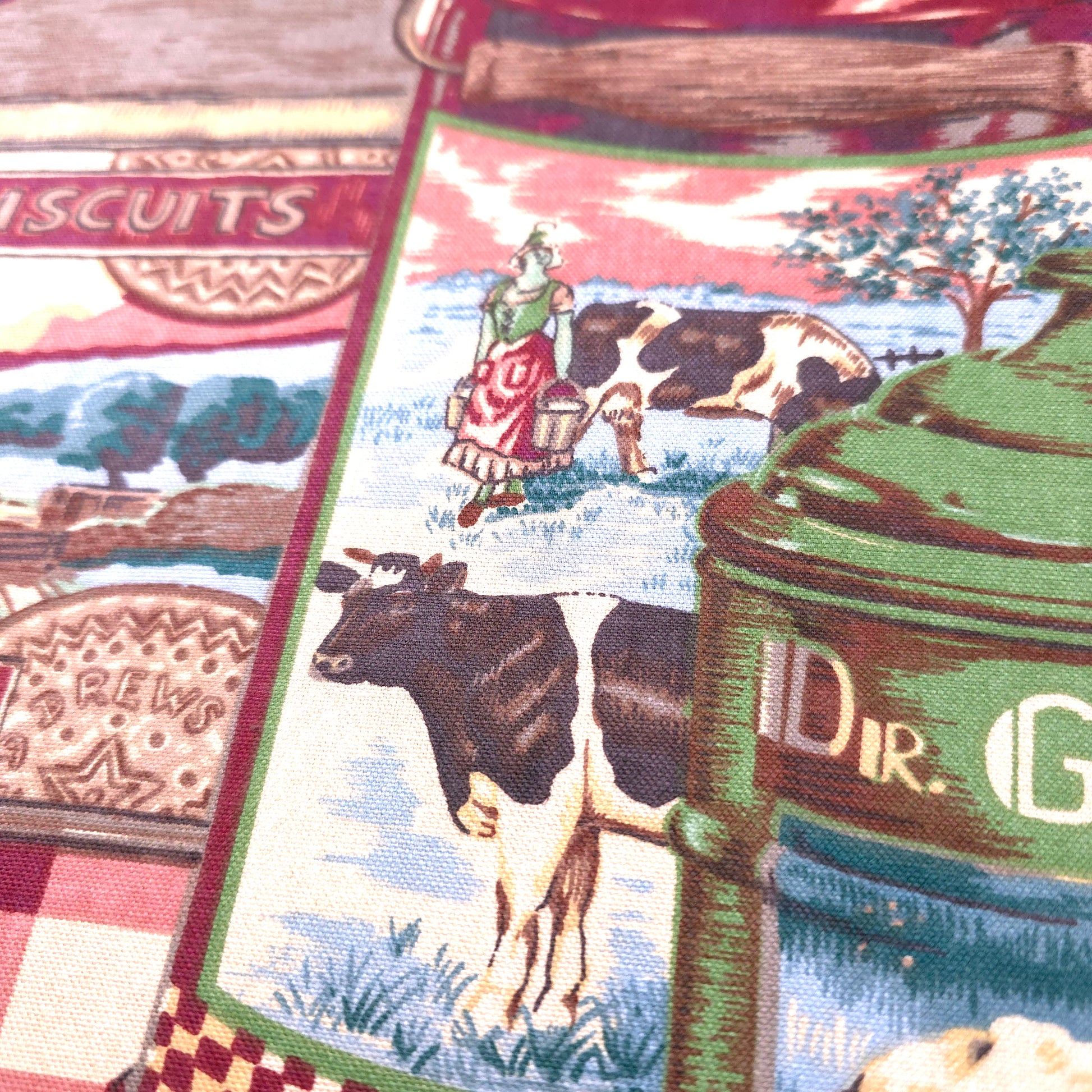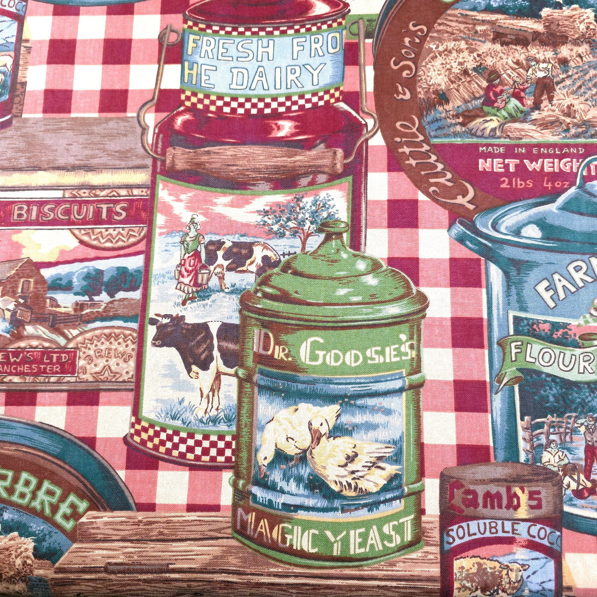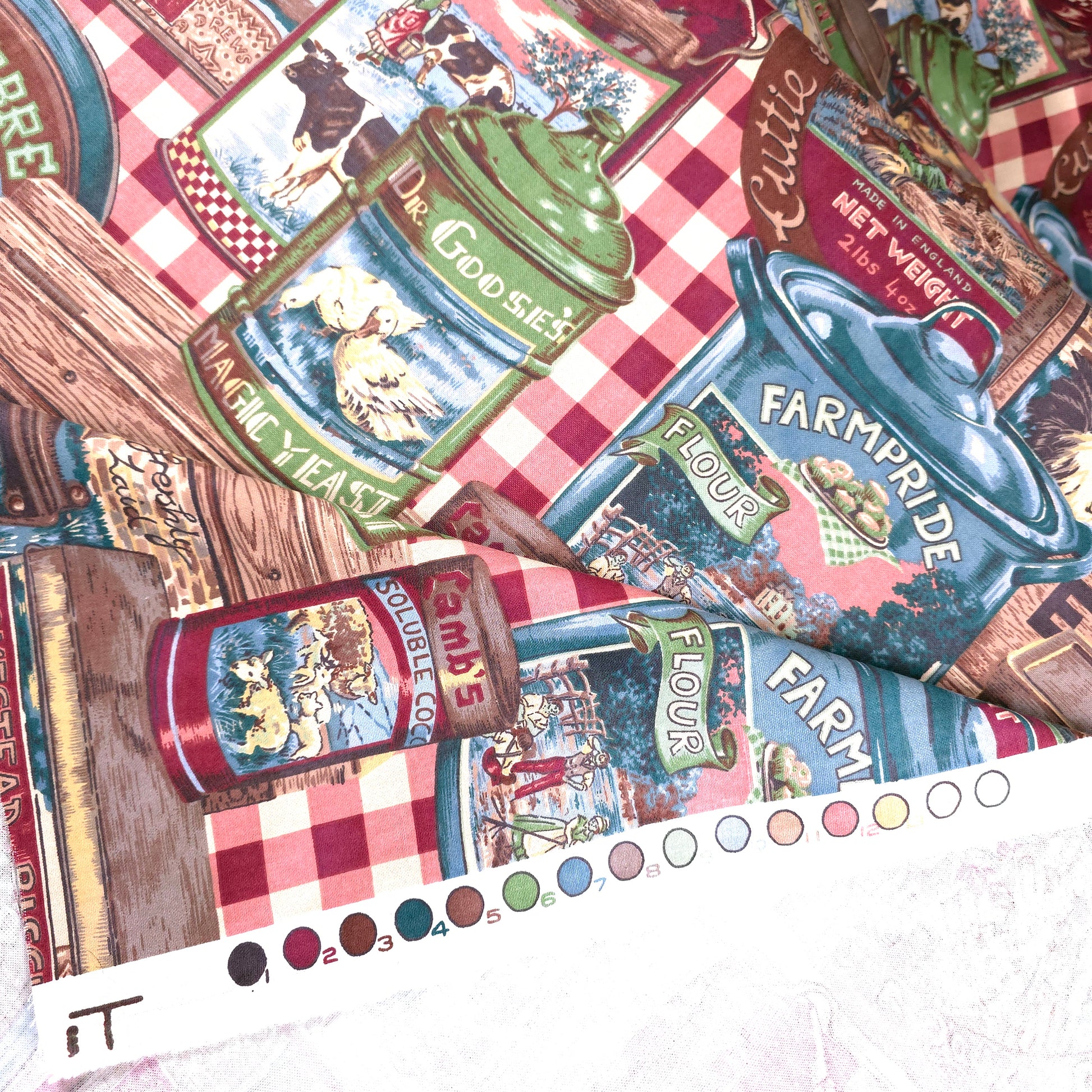 This rare and collectible vintage Bloomcraft fabric features a whimsical collage of retro farmhouse pantry labels, perfect for creating a nostalgic, one-of-a-kind look. Made from a sturdy 100% cotton, it’s an ideal upholstery or drapery weight fabric for projects that celebrate a charming, bygone era.