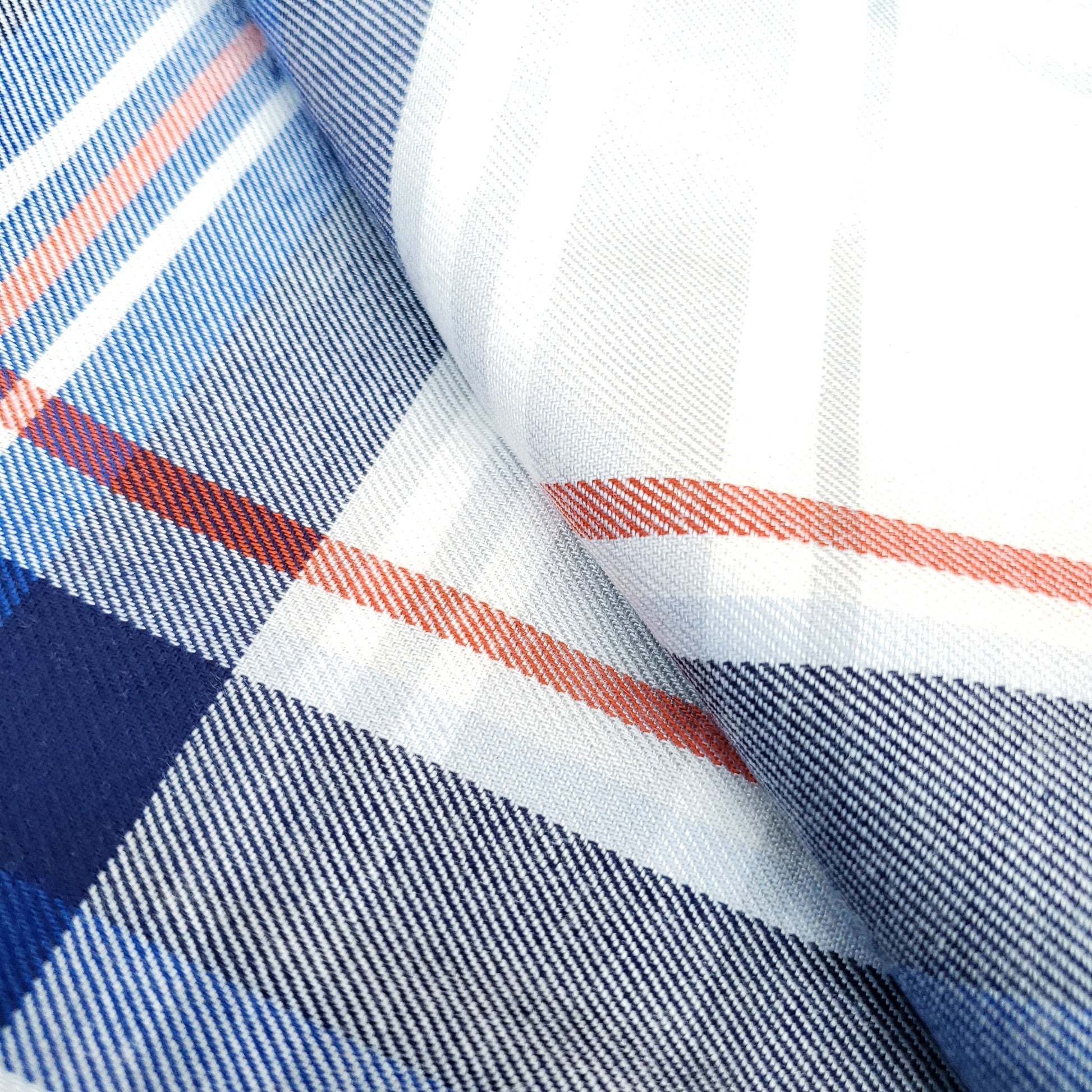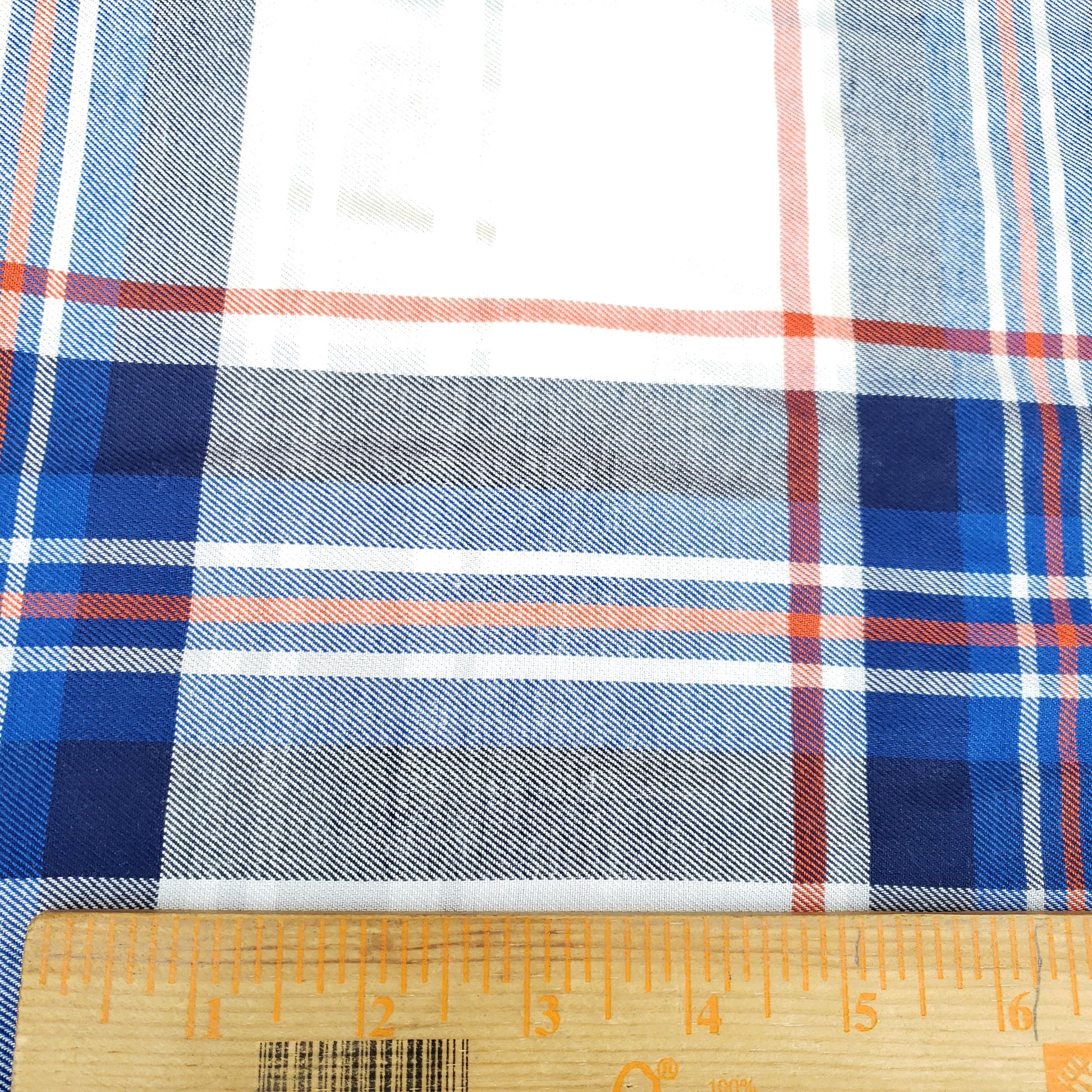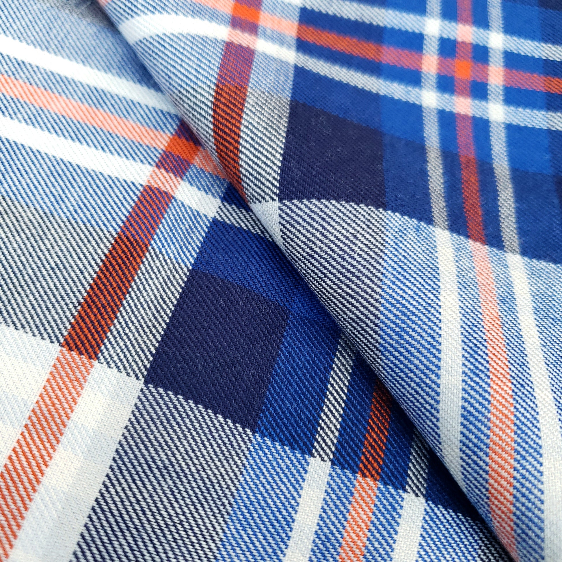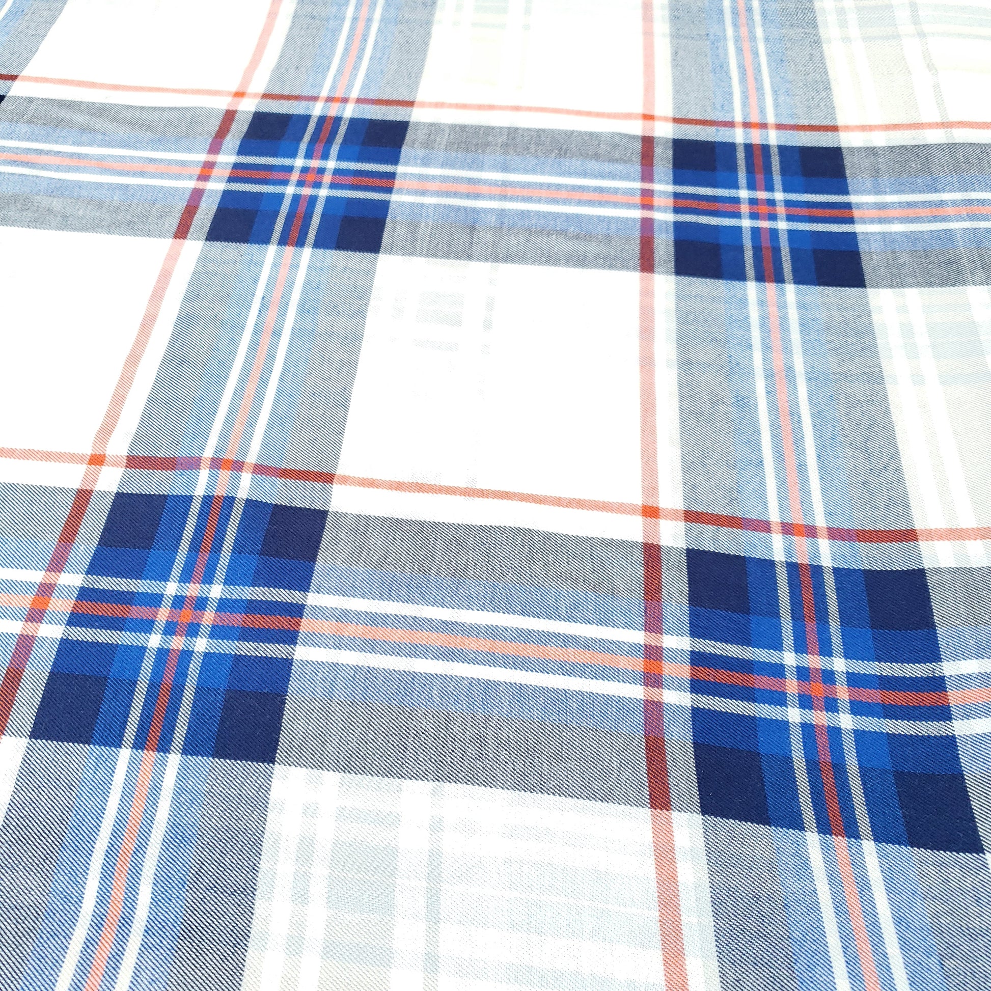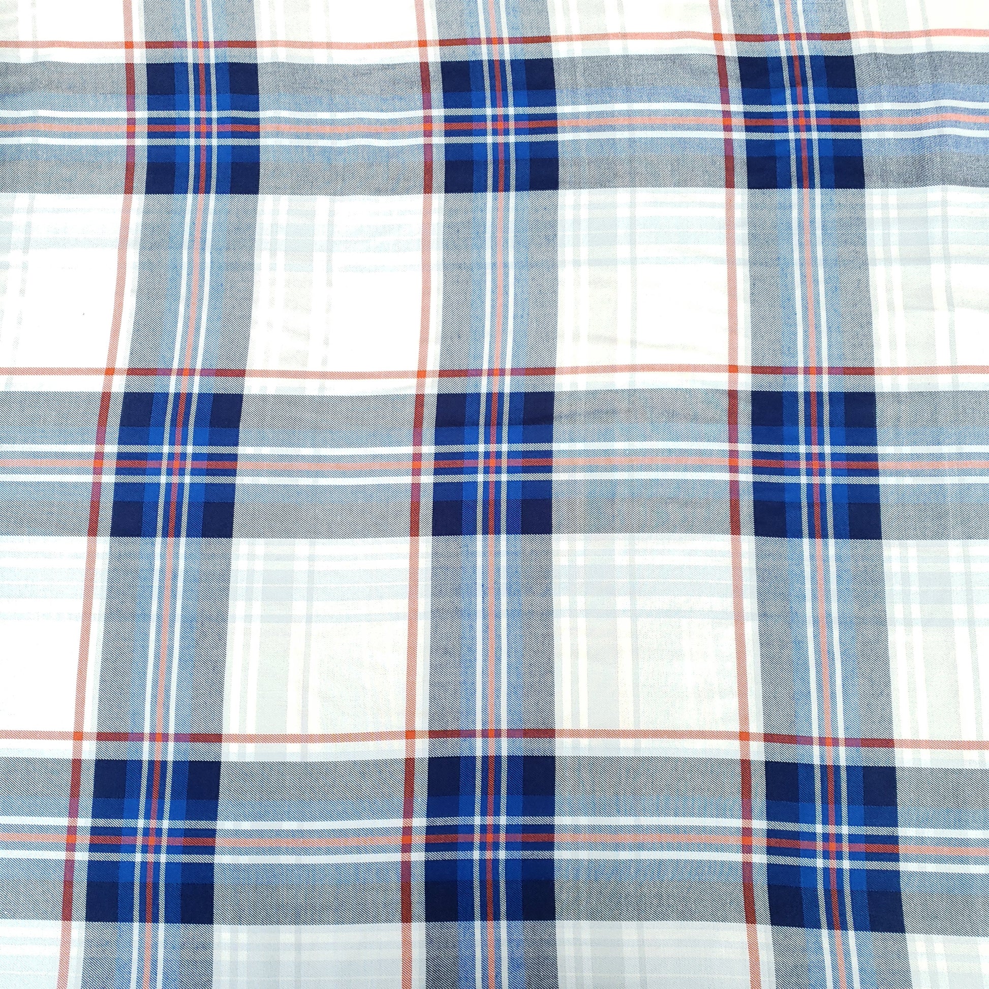 A 58-inch wide, 100% polyester shirting fabric featuring a classic plaid pattern. This material has a brushed finish, giving it an exceptionally soft surface and a comfortable, flannel-like feel. It is a light to medium weight fabric with a soft drape, making it an excellent choice for garments that require both structure and comfort.
