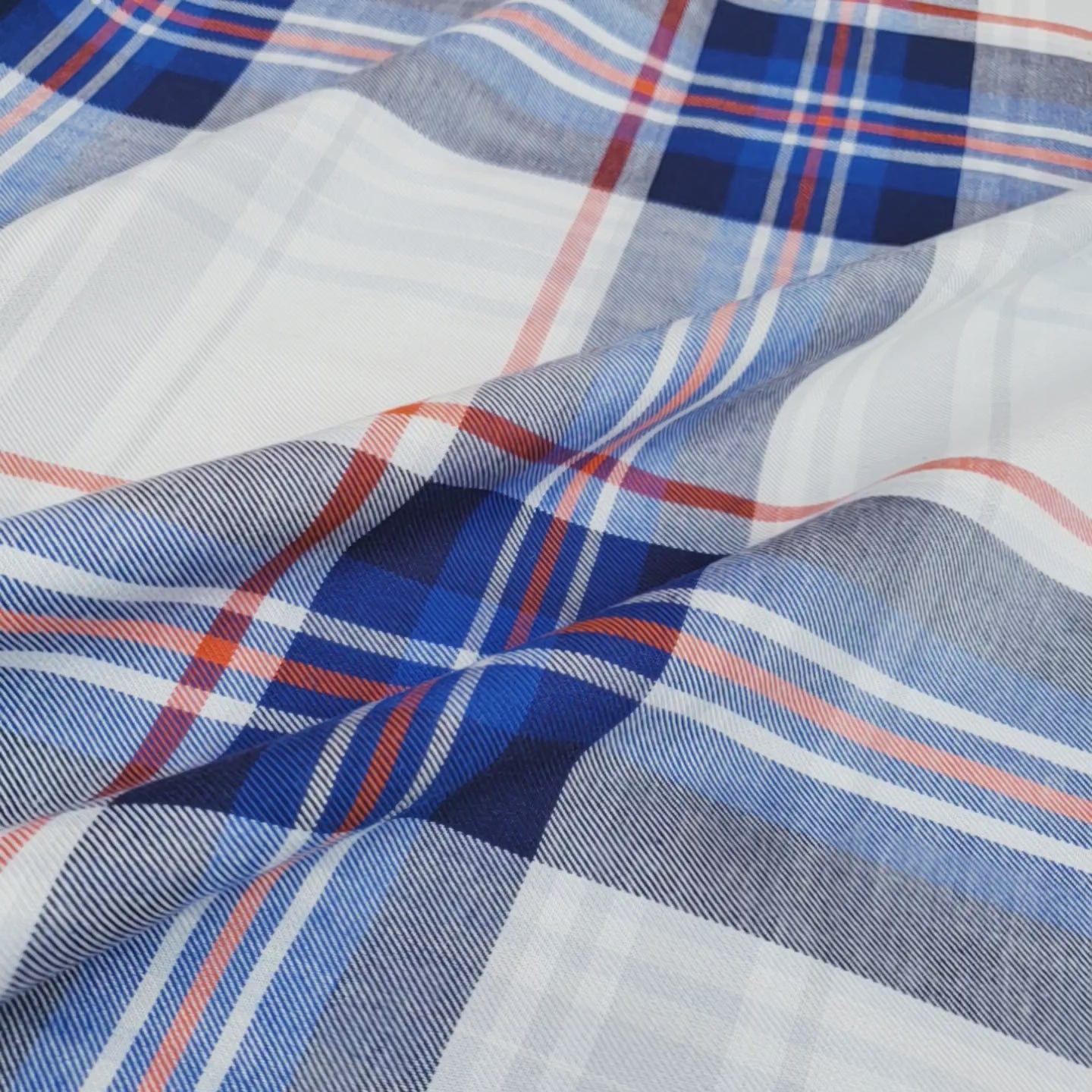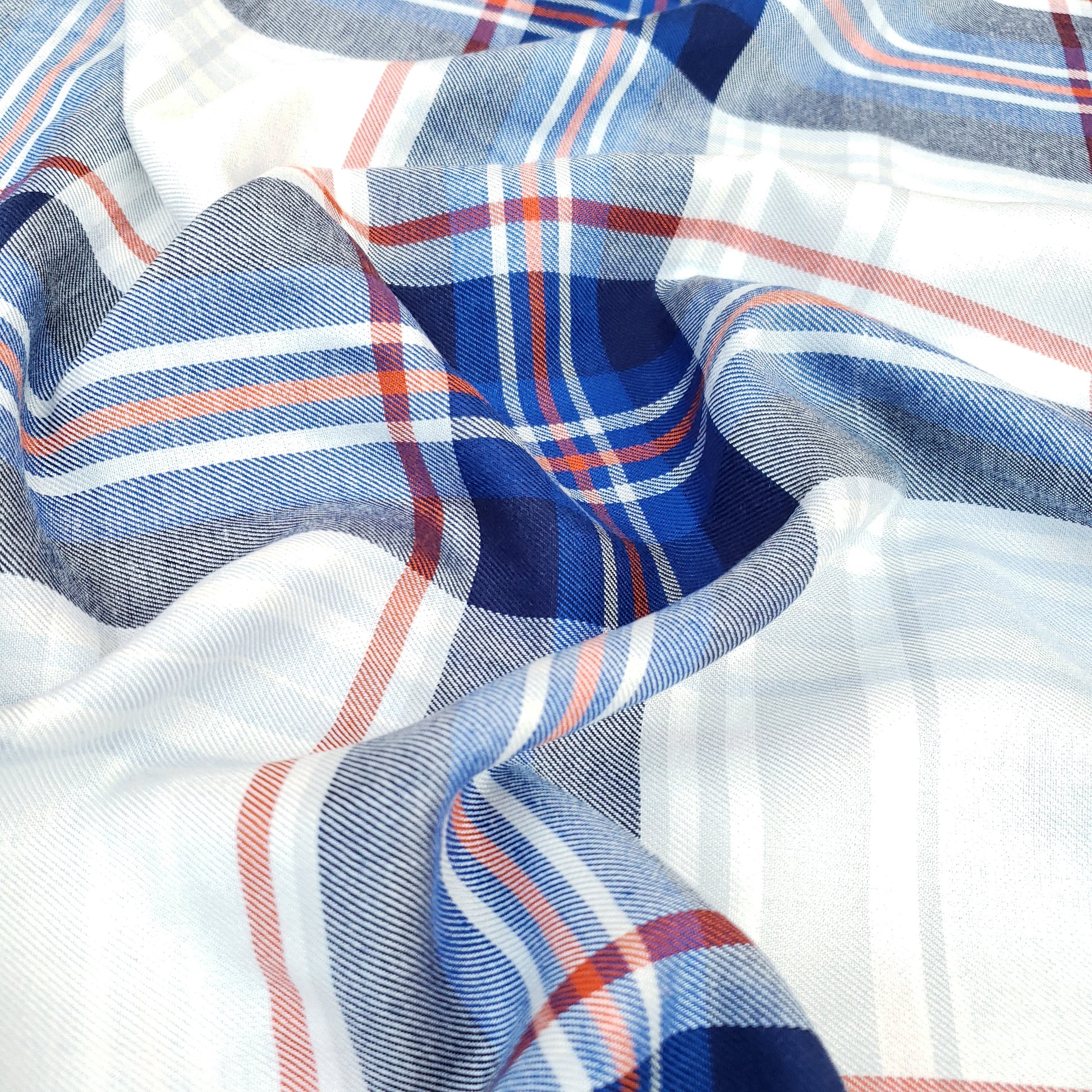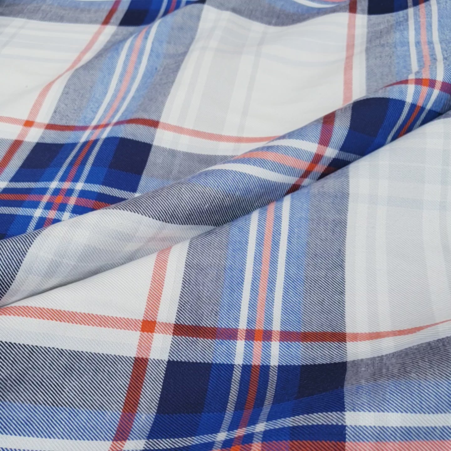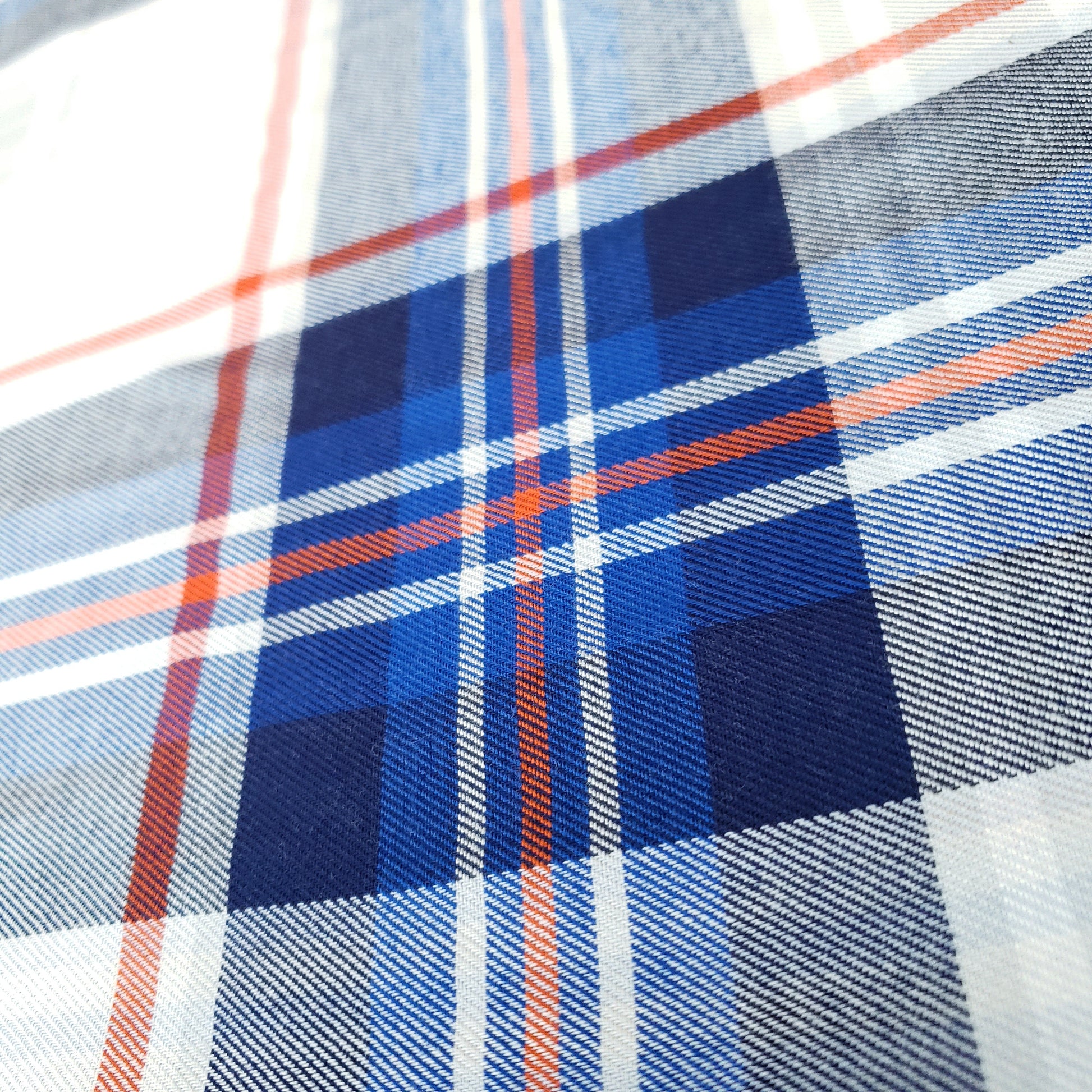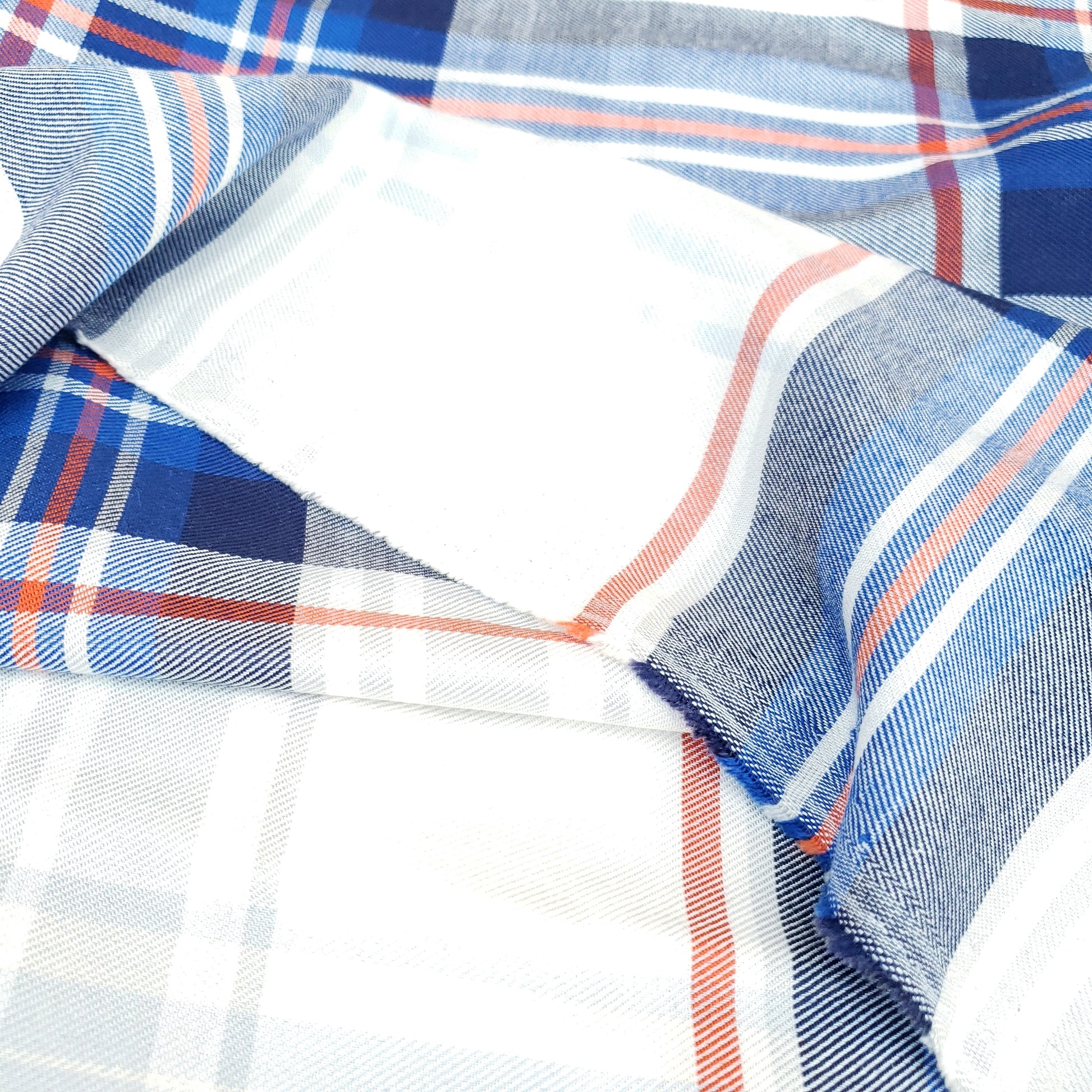A 58-inch wide, 100% polyester shirting fabric featuring a classic plaid pattern. This material has a brushed finish, giving it an exceptionally soft surface and a comfortable, flannel-like feel. It is a light to medium weight fabric with a soft drape, making it an excellent choice for garments that require both structure and comfort.