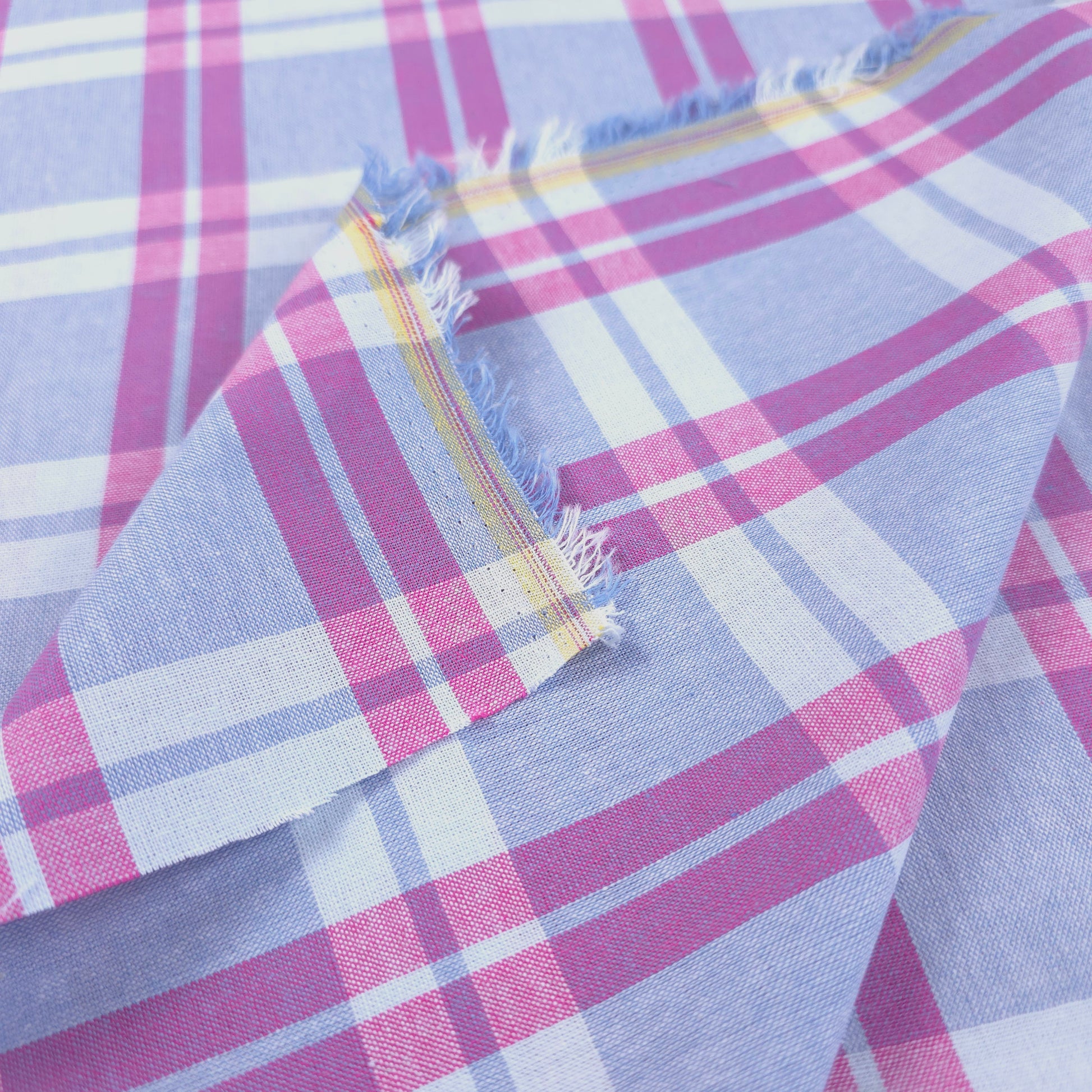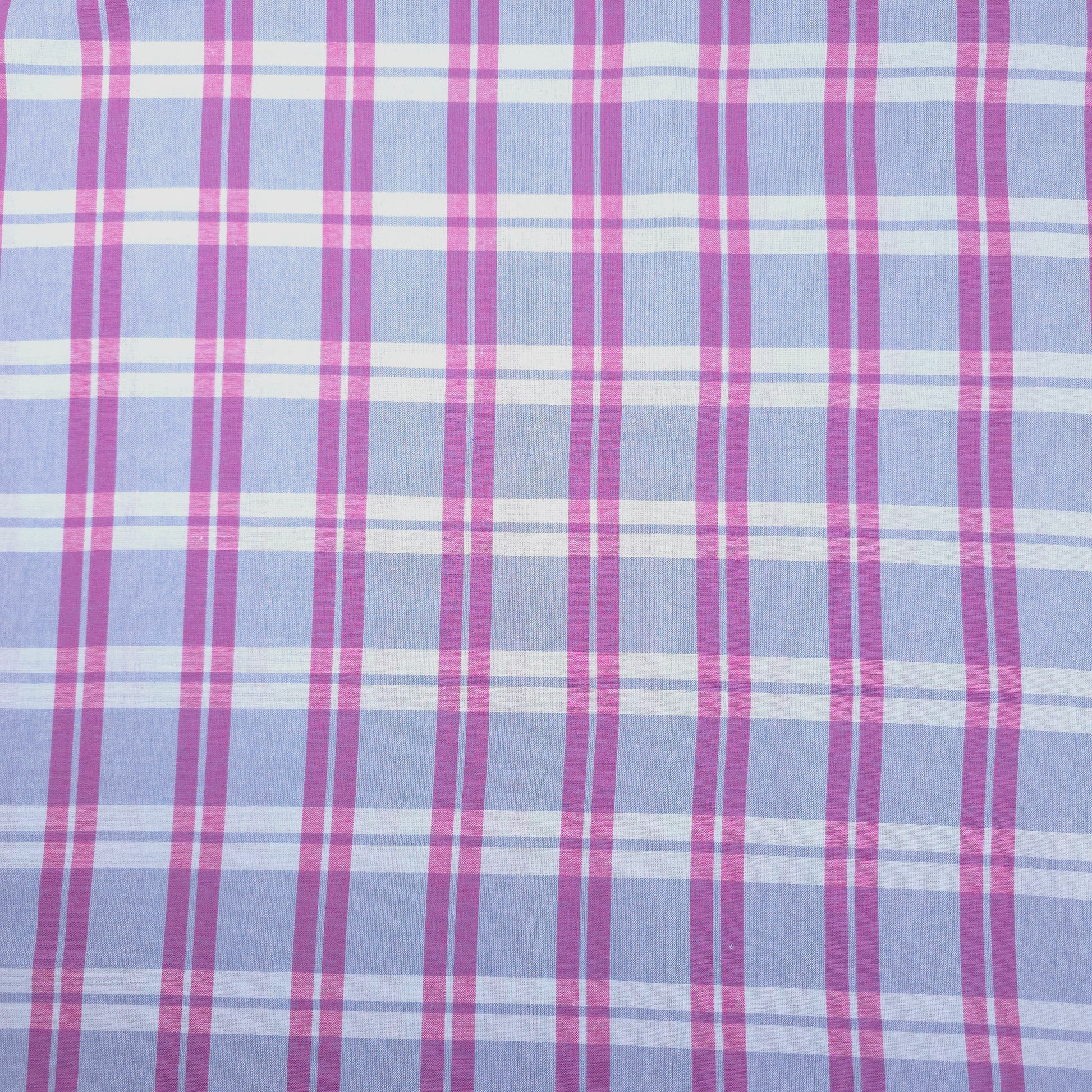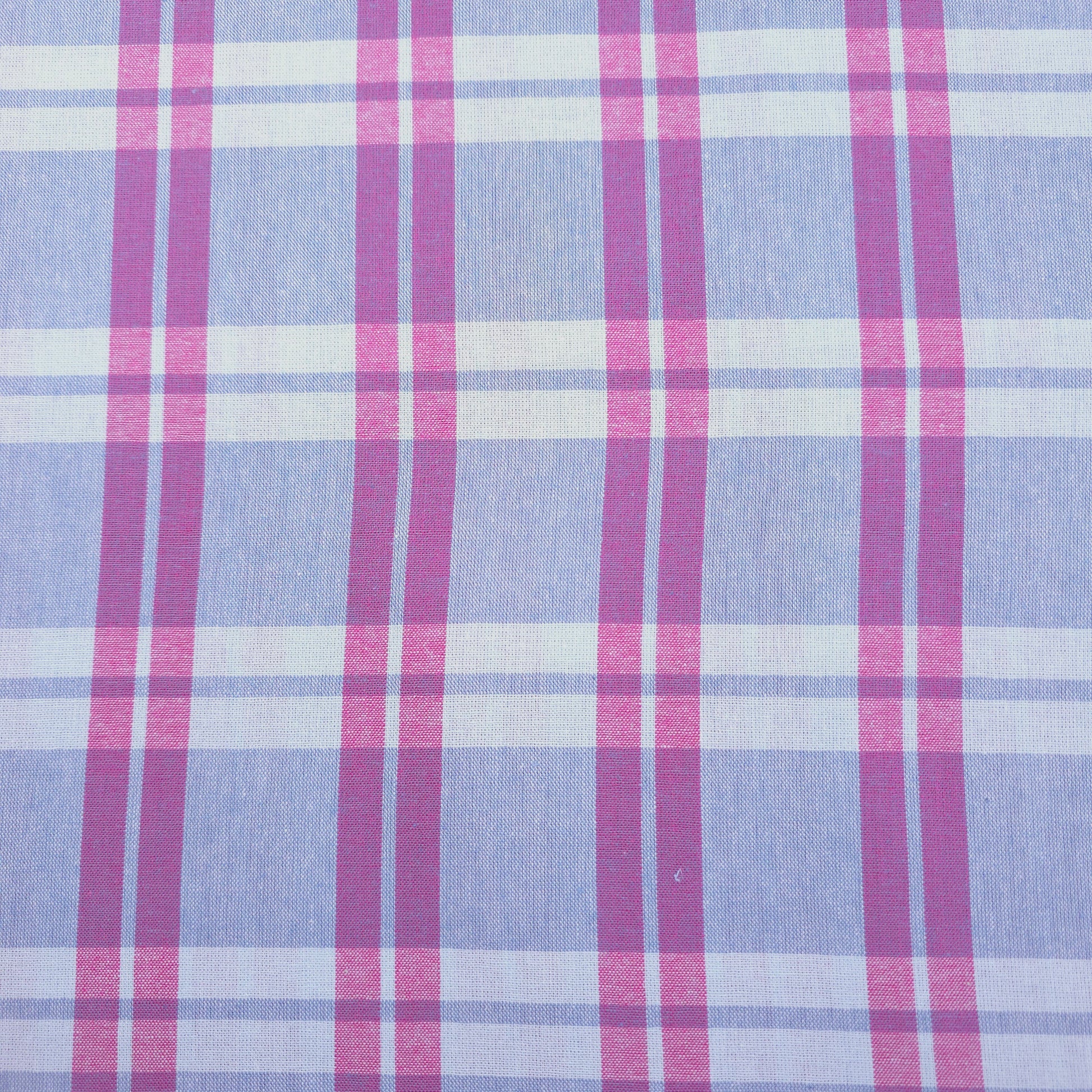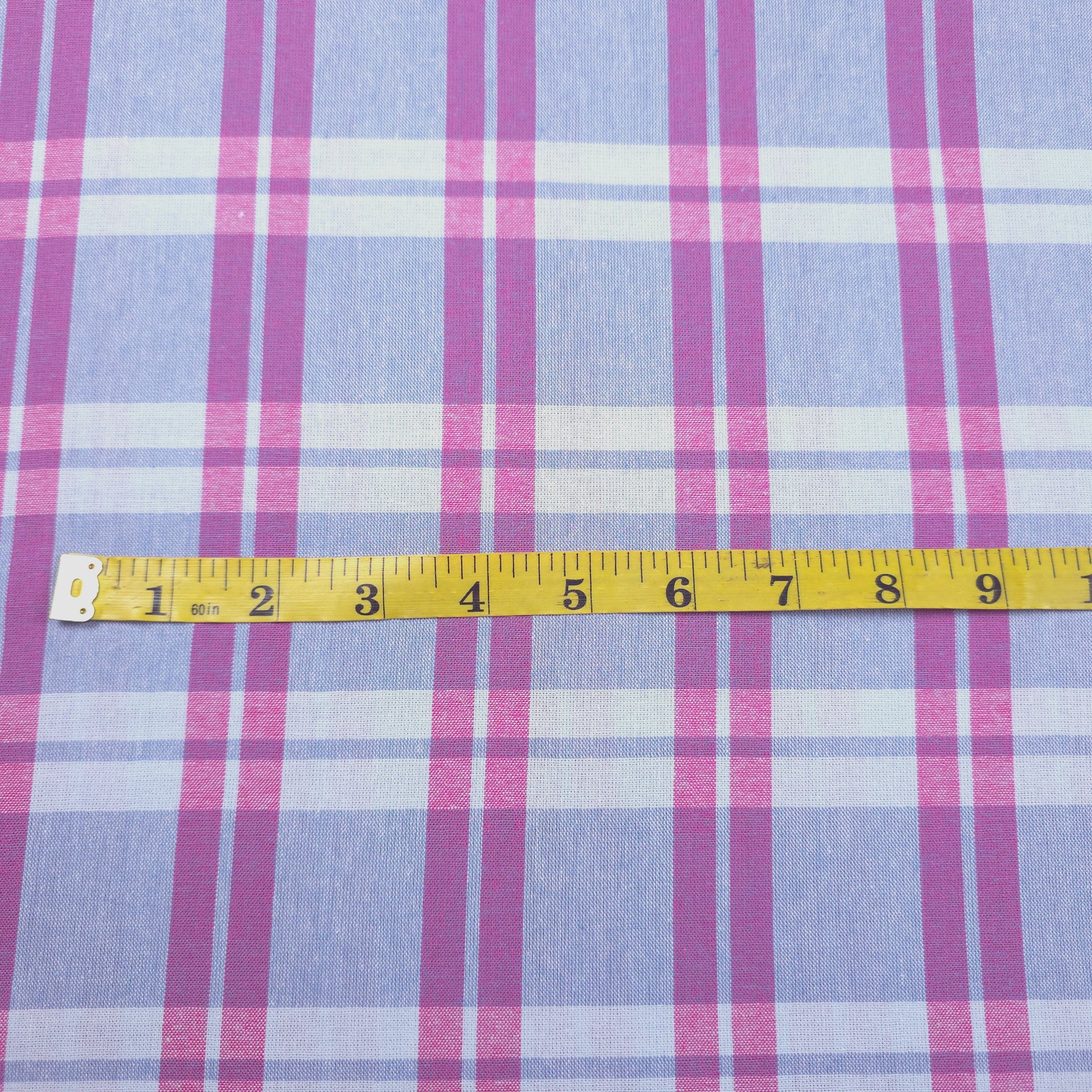 This 58-inch wide, lightweight cotton chambray fabric features a classic plaid pattern. The construction combines a light blue base with intersecting stripes of pink and white, creating a balanced and versatile design. The chambray weave provides a soft hand-feel and breathability, making it comfortable for apparel. This fabric is suitable for a variety of sewing and craft projects.