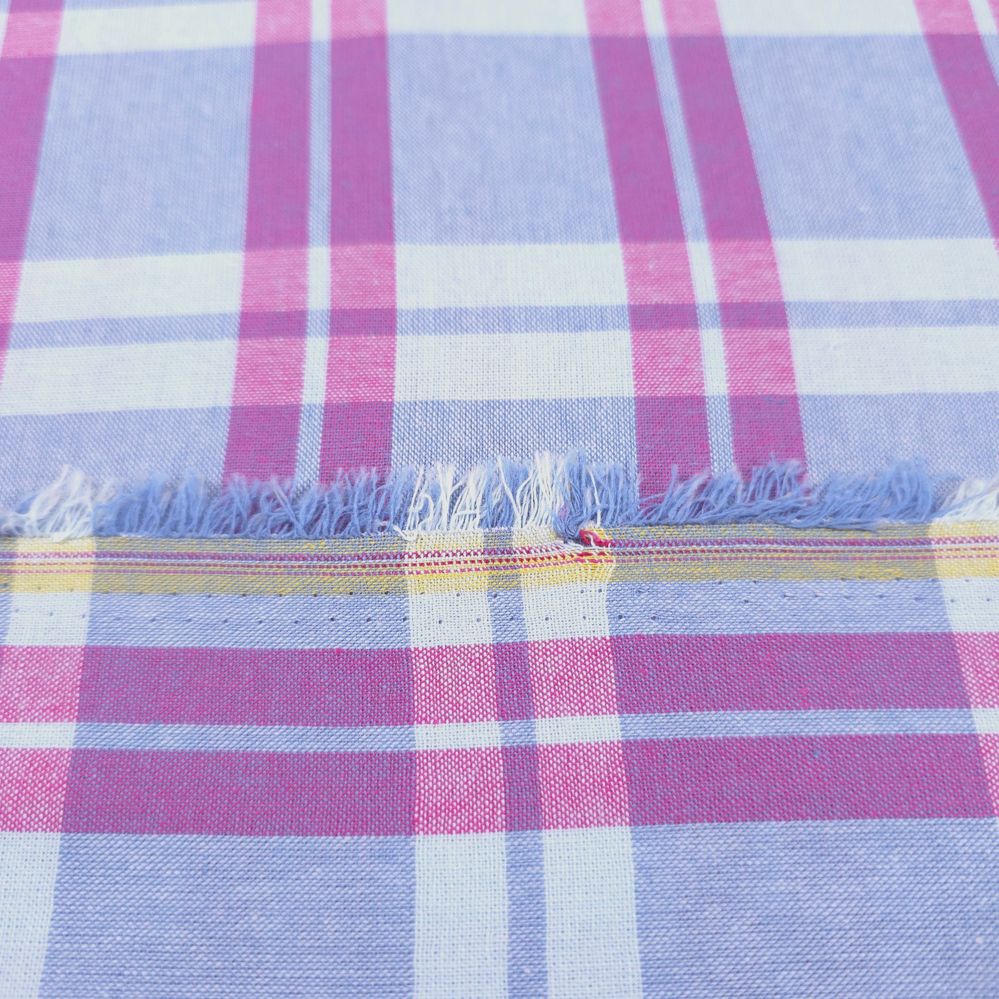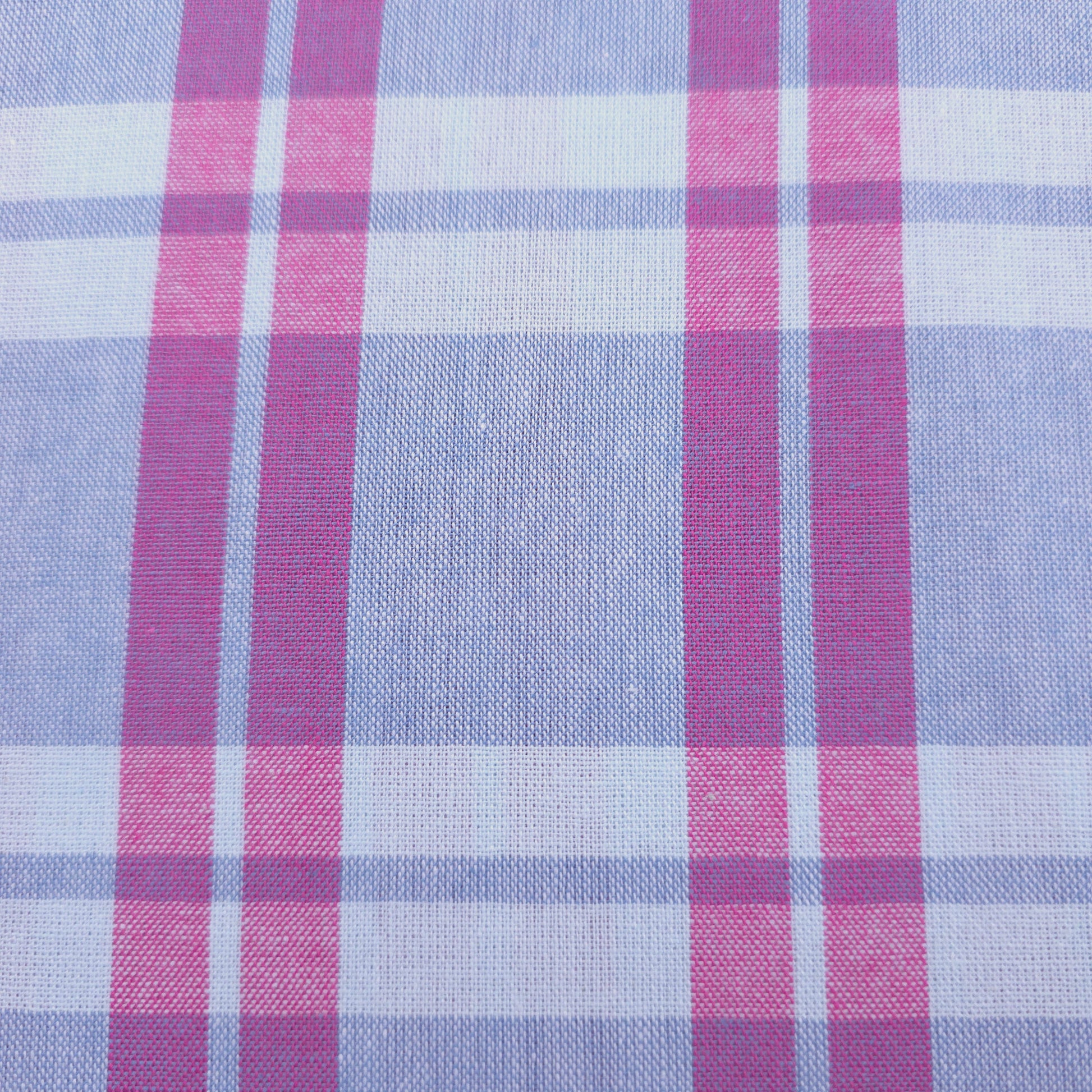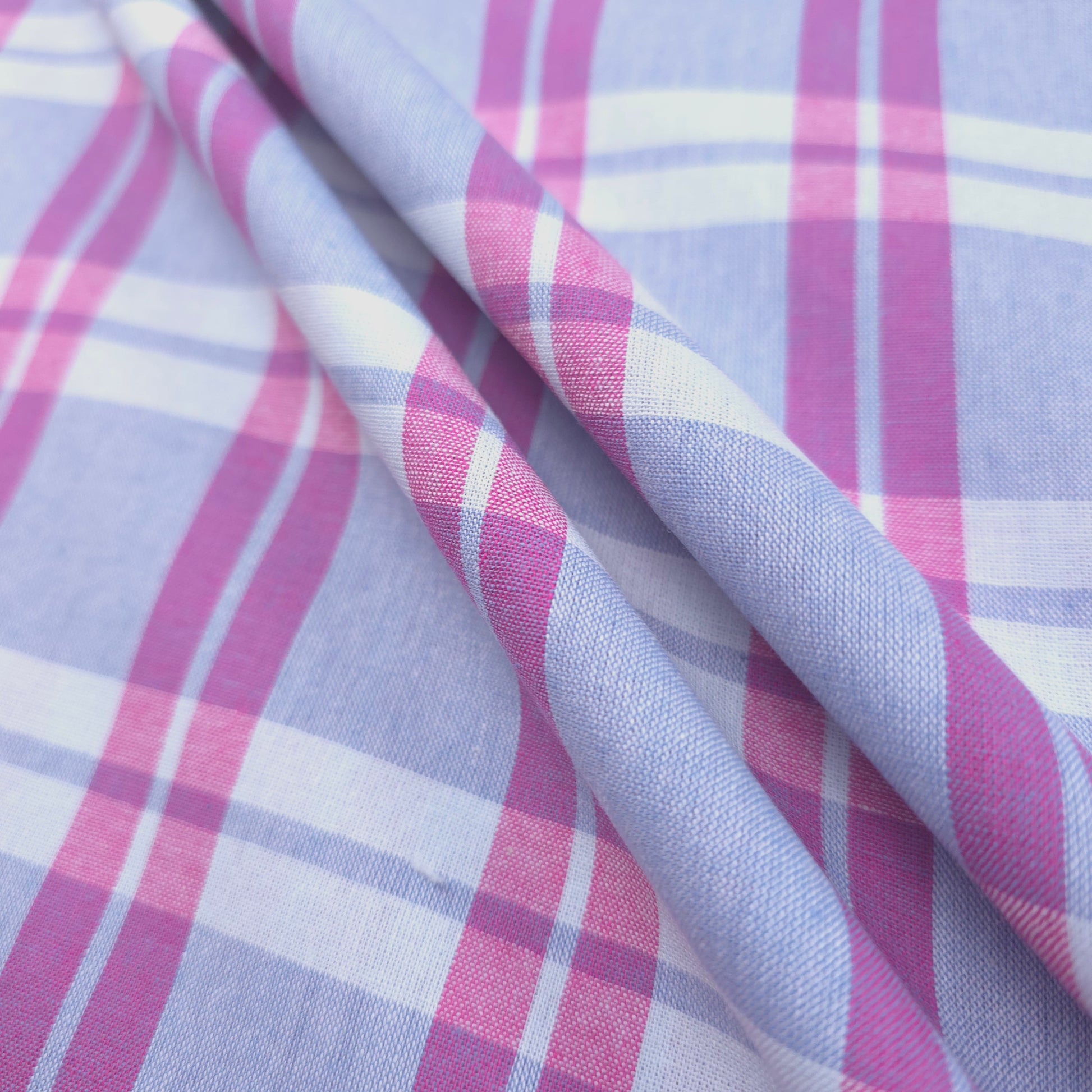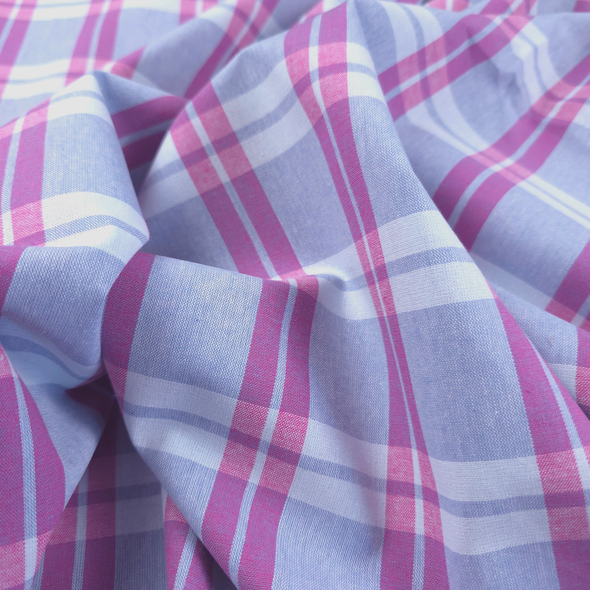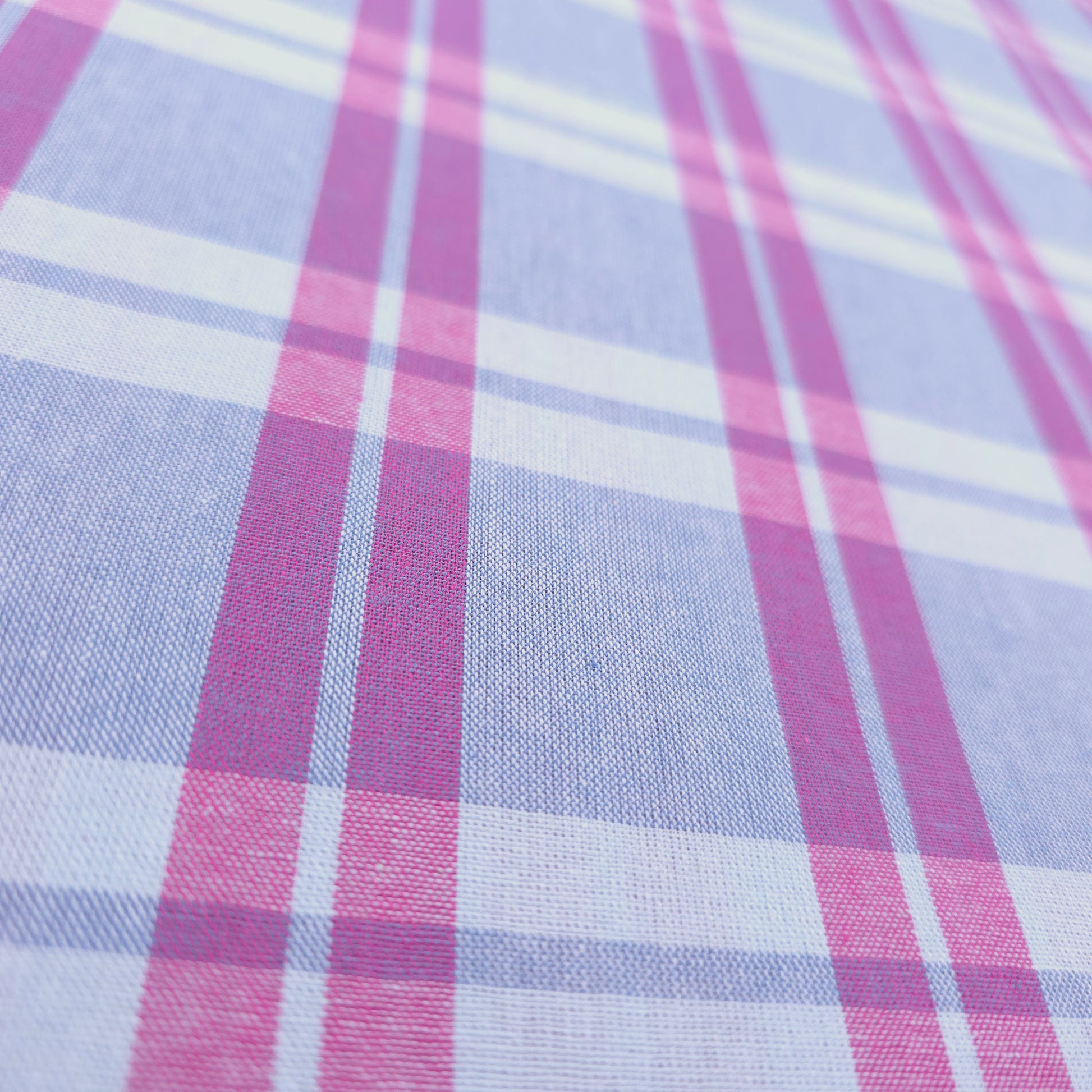 This 58-inch wide, lightweight cotton chambray fabric features a classic plaid pattern. The construction combines a light blue base with intersecting stripes of pink and white, creating a balanced and versatile design. The chambray weave provides a soft hand-feel and breathability, making it comfortable for apparel. This fabric is suitable for a variety of sewing and craft projects.