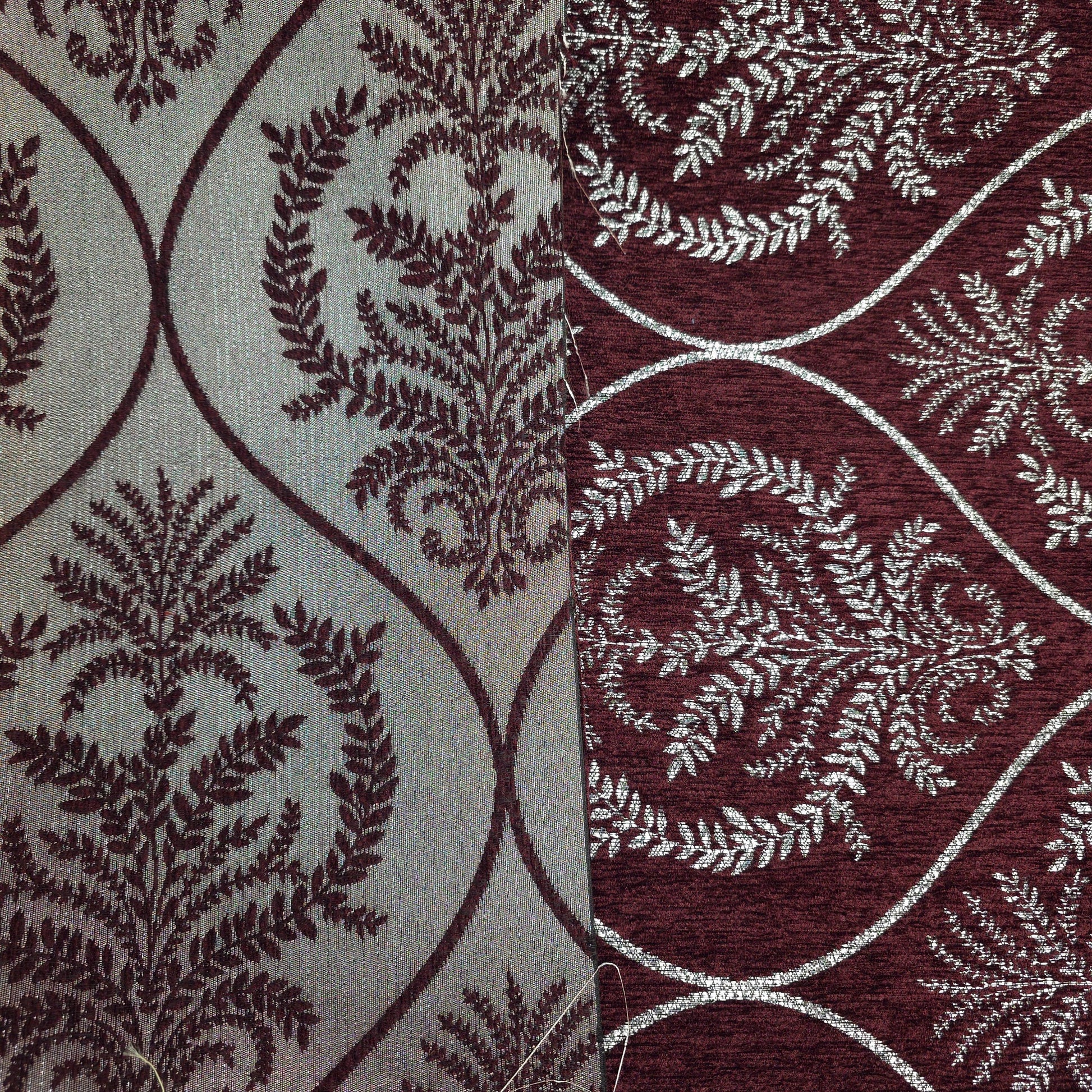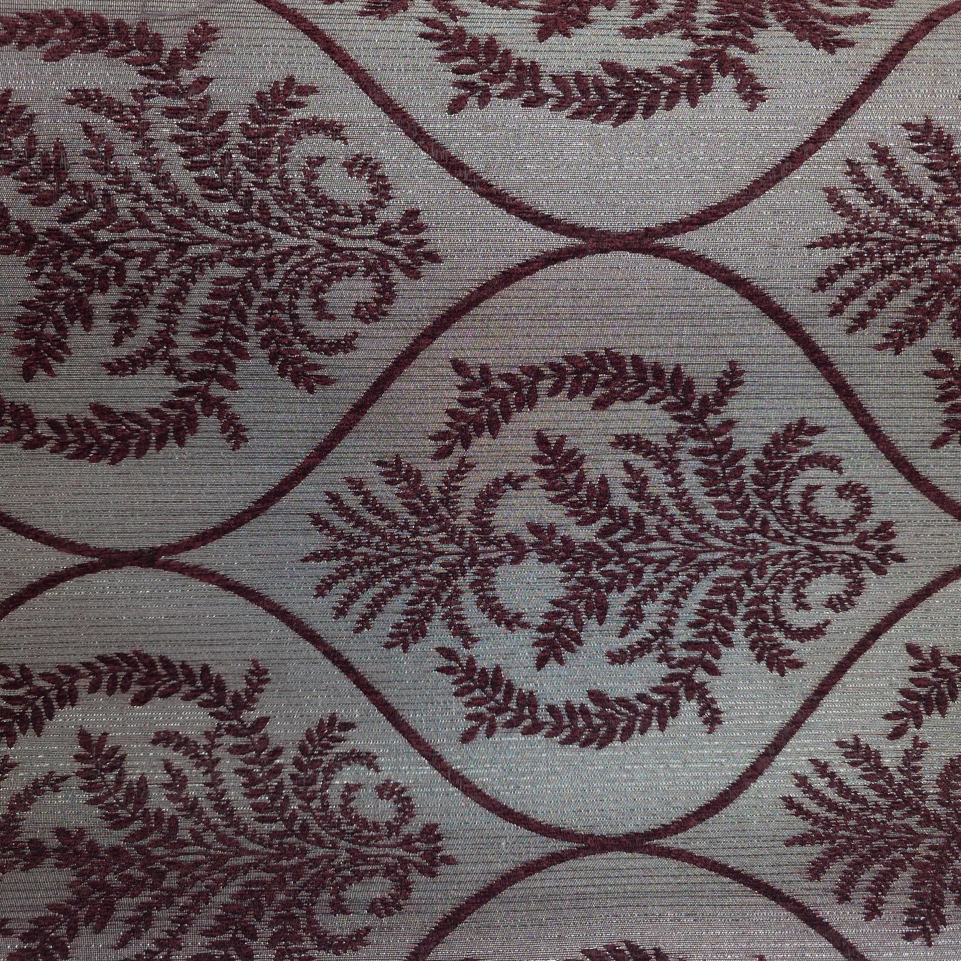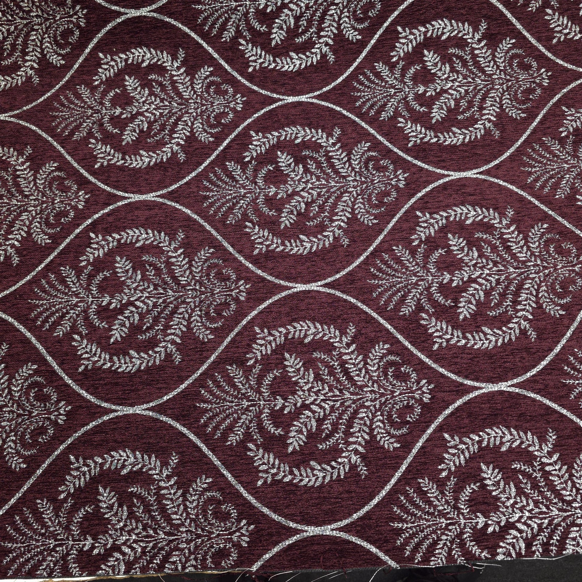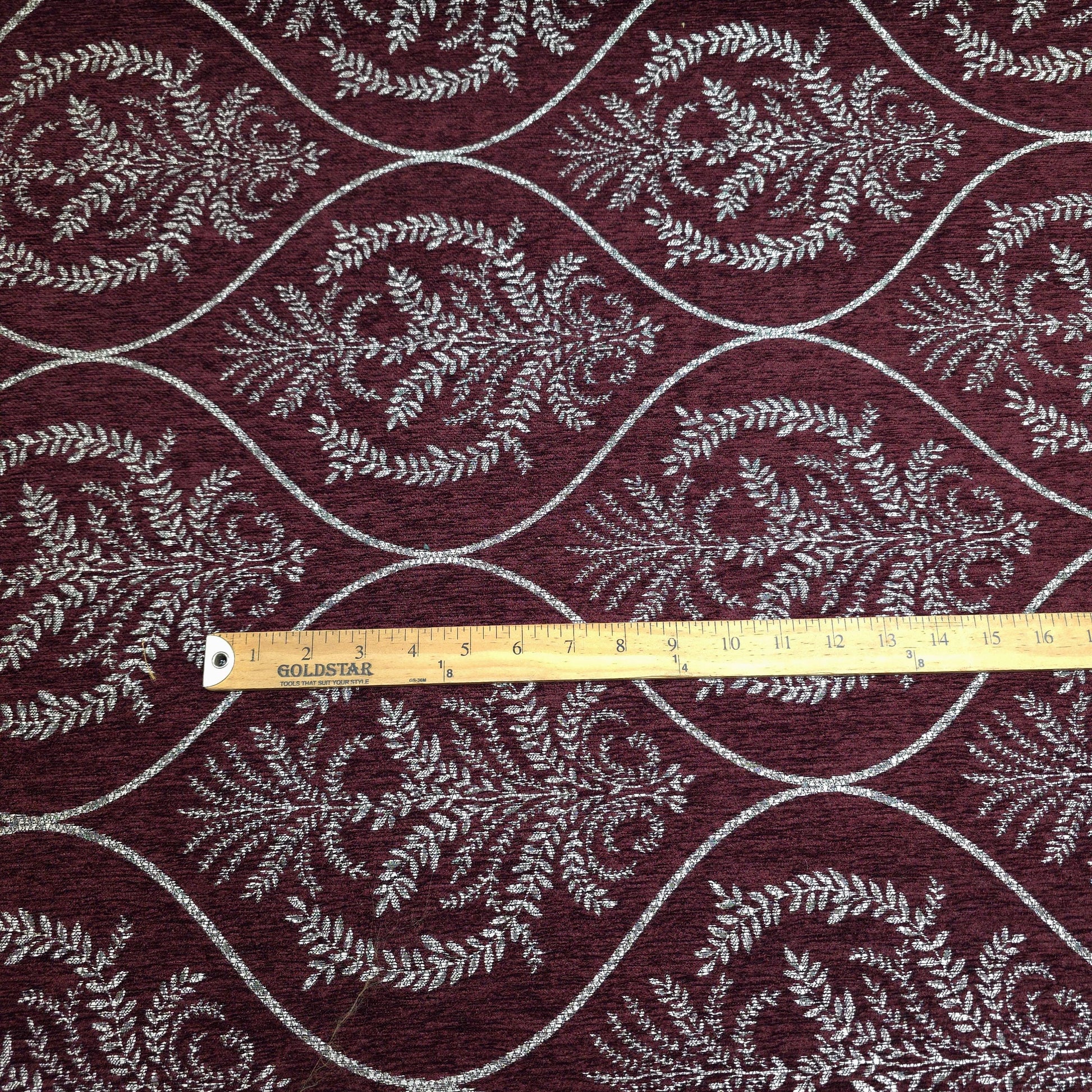 This is a heavy-weight, reversible chenille upholstery fabric. The material is a jacquard weave, featuring an elegant and classic design that offers two distinct looks in one textile. The pattern consists of a graceful ogee trellis. Housed within each curving shape is a detailed botanical medallion, shaped like a wreath of delicate leaves. On the primary side, a plush, deep burgundy chenille forms the background, while the ogee trellis and wreath motifs are rendered in a contrasting silver-white thread. The fabric is fully reversible. The reverse side features an inverted colorway, with a soft, silver-white flat background and the entire pattern defined in the deep burgundy chenille. Due to its heavy-weight construction, this fabric is exceptionally durable and suitable for high-traffic projects.