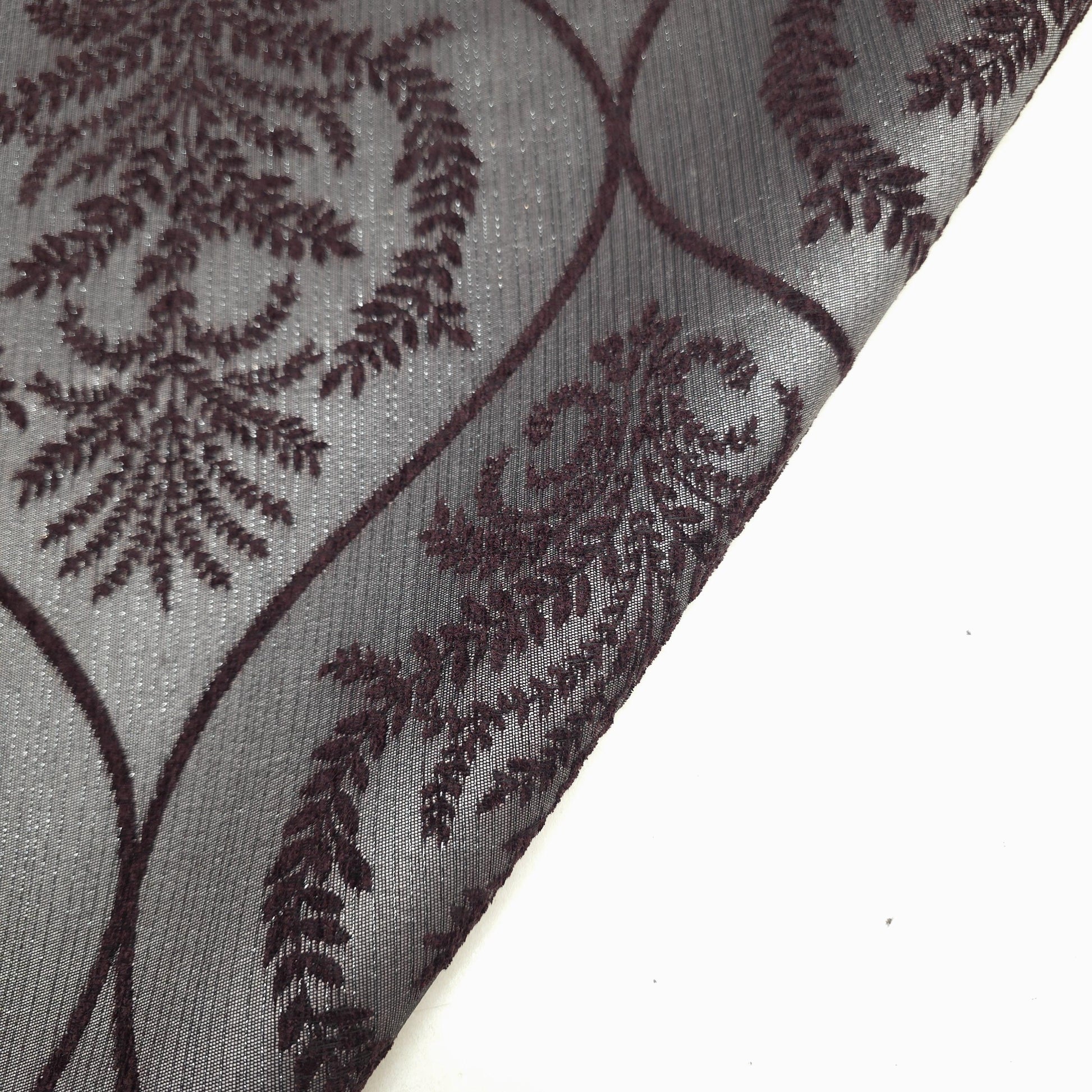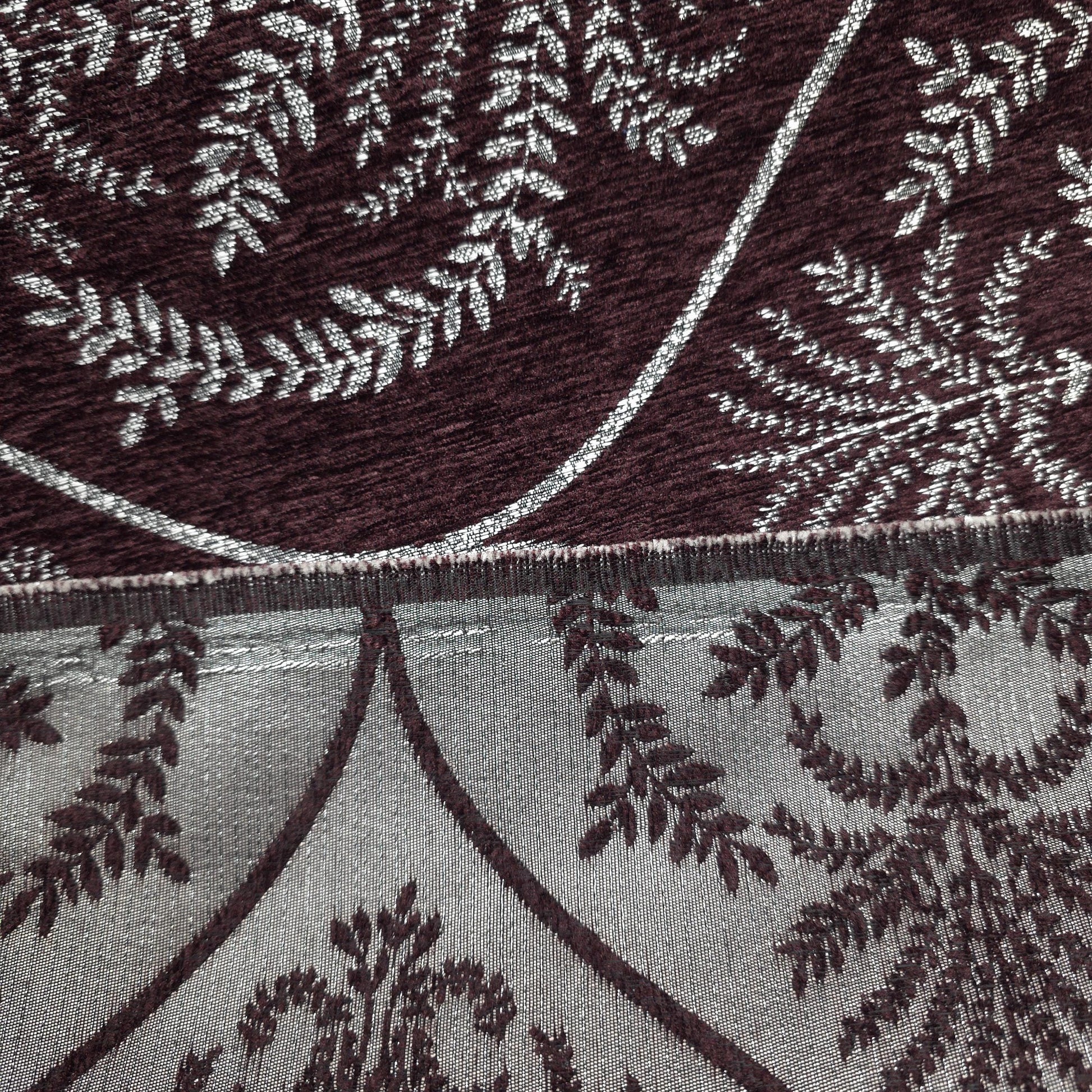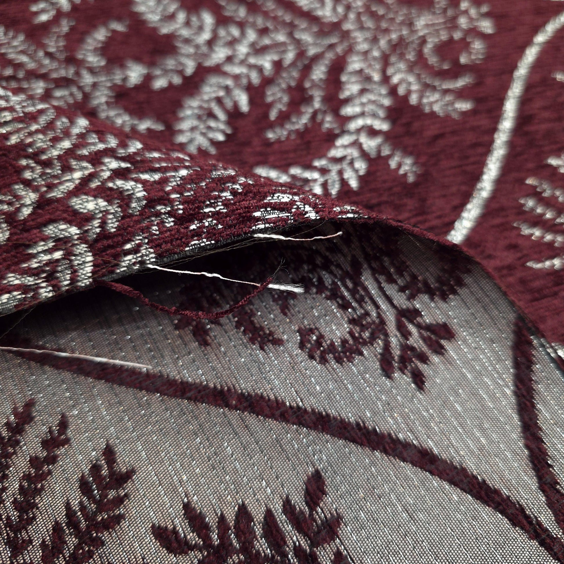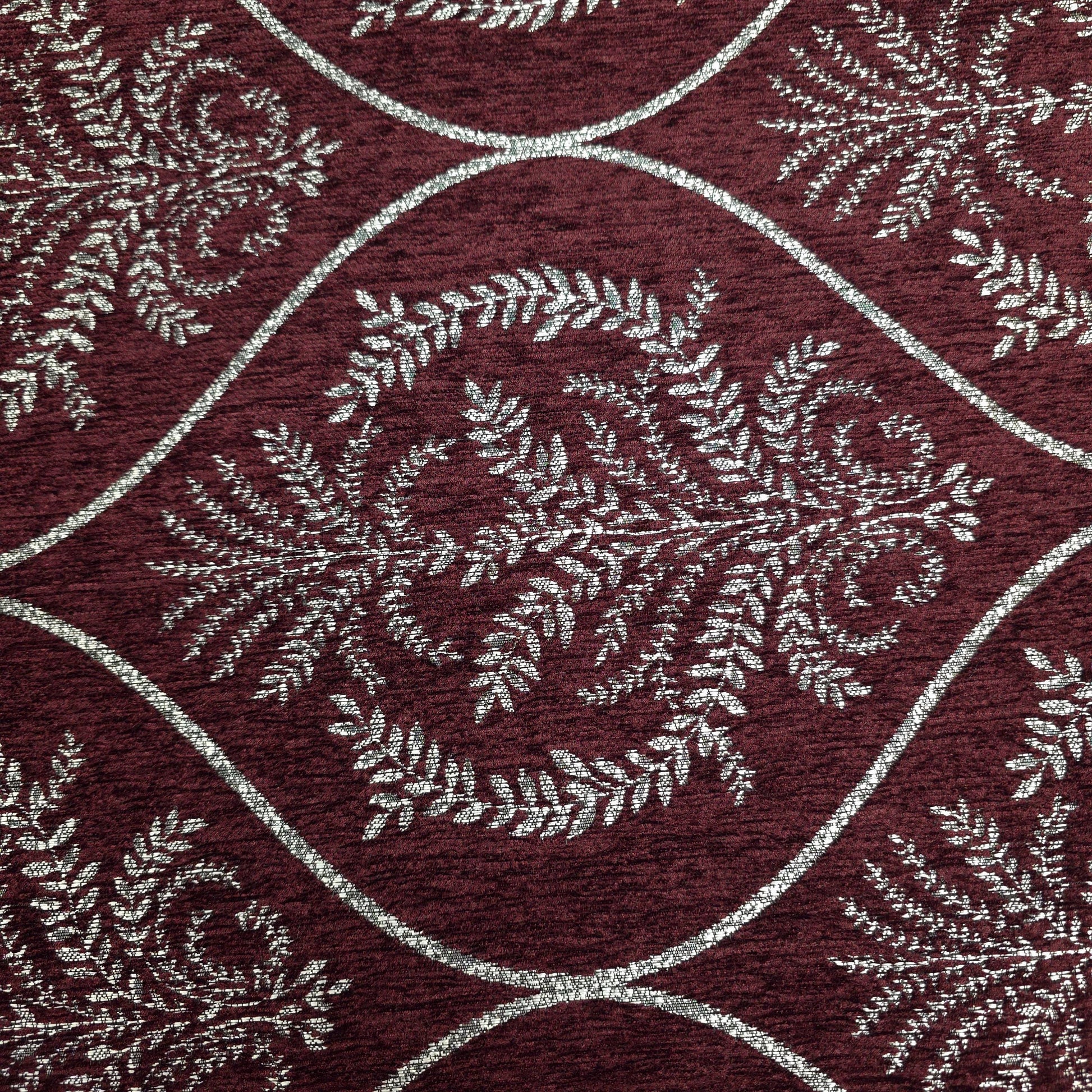 This is a heavy-weight, reversible chenille upholstery fabric. The material is a jacquard weave, featuring an elegant and classic design that offers two distinct looks in one textile. The pattern consists of a graceful ogee trellis. Housed within each curving shape is a detailed botanical medallion, shaped like a wreath of delicate leaves. On the primary side, a plush, deep burgundy chenille forms the background, while the ogee trellis and wreath motifs are rendered in a contrasting silver-white thread. The fabric is fully reversible. The reverse side features an inverted colorway, with a soft, silver-white flat background and the entire pattern defined in the deep burgundy chenille. Due to its heavy-weight construction, this fabric is exceptionally durable and suitable for high-traffic projects.