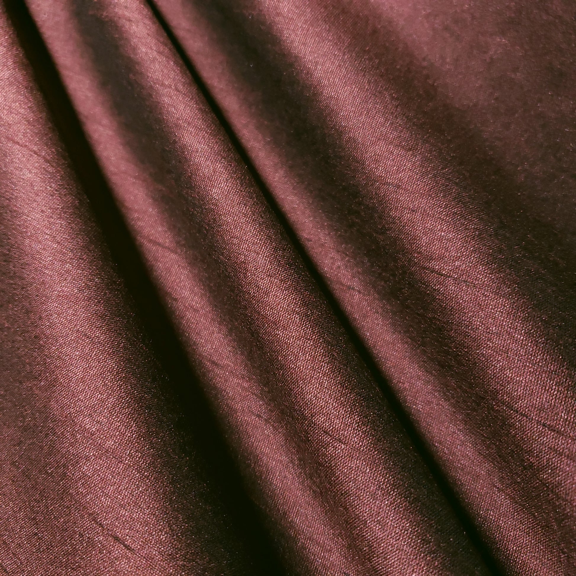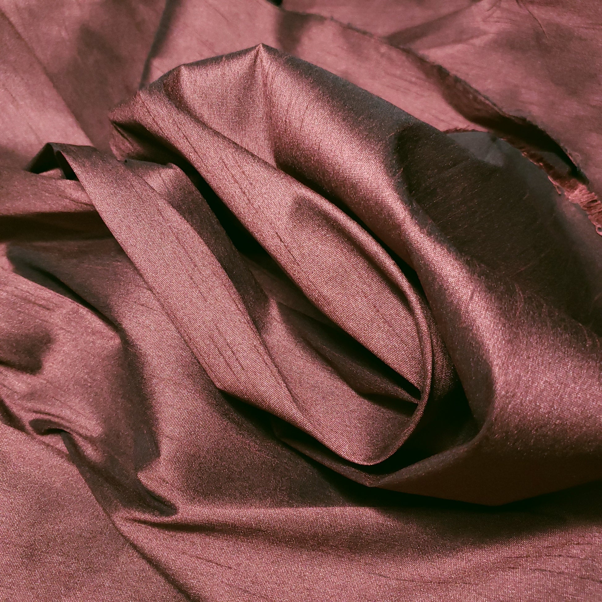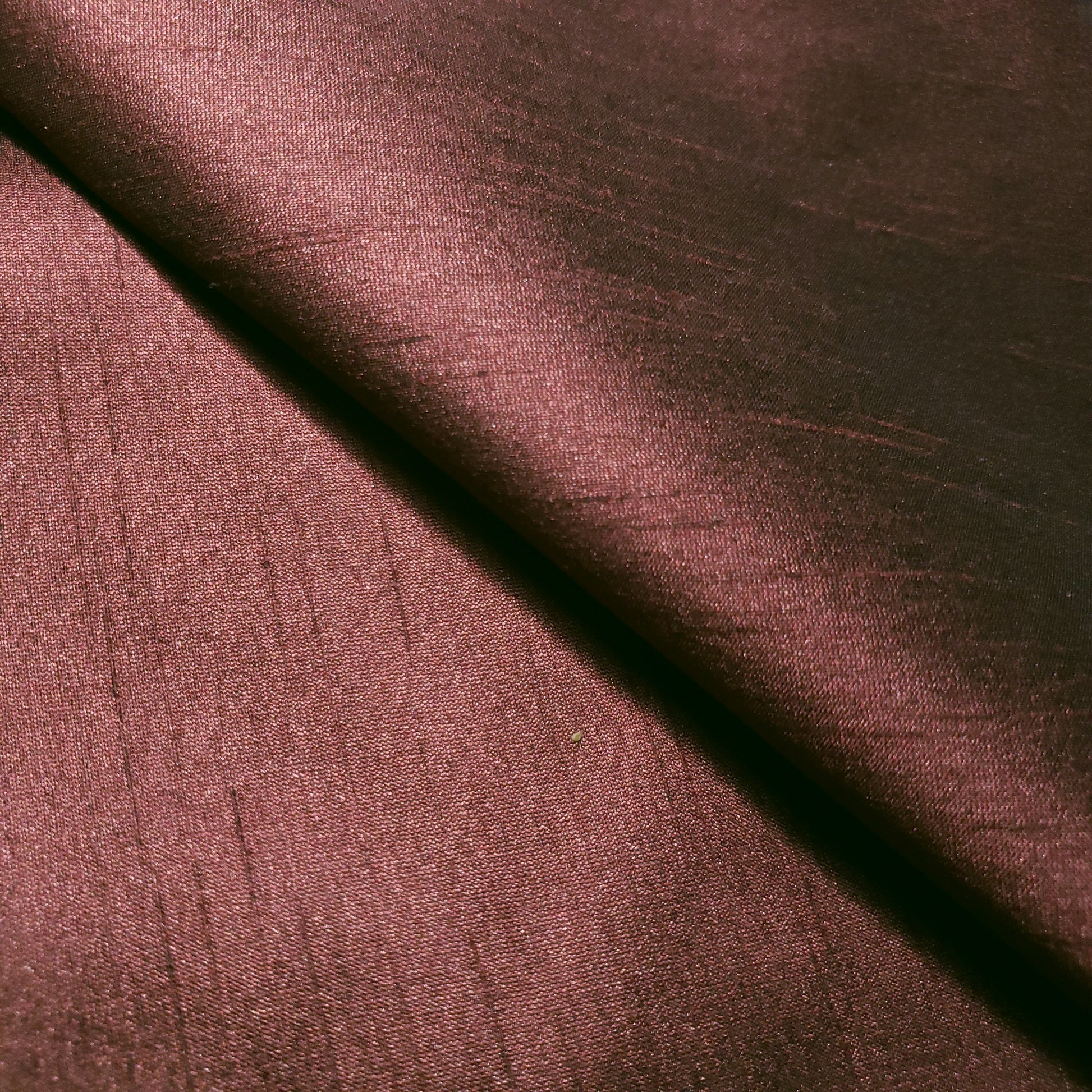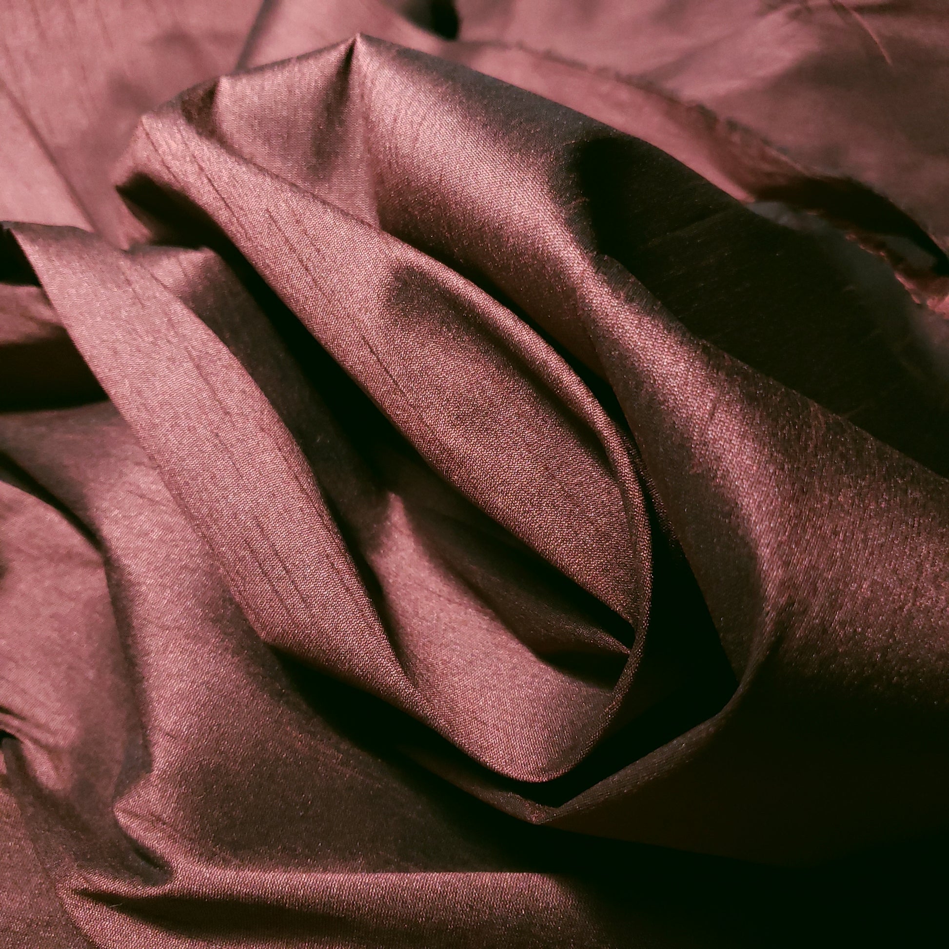 Dupioni fabric is a plain-woven fabric. Using a fine yard on the warp and an uneven yarn on the weft. This creates visual and textural raised thin stripes in the fabric. The thread used here has a subtle sheen to it. giving it a subtle color refracting iridescence.