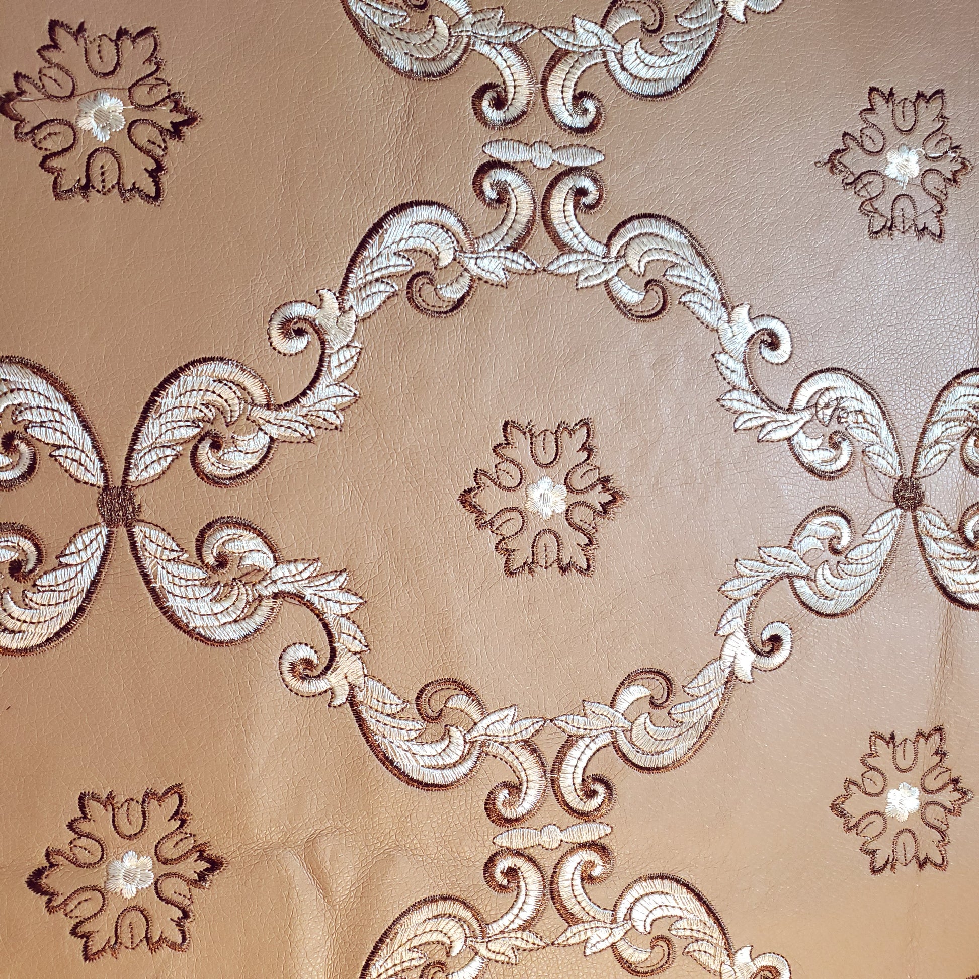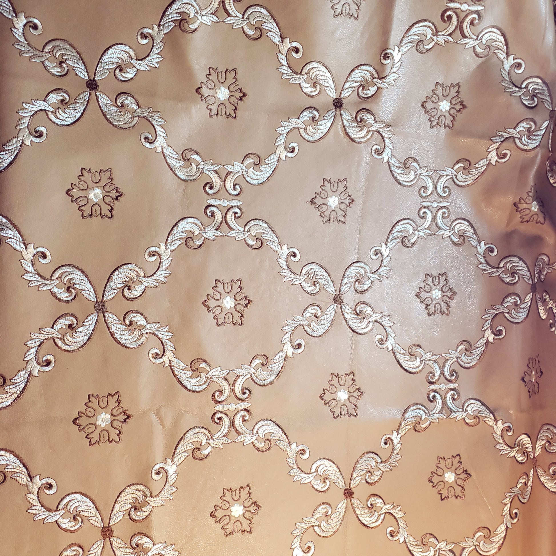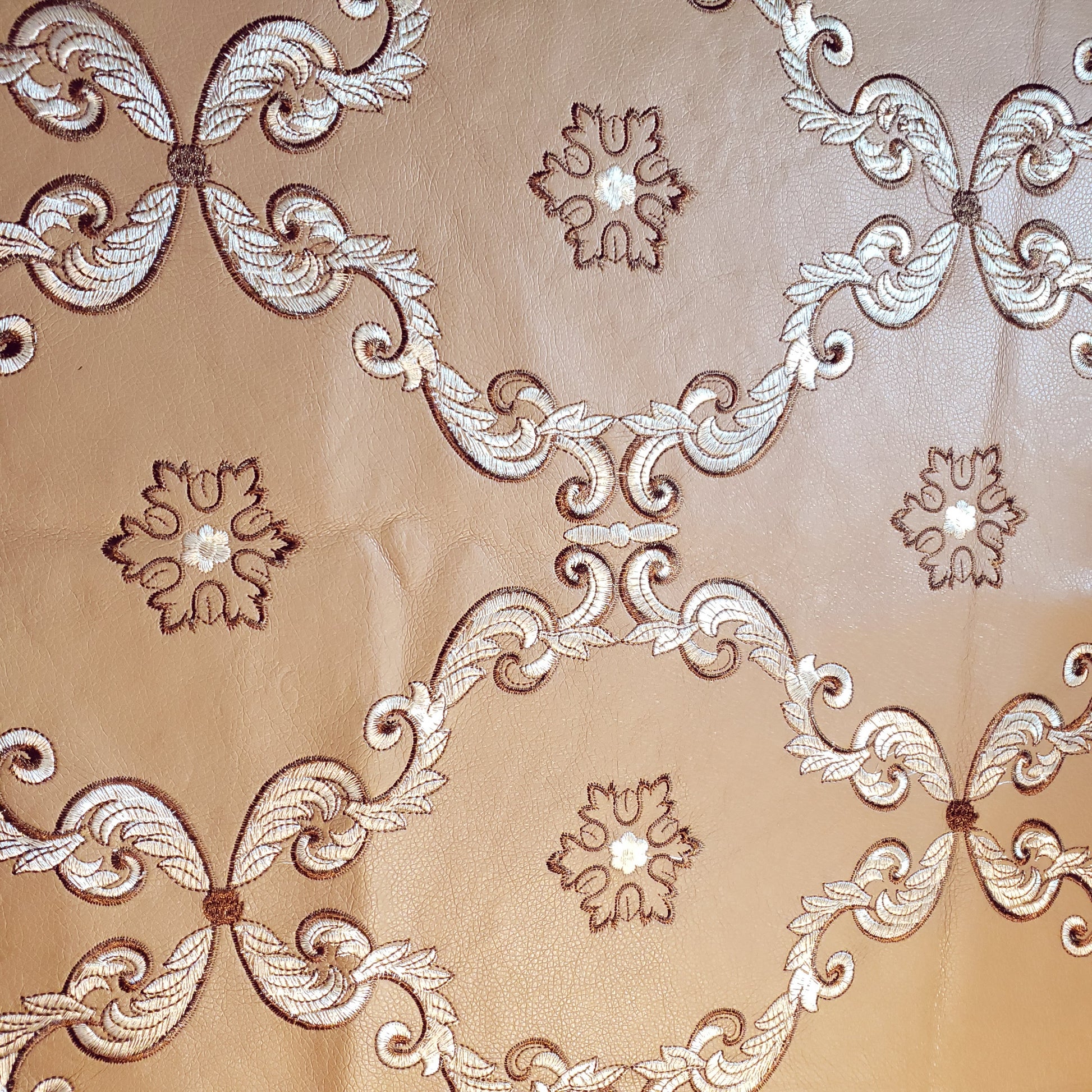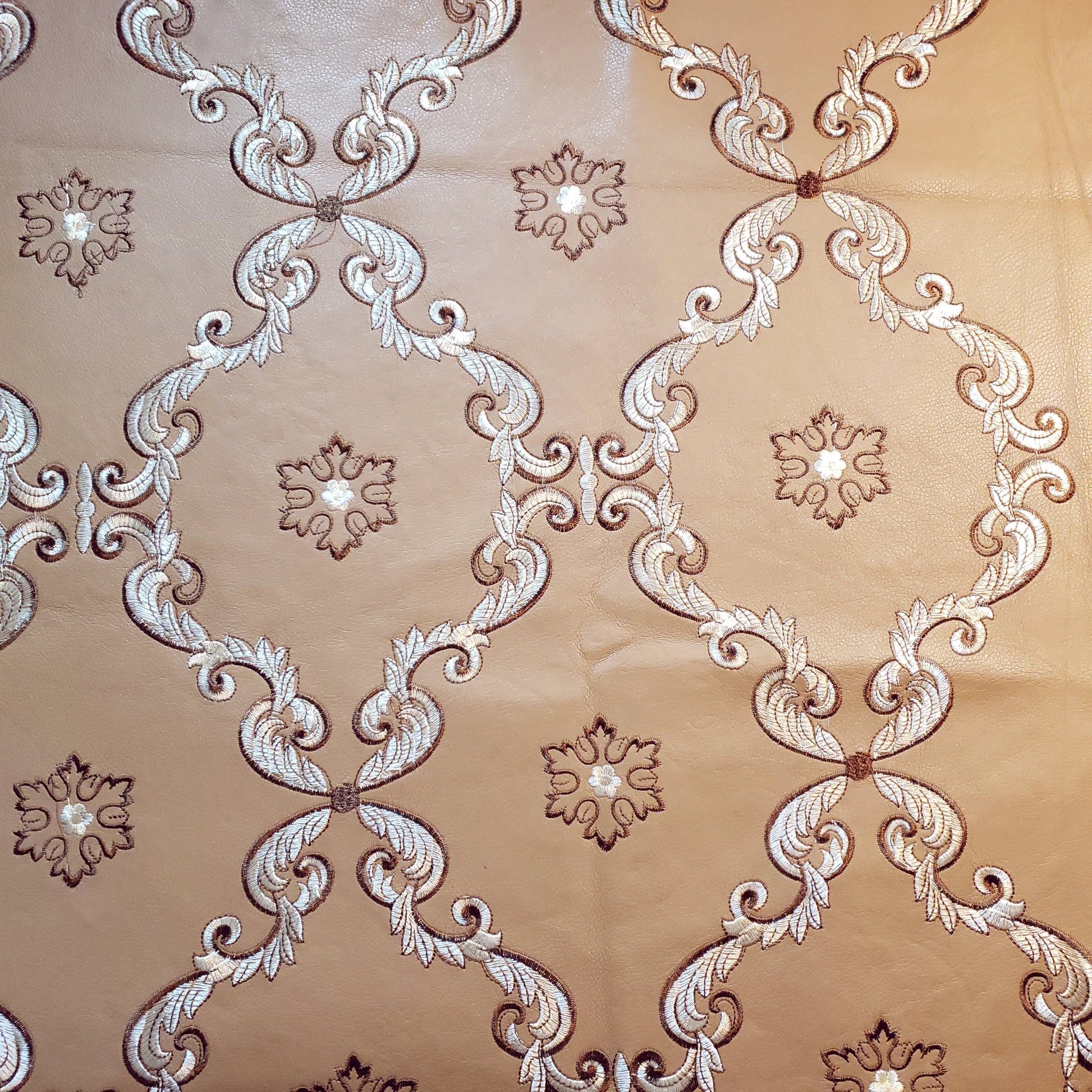 This beautiful pebble grain vinyl fabric is embellished with an embroidered lattice damask vine motif. The embroidery is set with brown and ivory thread. The backing is a flat fabric woven texture with the embroidery showing through. There is no stretch.