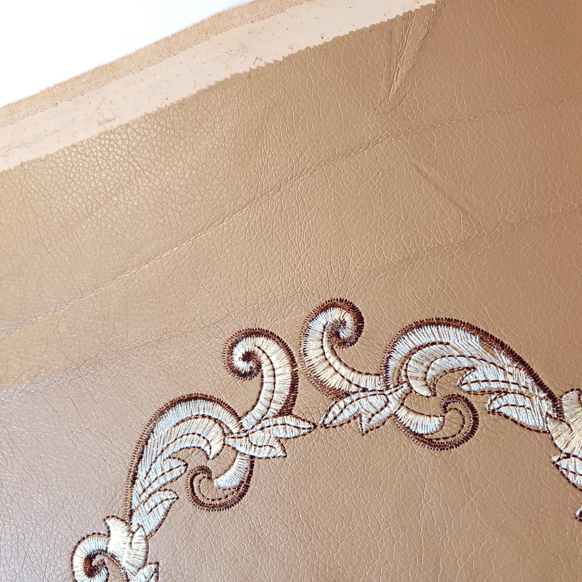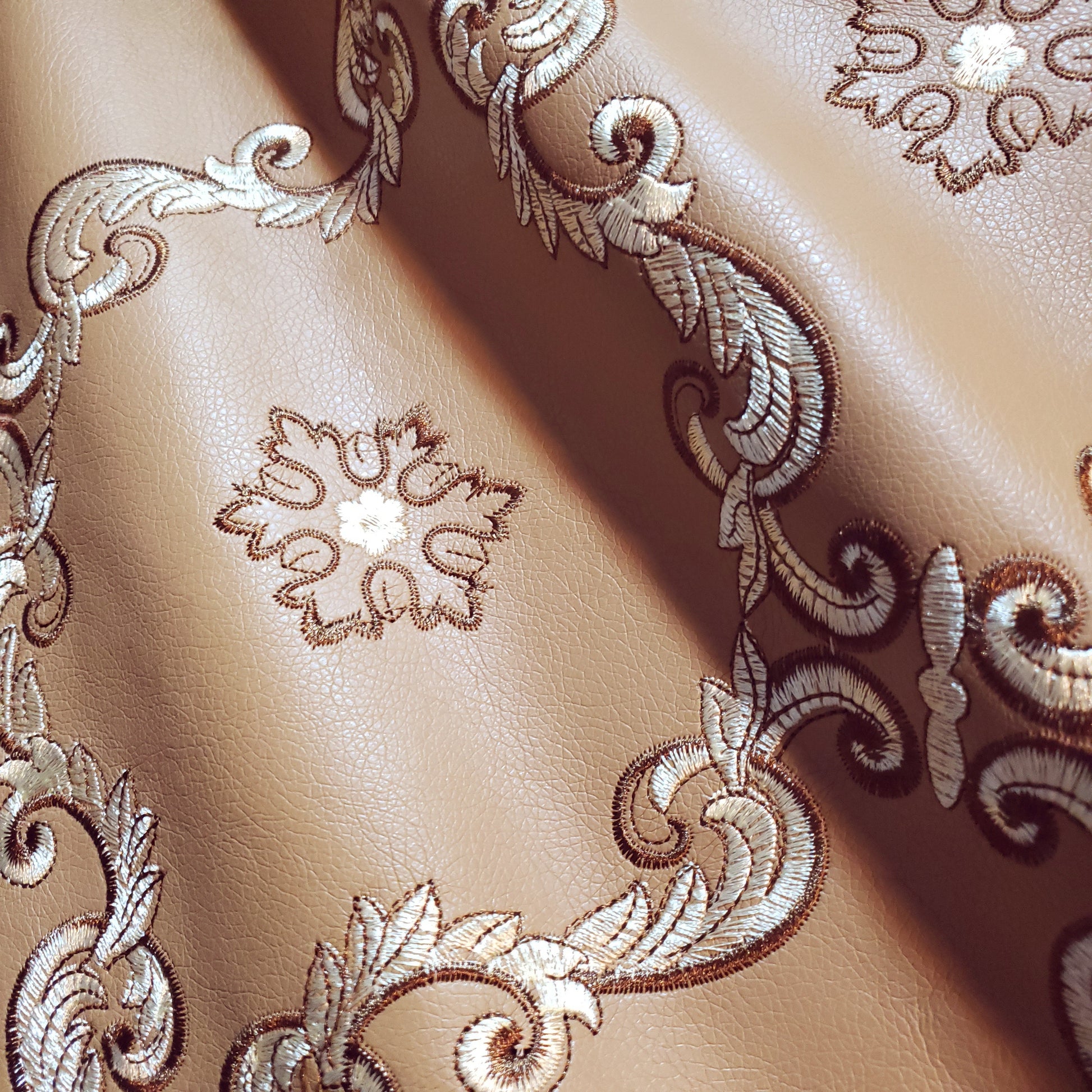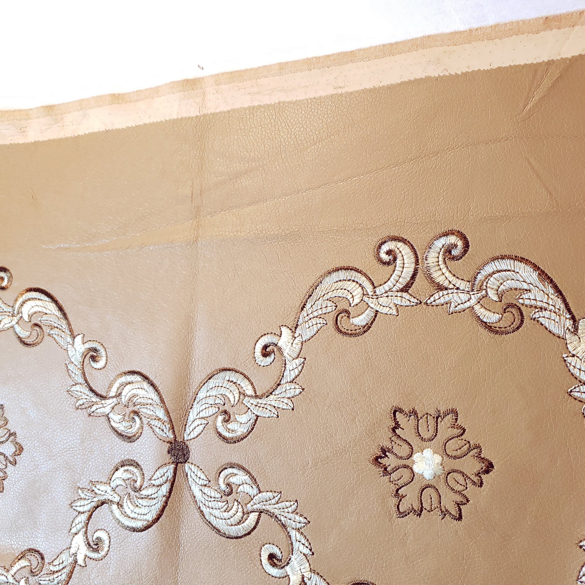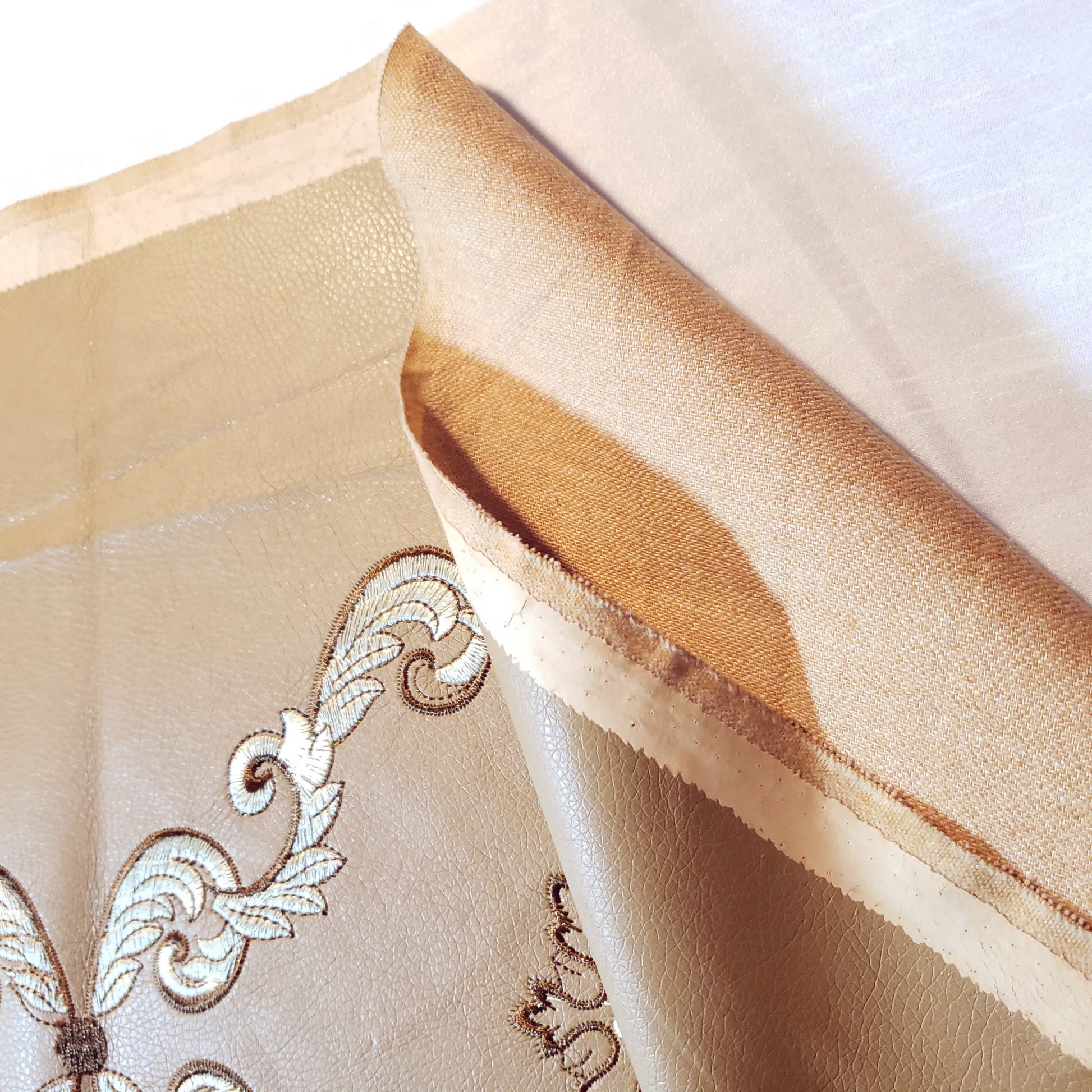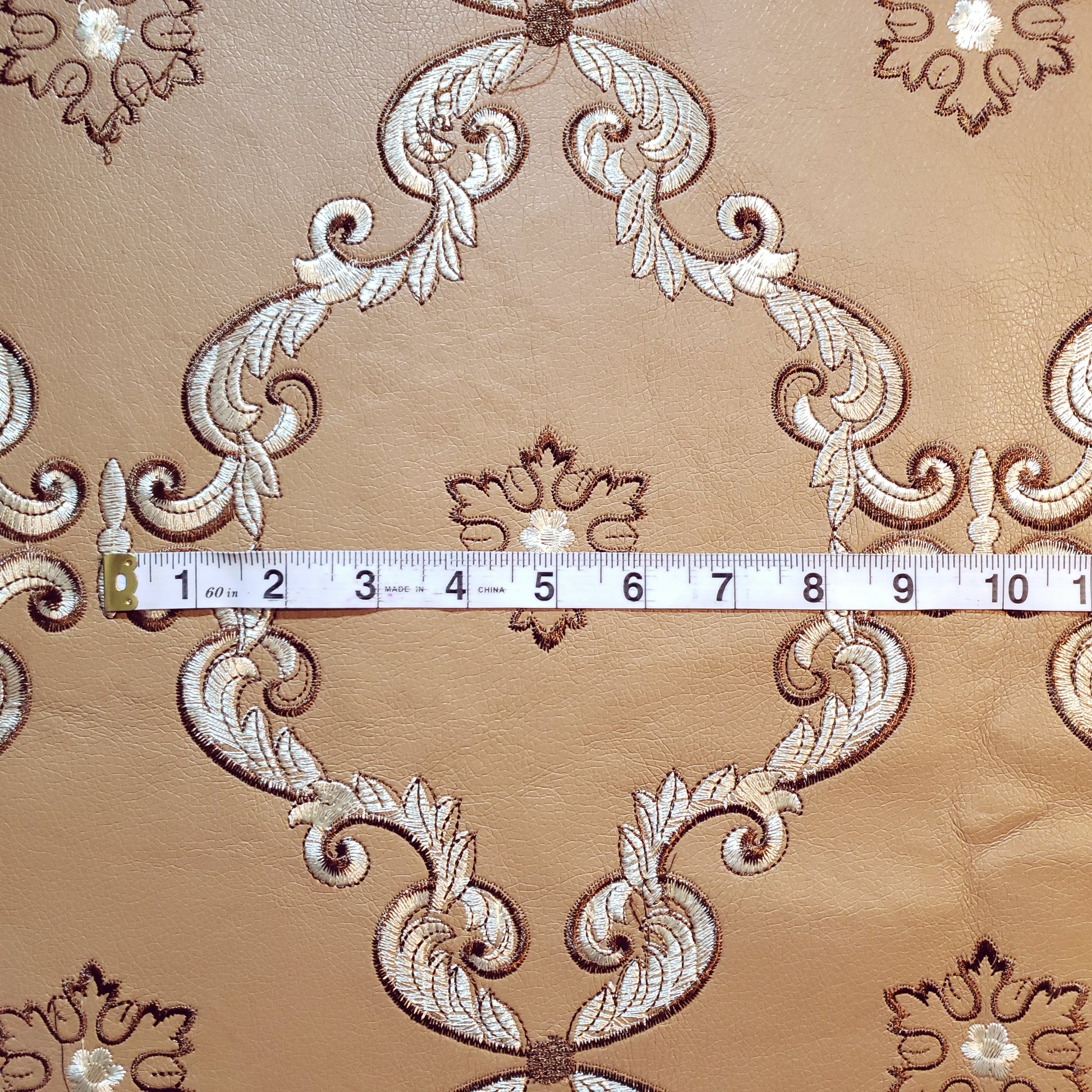 This beautiful pebble grain vinyl fabric is embellished with an embroidered lattice damask vine motif. The embroidery is set with brown and ivory thread. The backing is a flat fabric woven texture with the embroidery showing through. There is no stretch.