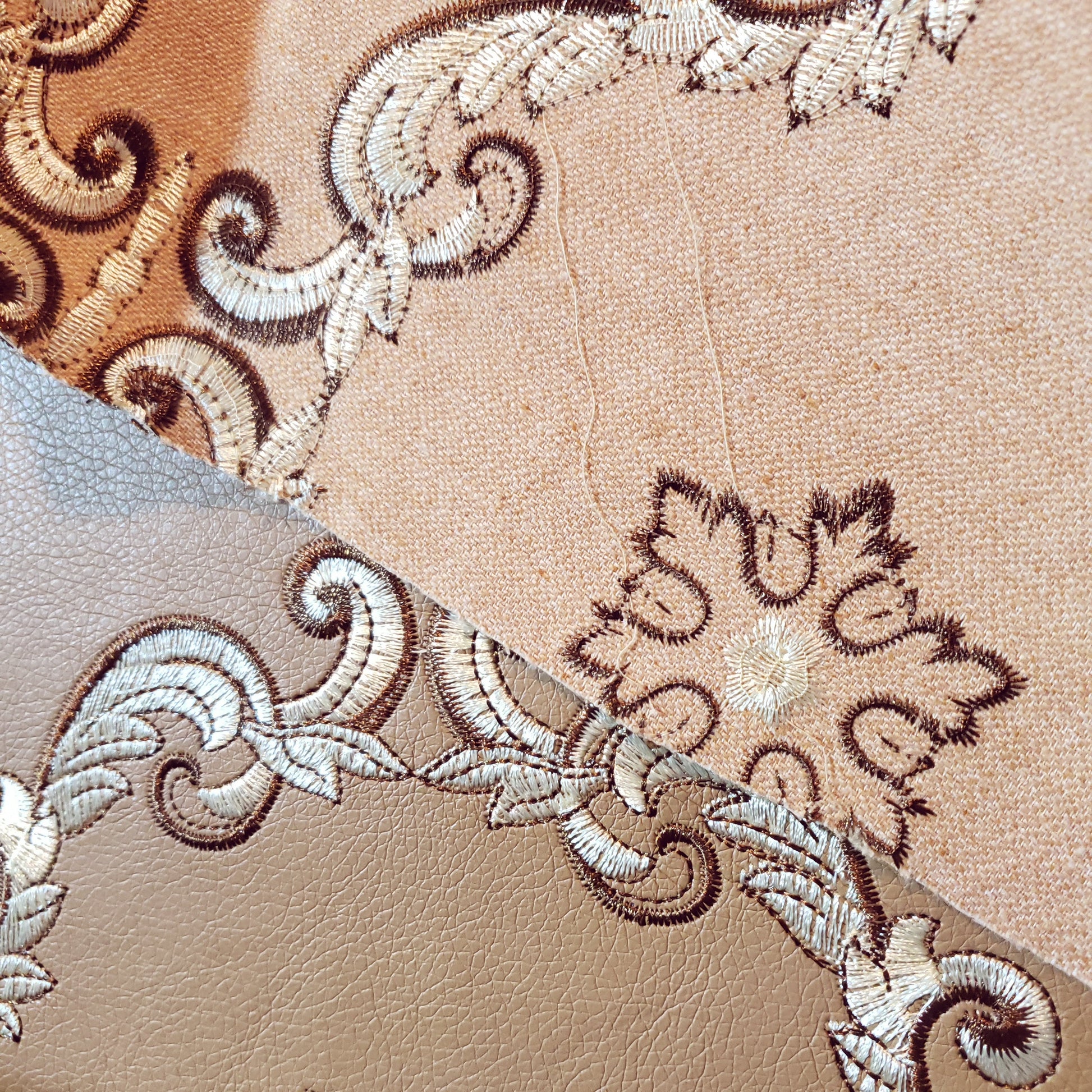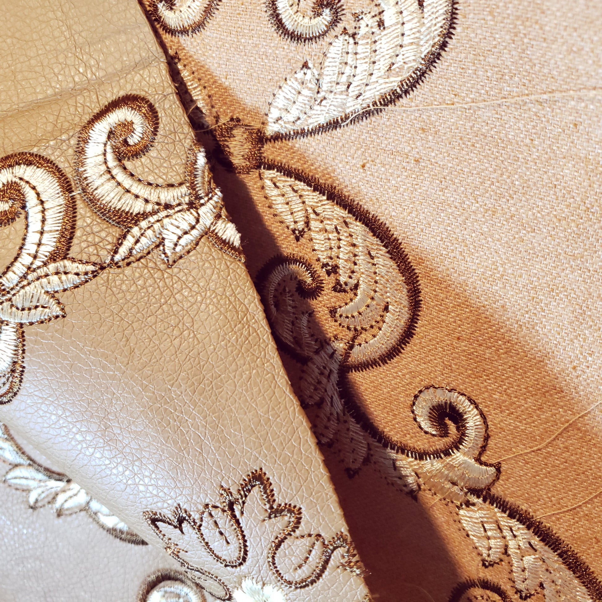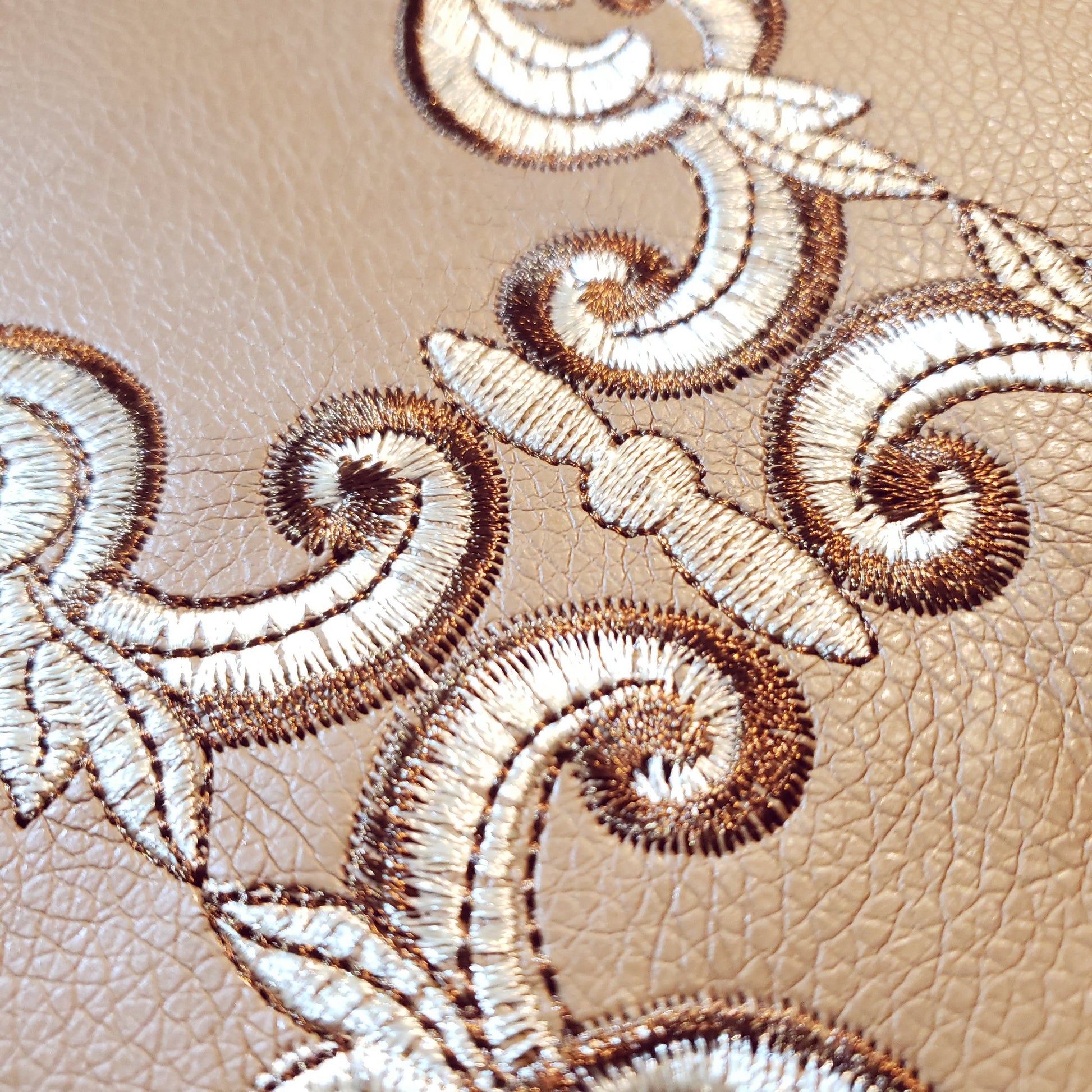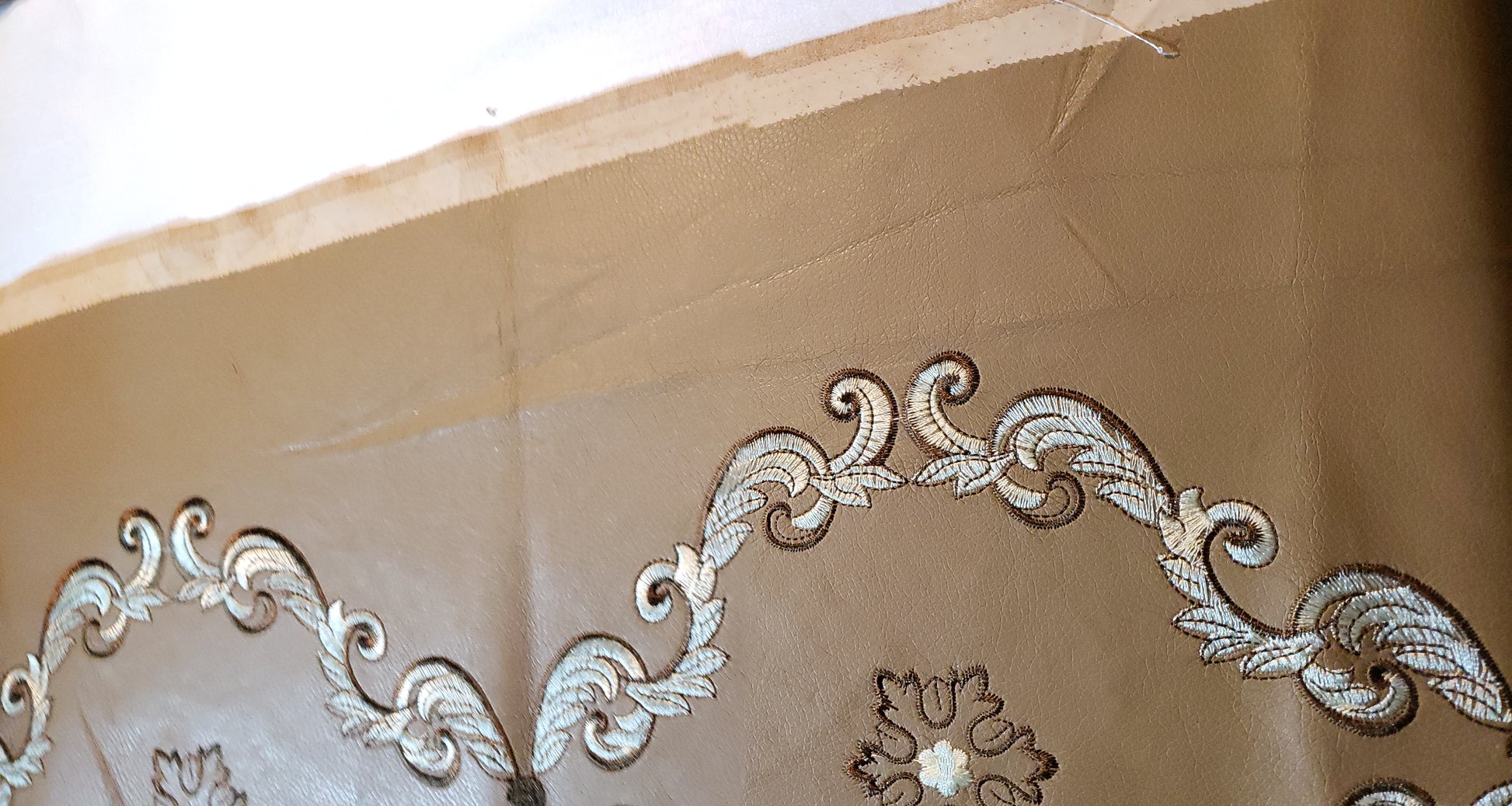 This beautiful pebble grain vinyl fabric is embellished with an embroidered lattice damask vine motif. The embroidery is set with brown and ivory thread. The backing is a flat fabric woven texture with the embroidery showing through. There is no stretch.
