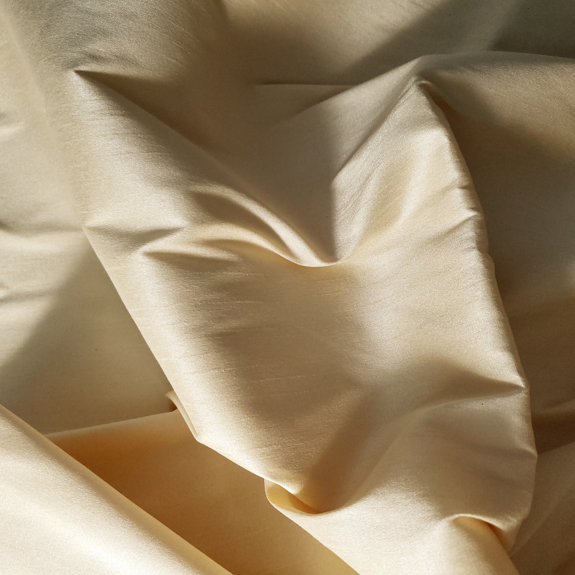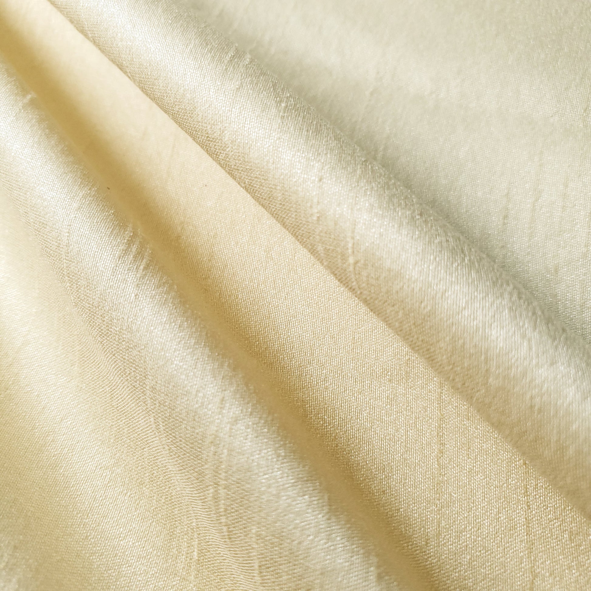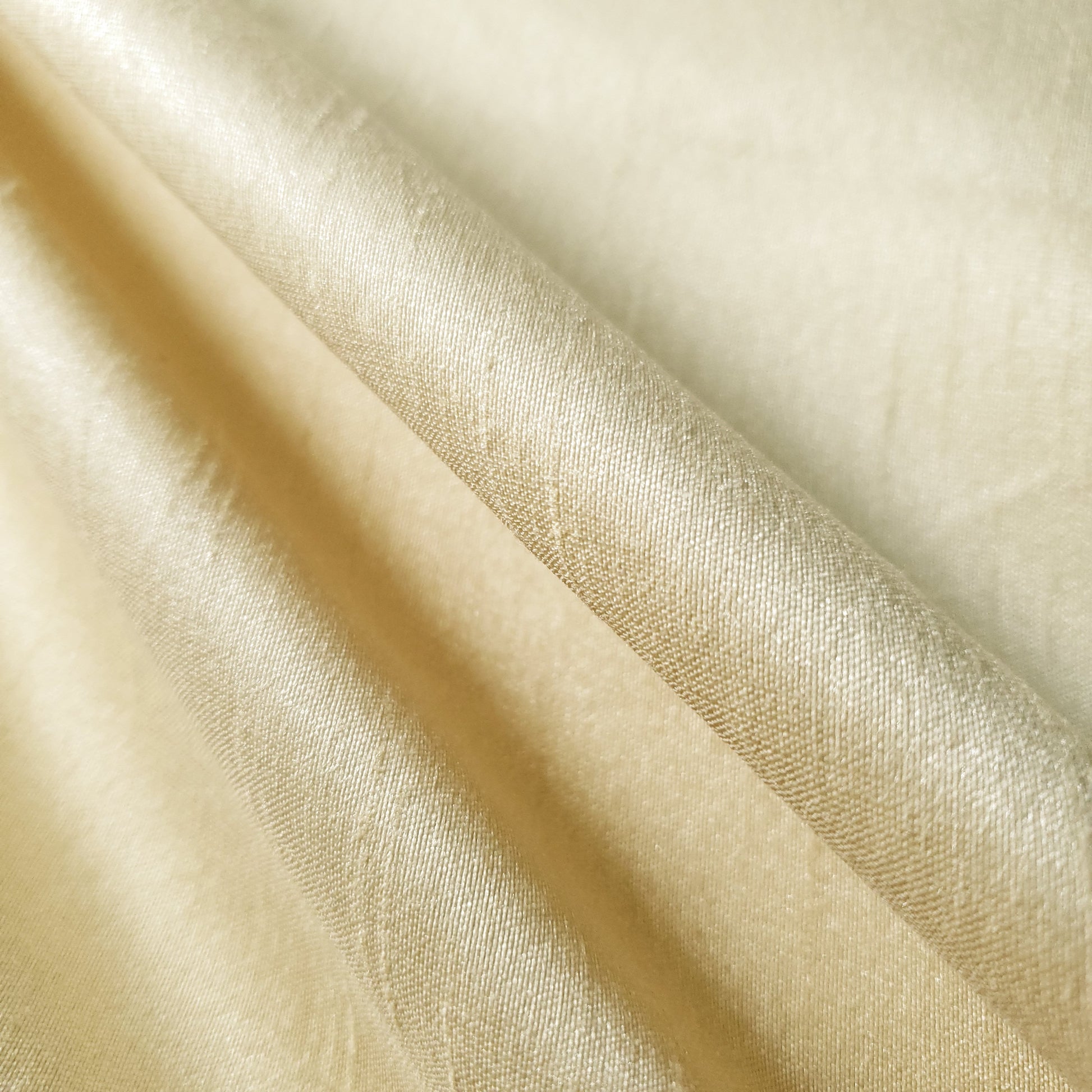 Crafted to mimic authentic silk Dupioni, this polyester fabric offers luxurious aesthetics at accessible pricing. The lightweight, crisp texture creates volume rather than drape, featuring a pale yellow-gold base interwoven with fine white threads that produce a subtle frosted effect. Its plain-weave construction combines fine warp yarns with uneven weft yarns, creating distinctive raised stripes with a gentle sheen that refracts light for subtle iridescence. Versatile for bridal wear, fashion design, drapery, light upholstery, corsetry, and home décor. Maintain with cold gentle machine washing and warm ironing on reverse side.