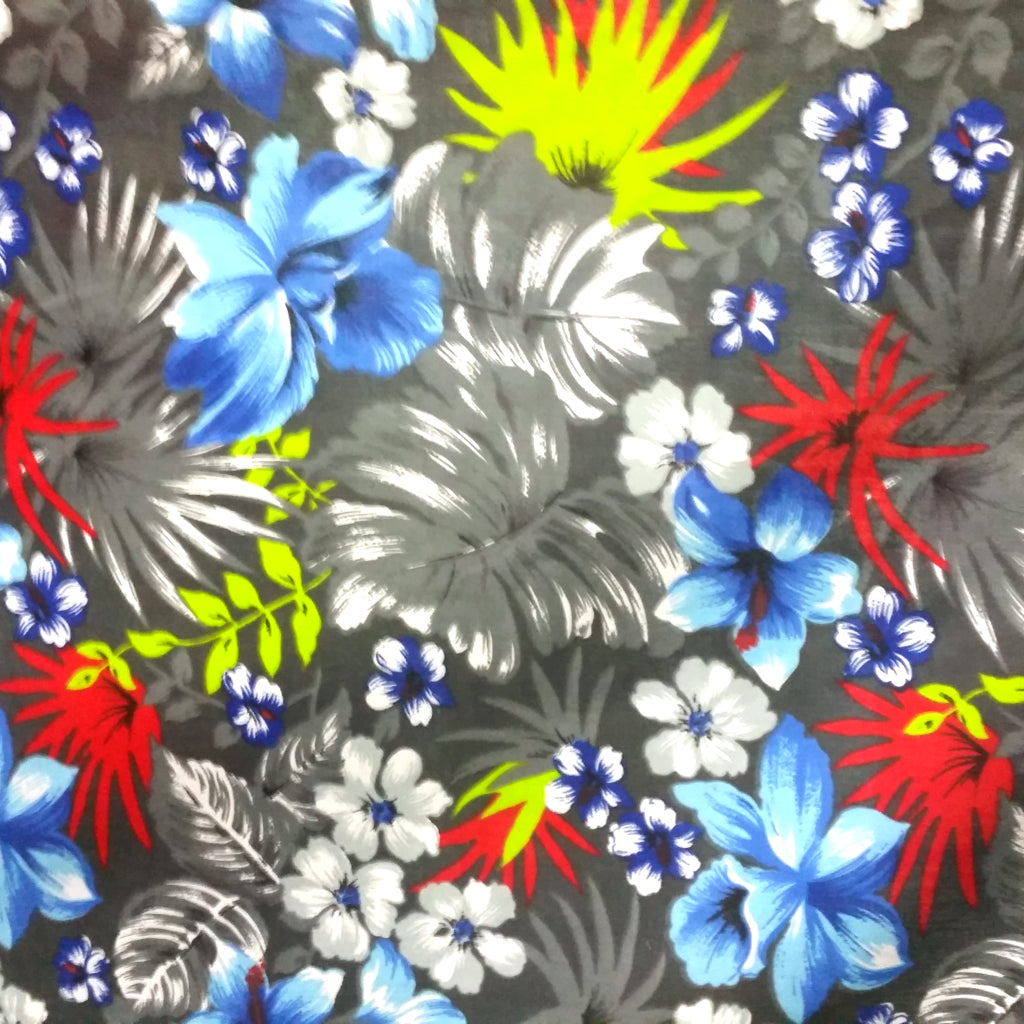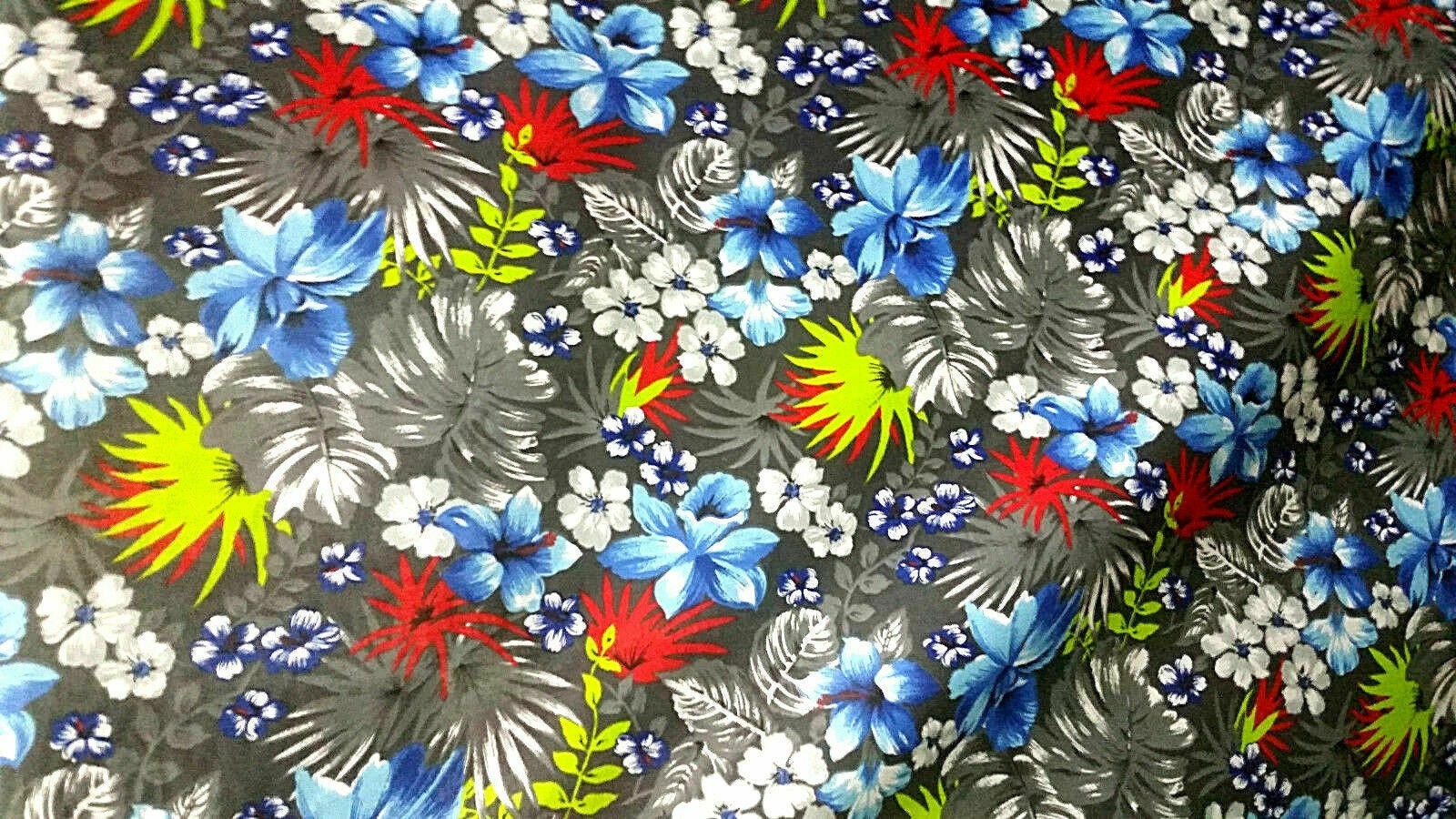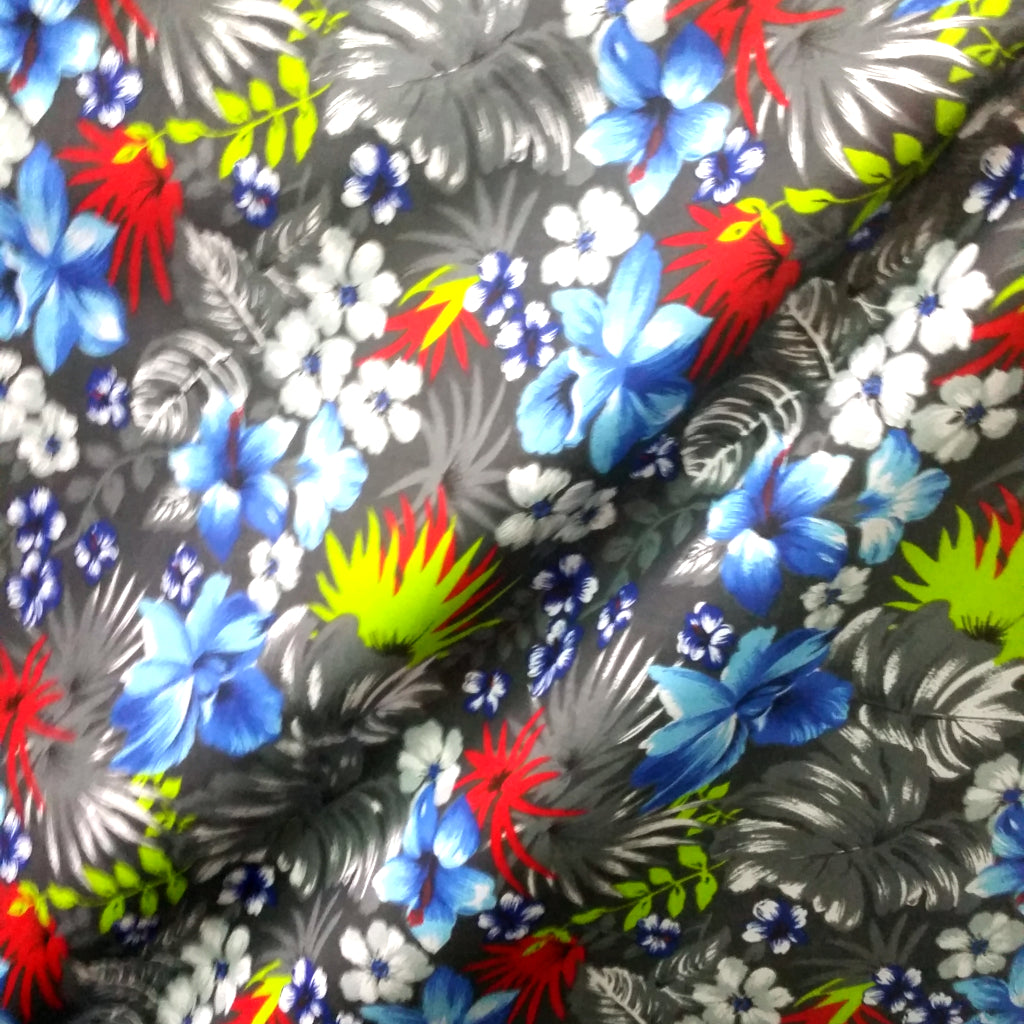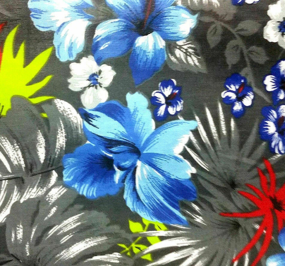 This listing offers one yard of 58" wide fabric sold by the yard. Each purchase corresponds to one yard. The fabric showcases a vibrant assortment of tropical Hawaiian floral and foliage designs. Charcoal gray serves as the primary background color, complemented by an appealing blend of lime green, white, and turquoise accents.