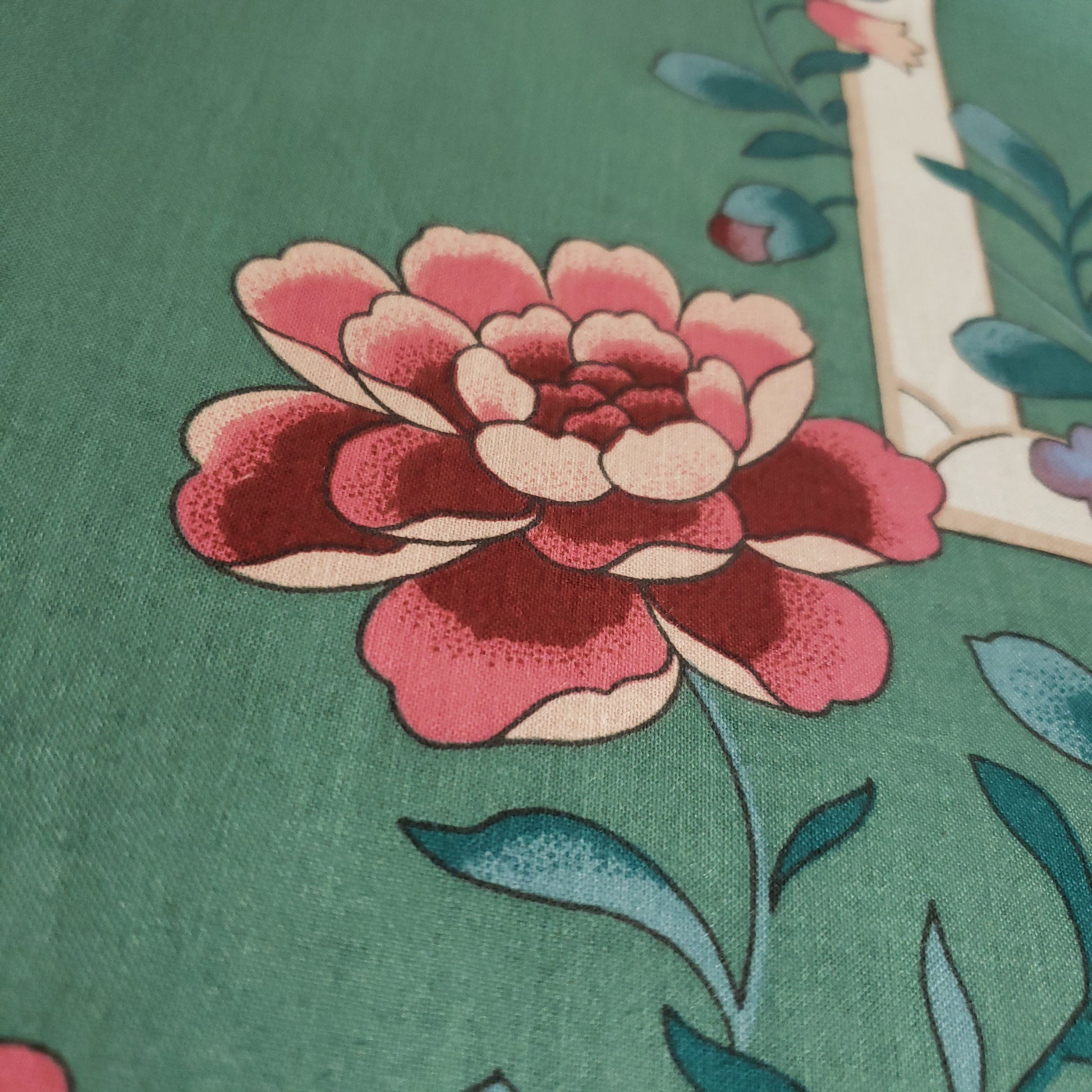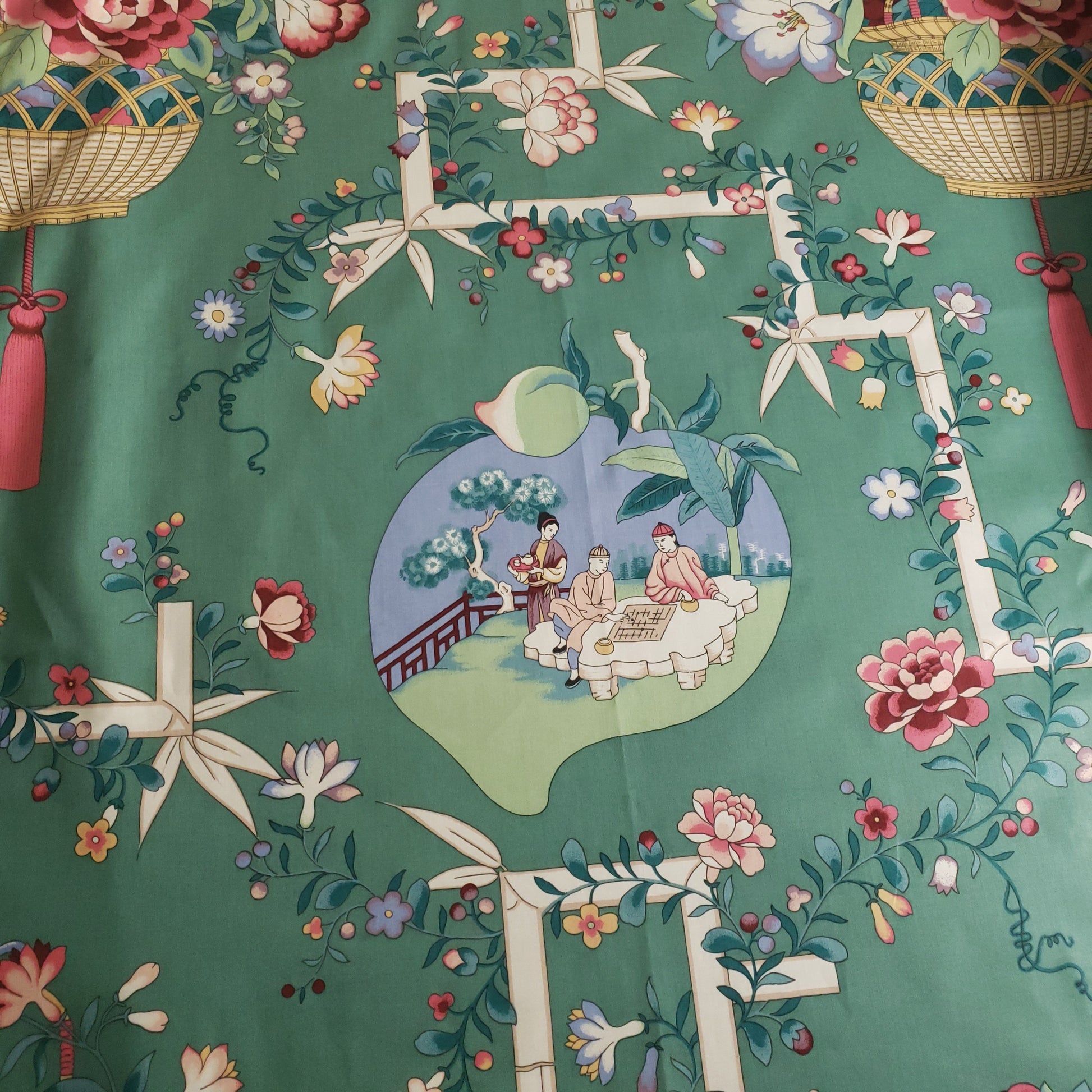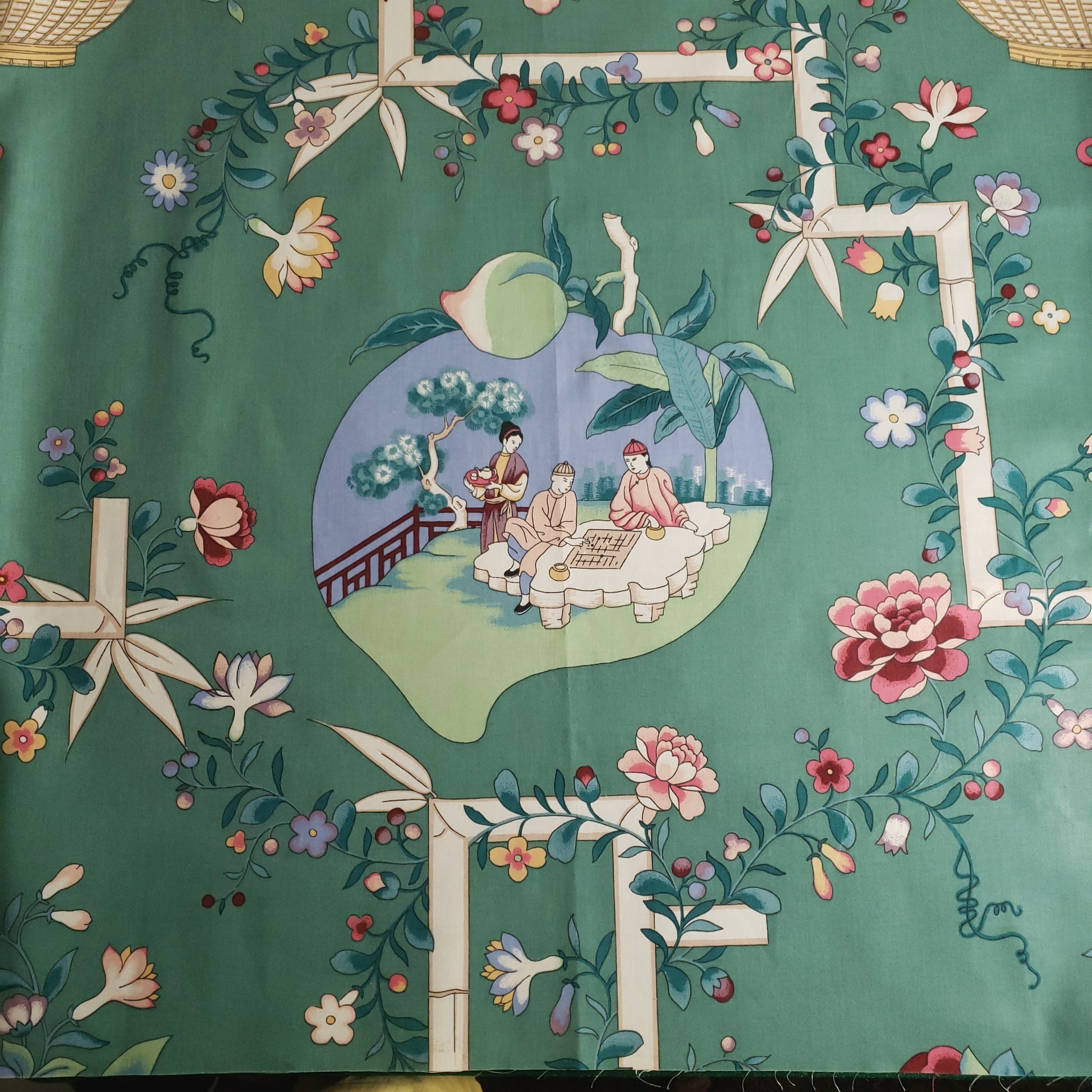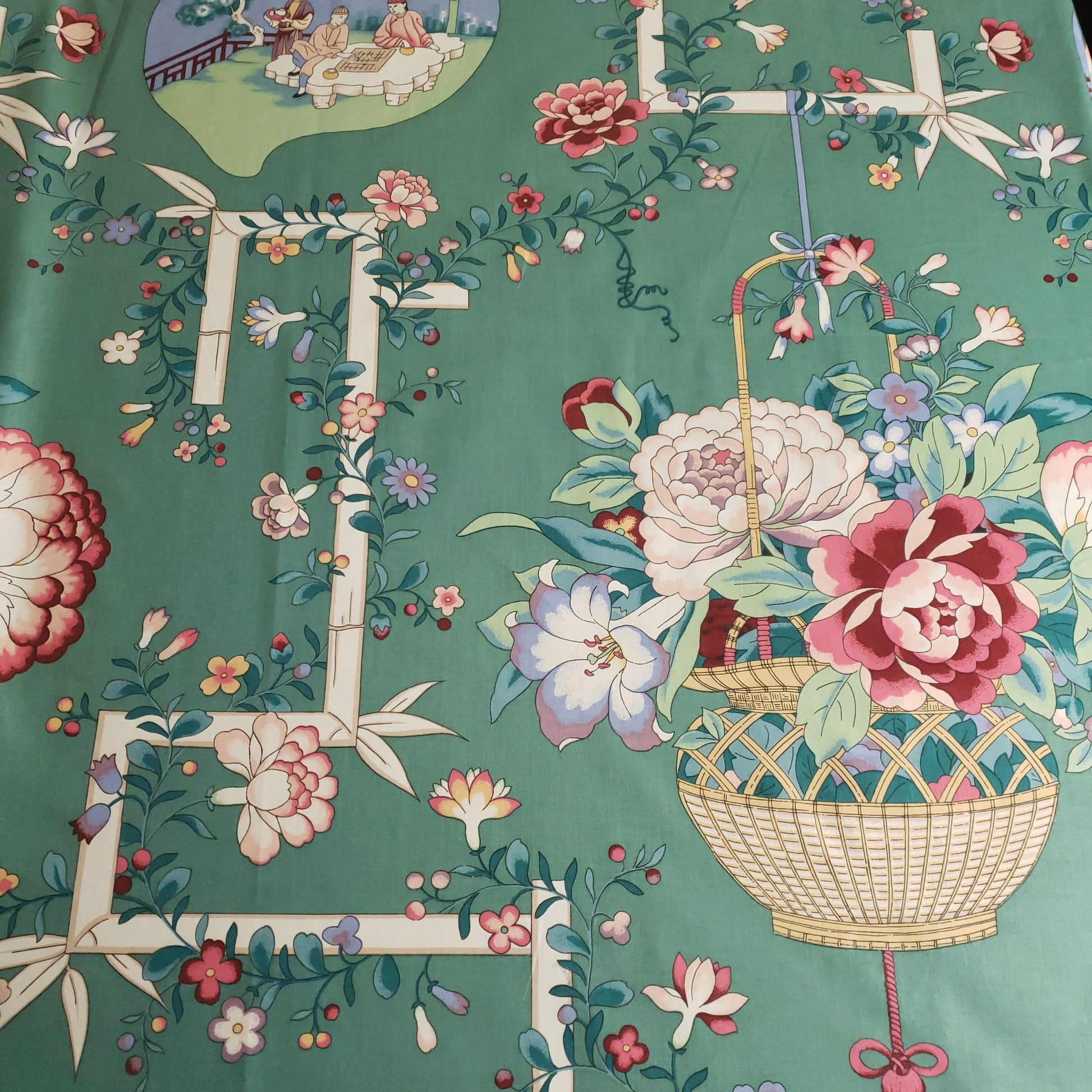 This 54-inch wide upholstery cotton features an ultra-soft texture with a subtle sheen. The Chinoiserie-style design is printed on a muted green background and includes multiple motifs: large floral bouquets in hanging baskets, a faux bamboo trellis, and detailed pictorial scenes of figures in a garden. It is suitable for upholstery, drapery, and other home decor projects.