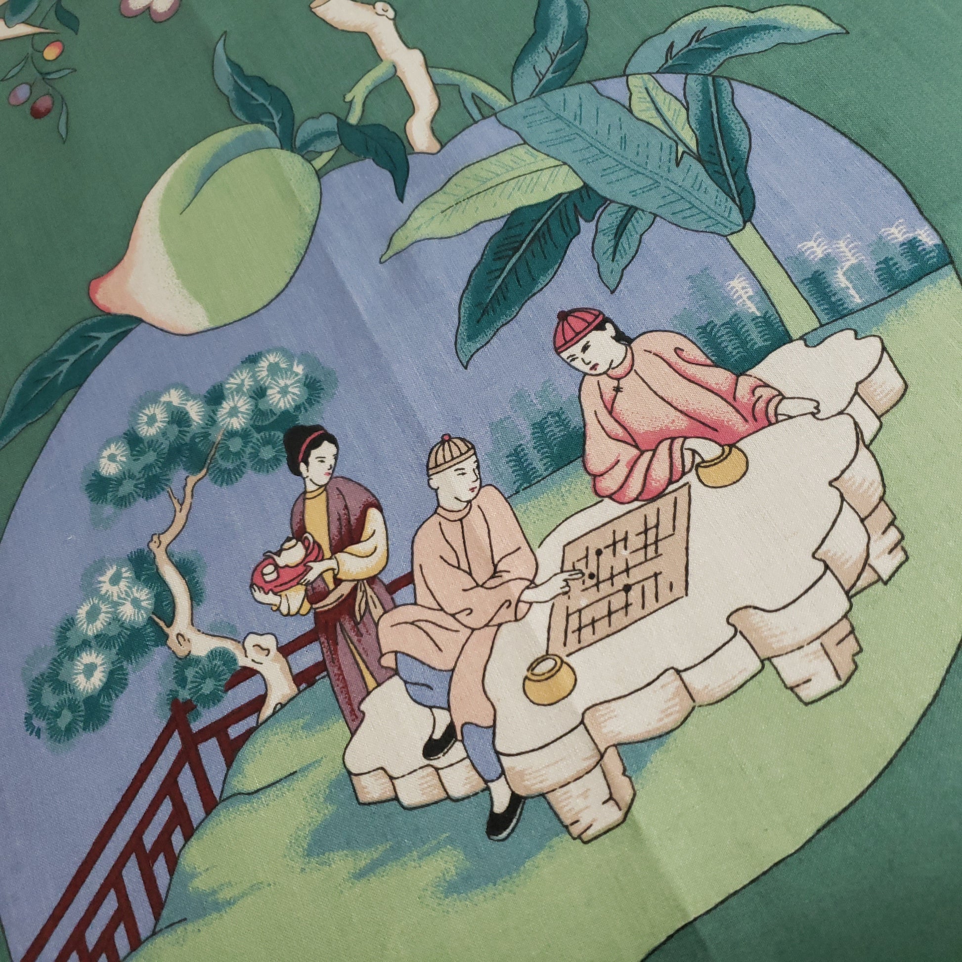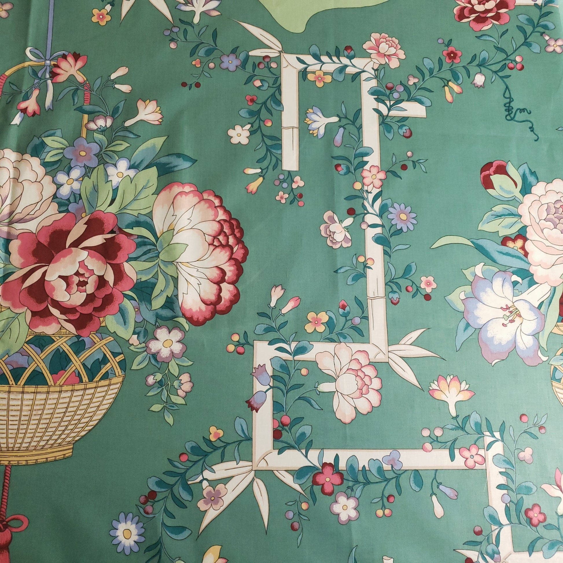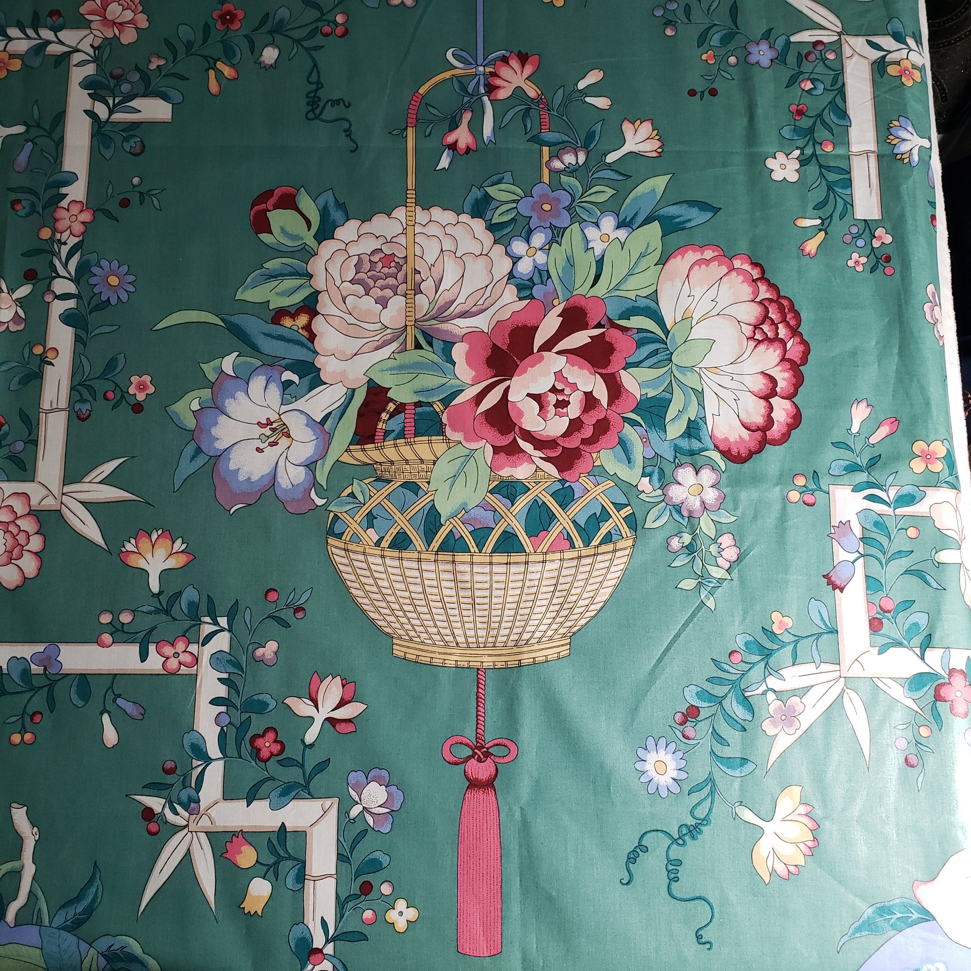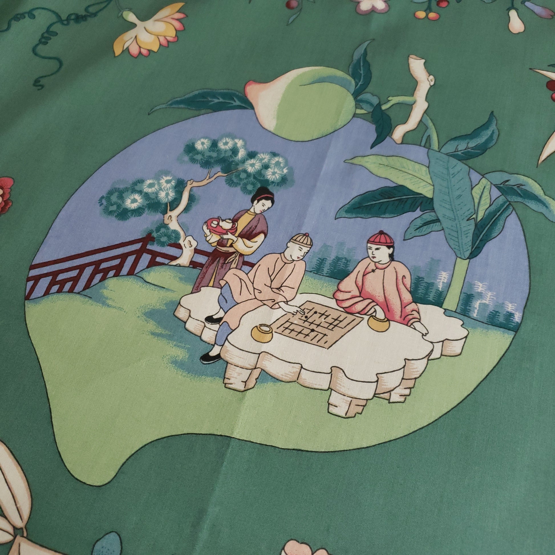 This 54-inch wide upholstery cotton features an ultra-soft texture with a subtle sheen. The Chinoiserie-style design is printed on a muted green background and includes multiple motifs: large floral bouquets in hanging baskets, a faux bamboo trellis, and detailed pictorial scenes of figures in a garden. It is suitable for upholstery, drapery, and other home decor projects.