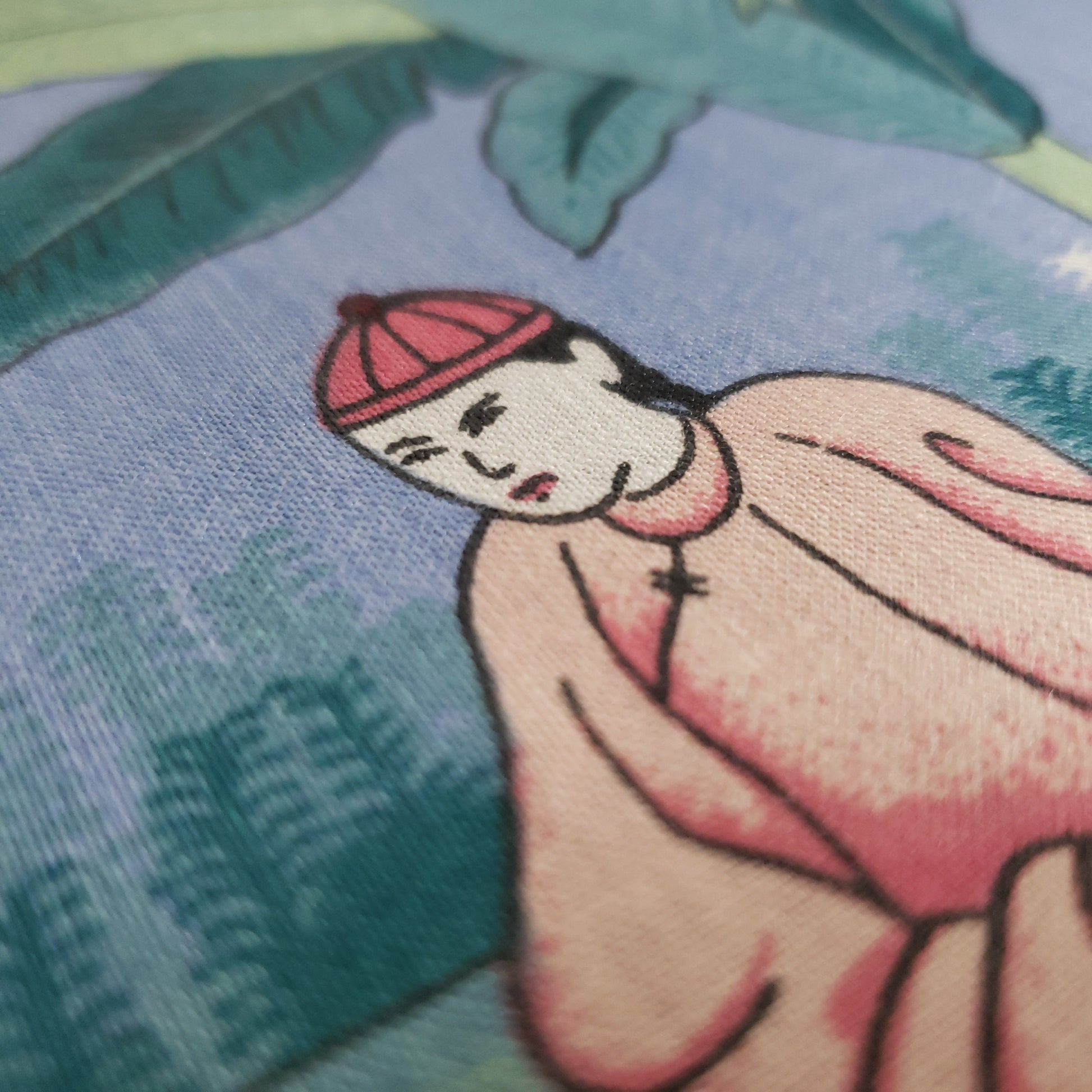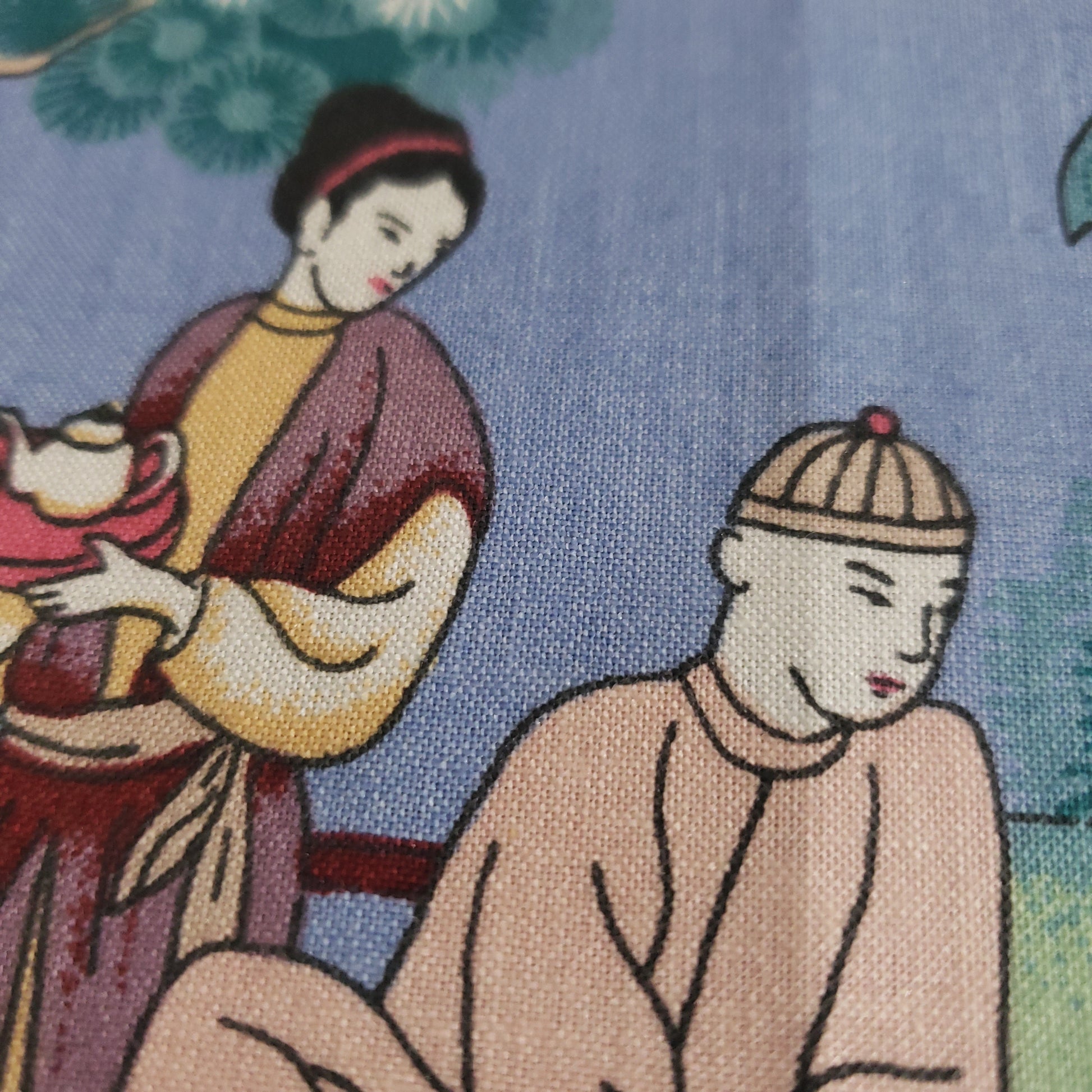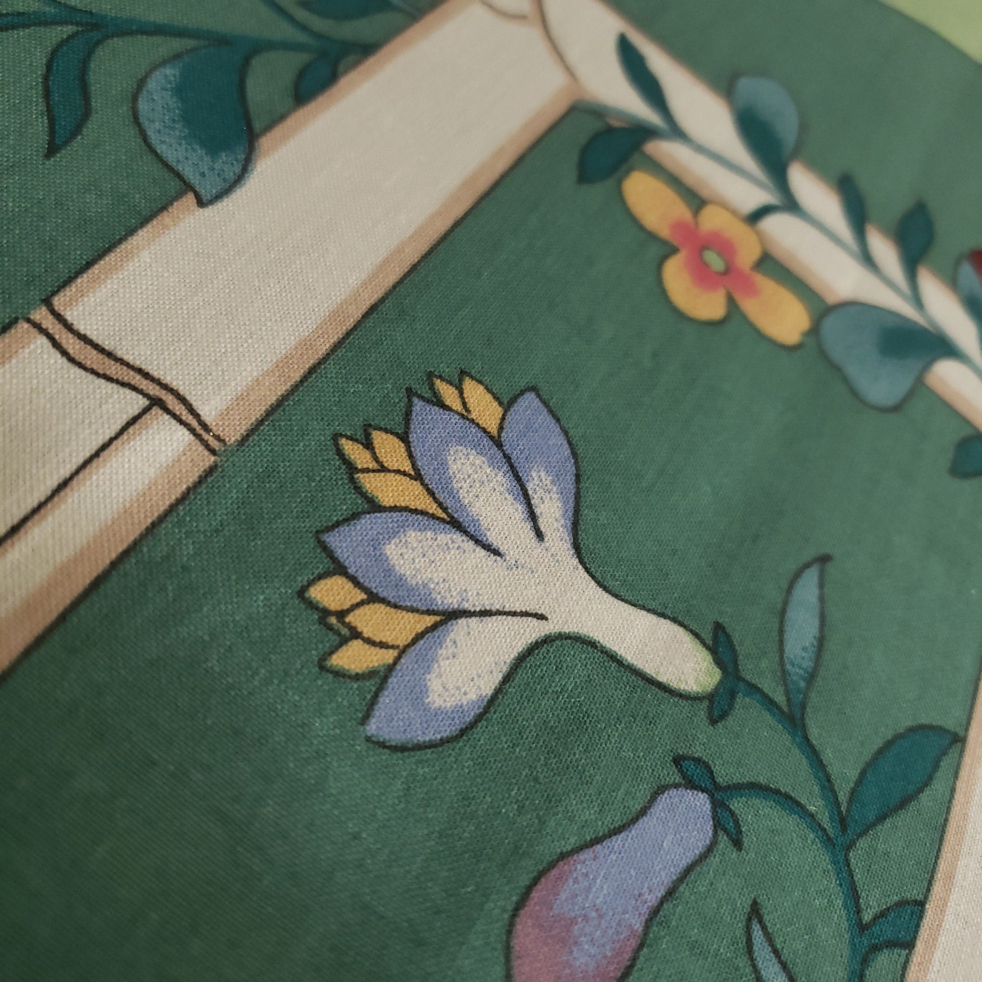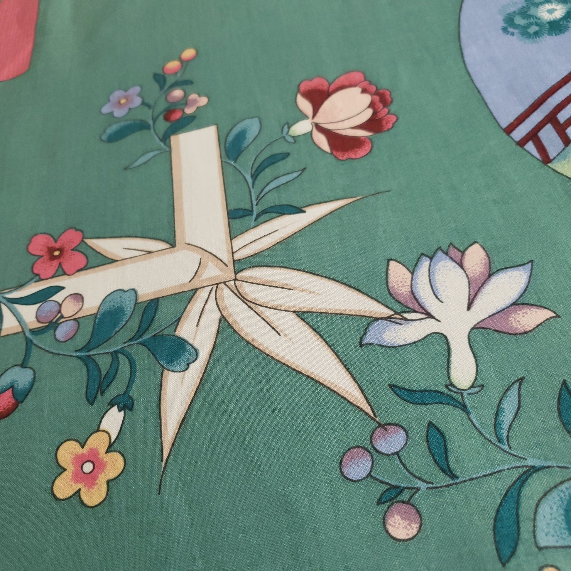 This 54-inch wide upholstery cotton features an ultra-soft texture with a subtle sheen. The Chinoiserie-style design is printed on a muted green background and includes multiple motifs: large floral bouquets in hanging baskets, a faux bamboo trellis, and detailed pictorial scenes of figures in a garden. It is suitable for upholstery, drapery, and other home decor projects.