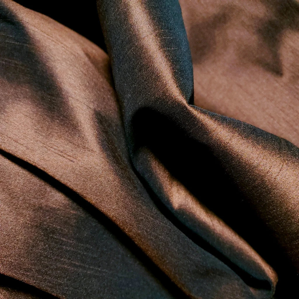 Dupioni fabric is a plain-woven fabric. Using a fine yard on the warp and an uneven yarn on the weft. This creates visual and textural raised thin stripes in the fabric. The thread used here has a subtle sheen to it. giving it a subtle color refracting iridescence.