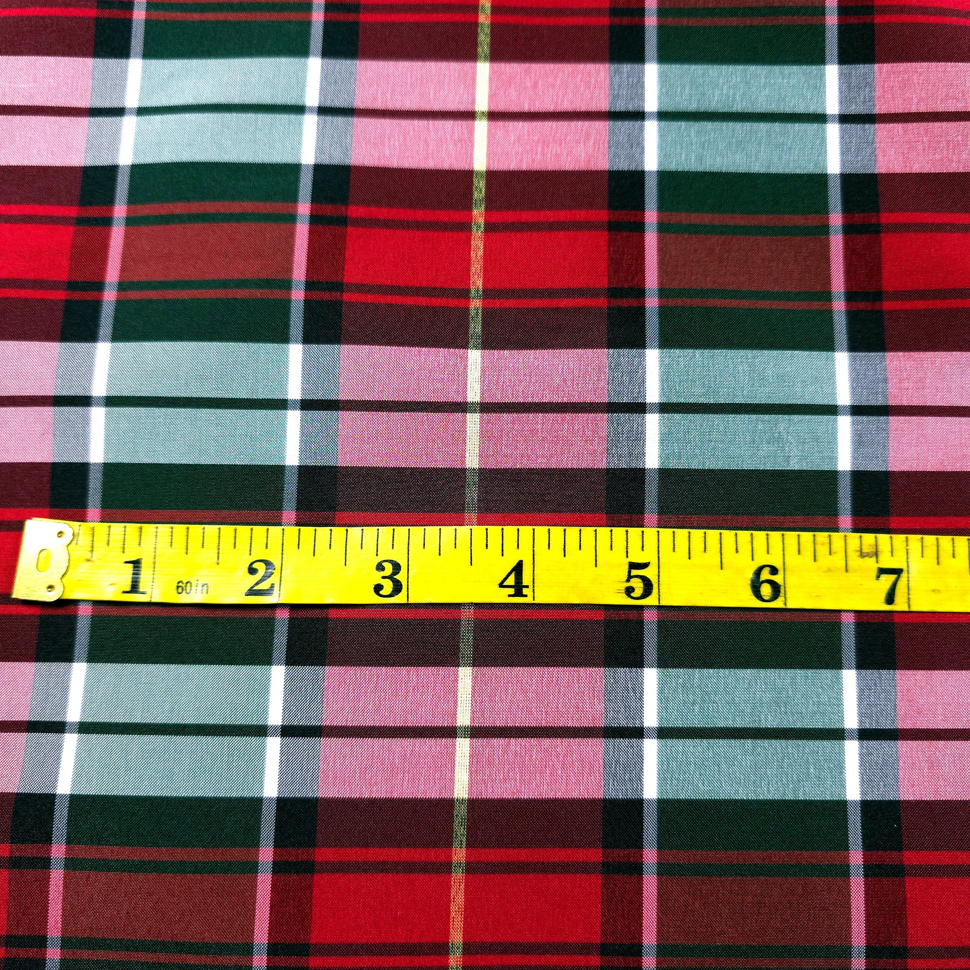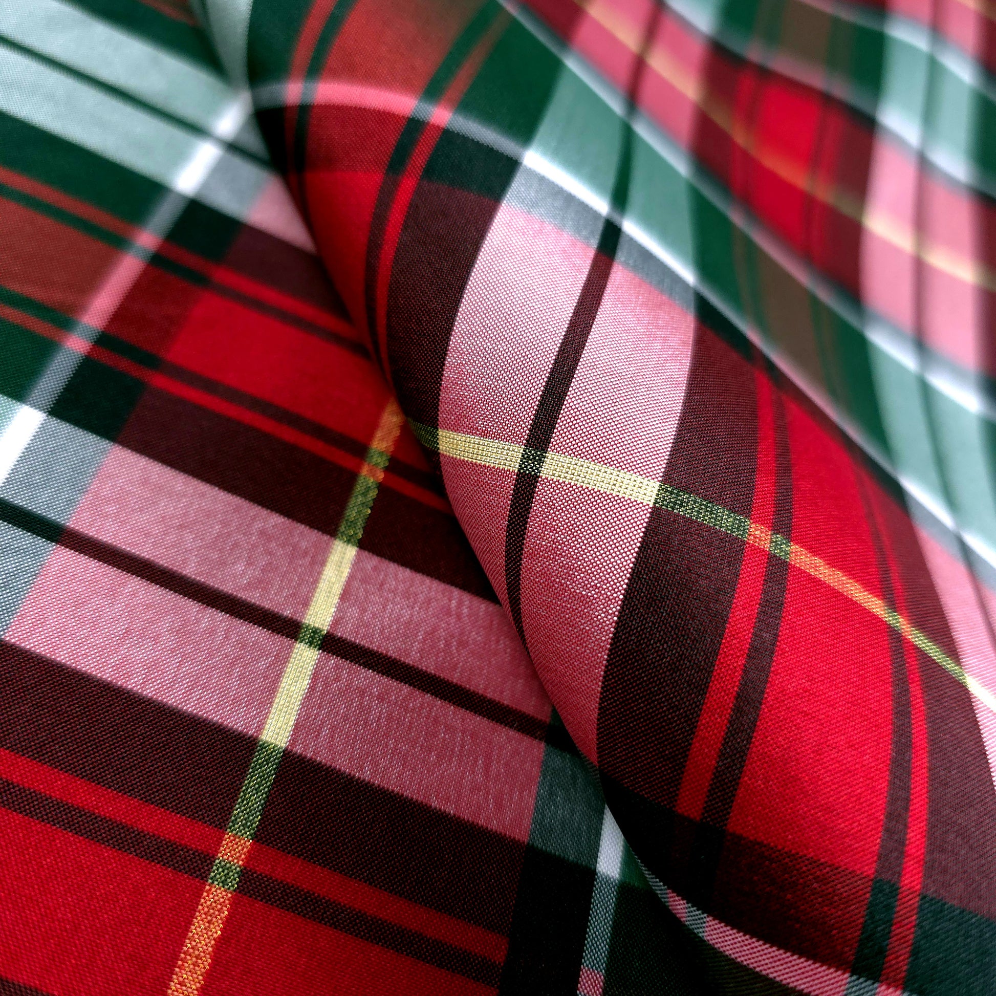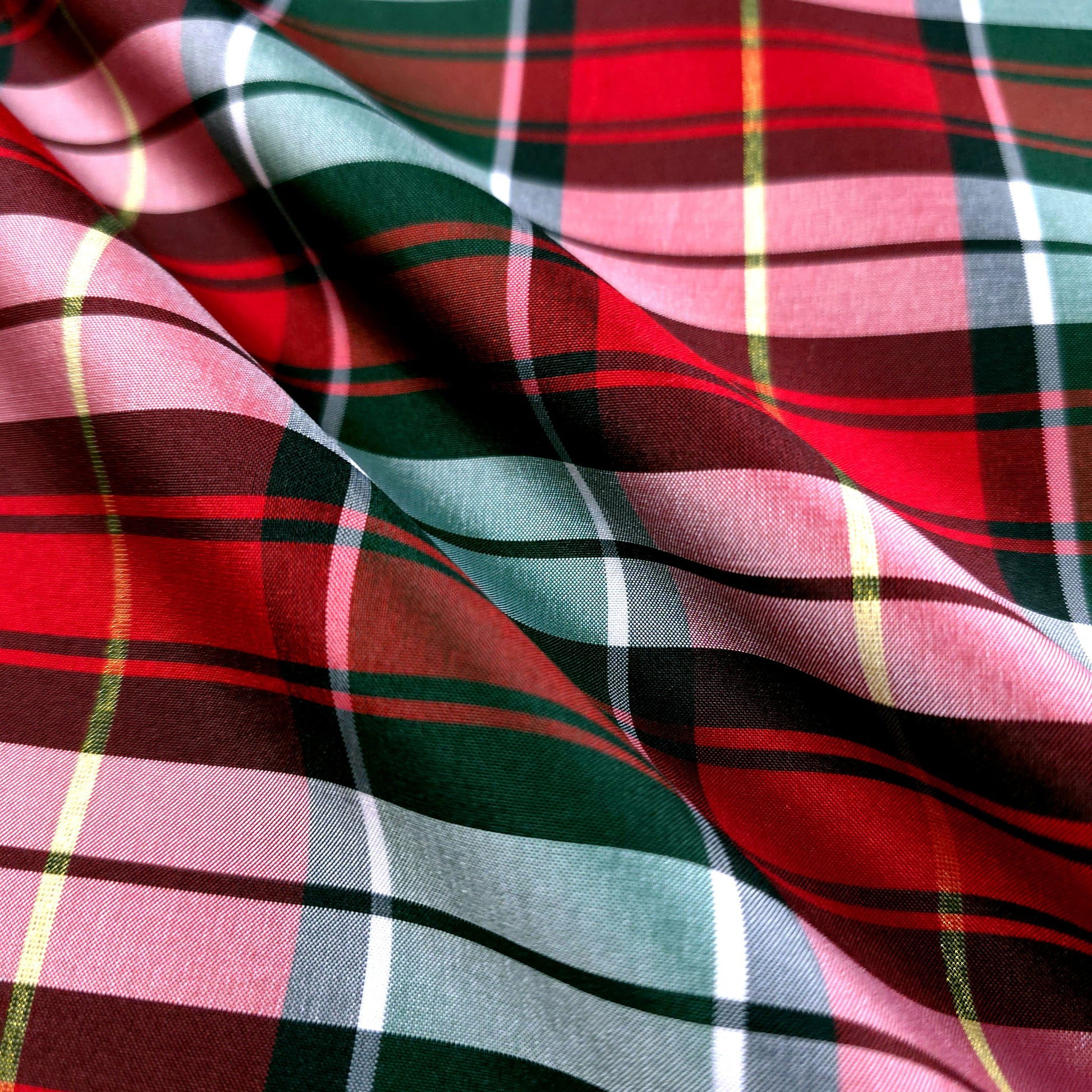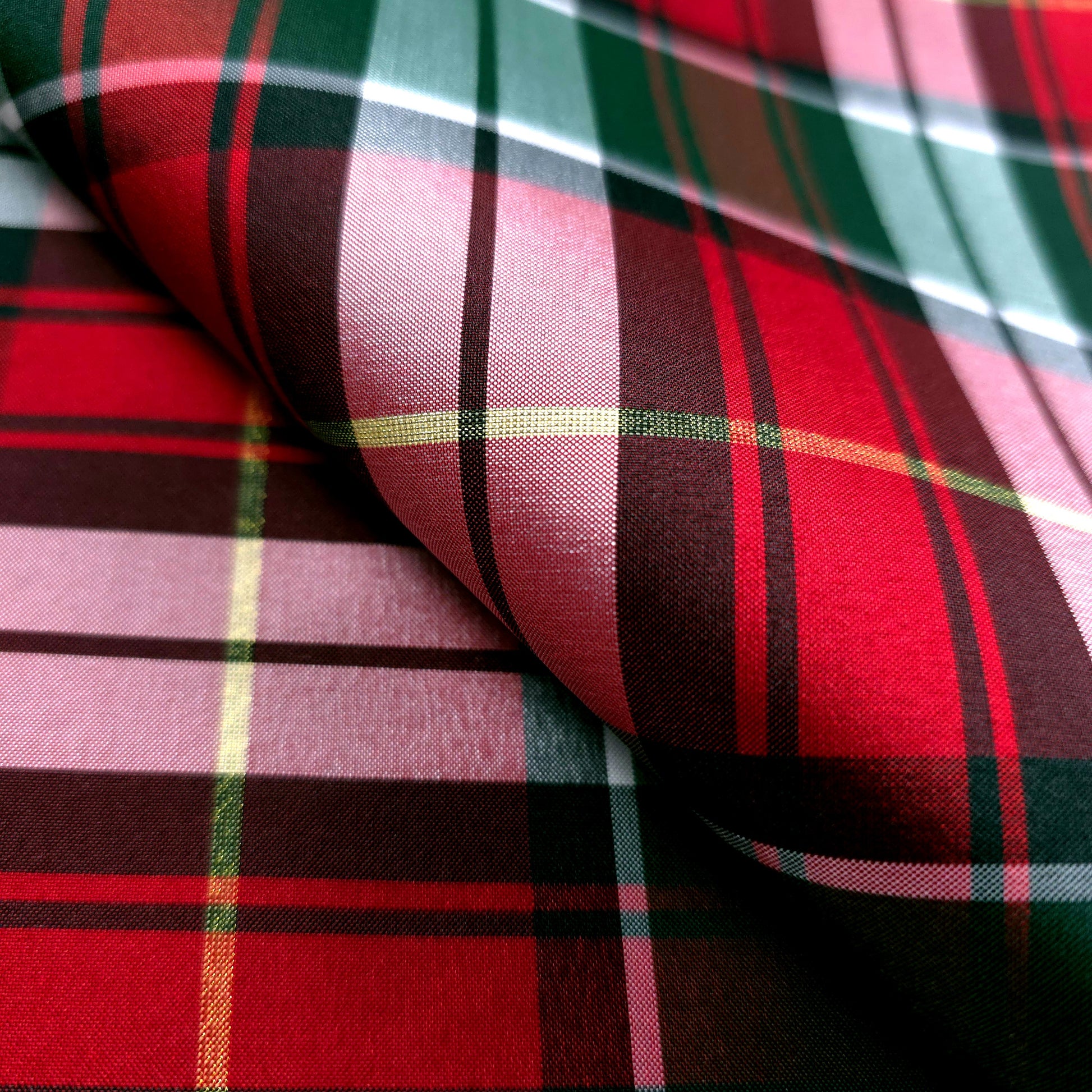 This stunning 58" wide tartan plaid taffeta features a vibrant design in classic hunter green, rich red, crisp white, and deep black, this fabric is beautifully accented by a semi-metallic gold stripe that adds a delightful pop of character and festive sparkle. Resembling a medium-weight dress taffeta, it boasts a very crisp nature that tends to billow gracefully when gathered, offering a luxurious and voluminous effect. An added bonus: the fabric print is fully reversible, providing even more versatility for your projects.
