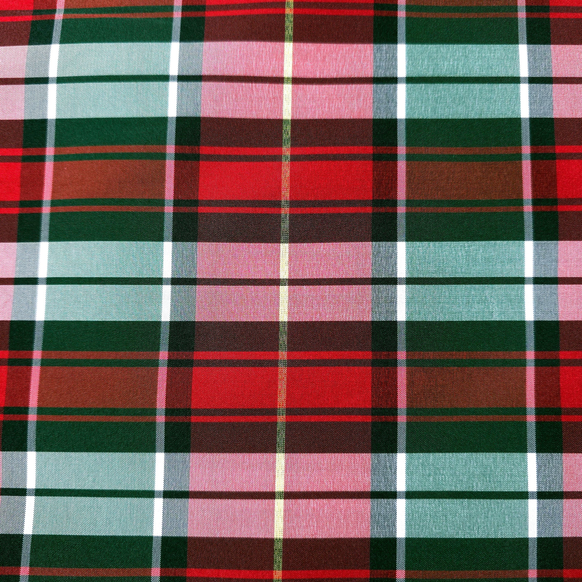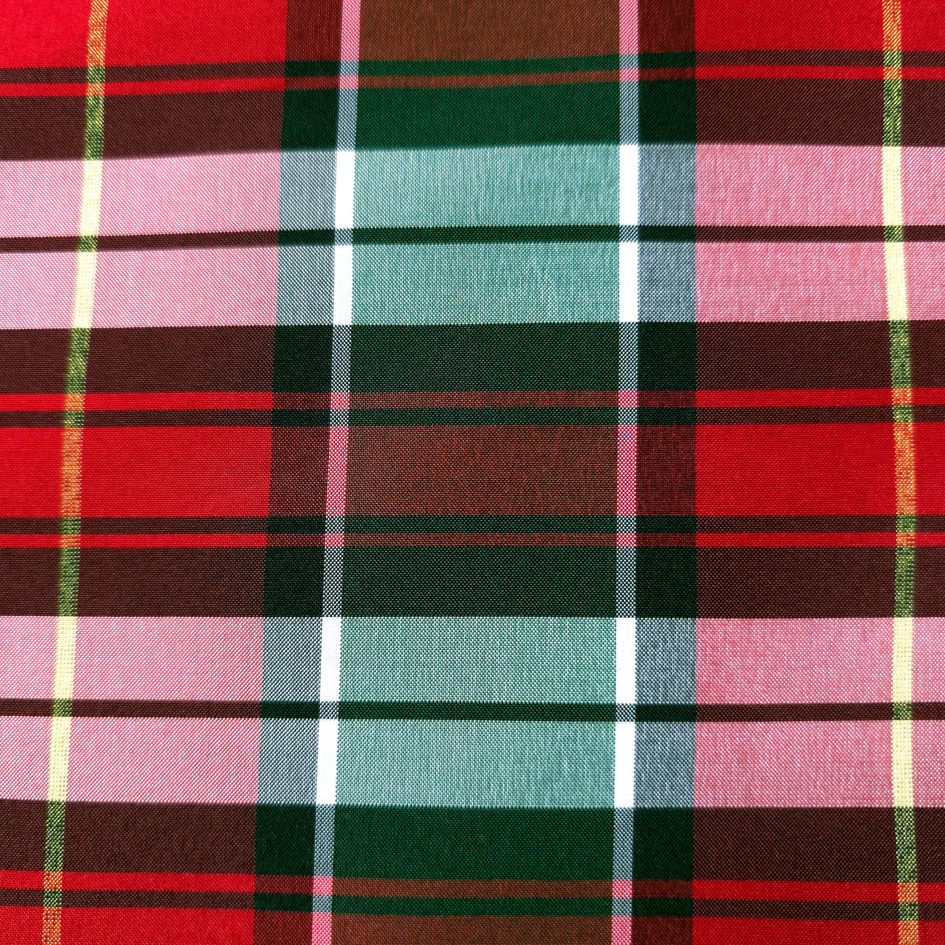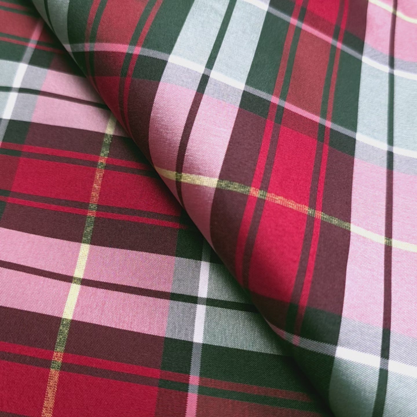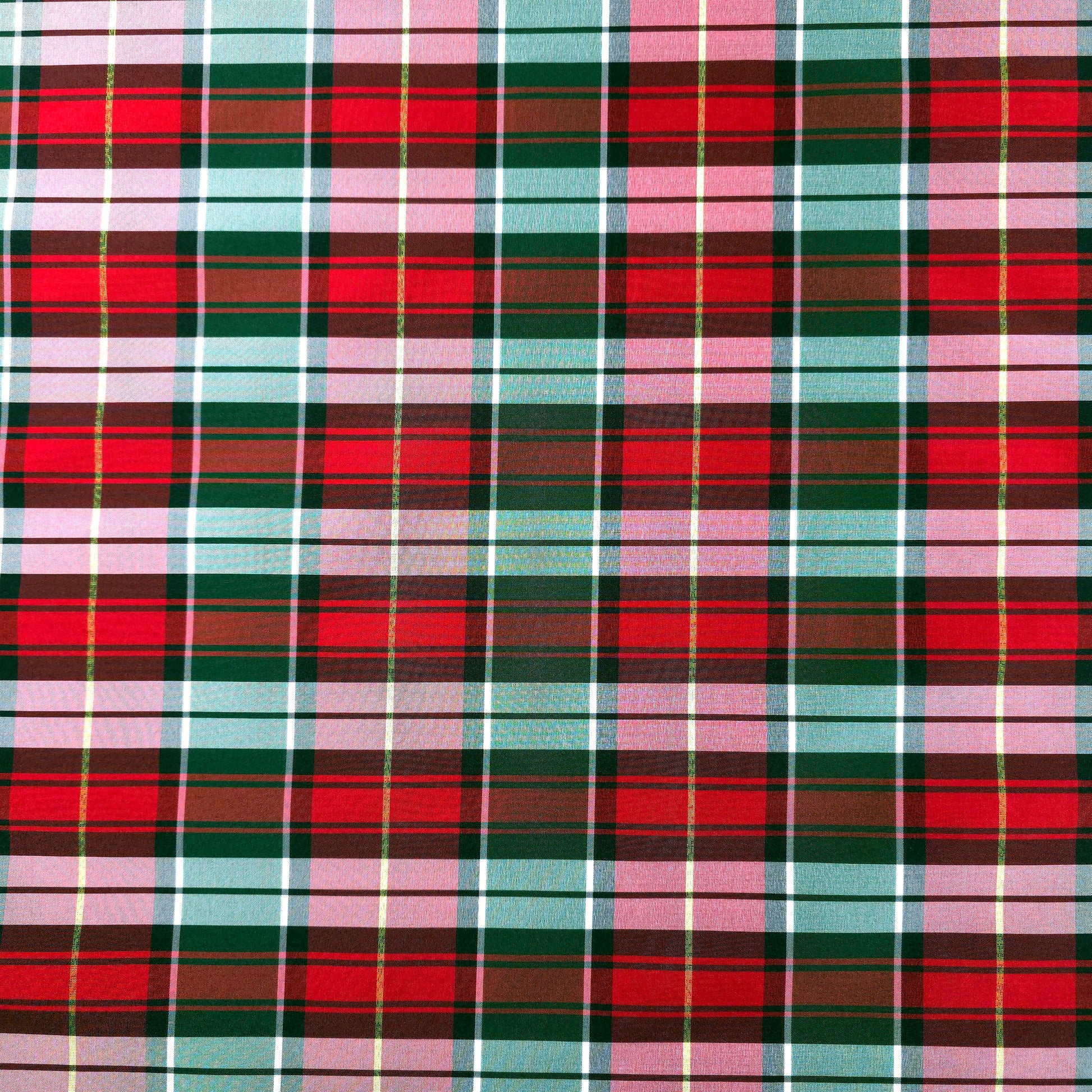 This stunning 58" wide tartan plaid taffeta features a vibrant design in classic hunter green, rich red, crisp white, and deep black, this fabric is beautifully accented by a semi-metallic gold stripe that adds a delightful pop of character and festive sparkle. Resembling a medium-weight dress taffeta, it boasts a very crisp nature that tends to billow gracefully when gathered, offering a luxurious and voluminous effect. An added bonus: the fabric print is fully reversible, providing even more versatility for your projects.