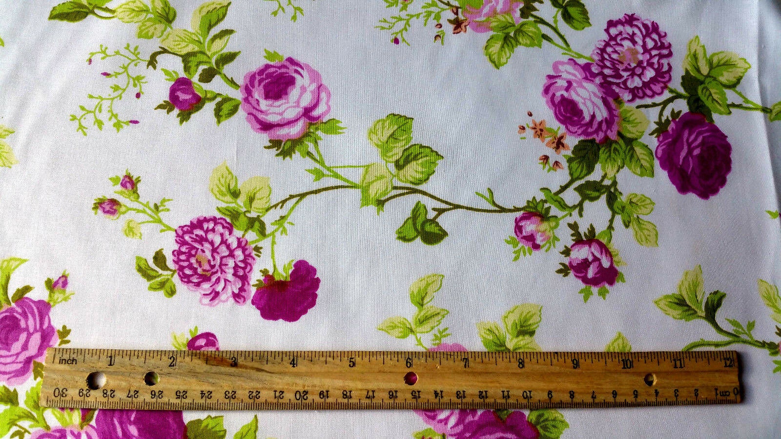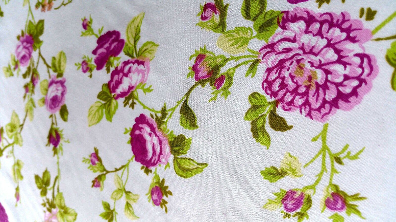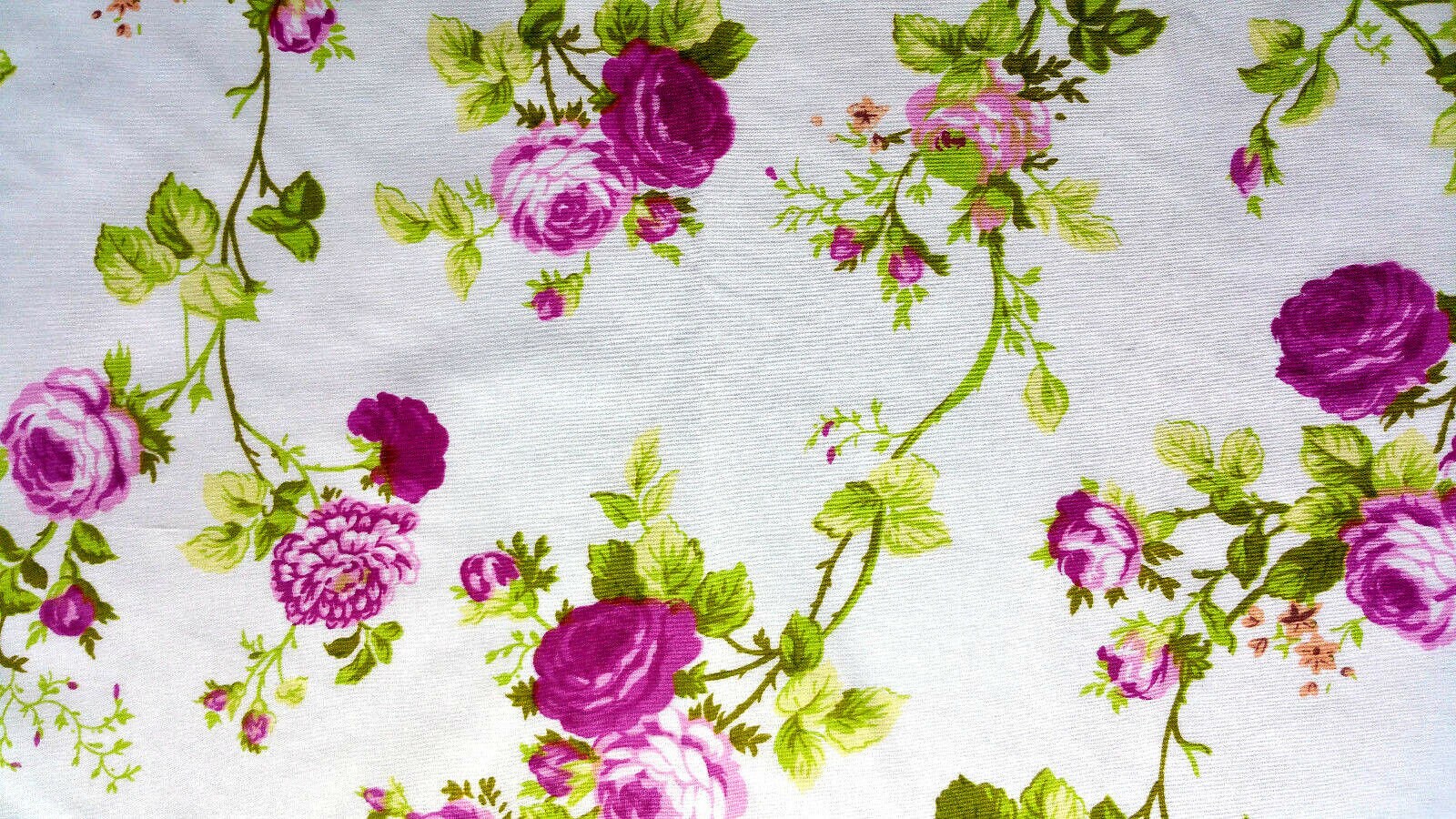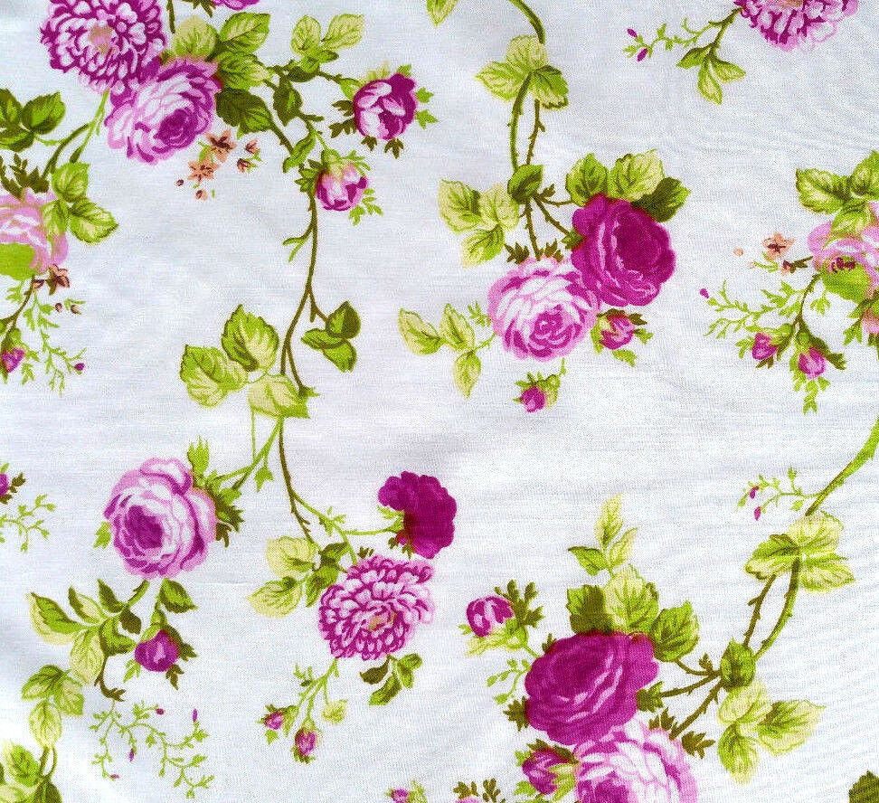 This fabric showcases vibrant pink vine roses accompanied by green leaves set against a crisp white backdrop. Crafted from a lightweight blend of 50% cotton and 50% polyester, it offers durability and wrinkle resistance, making it ideal for various sewing projects.