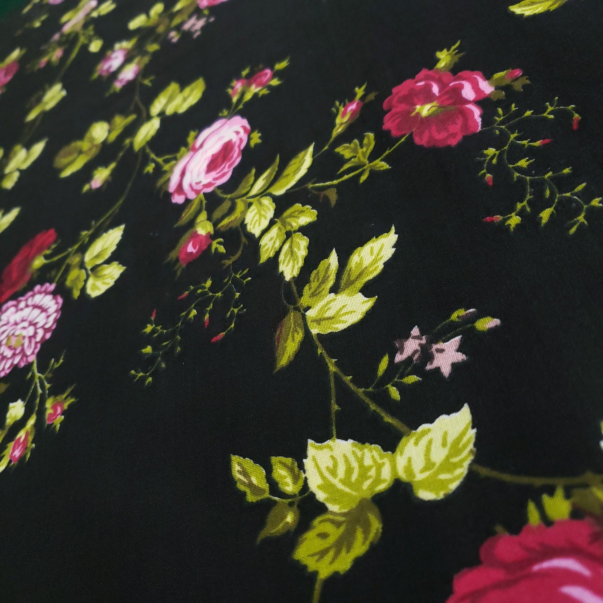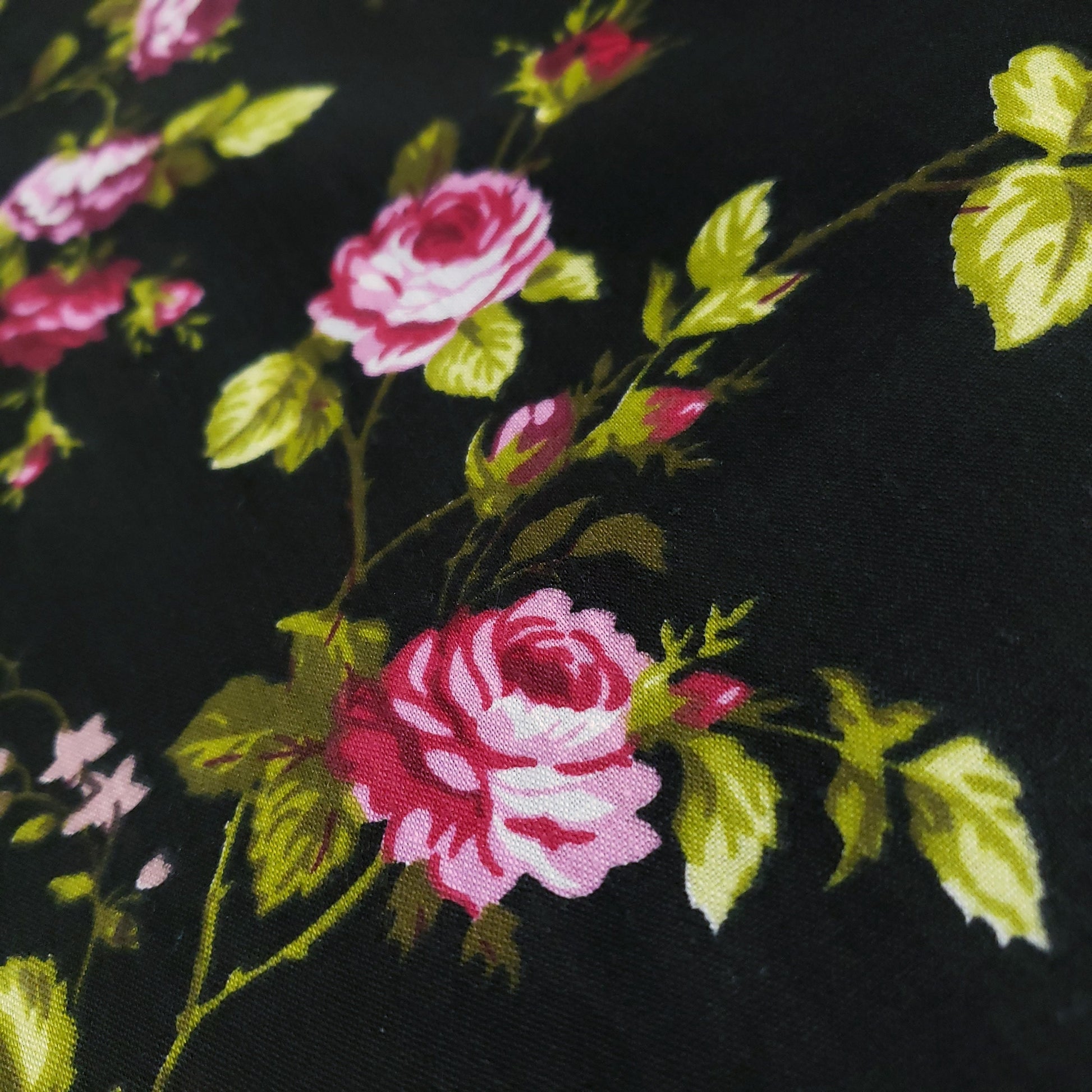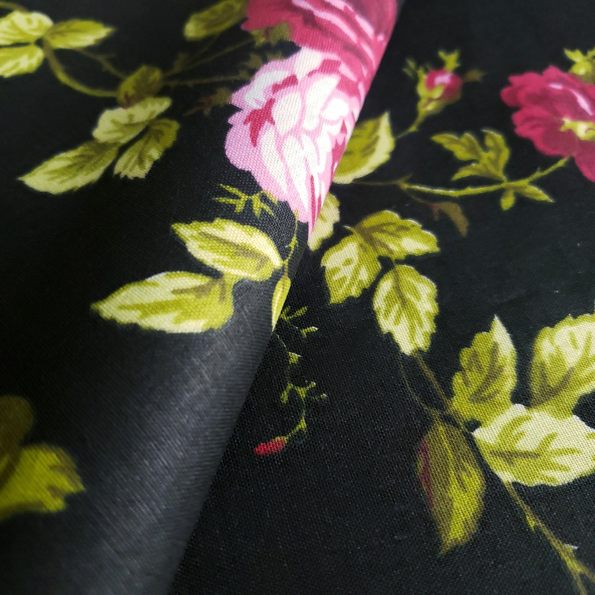 This fabric showcases elegant vine-stemmed roses in rich ruby red accompanied by green leaves set against a striking black backdrop. Crafted from a lightweight blend of 50% cotton and 50% polyester, it offers durability and wrinkle resistance, making it ideal for various sewing projects.