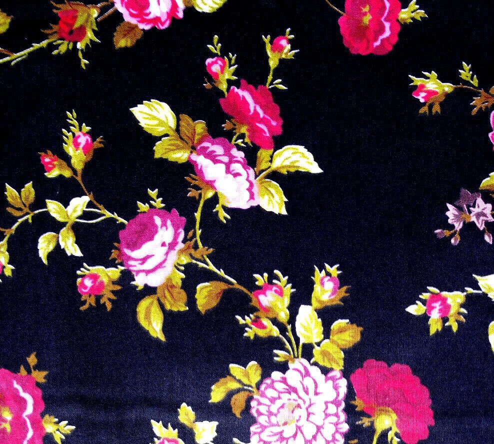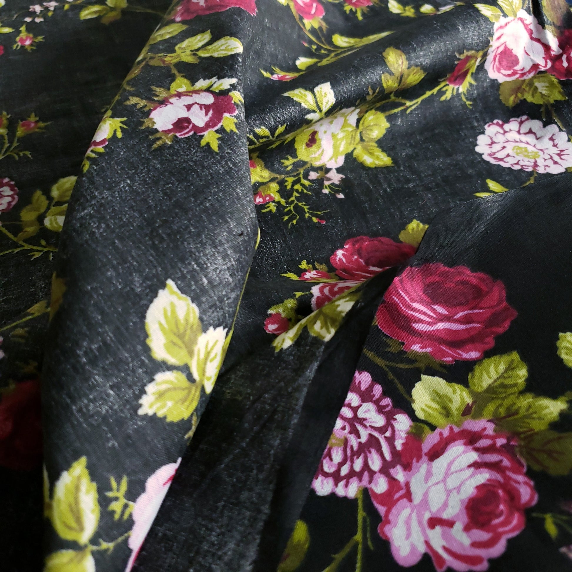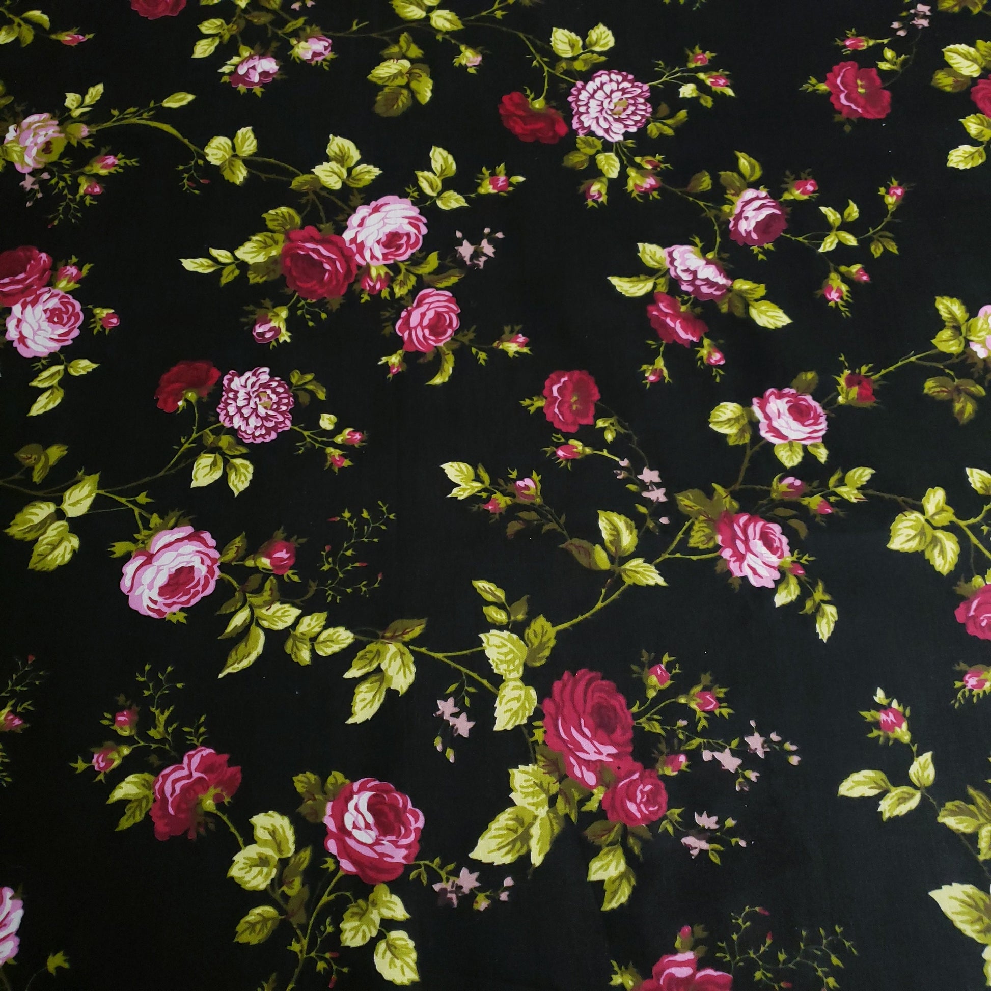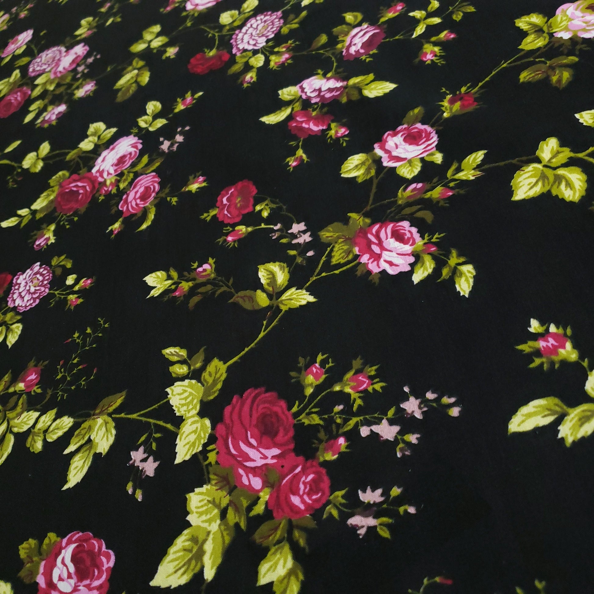 This fabric showcases elegant vine-stemmed roses in rich ruby red accompanied by green leaves set against a striking black backdrop. Crafted from a lightweight blend of 50% cotton and 50% polyester, it offers durability and wrinkle resistance, making it ideal for various sewing projects.