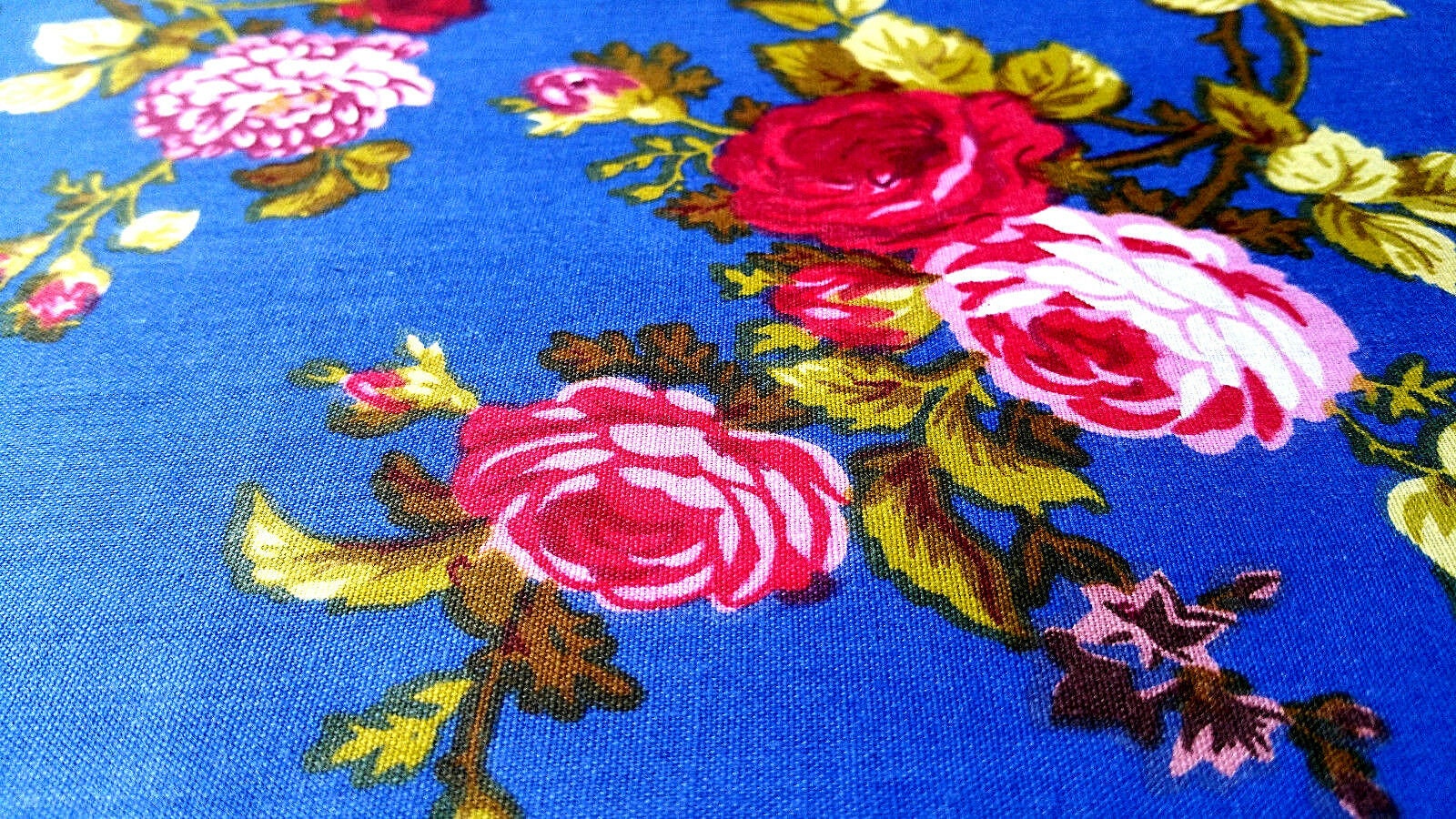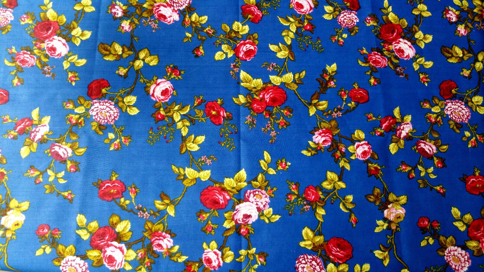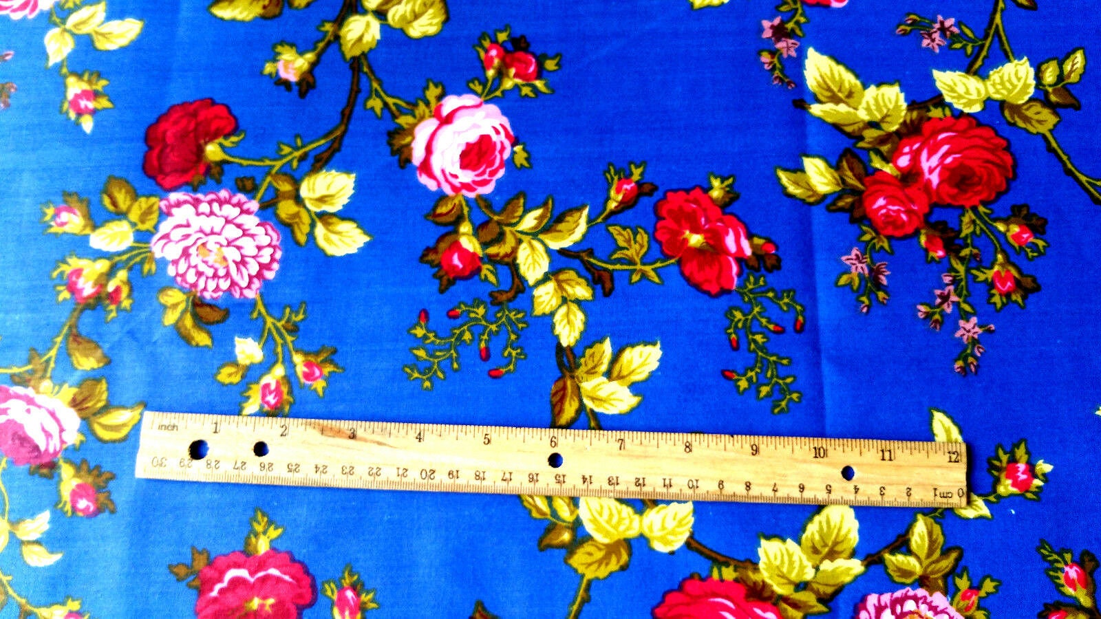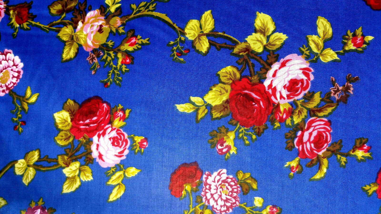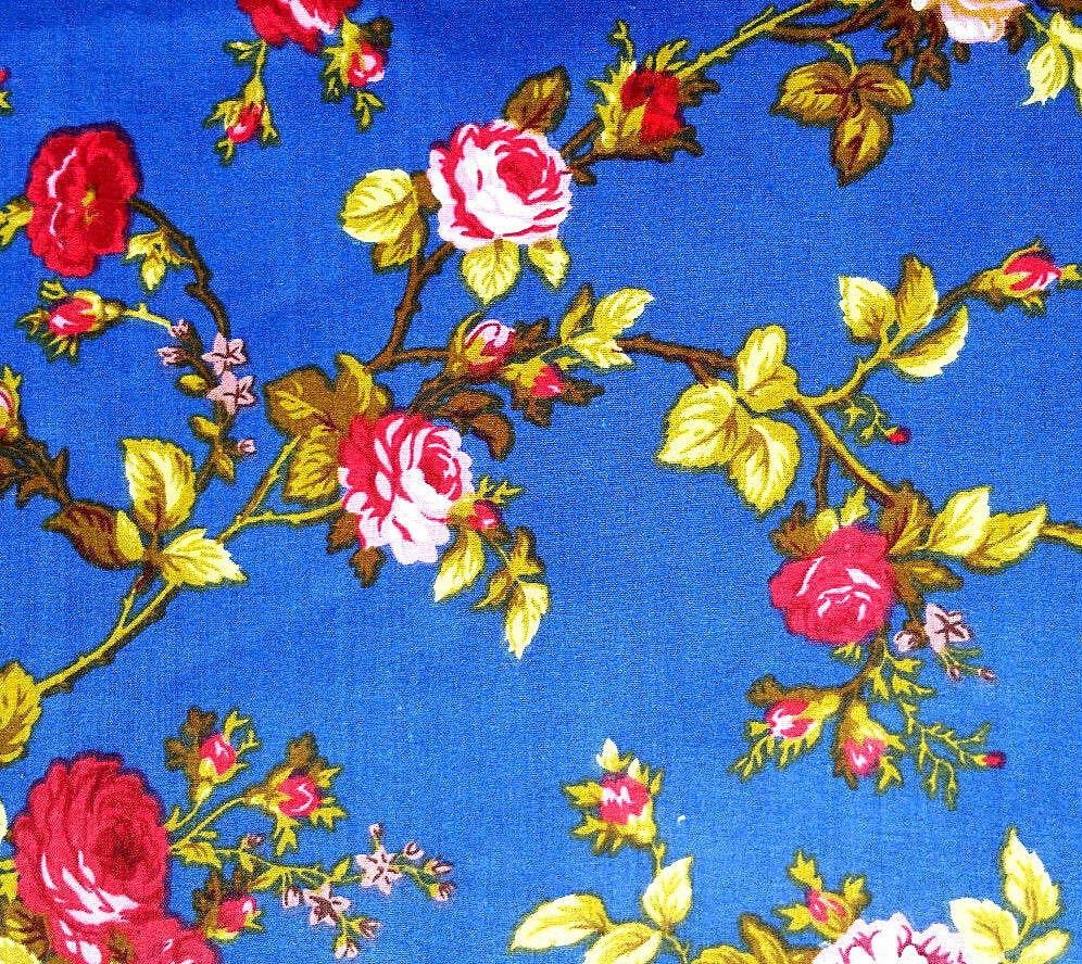 This fabric showcases elegant vine stem roses in ruby red accompanied by green leaves set against a striking royal blue backdrop. Crafted from a lightweight cotton blend, it consists of 50% cotton and 50% polyester, providing wrinkle resistance for easy care and durability.