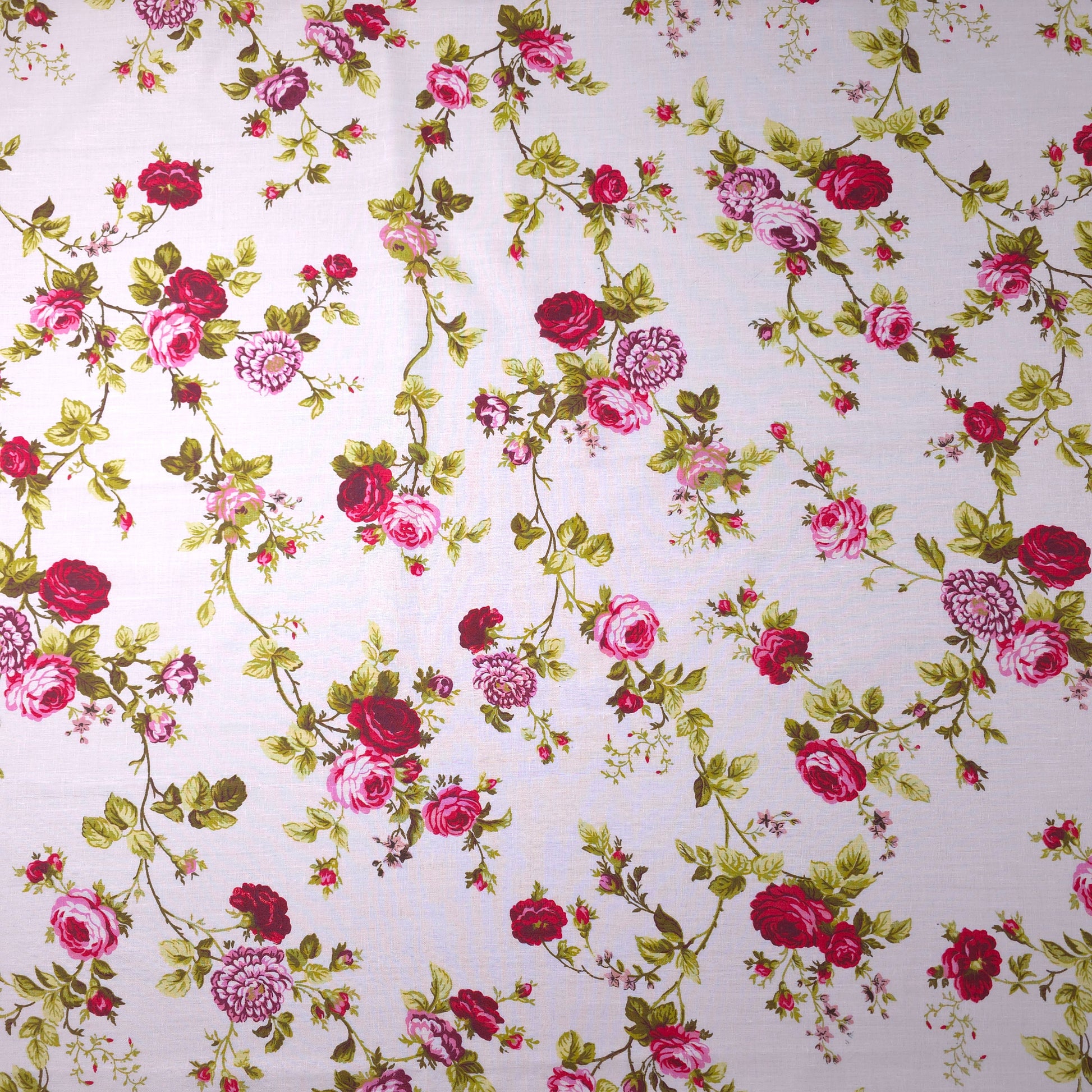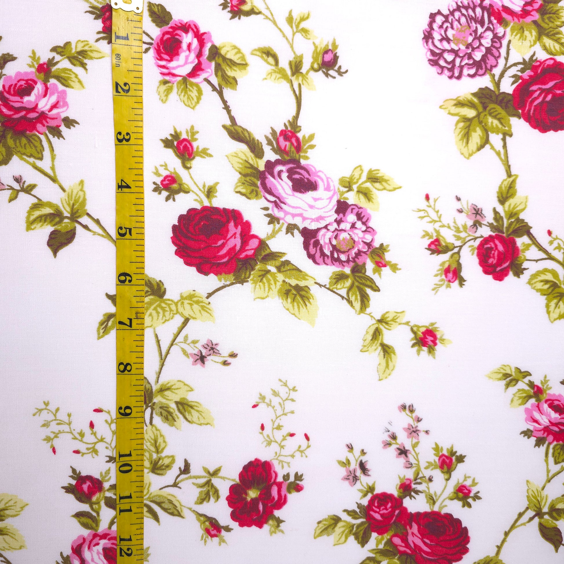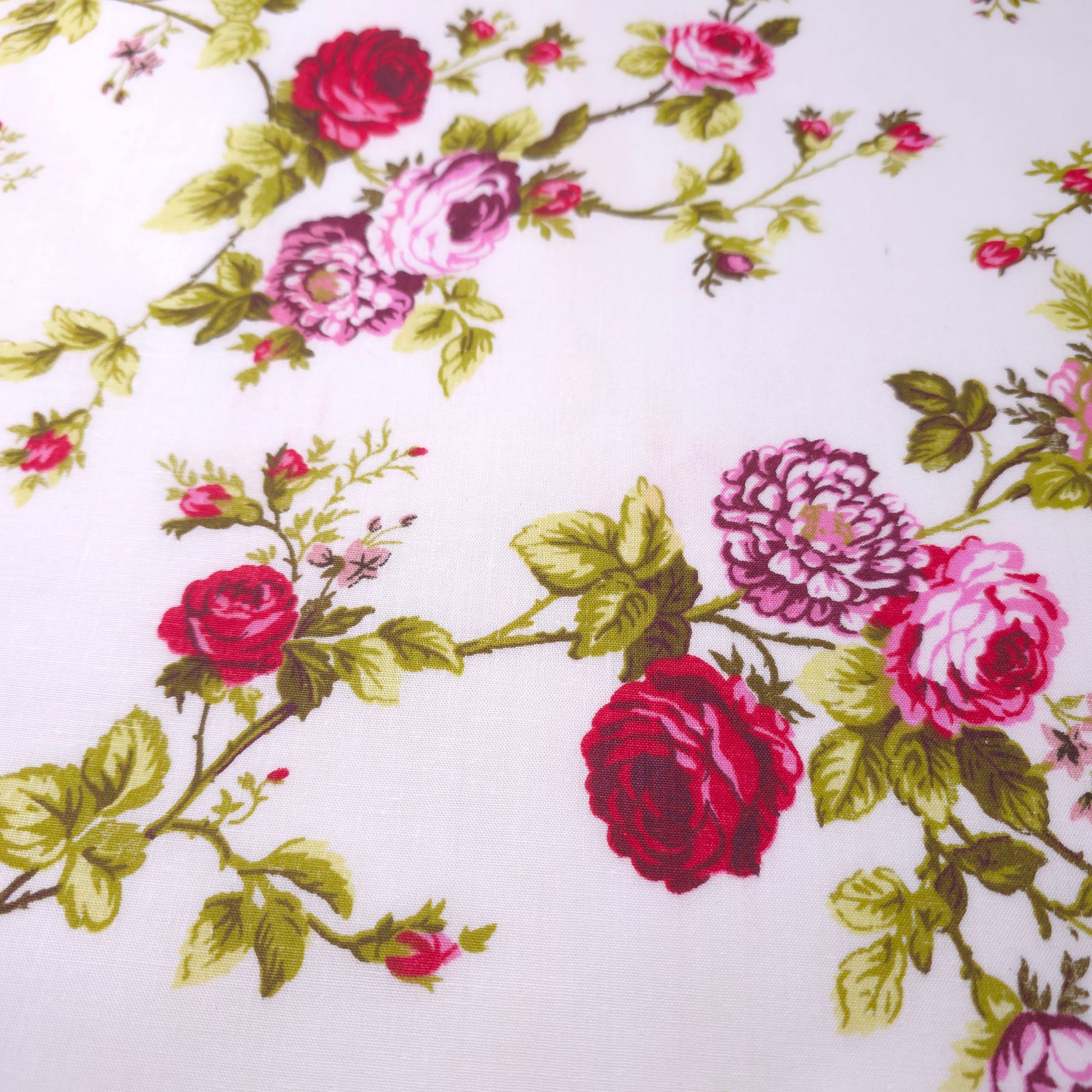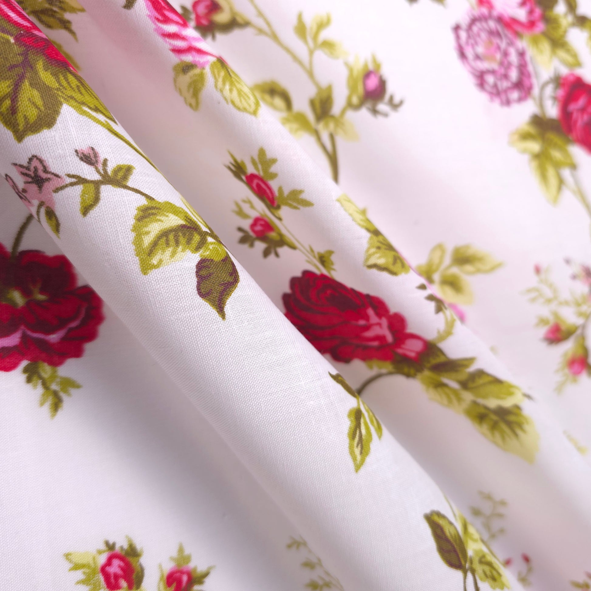 This fabric displays elegant vine-stemmed roses in vibrant ruby red accompanied by green leaves set against a clean white background. Made from a lightweight blend of 50% cotton and 50% polyester, it offers both comfort and durability while resisting wrinkles for easy care.