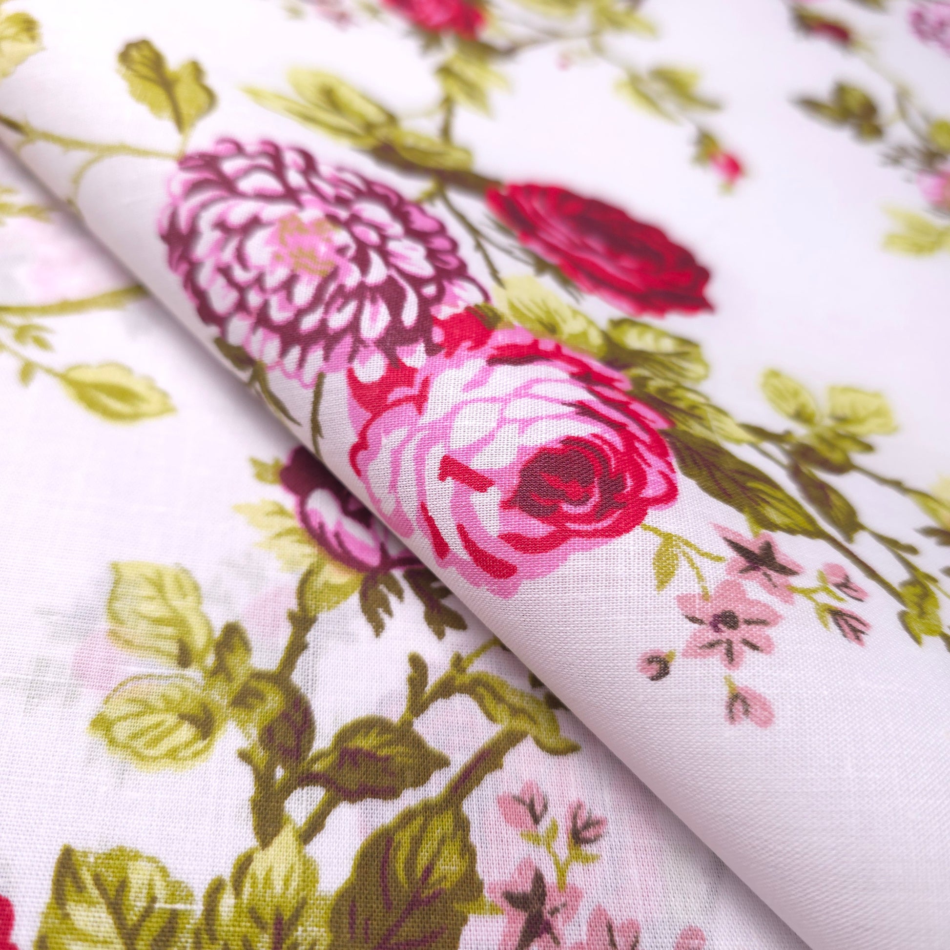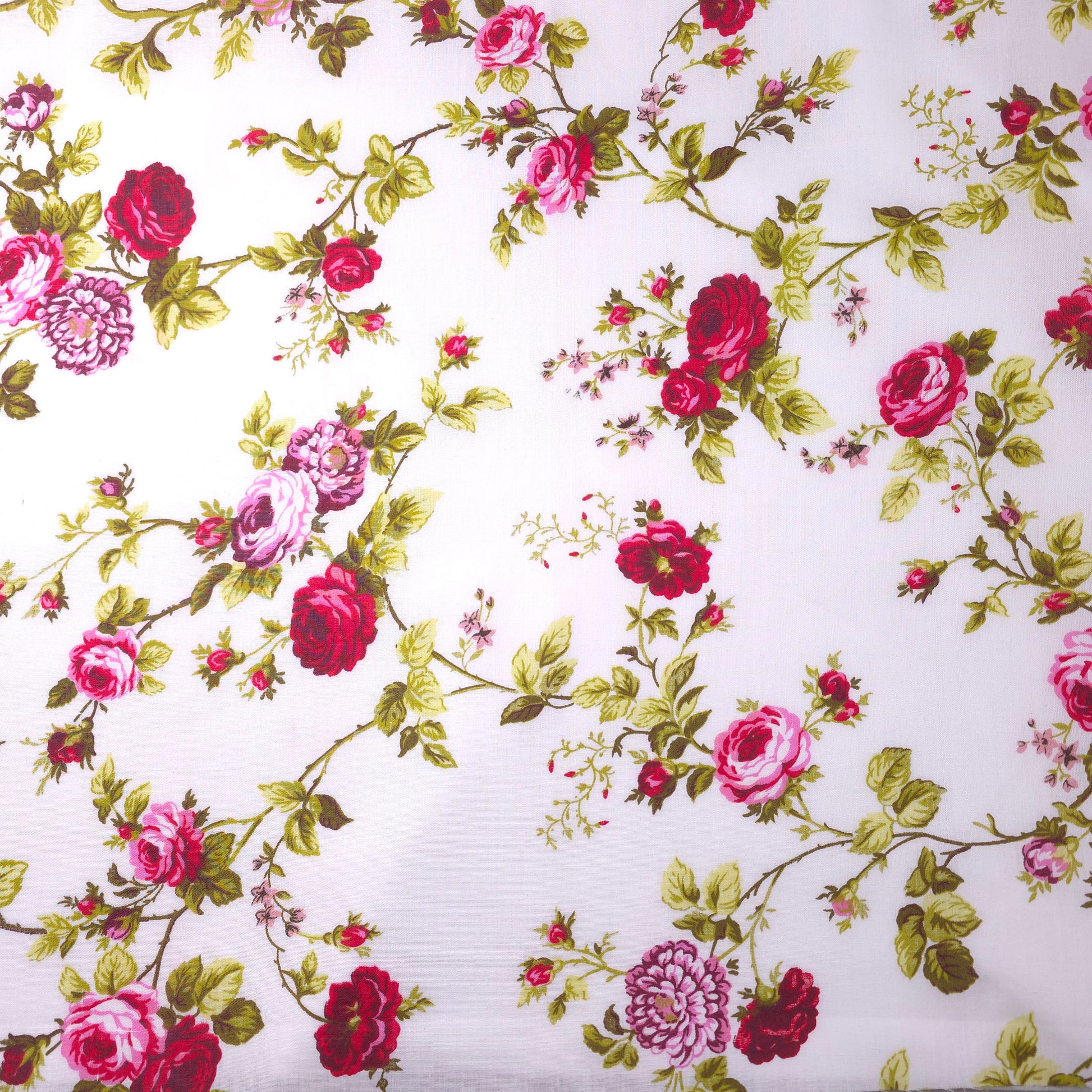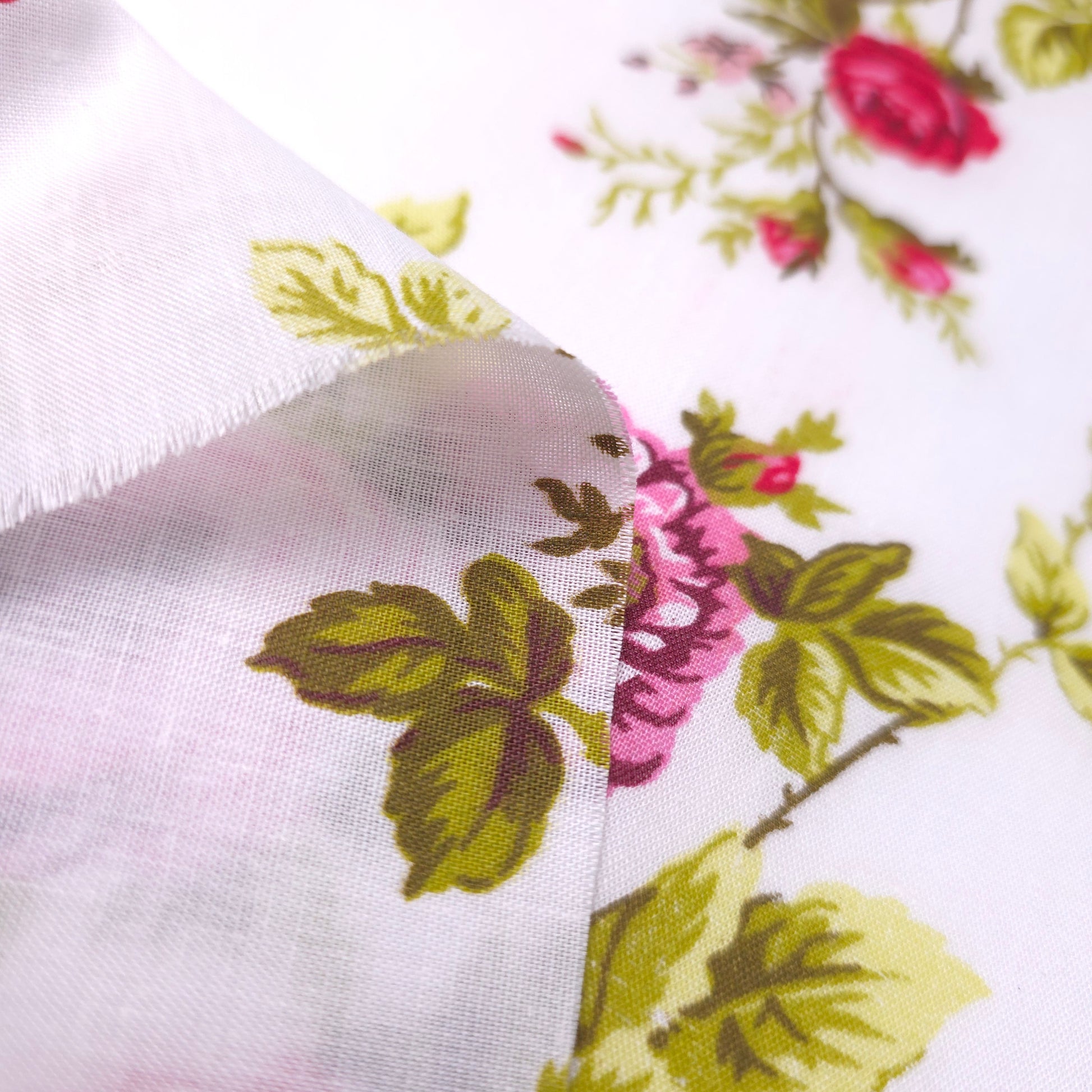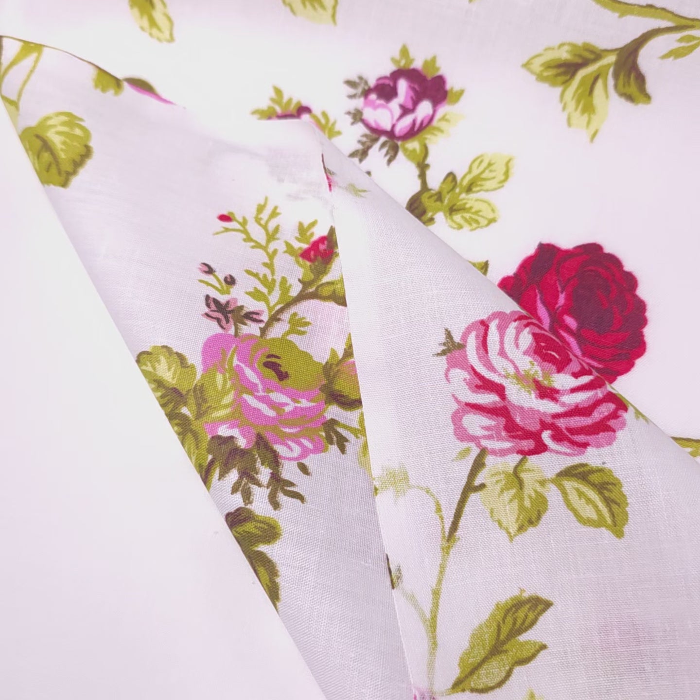 This fabric displays elegant vine-stemmed roses in vibrant ruby red accompanied by green leaves set against a clean white background. Made from a lightweight blend of 50% cotton and 50% polyester, it offers both comfort and durability while resisting wrinkles for easy care.