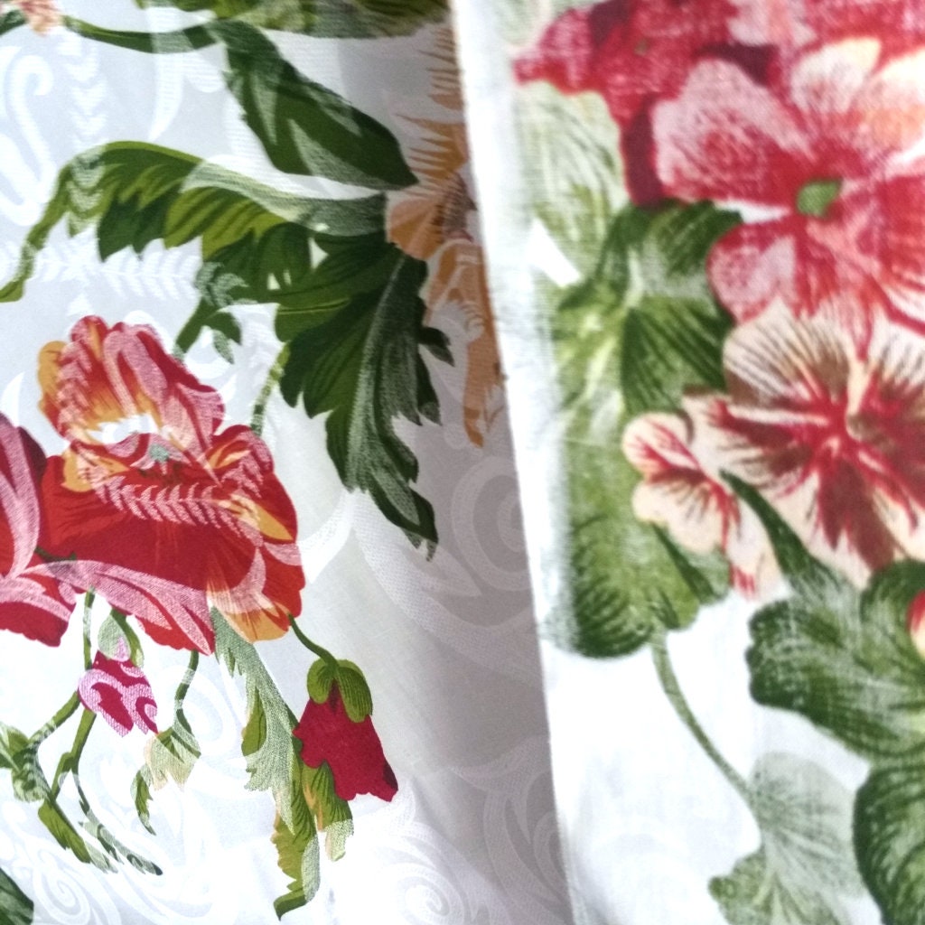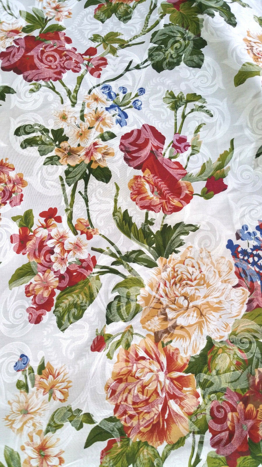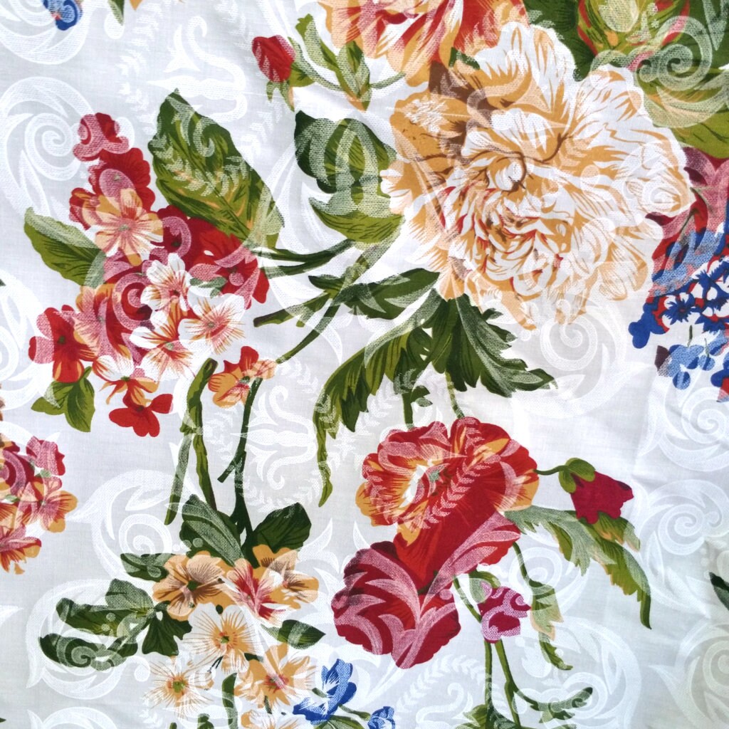 This fabric showcases an elegant shabby chic floral pattern set against an off-white background. A subtle white damask overlay, resembling a screen print, adds depth to the design. Crafted from a lightweight blend of 50% cotton and 50% polyester, each yard weighs approximately 6 ounces. The polyester content enhances wrinkle resistance, making it both stylish and practical.