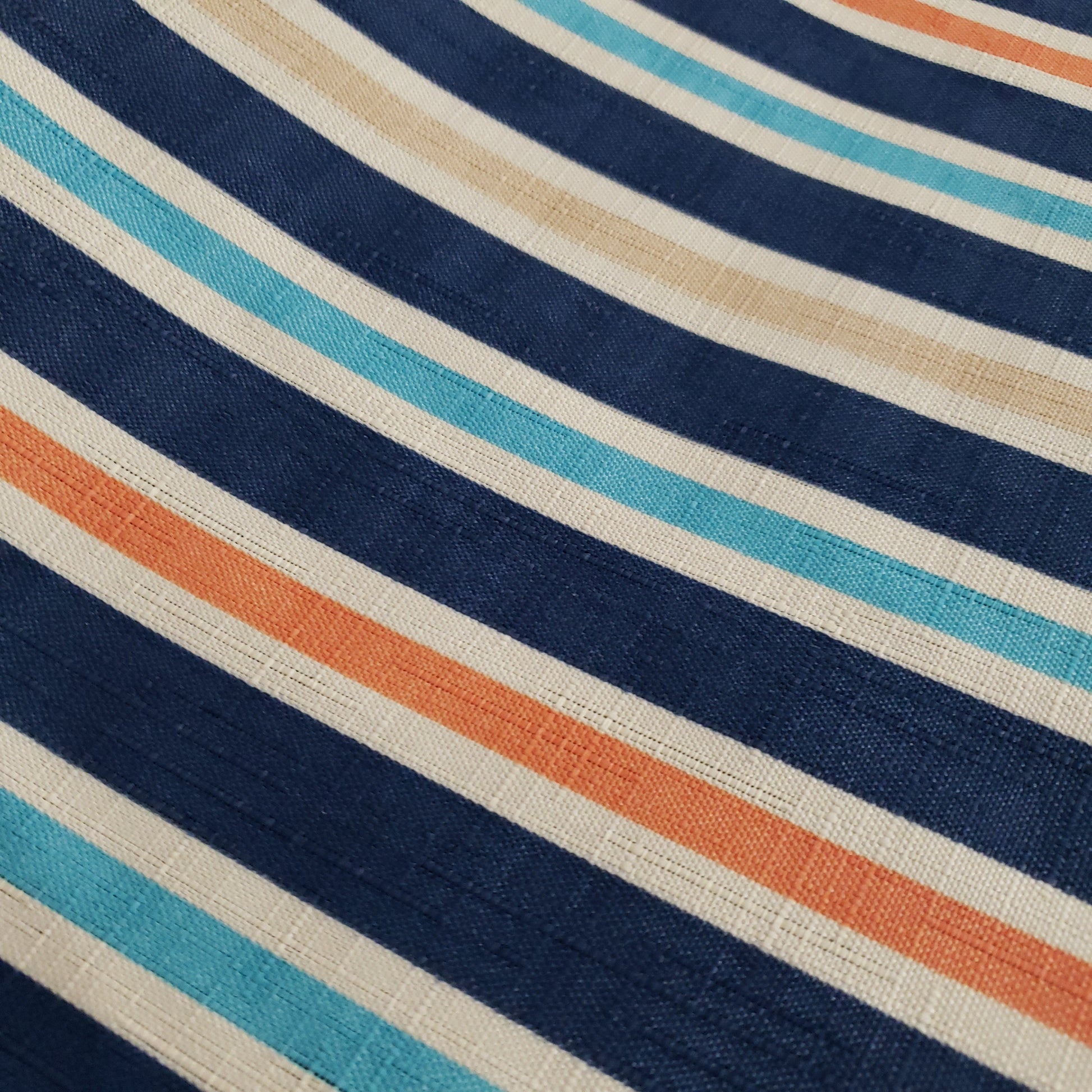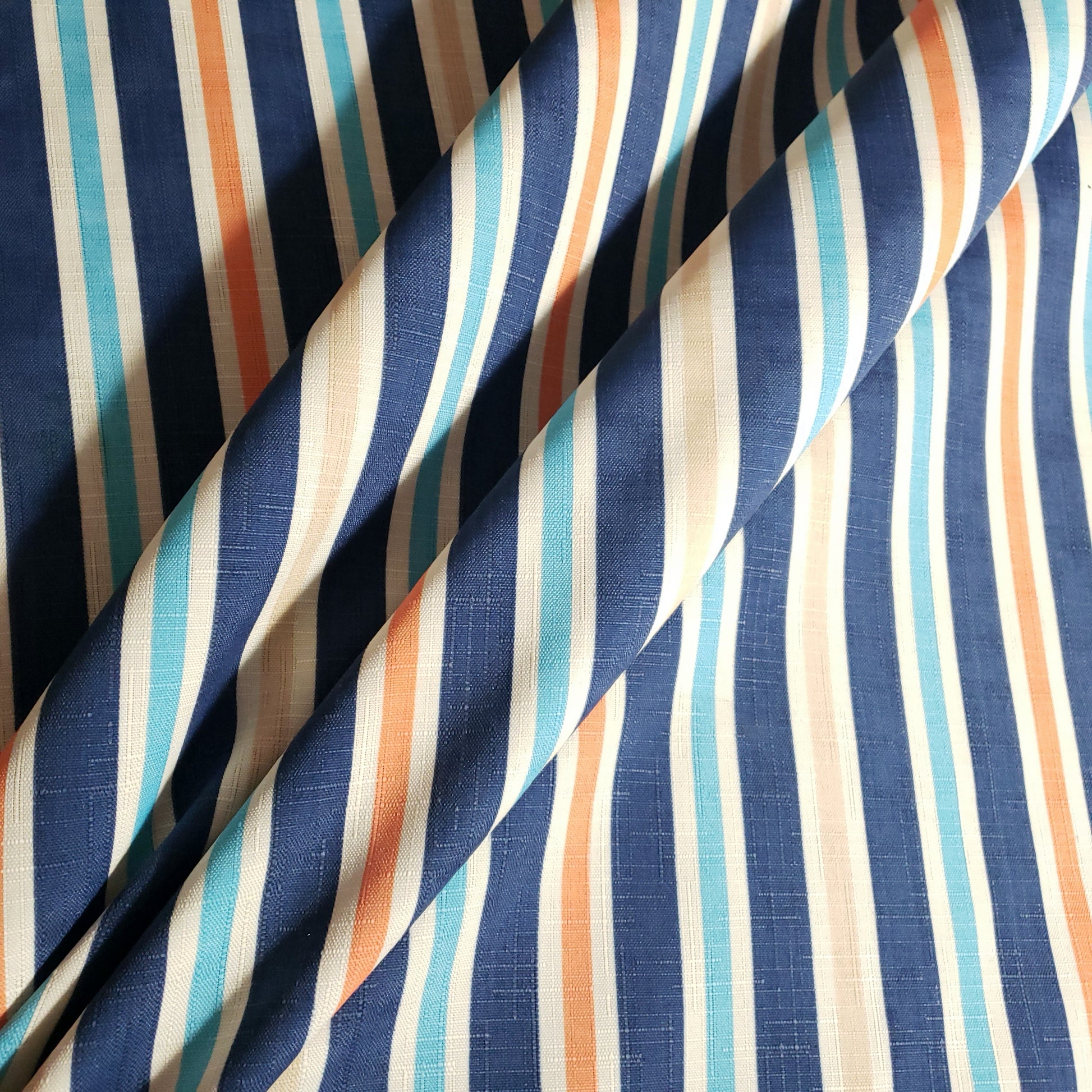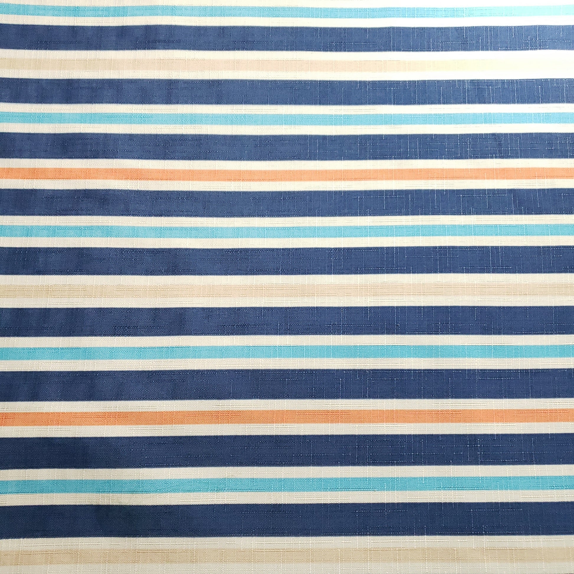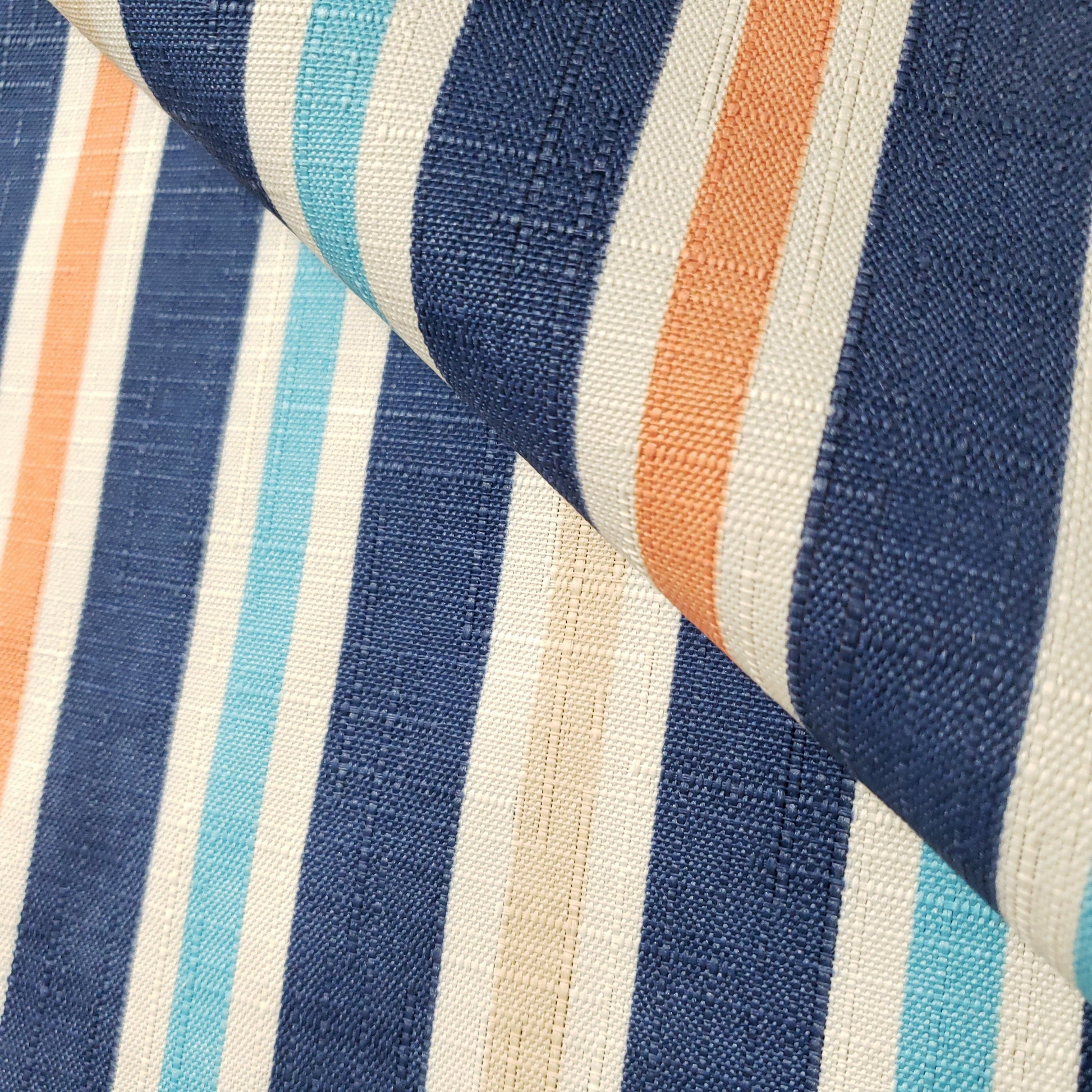 This fabric features a handsome multi-color stripe pattern in a coastal-inspired palette. As a heavyweight and supple linen, this material offers exceptional durability and a beautiful texture, making it an outstanding choice for upholstery projects, drapery, and high-use home décor items like cushions and tote bags.