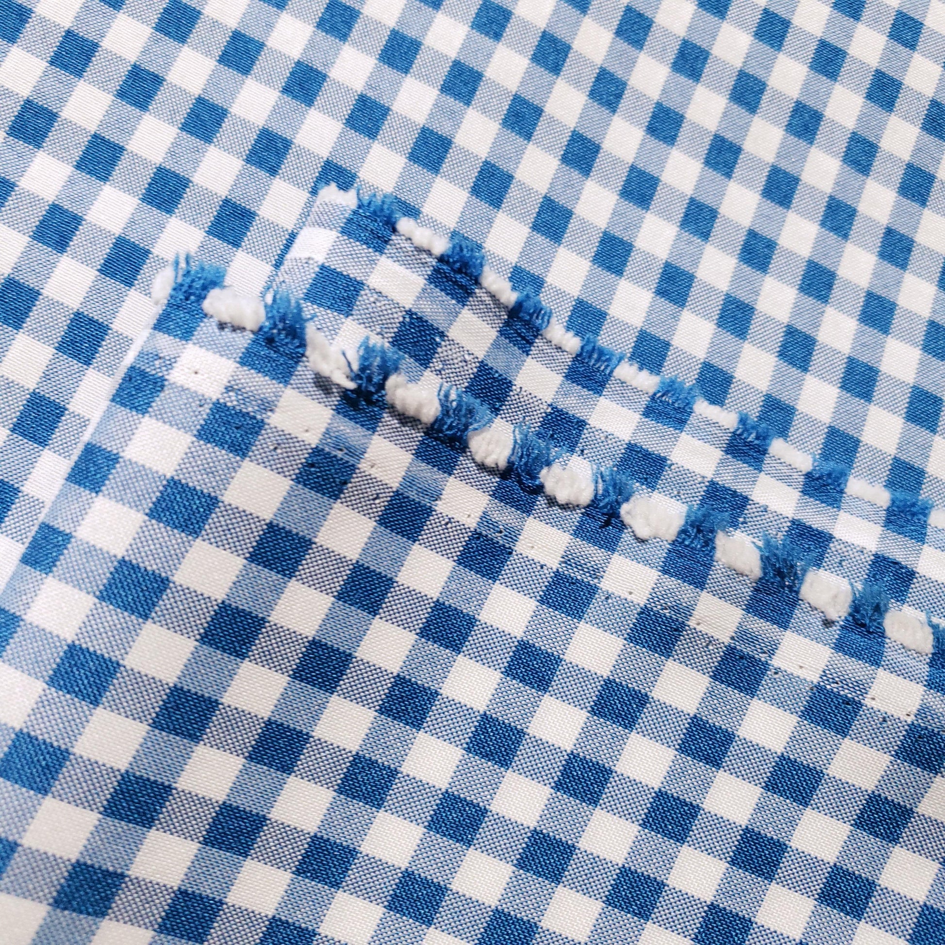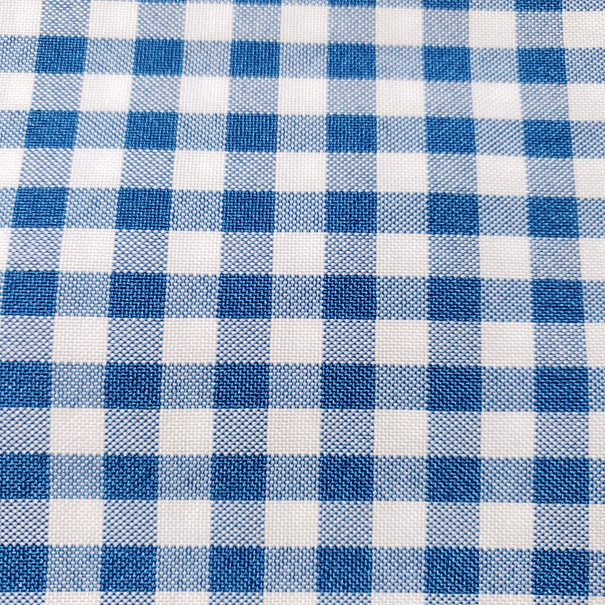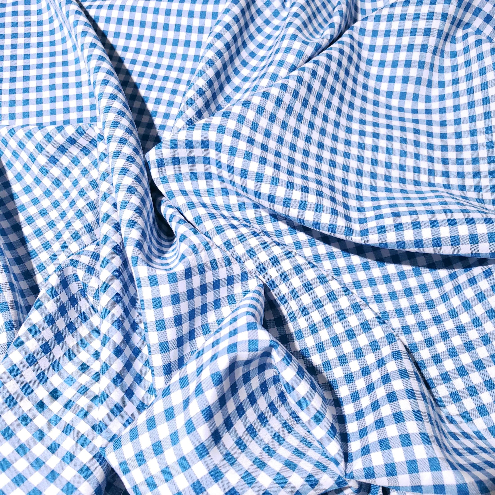 This is a turquoise blue gingham poly poplin fabric. It features a classic checkered pattern in a 1/4 inch stripe, made up of alternating squares of vibrant blue and crisp white. The poly poplin weave gives the fabric a smooth surface and a good body, making it durable and easy to work with. The colors are bright and consistent, offering a fresh and cheerful aesthetic. This fabric has a matte finish and holds its shape well.