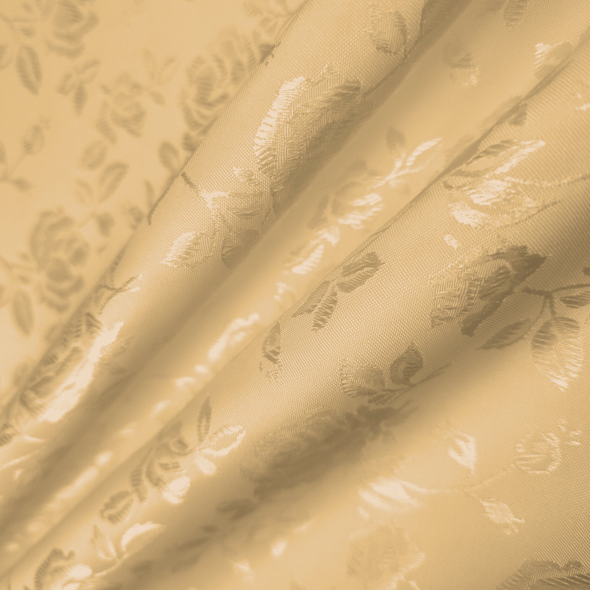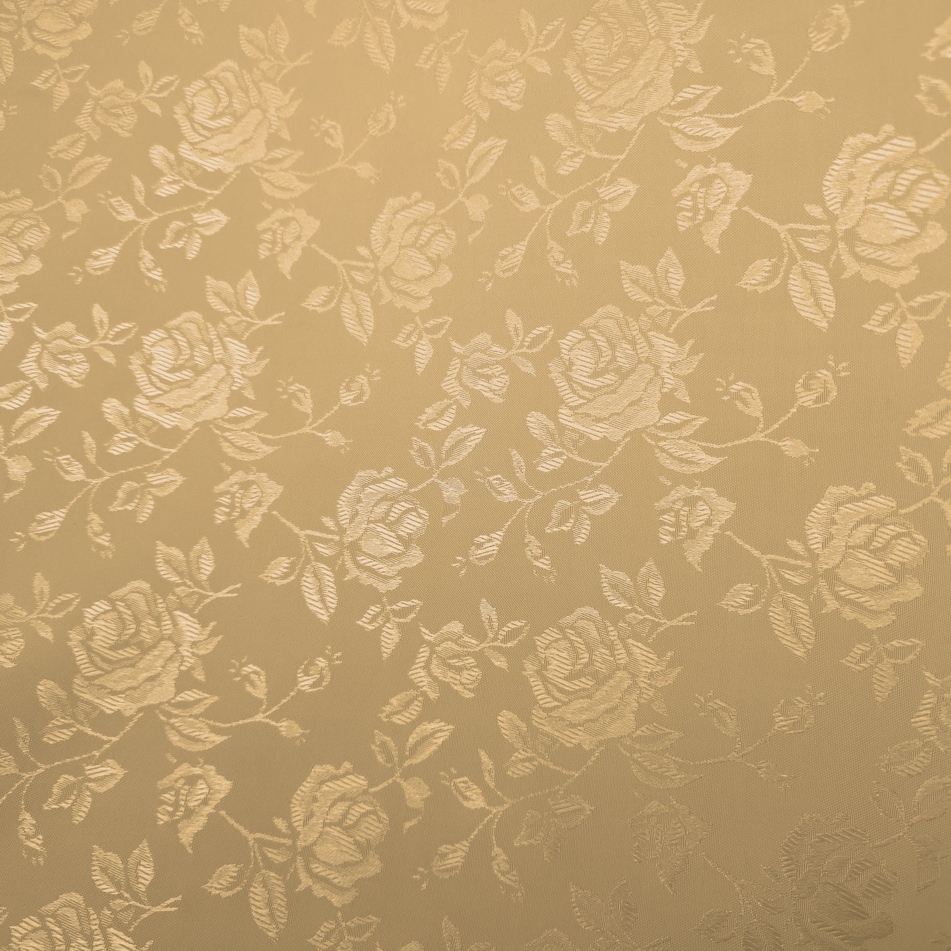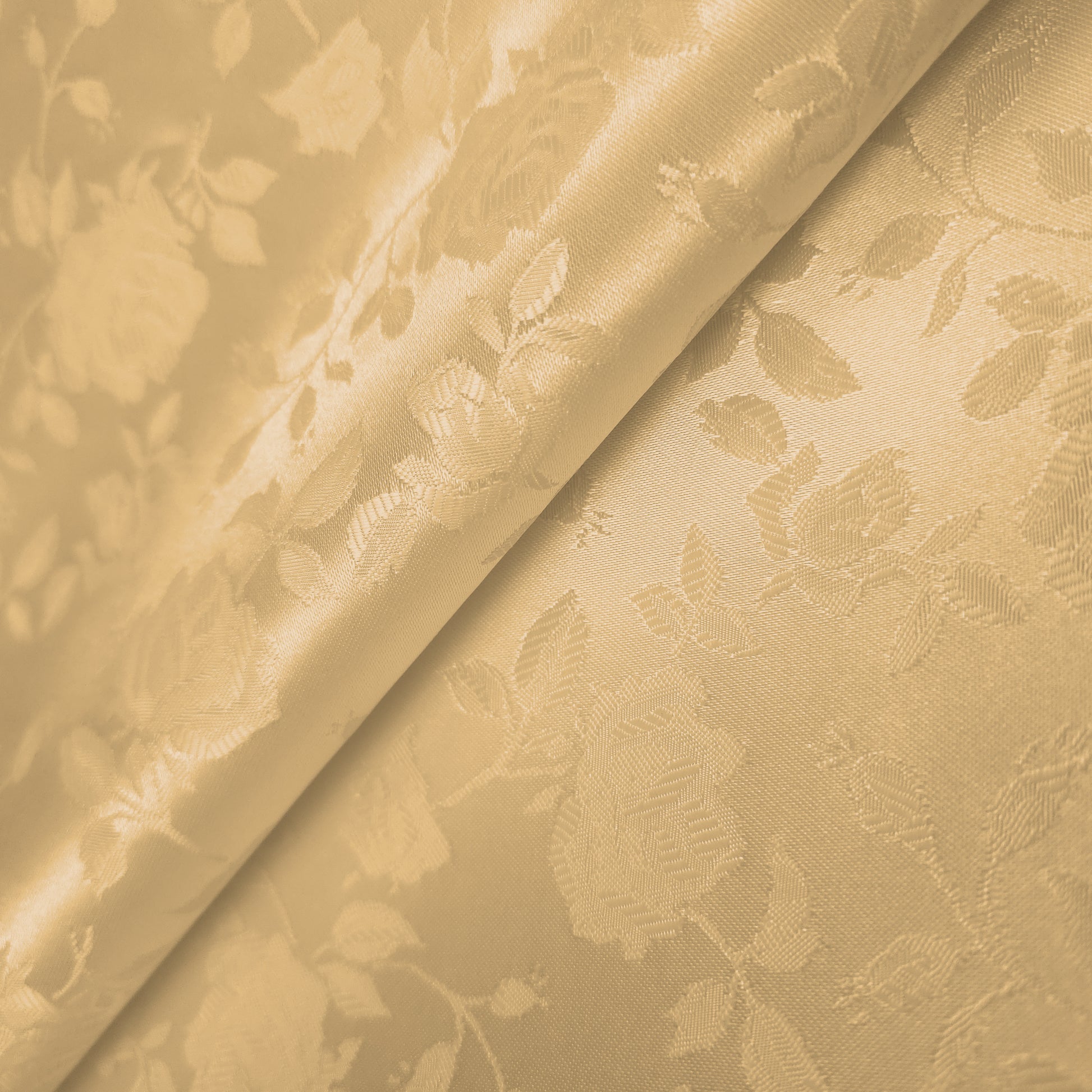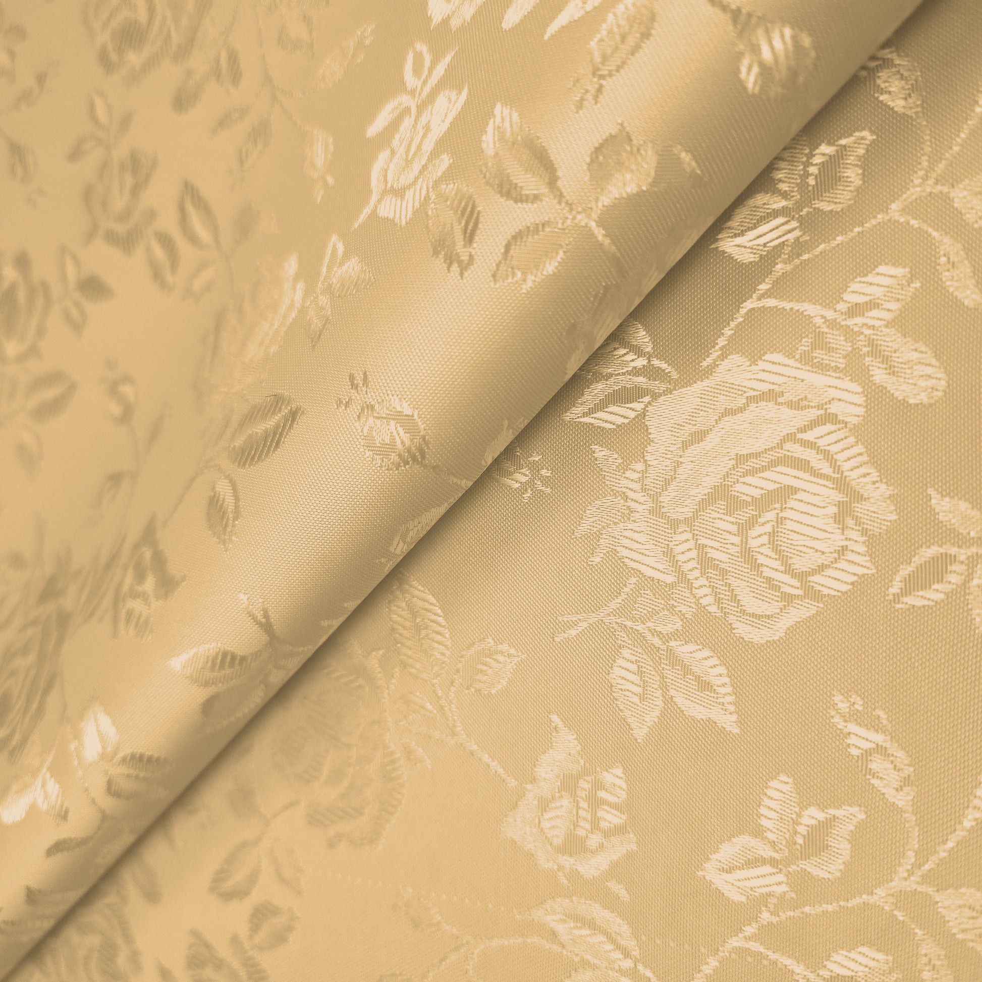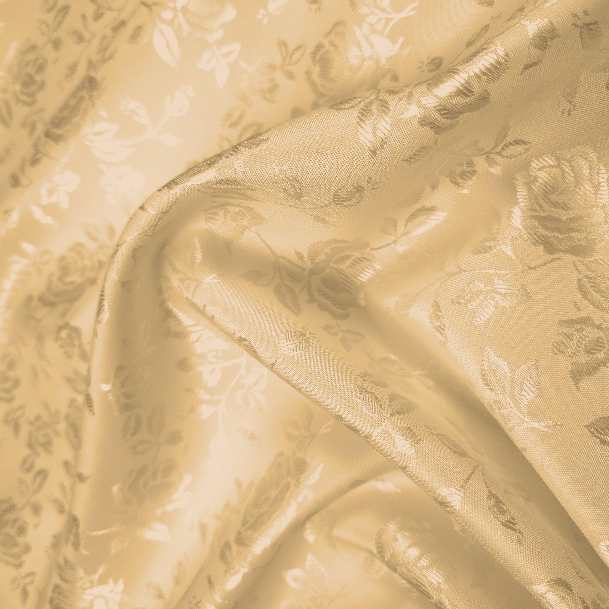 This heavyweight polyester brocade fabric features an elegant, woven rose floral pattern in a brilliant, classic gold. Weighing a substantial 9 oz per yard, this fabric has a supple hand and excellent body. A key feature is its full reversibility; one side presents glossy roses on a matte background, while the reverse offers matte roses on a glossy background, providing ultimate design versatility. Its opulent texture and durable weight make it a premier choice for luxurious formal wear, high-end upholstery, and stunning event decor for holidays and anniversaries. This jacquard fabric is 58 inches wide and is sold by the yard.